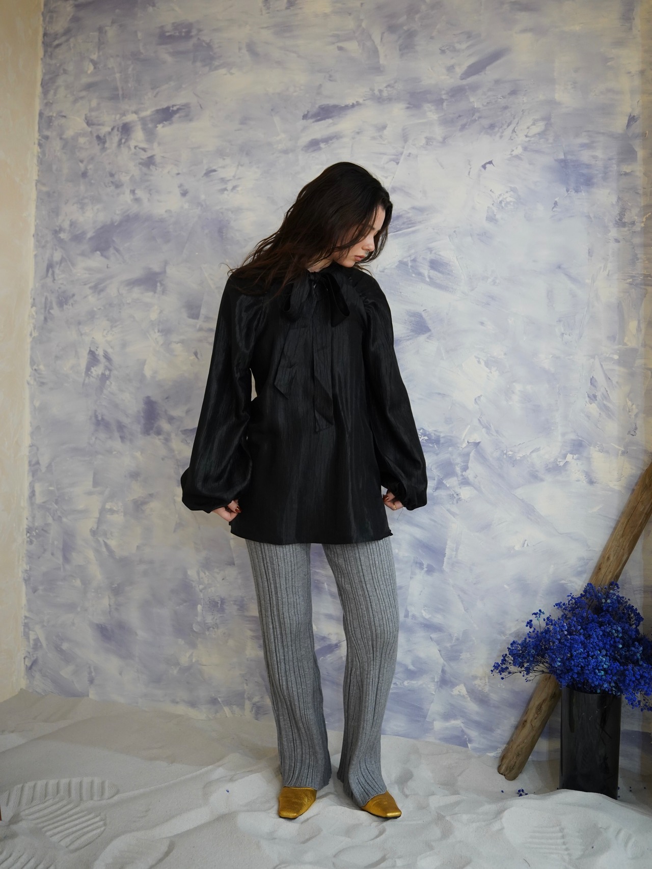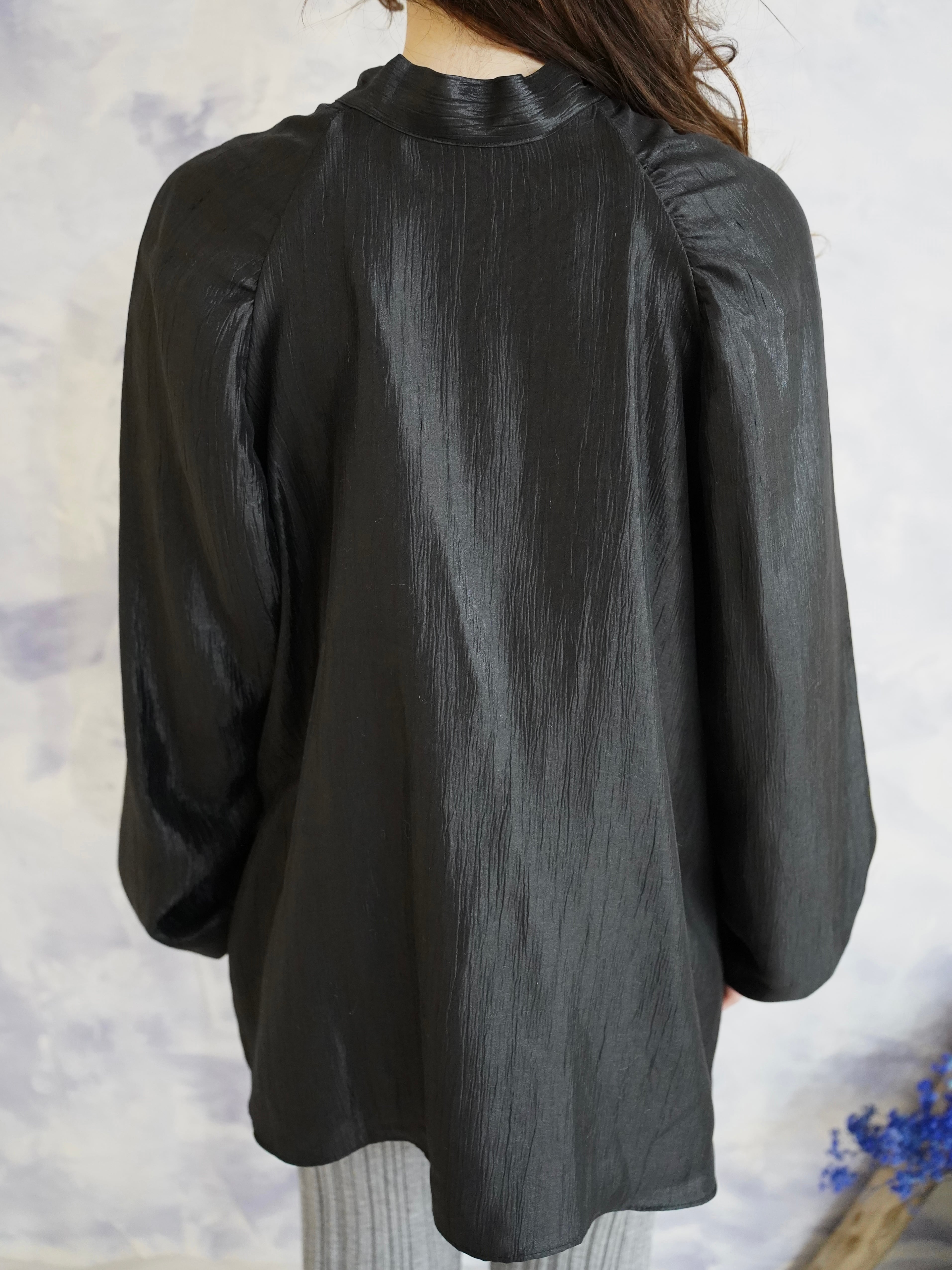 上品なシルエットと洗練された光沢感が魅力のブラウスです。前後ろどちらでも着ることができるデザインで、コーディネートの幅を広げることができます。シンプルながらも高級感があり、日常使いはもちろん、特別なシーンにもぴったり。