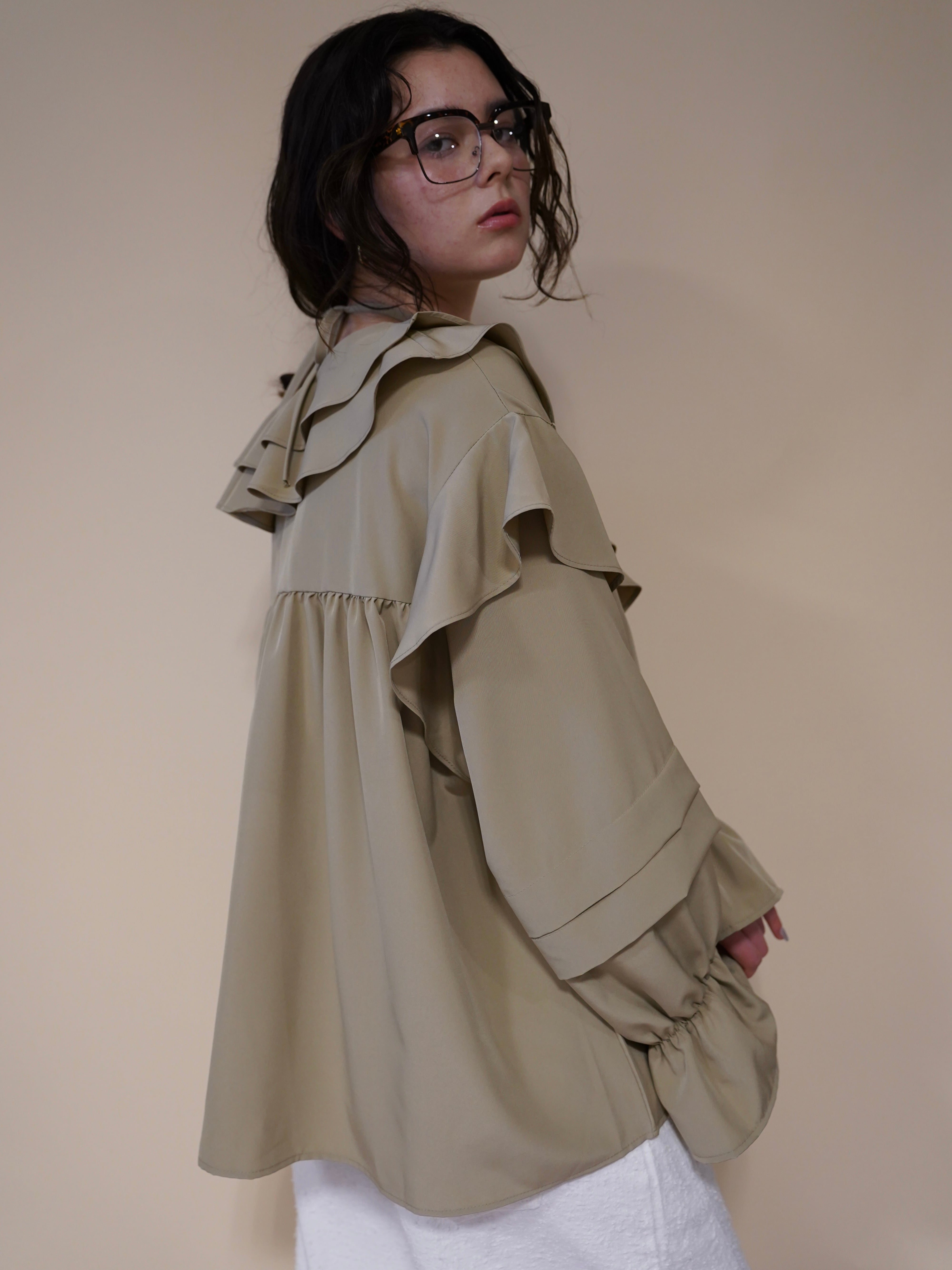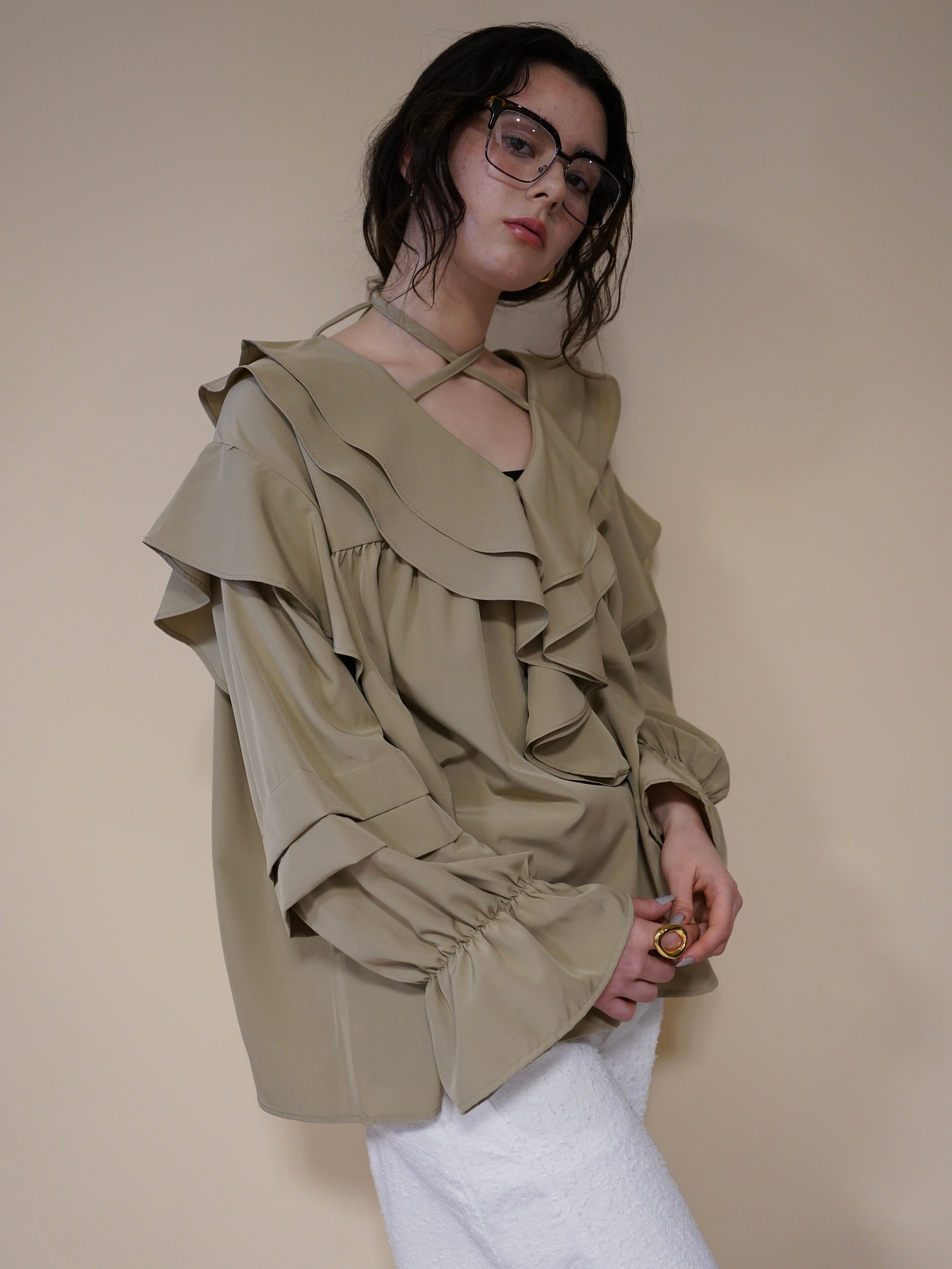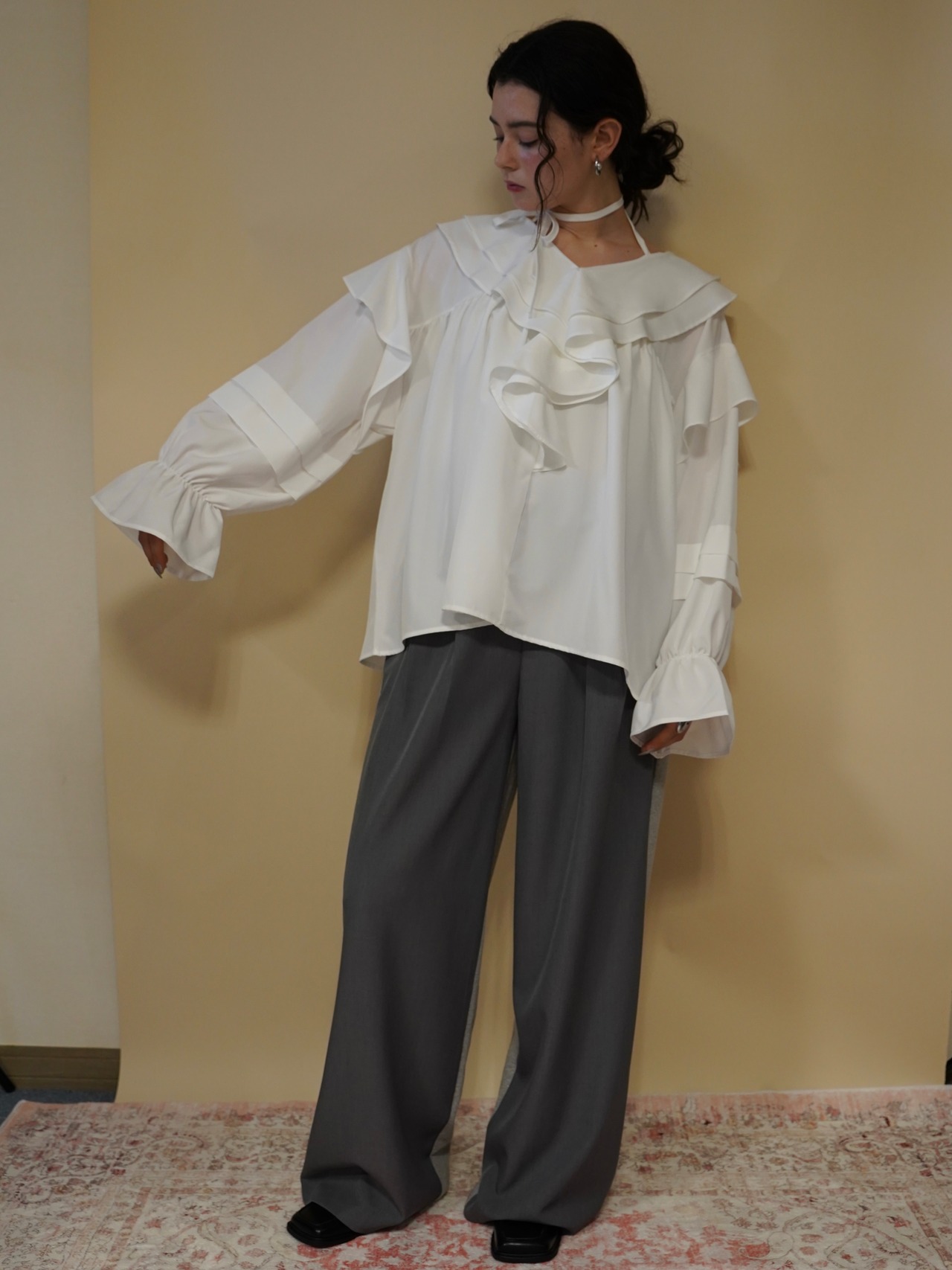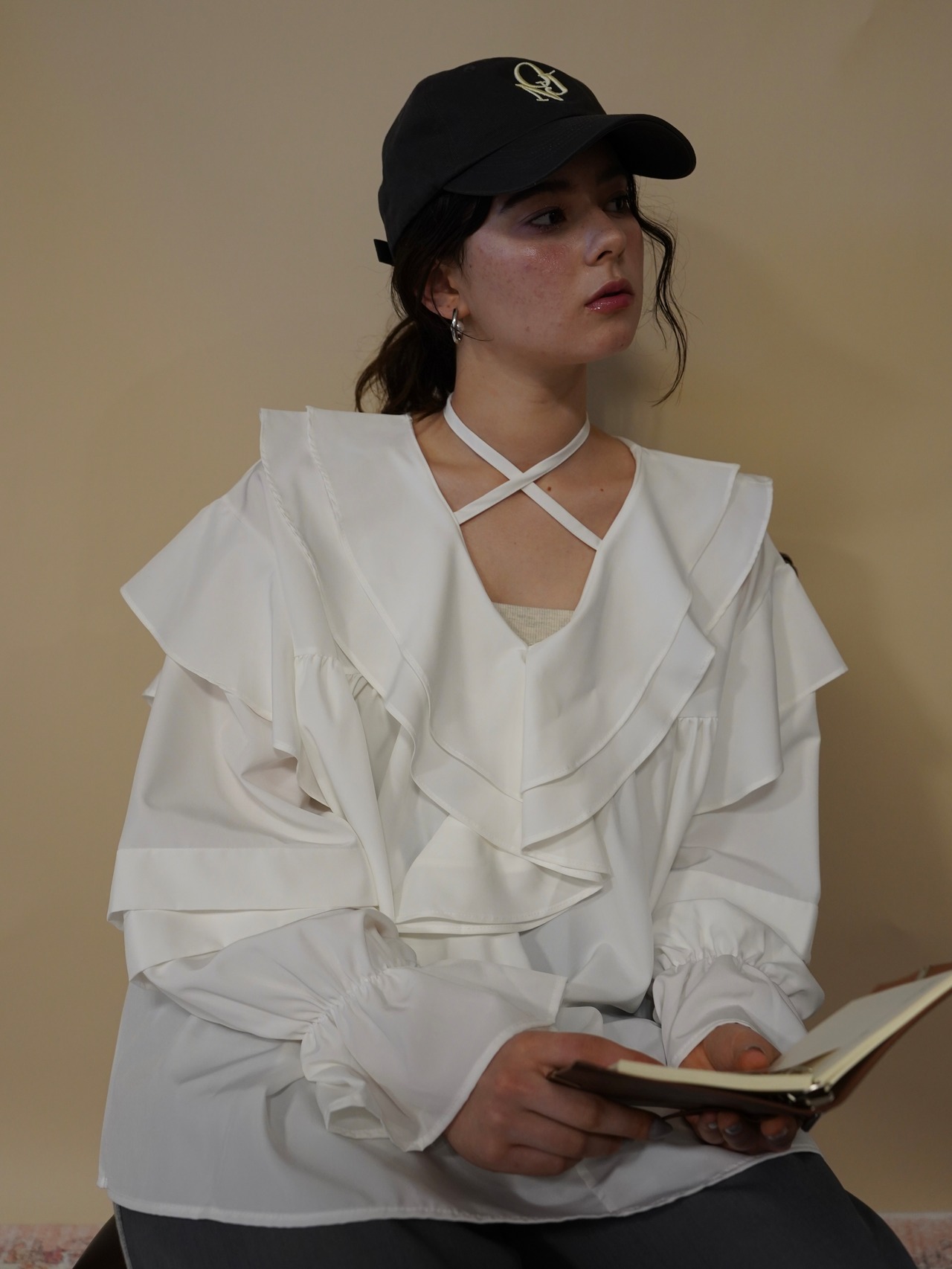 顔まわりをパッと華やかに見せてくれるボリュームフリルに、首元のリボンがアクセントになった一枚。
