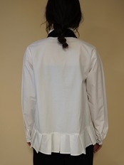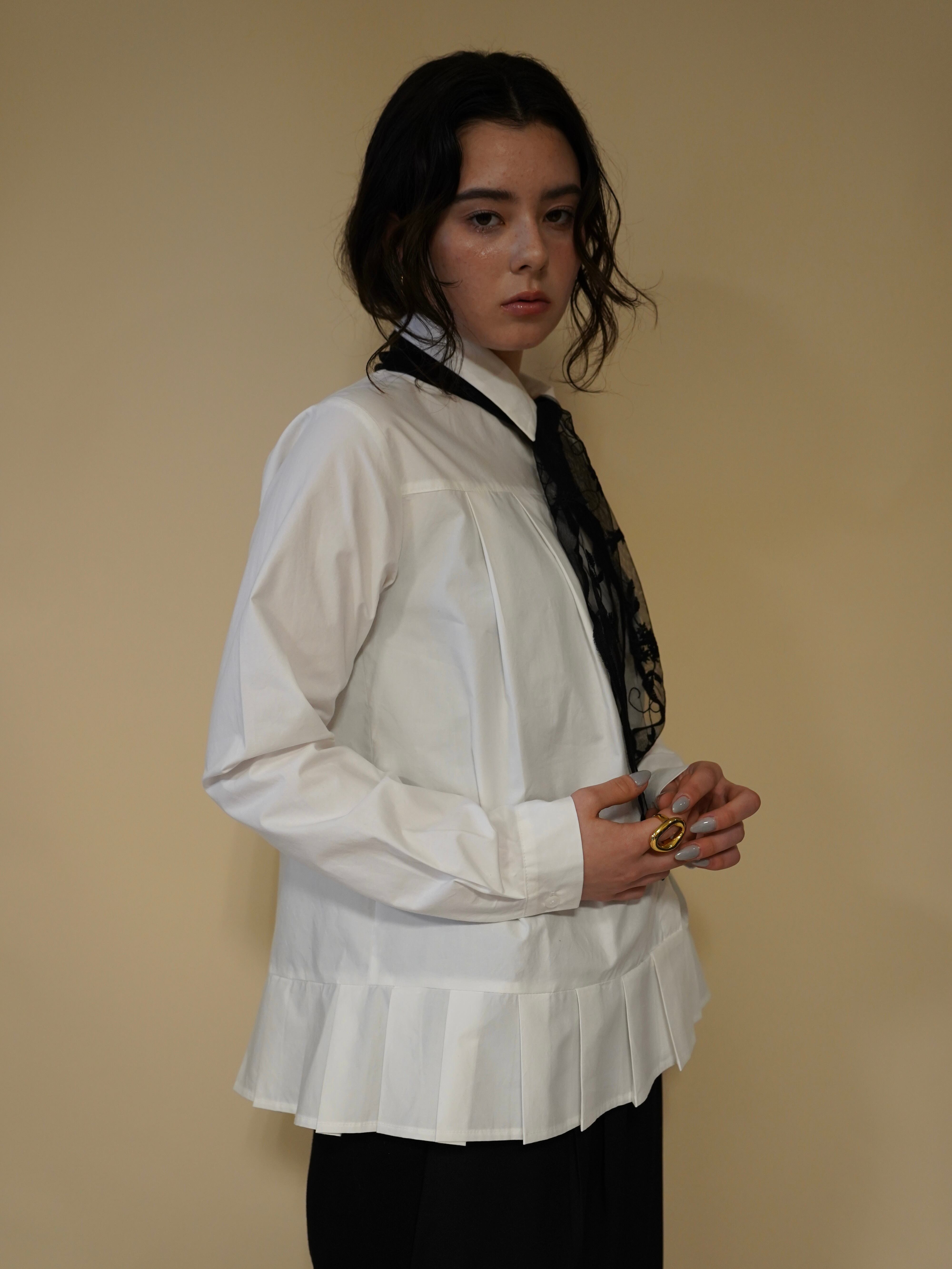 清潔感のある白いブラウスに、プリーツが施され、シンプルながらも洗練された雰囲気を演出。