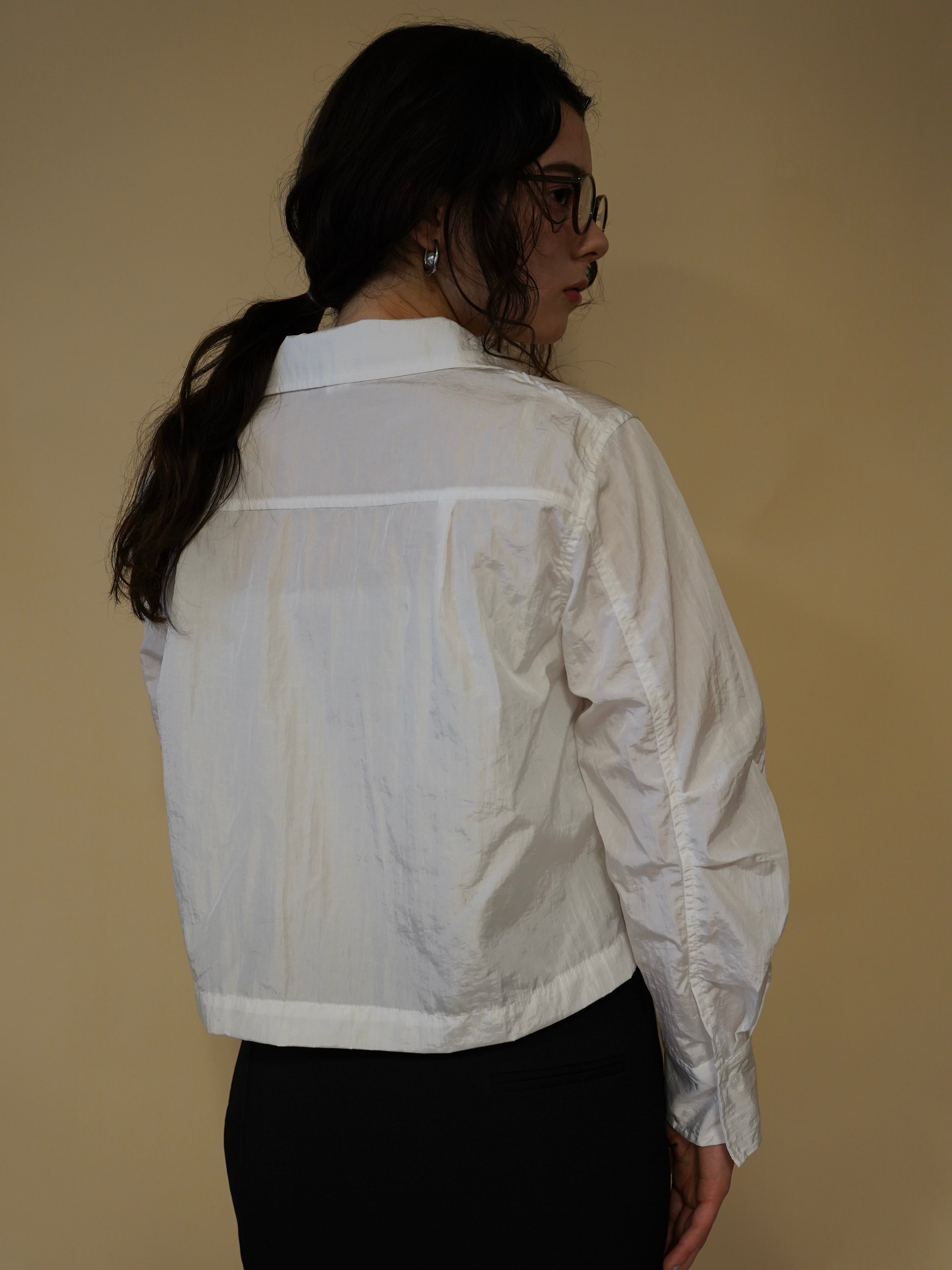 軽やかでシャリ感のあるナイロン素材を使用した、シャツ。フロントにはリボンが2つ施され、クラシカルさと遊び心を絶妙にミックスしたデザイン。