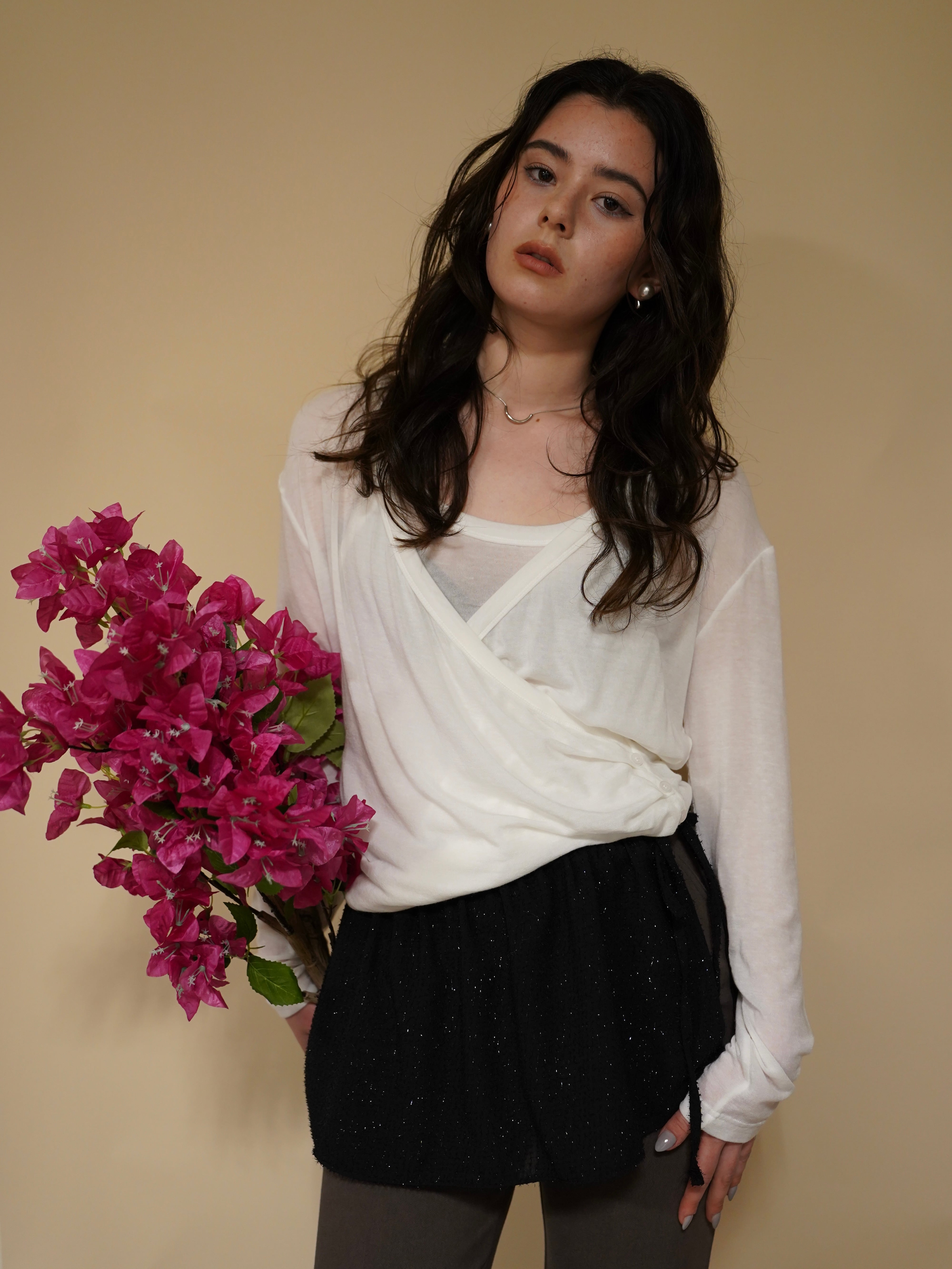 華奢なストラップとアシンメトリーなディテールが、さりげない抜け感と女性らしさをプラス。