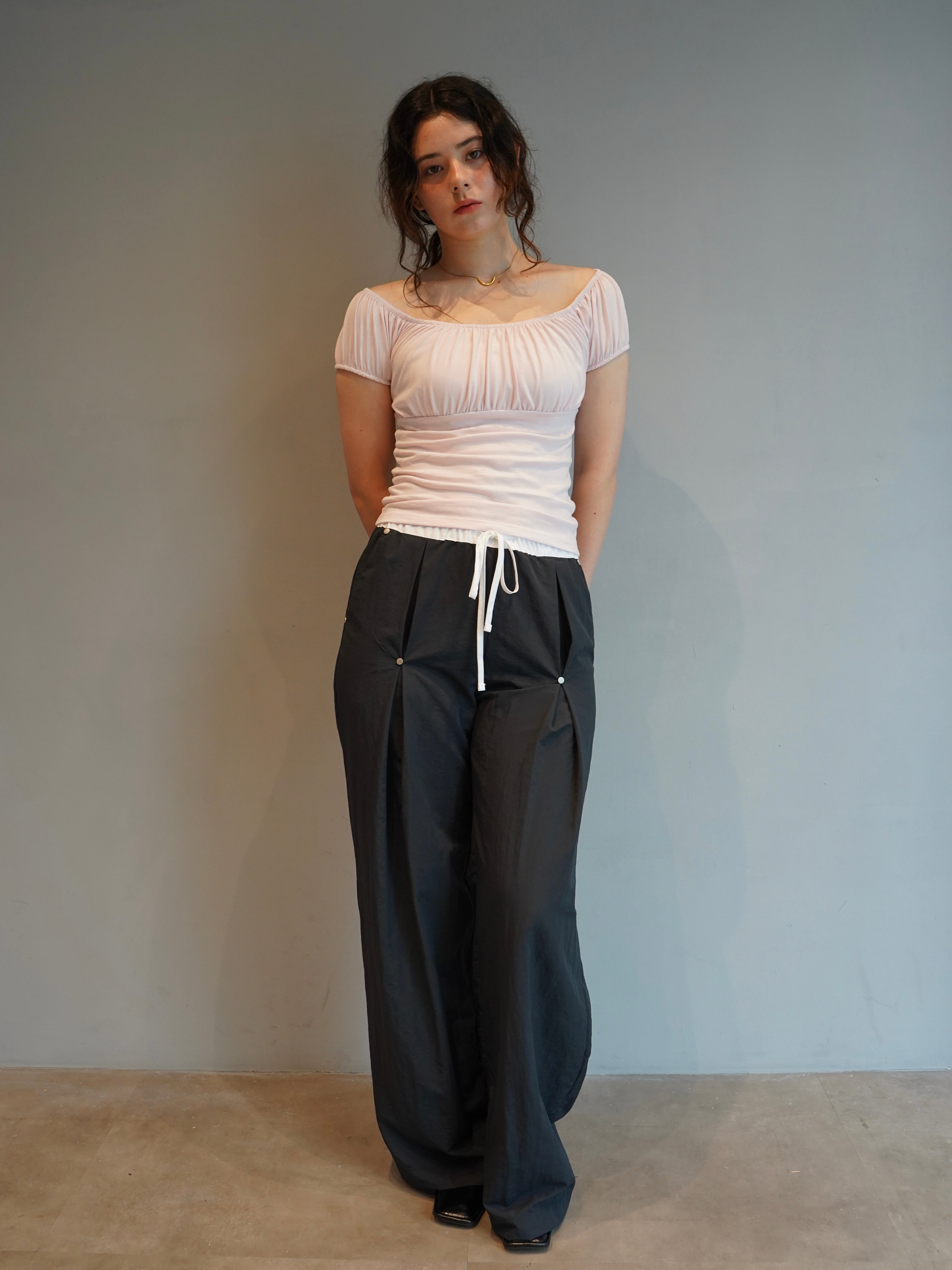 ウエストはゴムと紐の仕様になっており、ストレスフリーな履き心地を叶えてくれます。