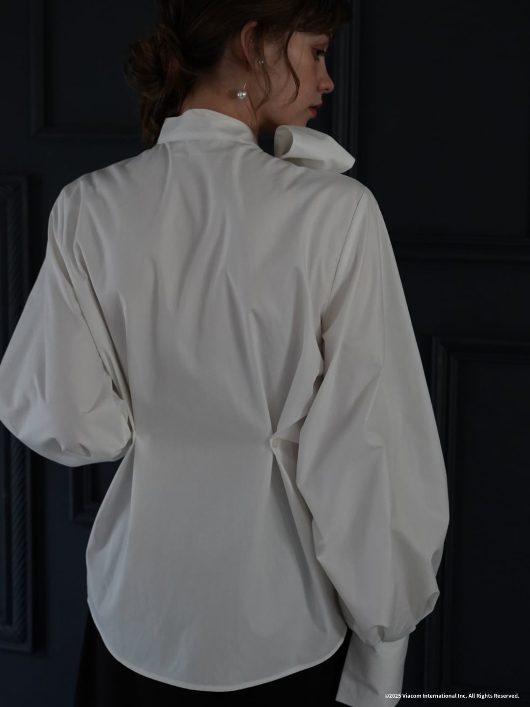 カフェのウェイトレスから連想した大きめのタイとボリューム感のある大胆な袖のデザイン、ウエストを後ろで留められる仕様にし、より女性らしいデザインとディテールを追求しました。コラボレーションならではのロゴデザインもポイントです。