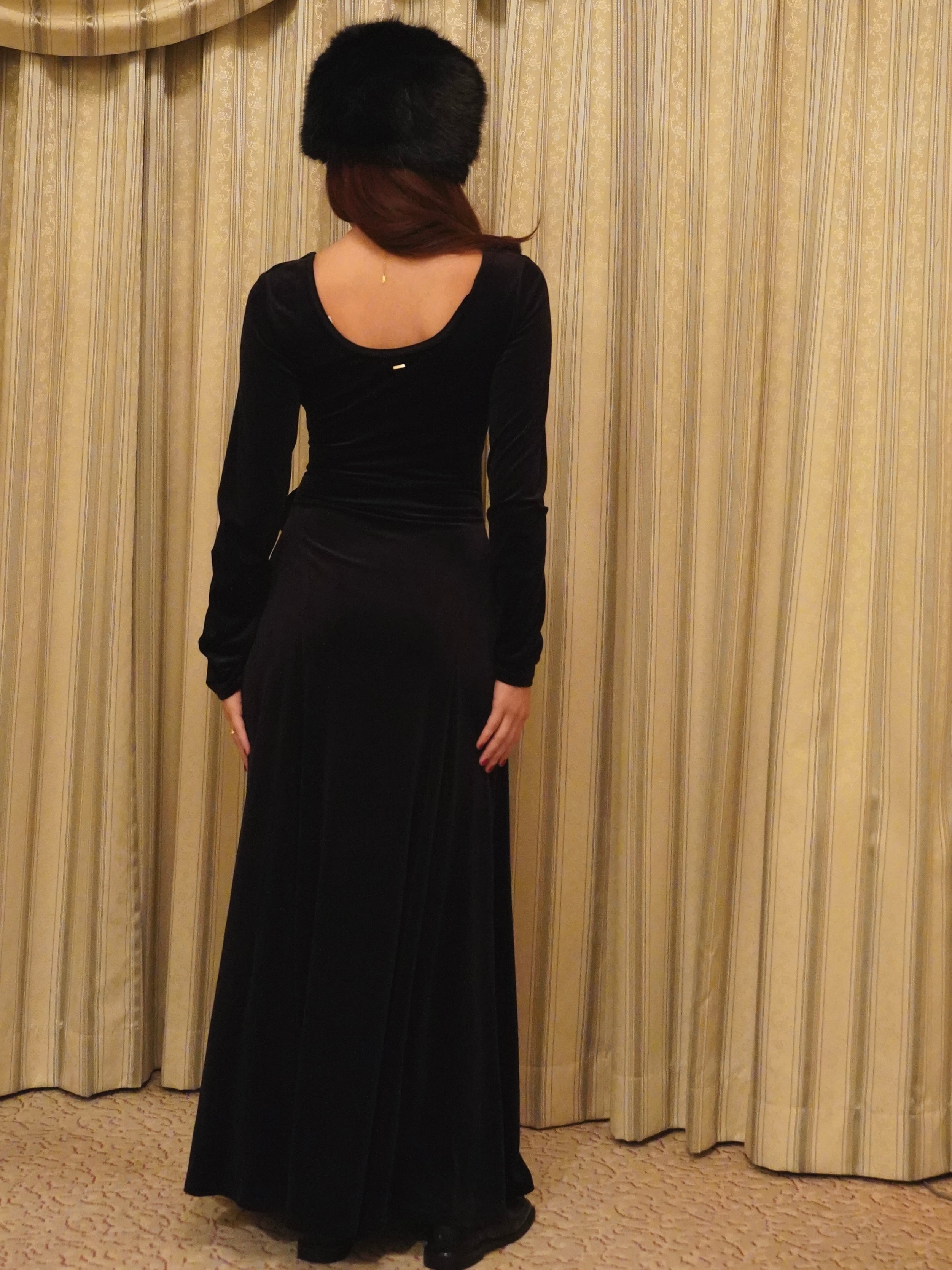 柔らかなベロア生地が程よく身体のラインに沿い、生地をたっぷり使用した落ち感のあるスカートが優雅な動きを演出。