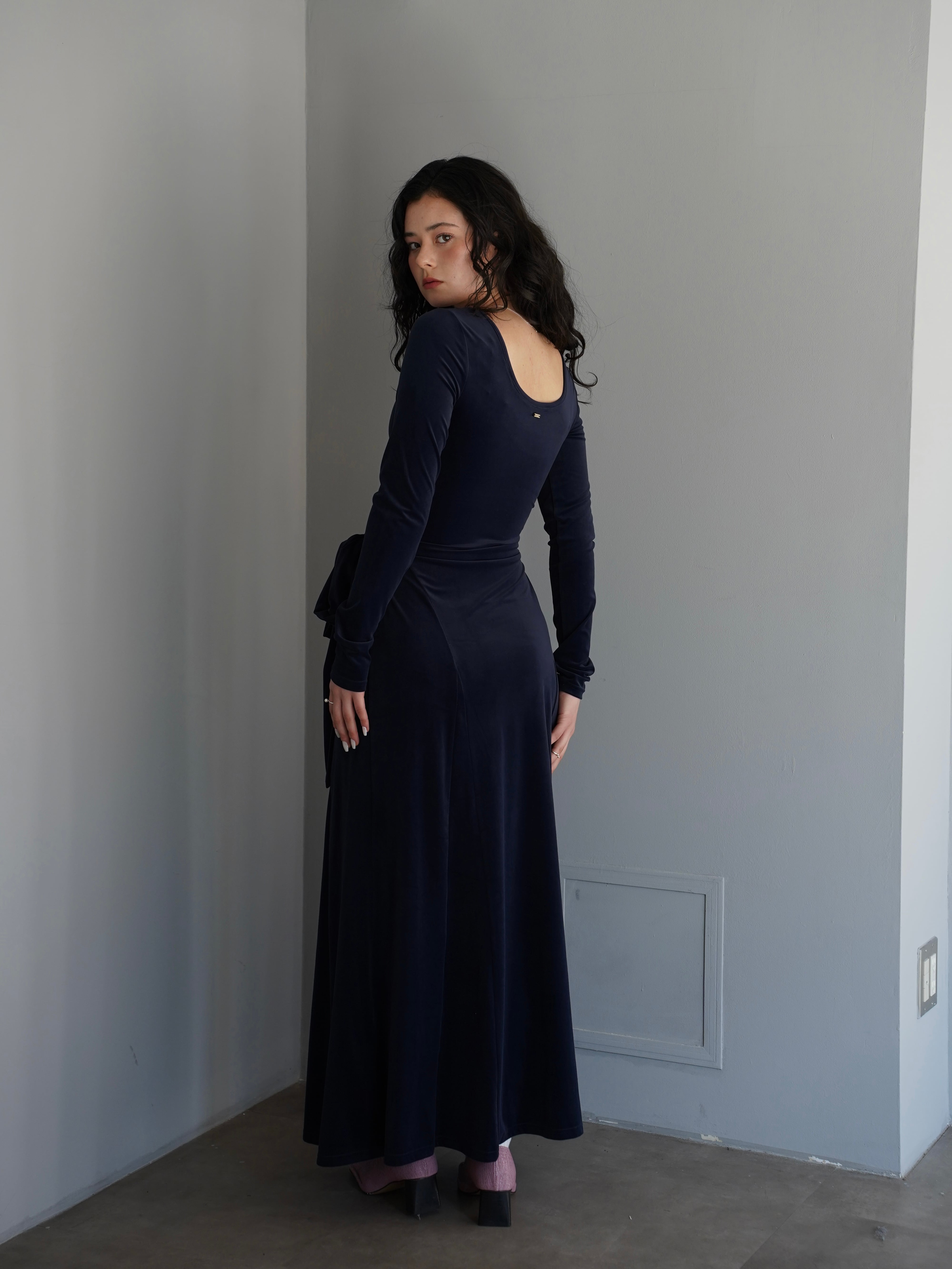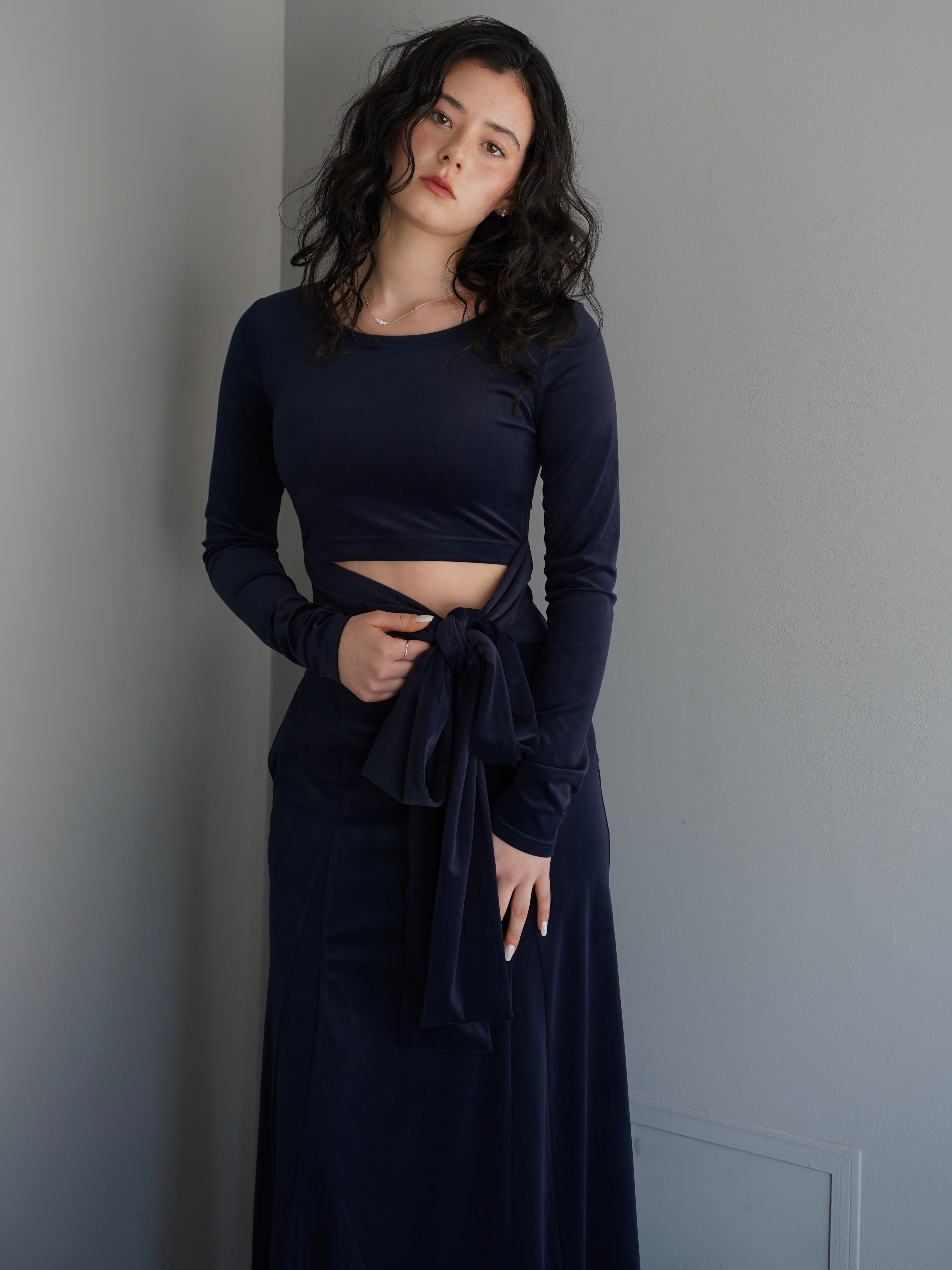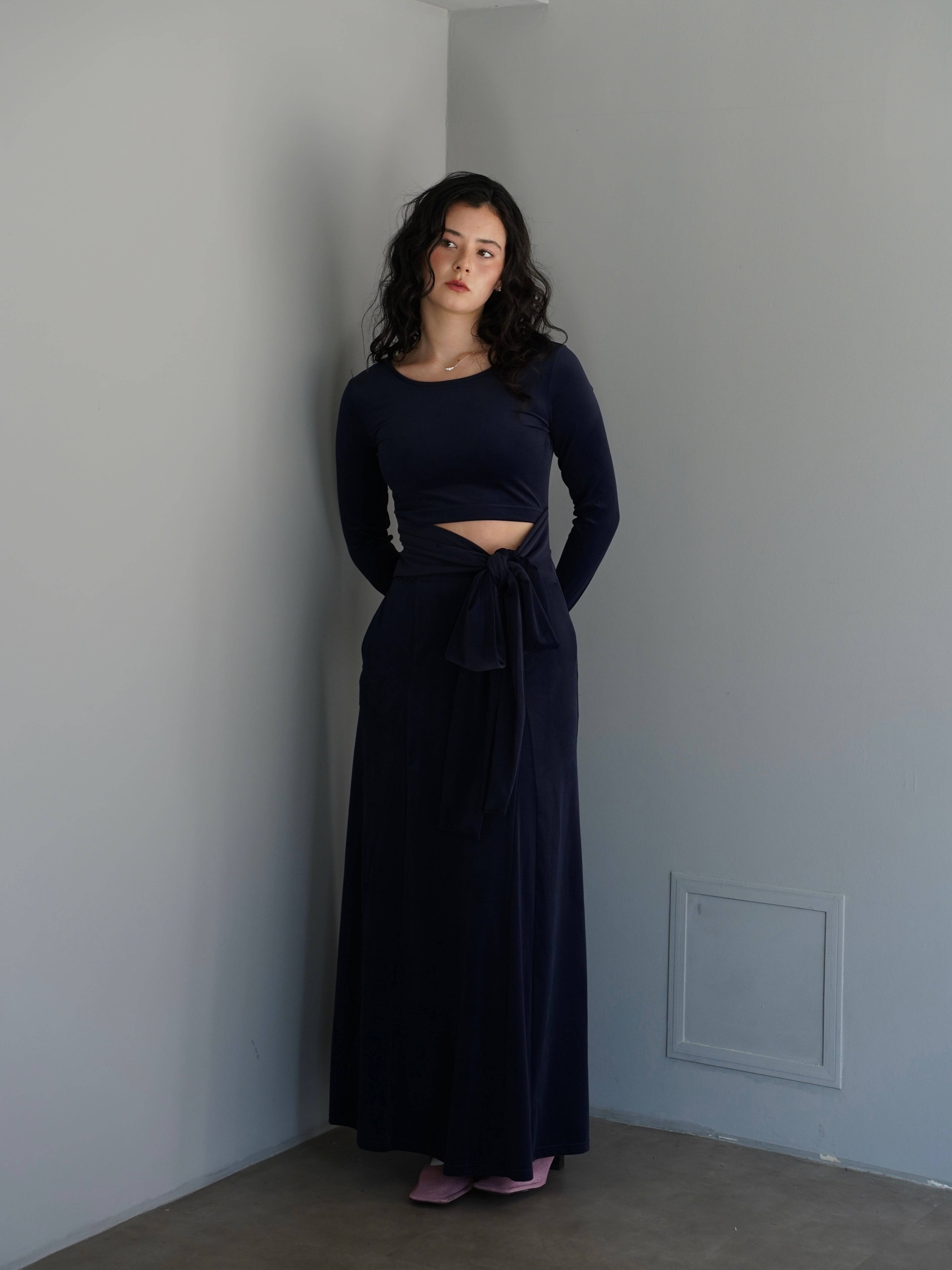 柔らかなベロア生地が程よく身体のラインに沿い、生地をたっぷり使用した落ち感のあるスカートが優雅な動きを演出。