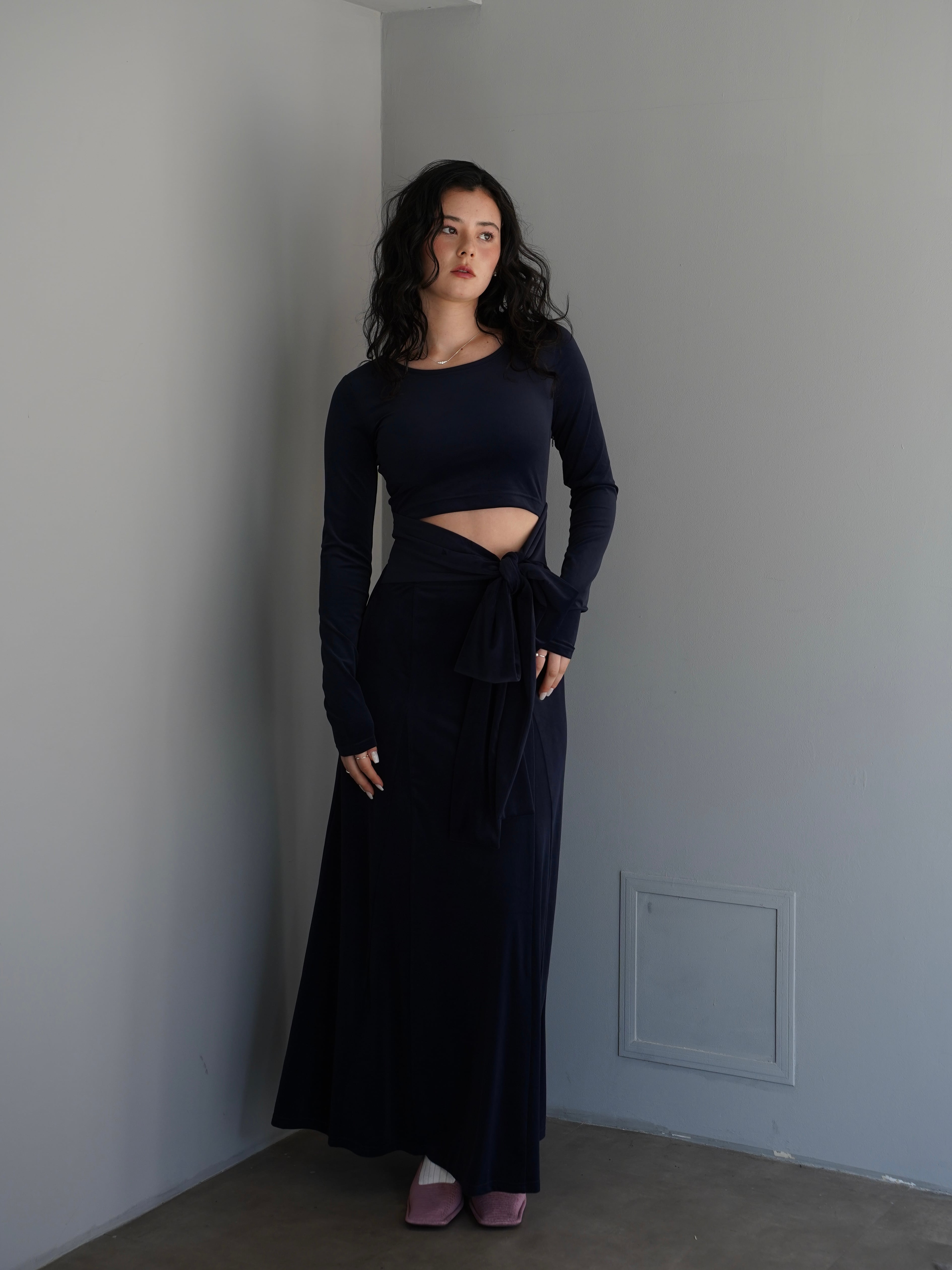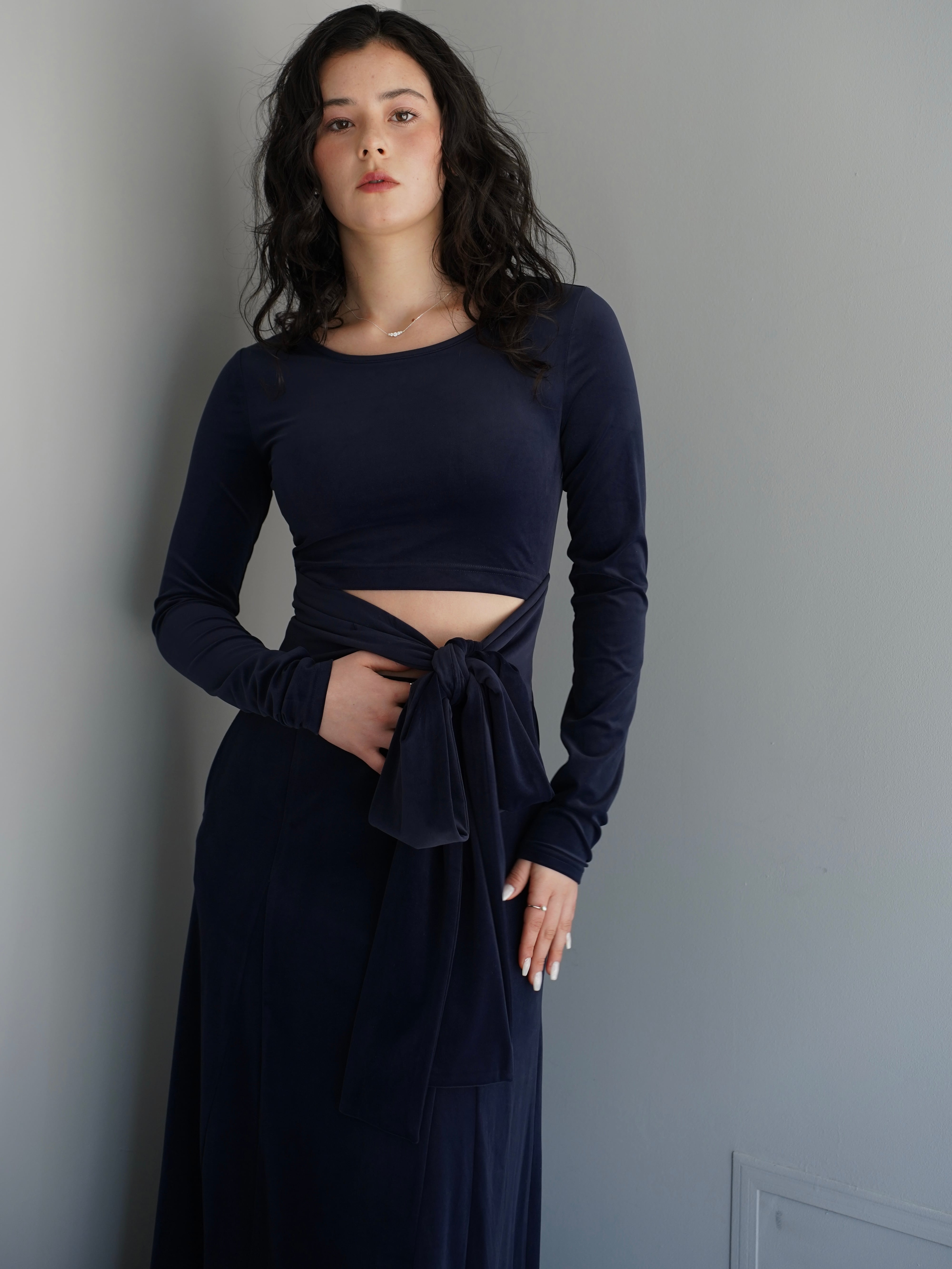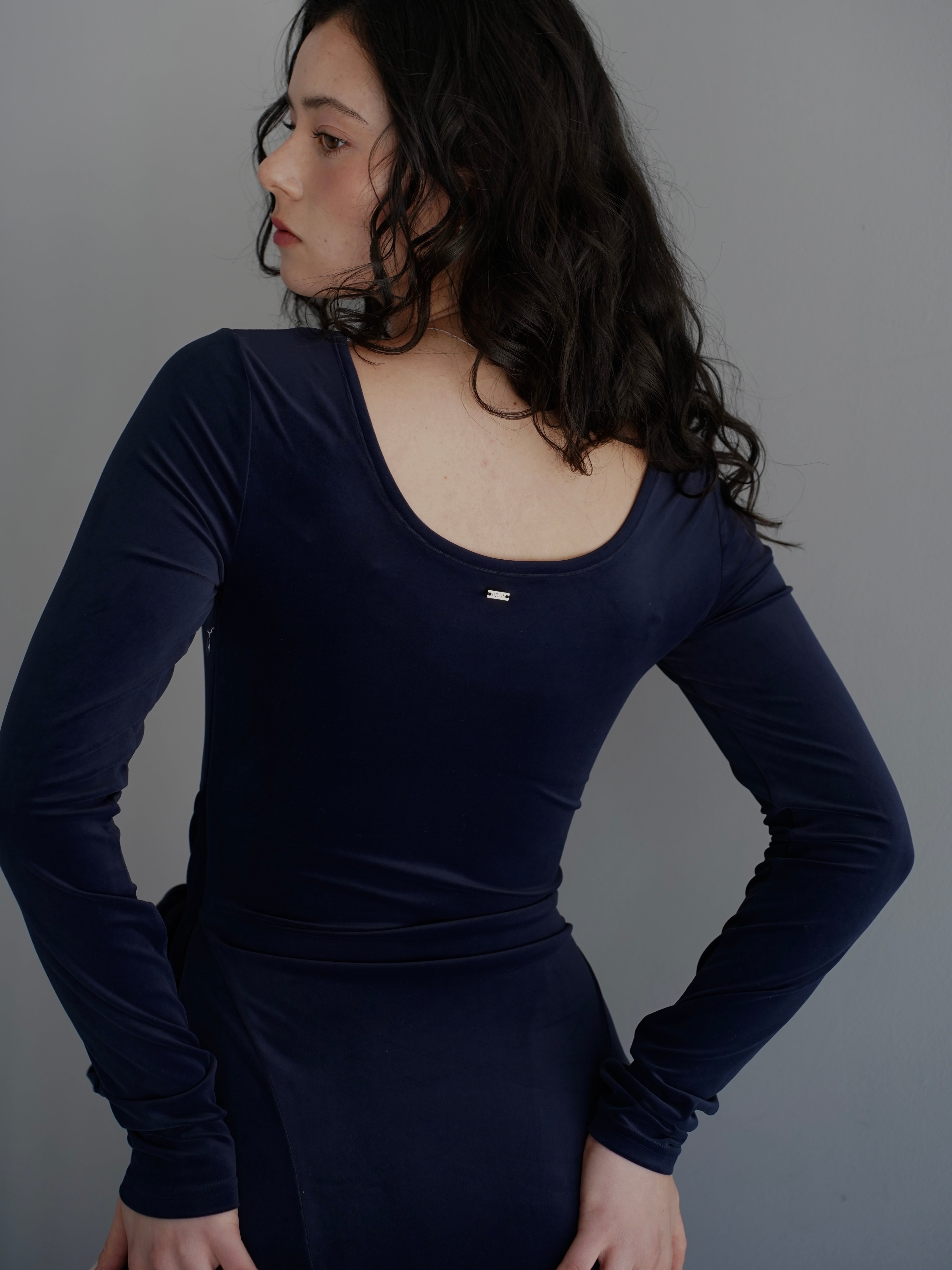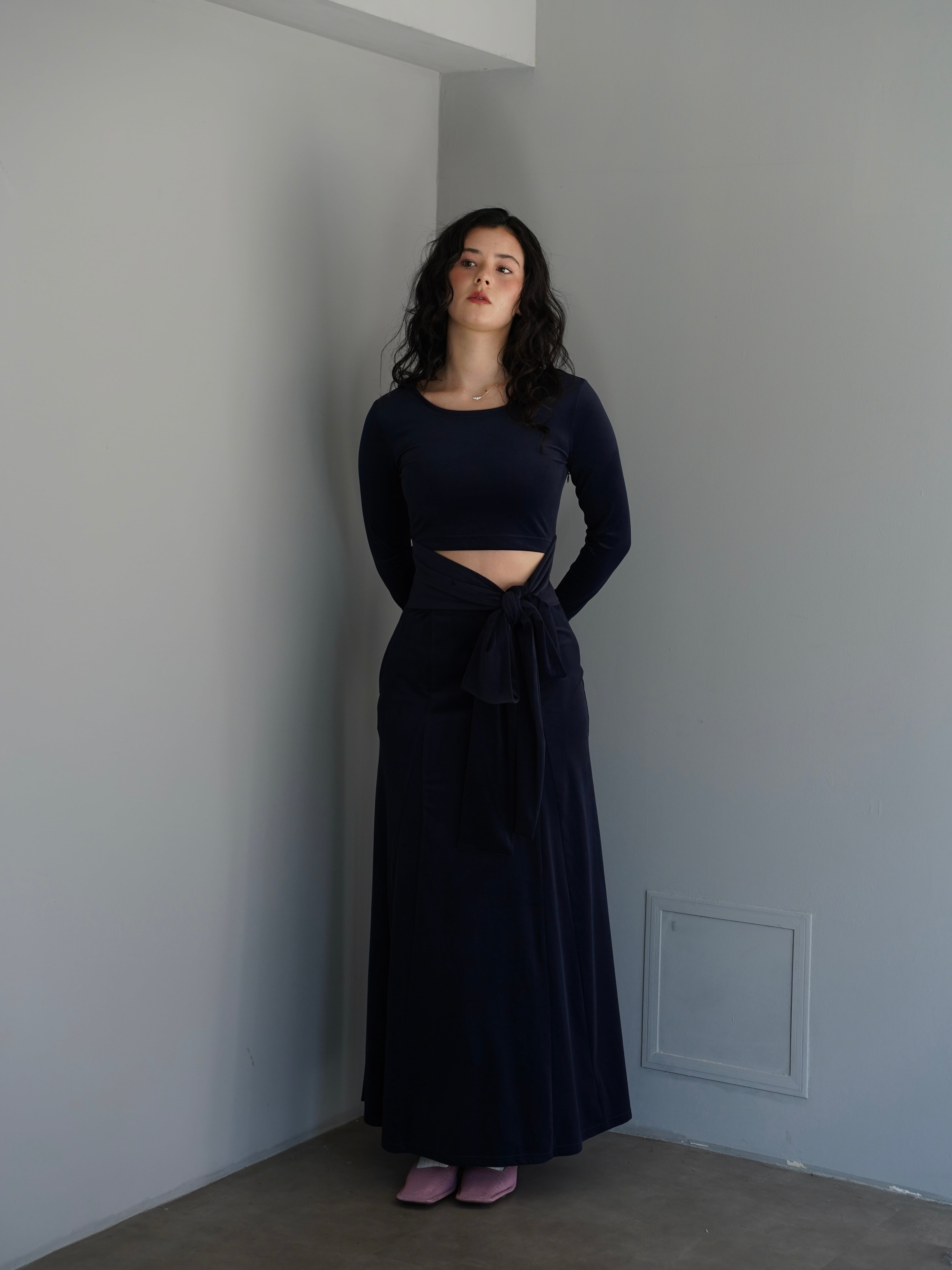 柔らかなベロア生地が程よく身体のラインに沿い、生地をたっぷり使用した落ち感のあるスカートが優雅な動きを演出。