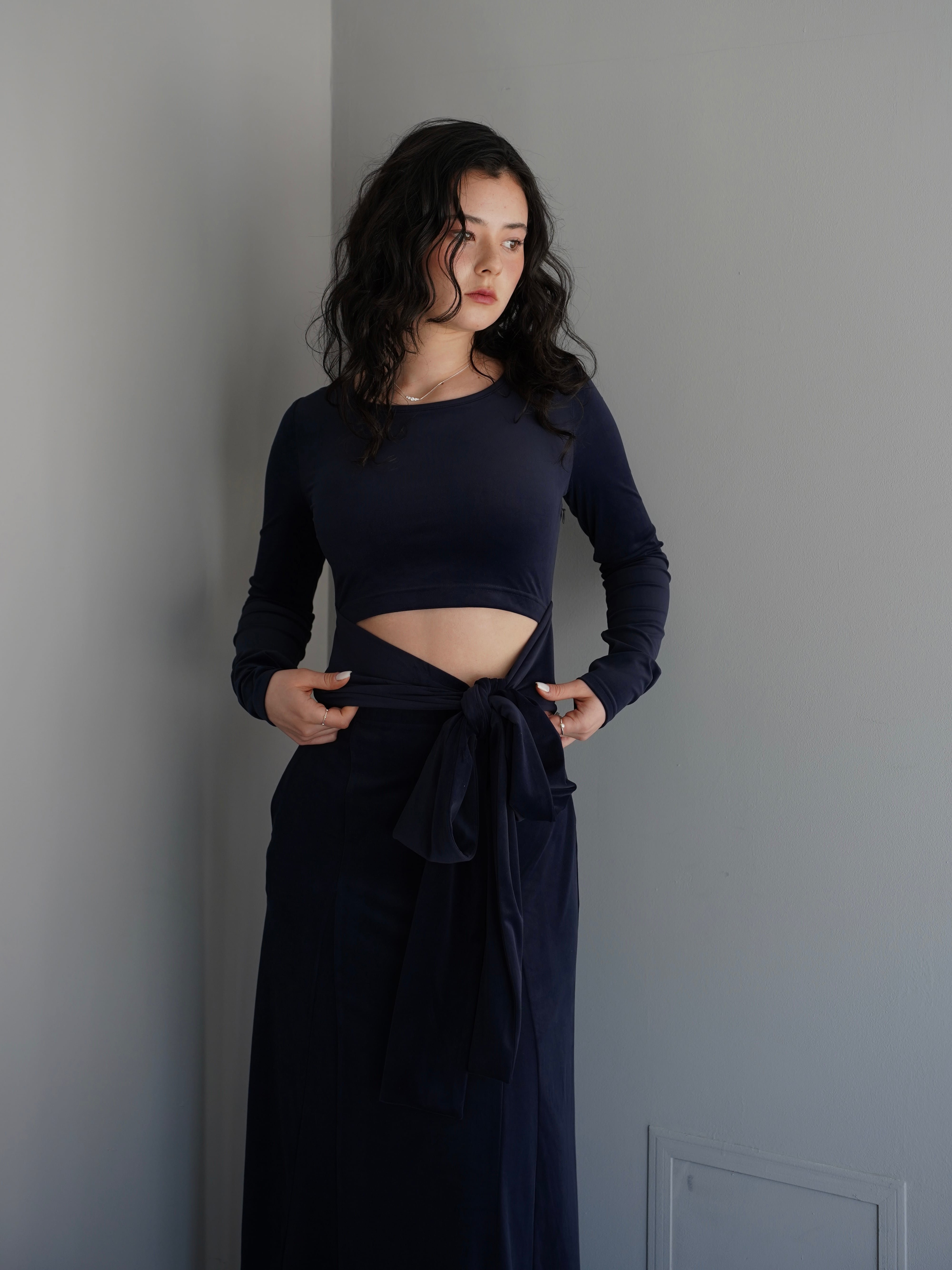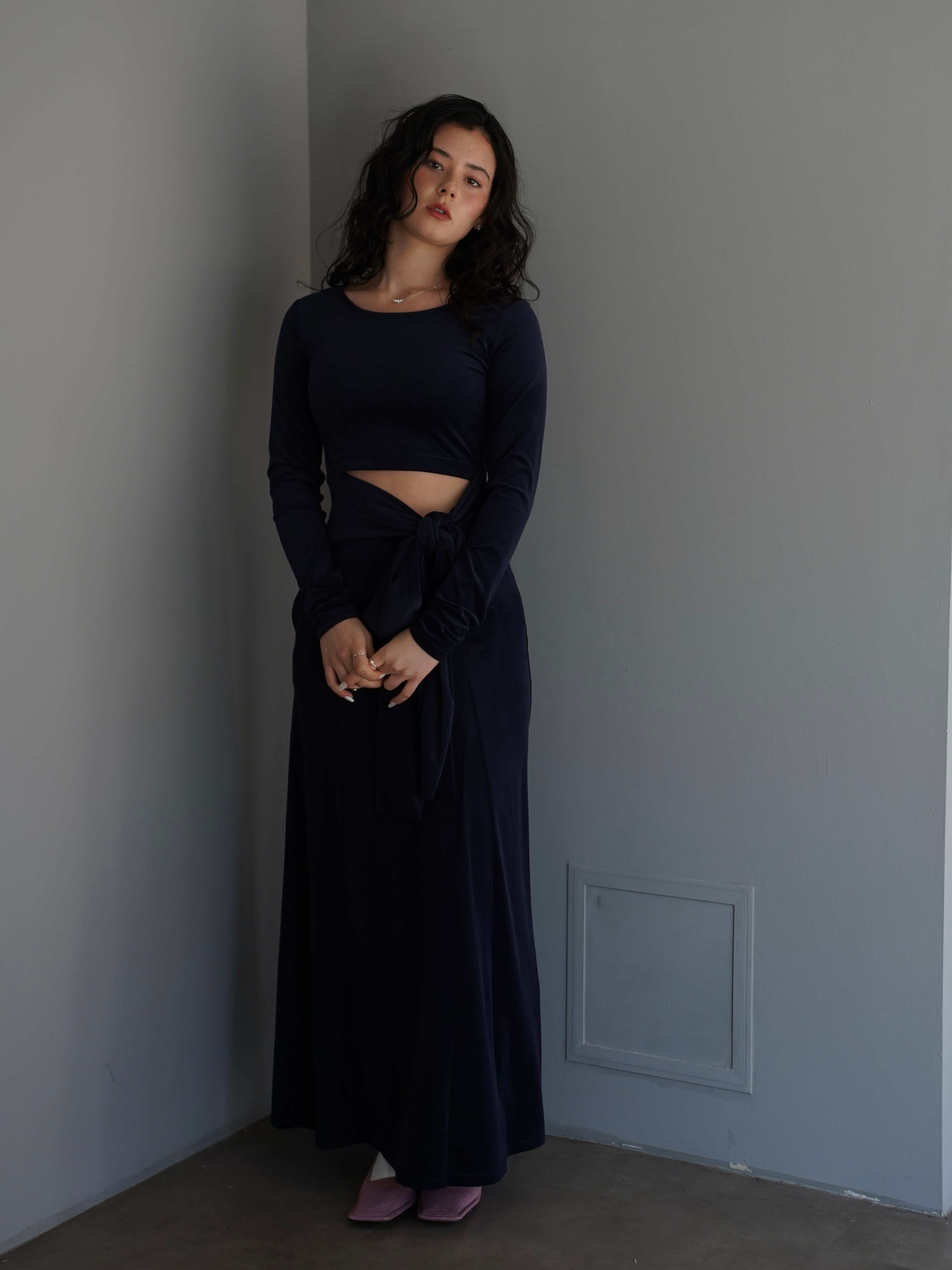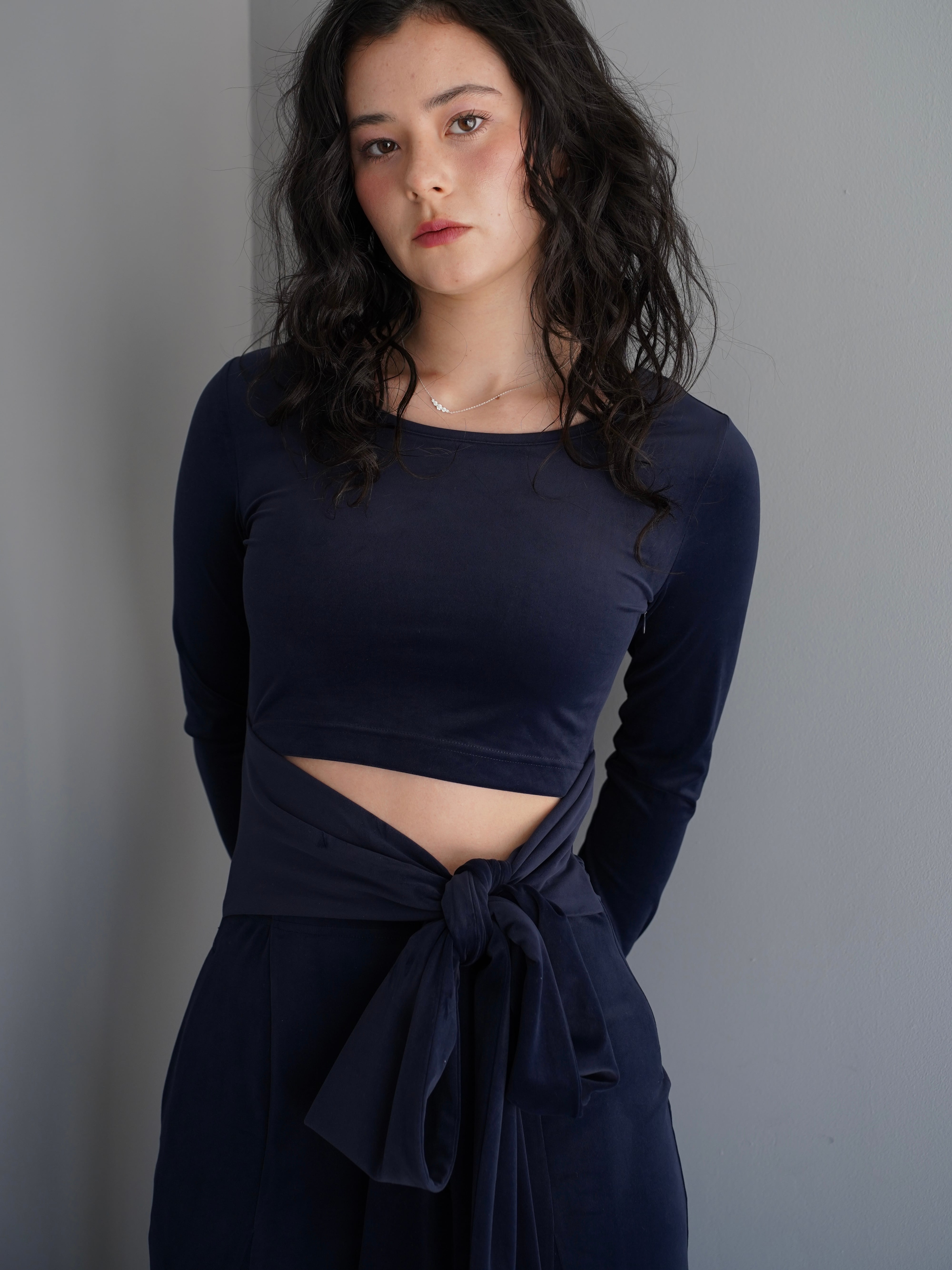 ウエスト部分にさりげなく肌を見せるディテールを加え、前後2WAY仕様でスタイルに合わせて着回していただけます。