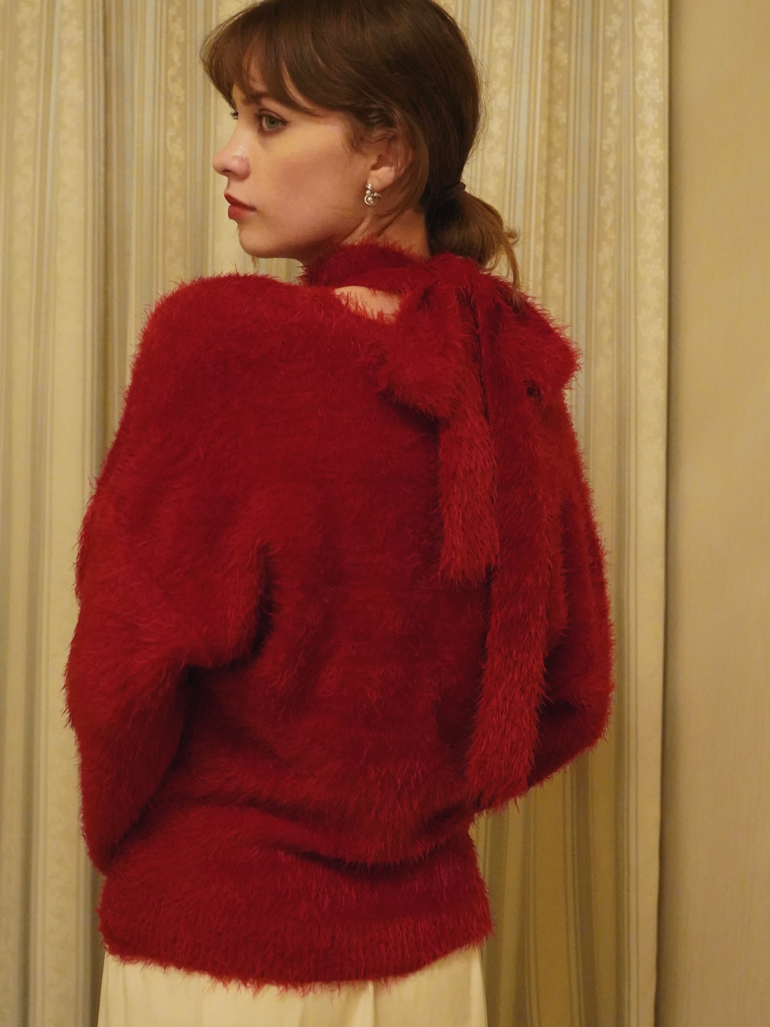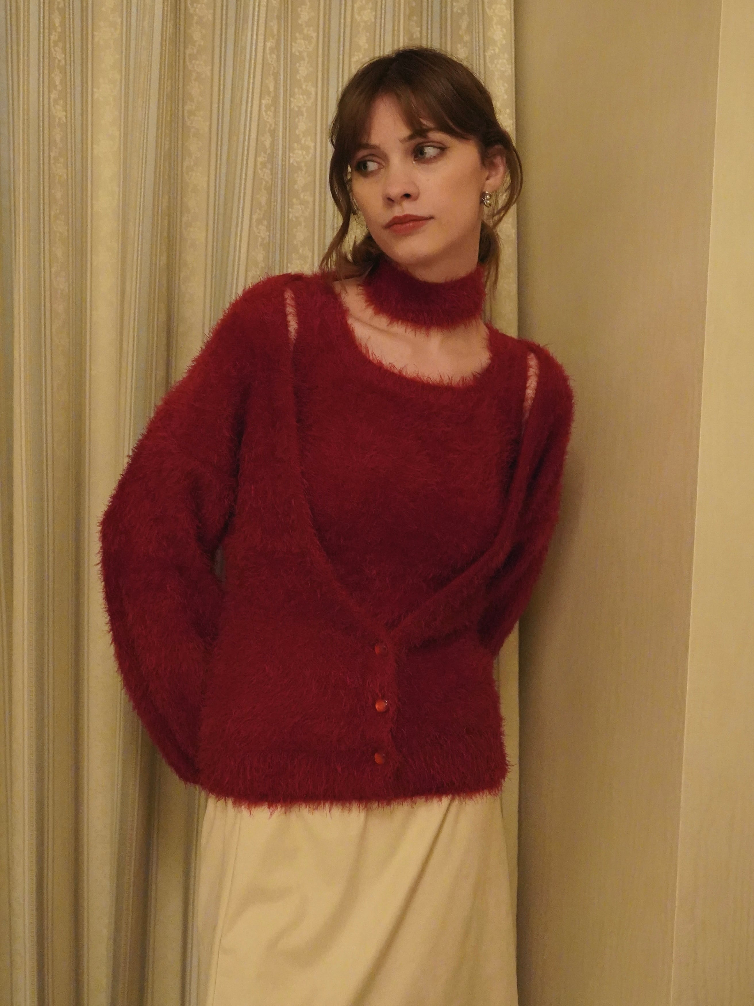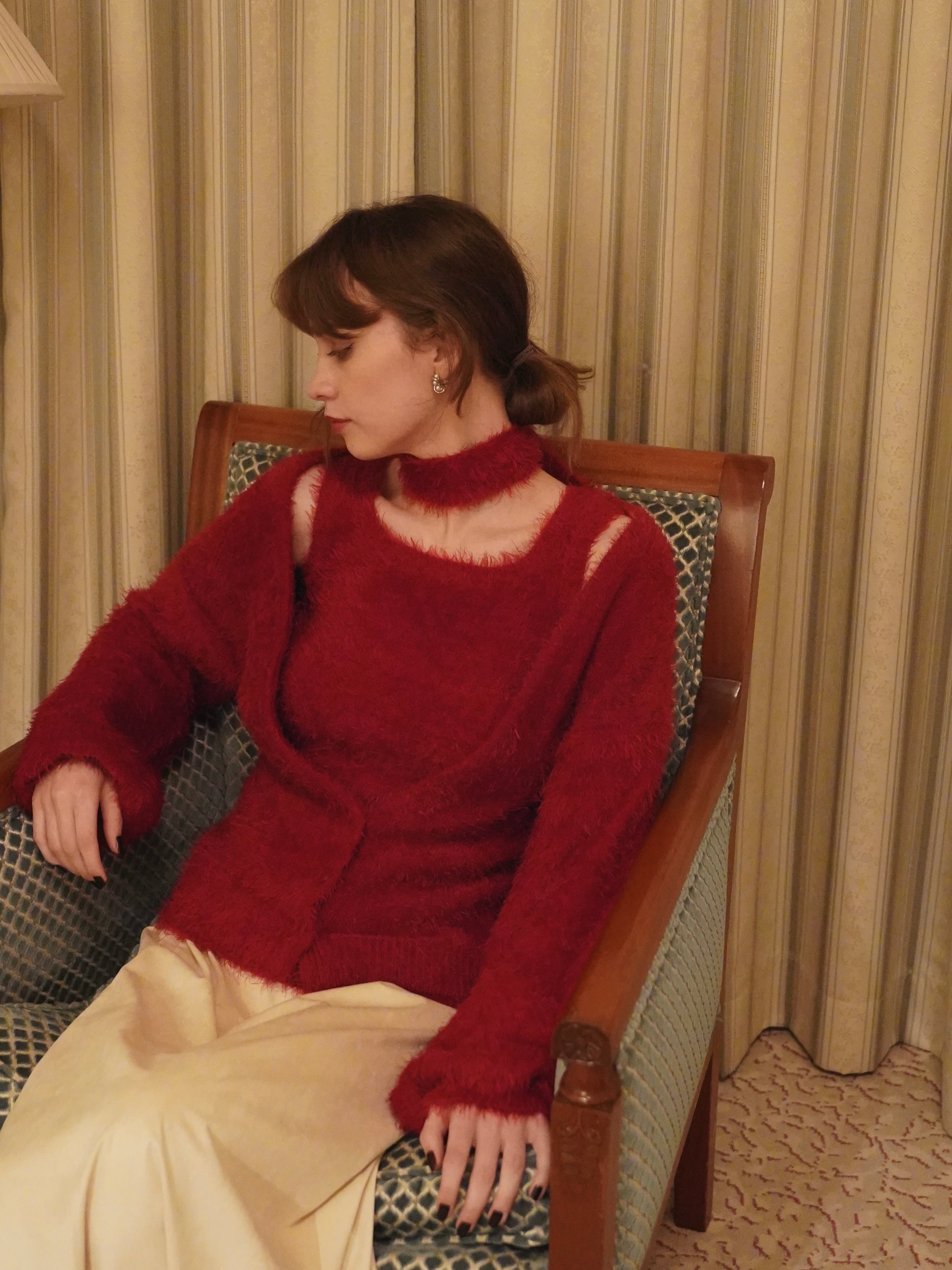 柔らかく、もっちりとした肌触りが魅力のシャギー糸を使用した、カーディガン・タンクトップ・マフラーの3ピースセット。