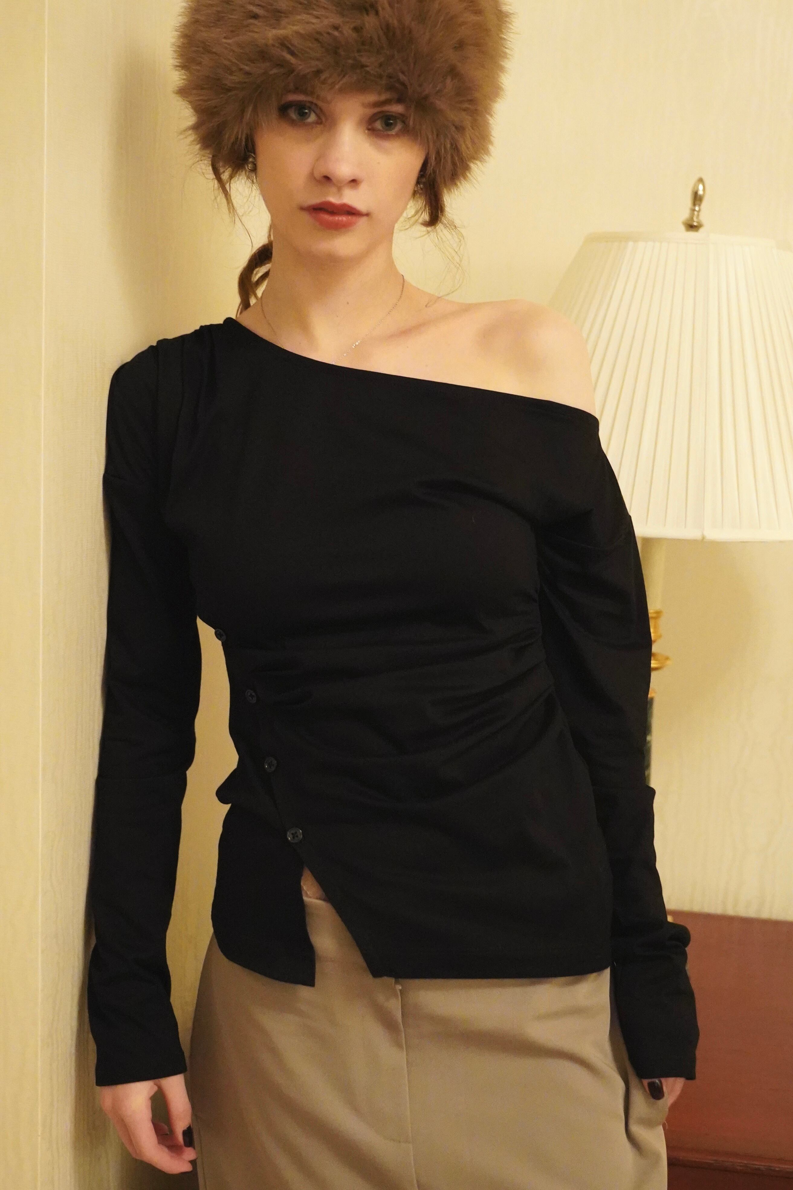 ネック部分には大胆なワンショルダーデザインを採用し、肌が美しく見えるネックラインにこだわりました。