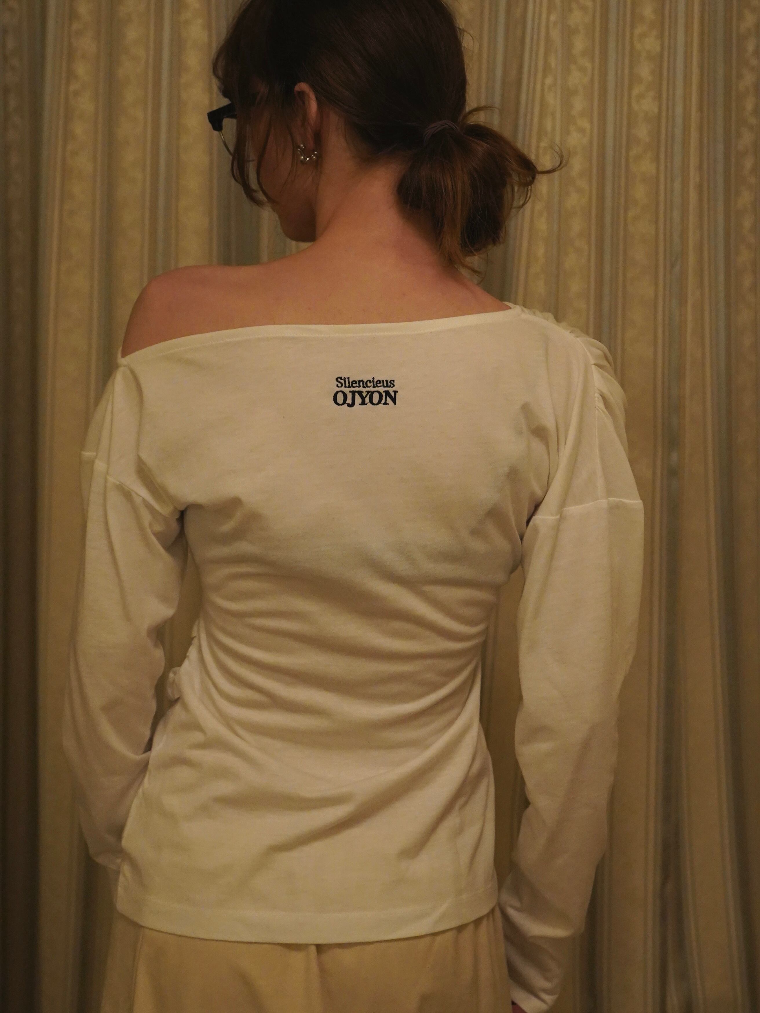 今季のコレクションタイトル “Silencieuse”の刺繍をバックデザインに施した、デザイントップス。