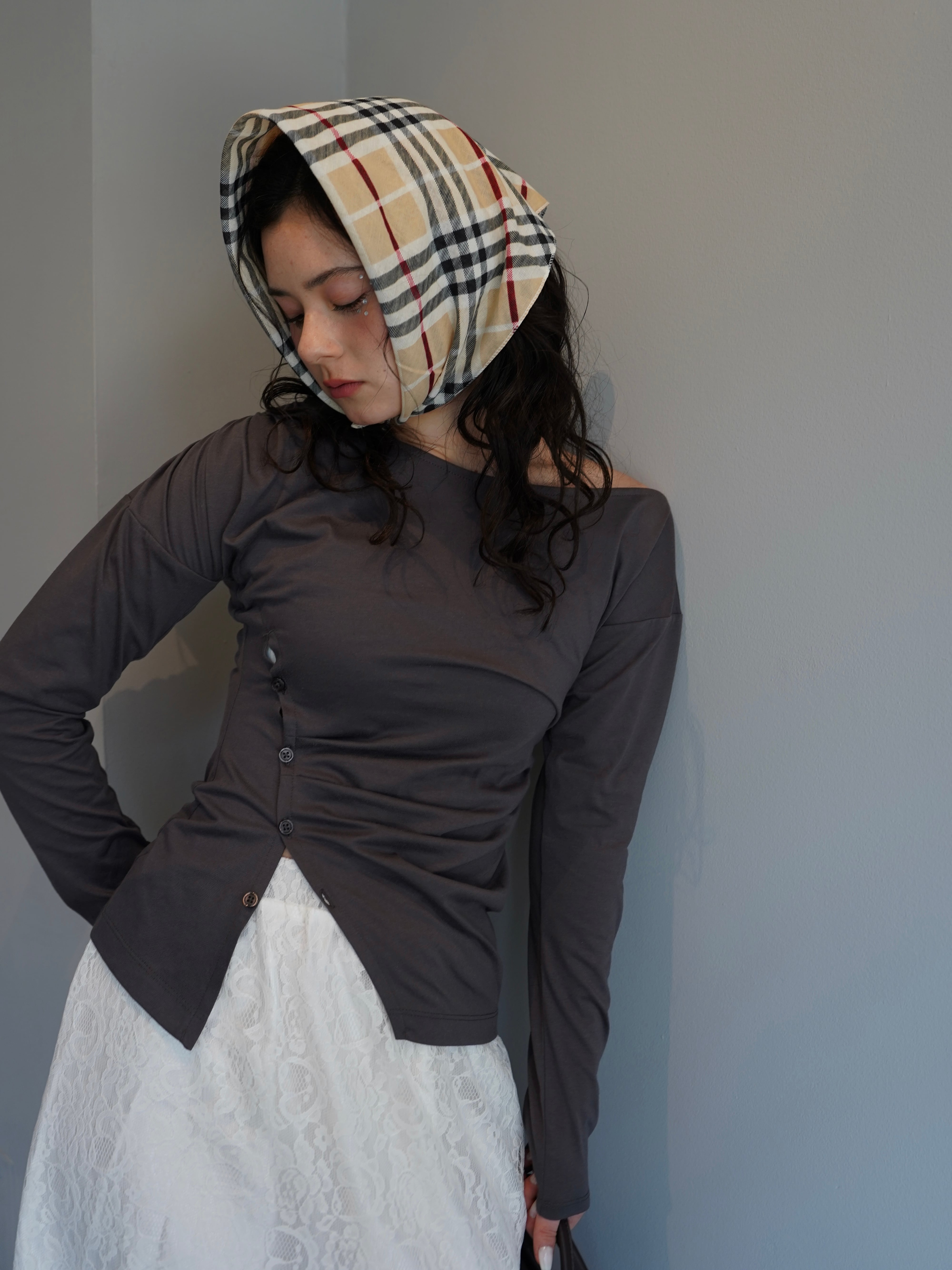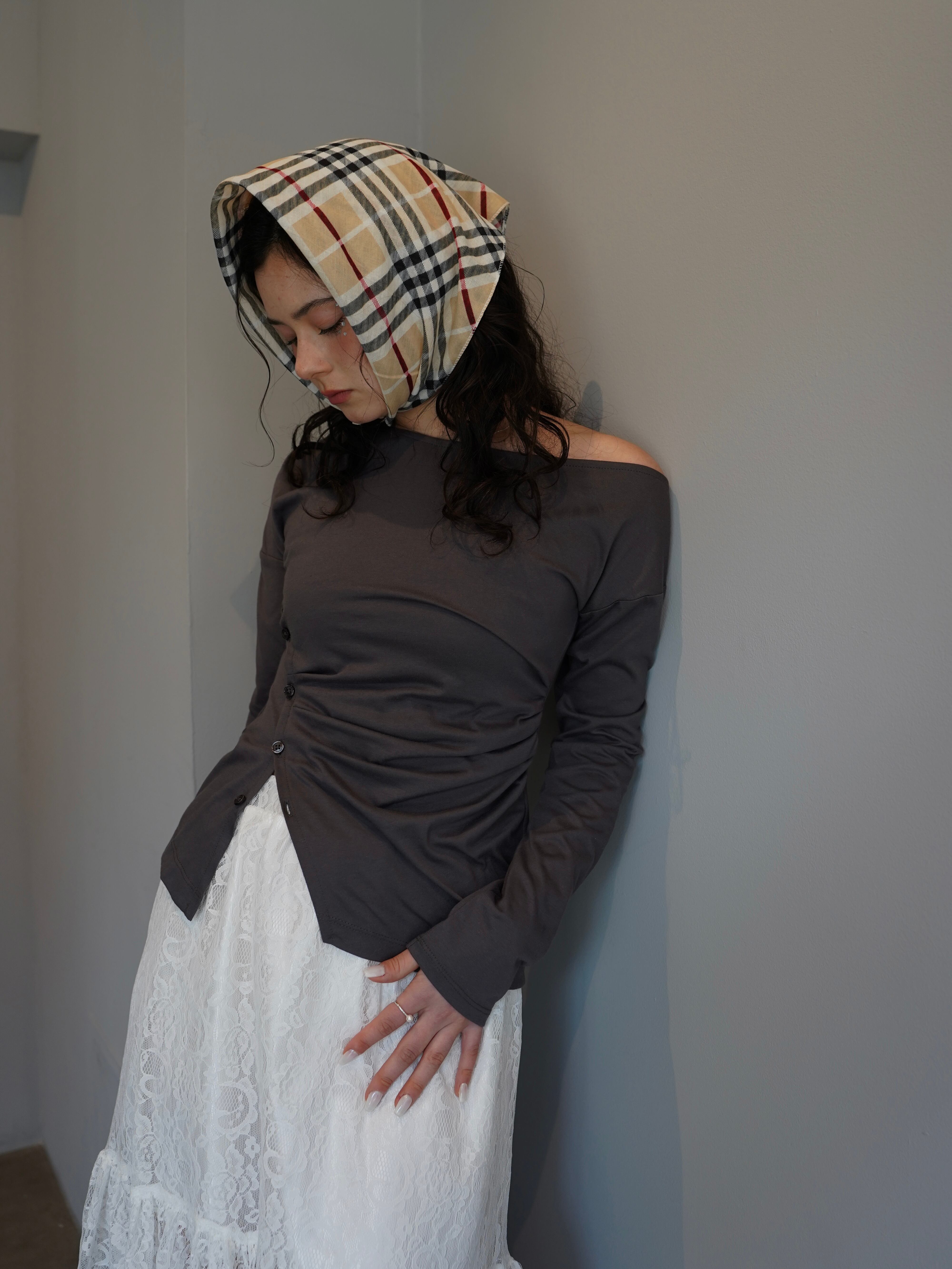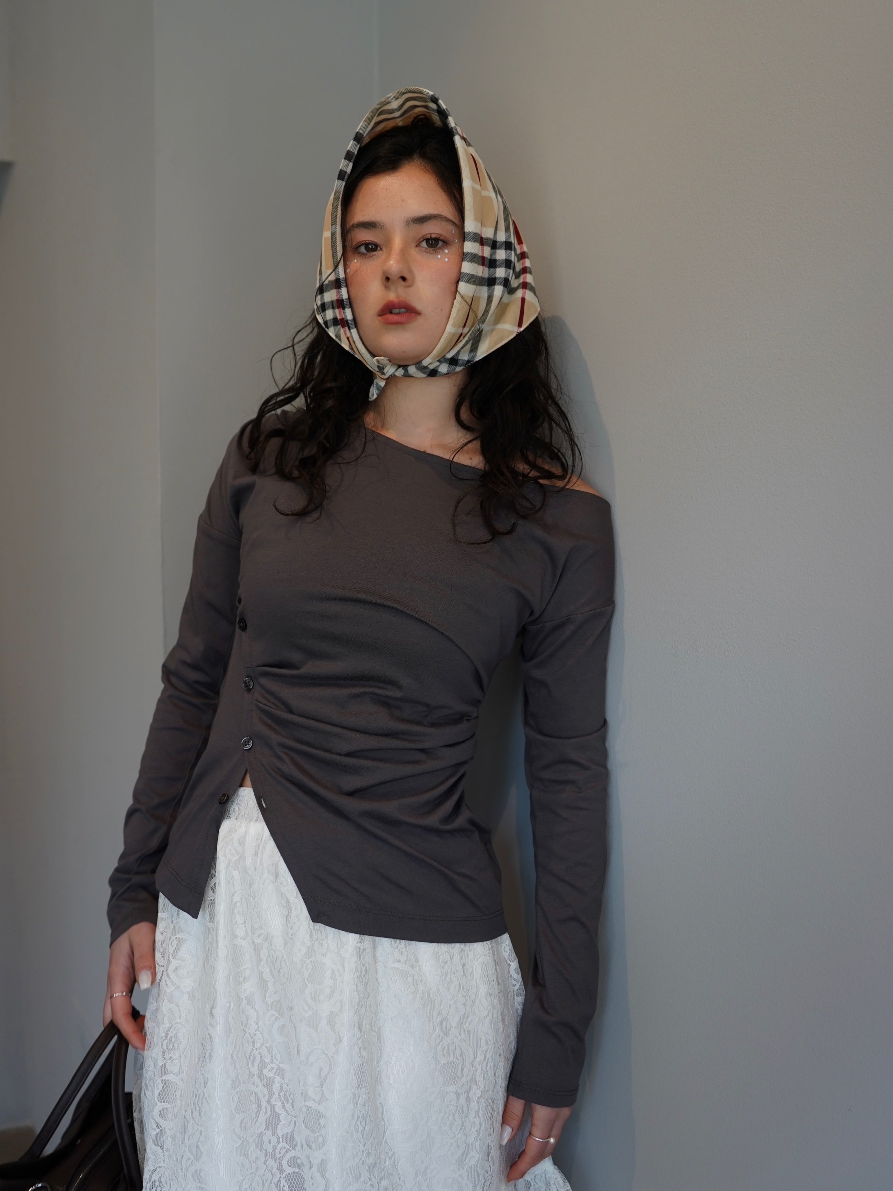 ネック部分には大胆なワンショルダーデザインを採用し、肌が美しく見えるネックラインにこだわりました。