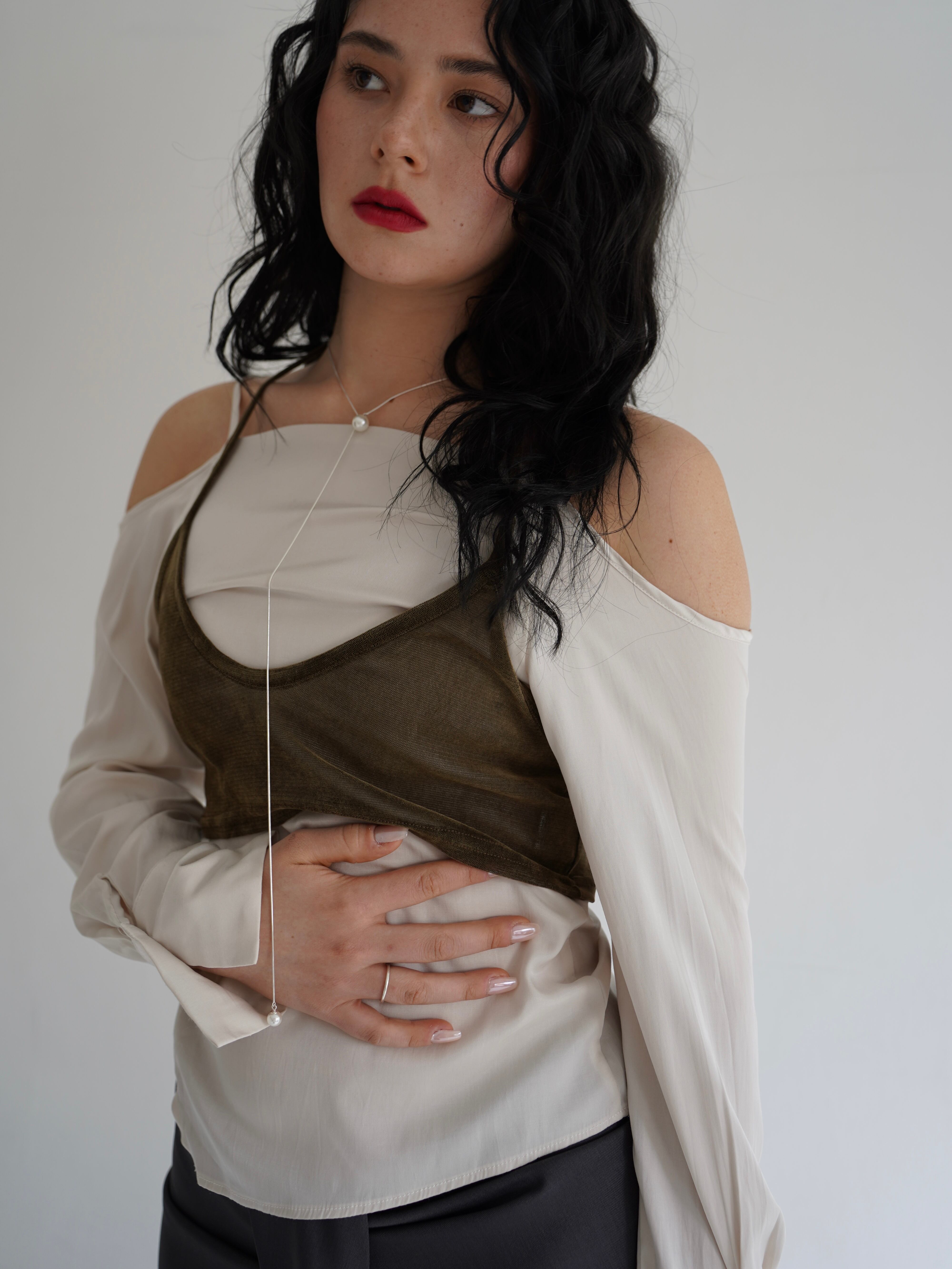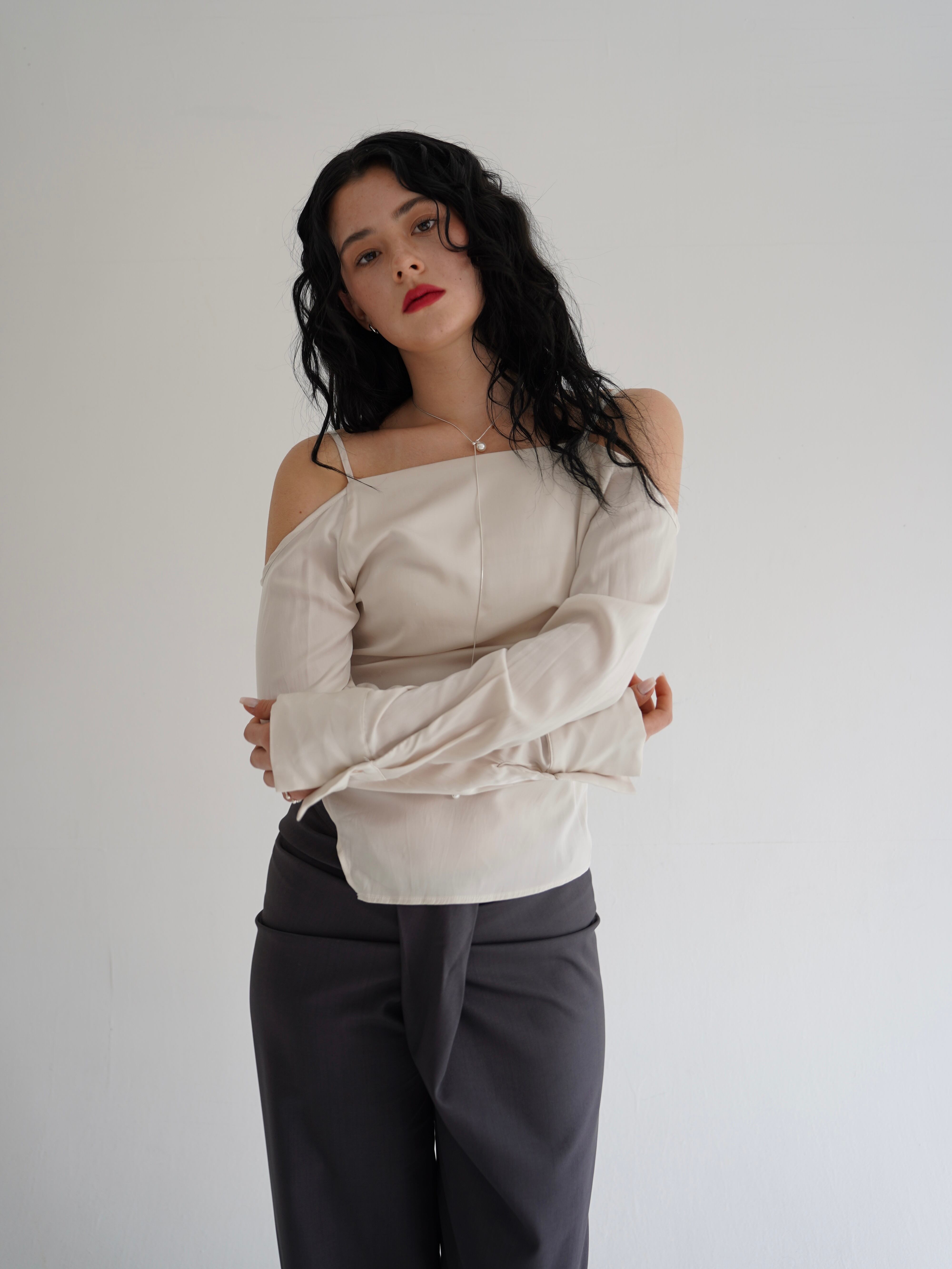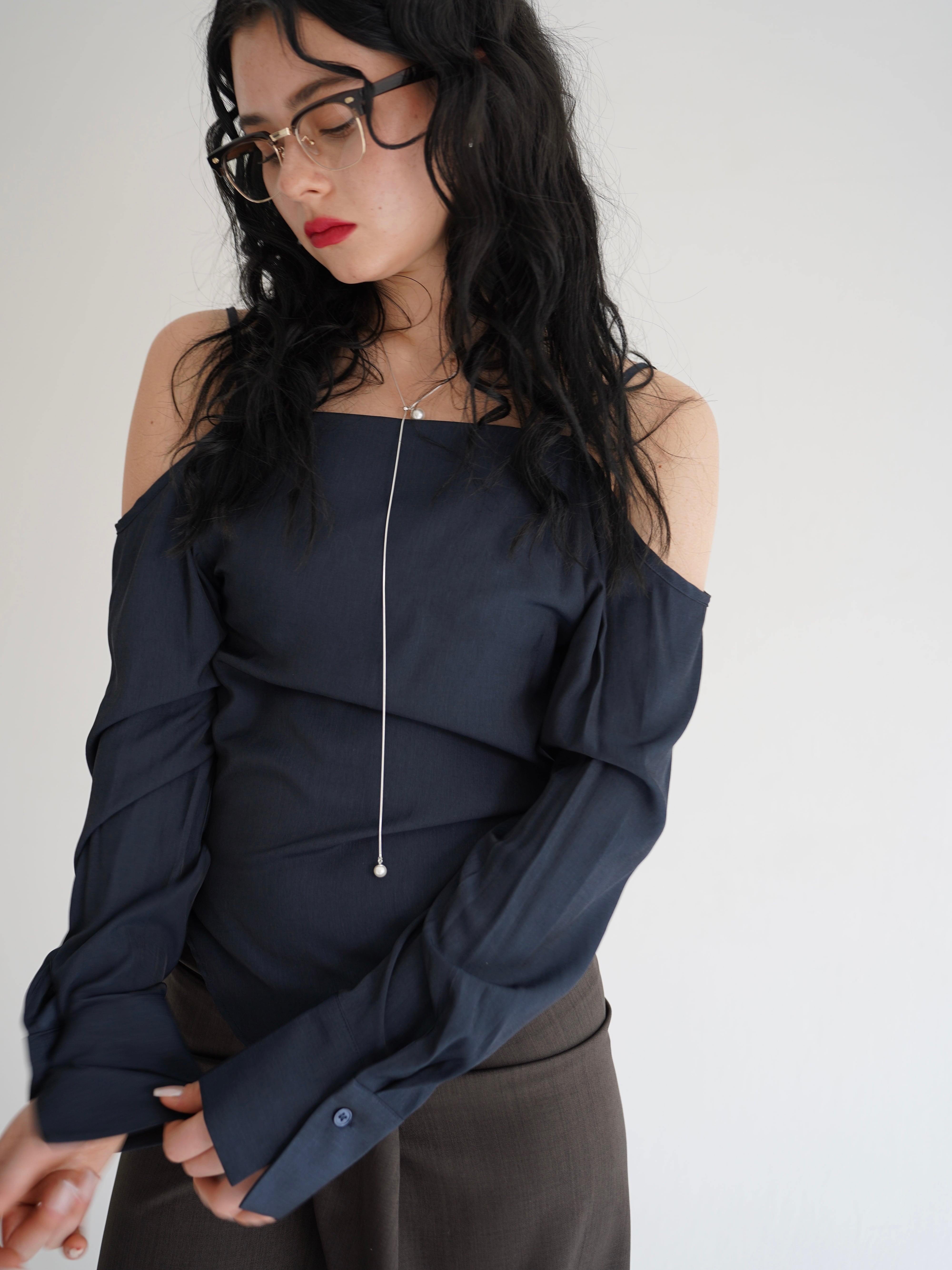 デコルテラインを美しく引き立てるオフショルデザインに、
