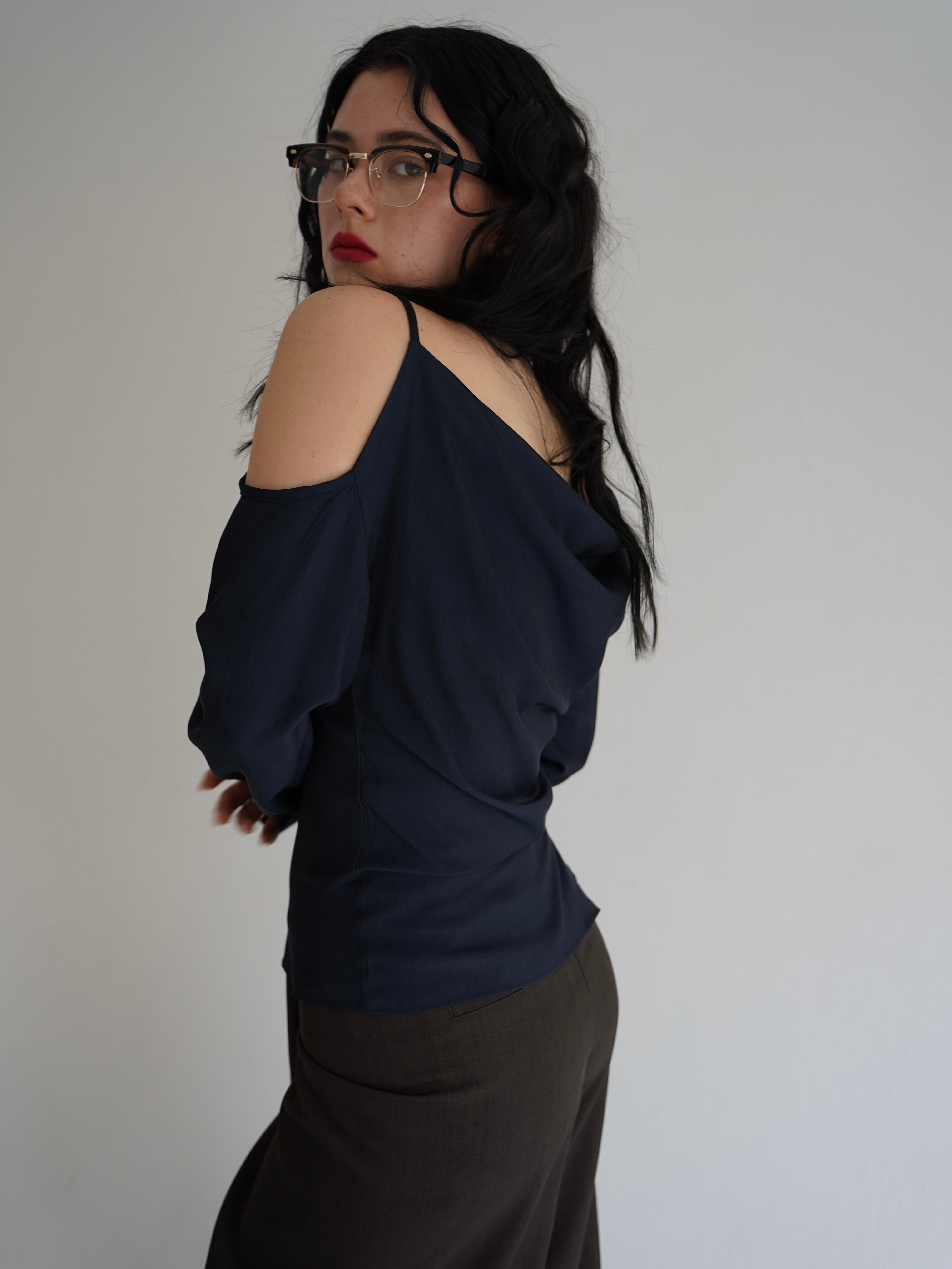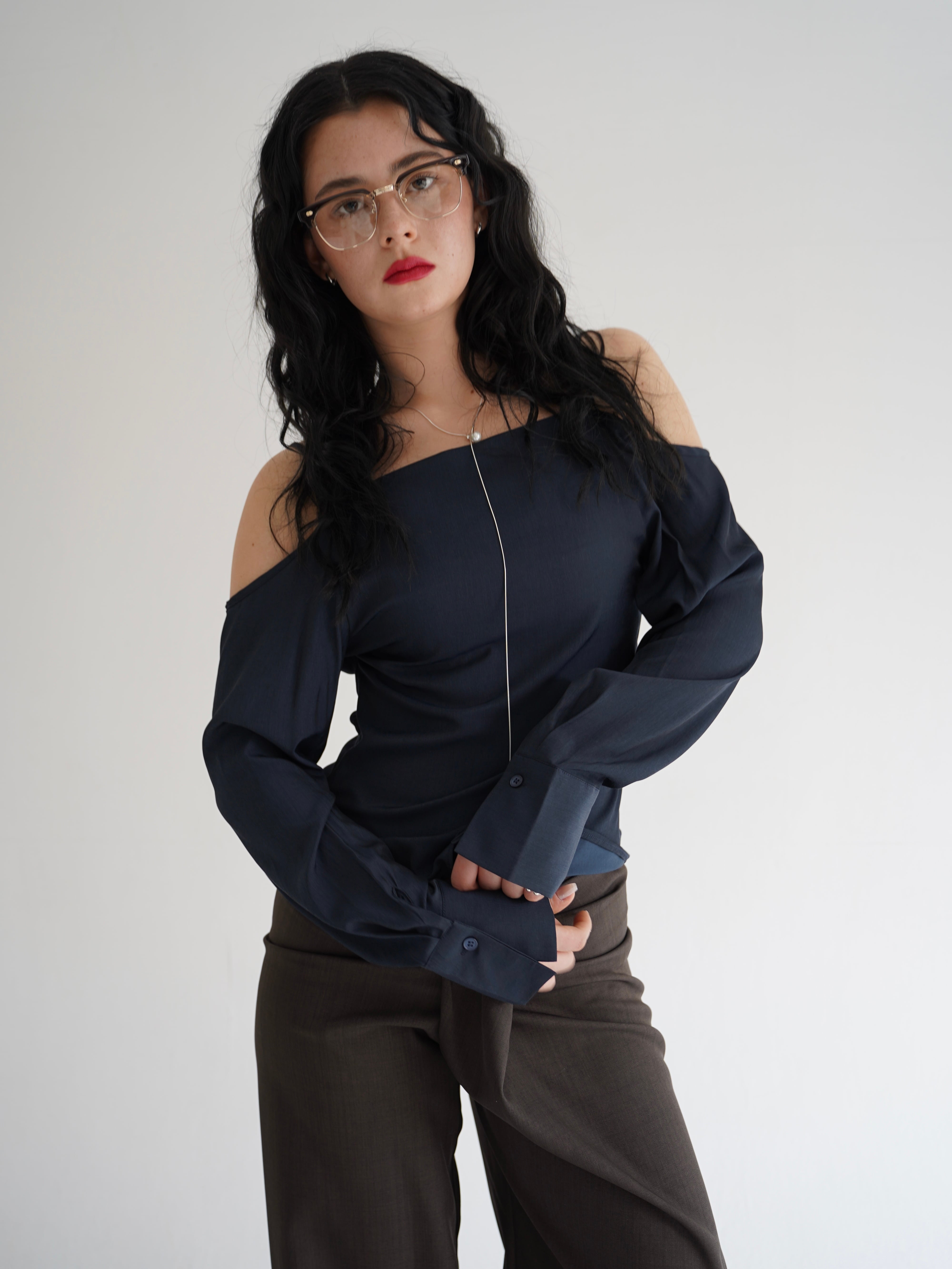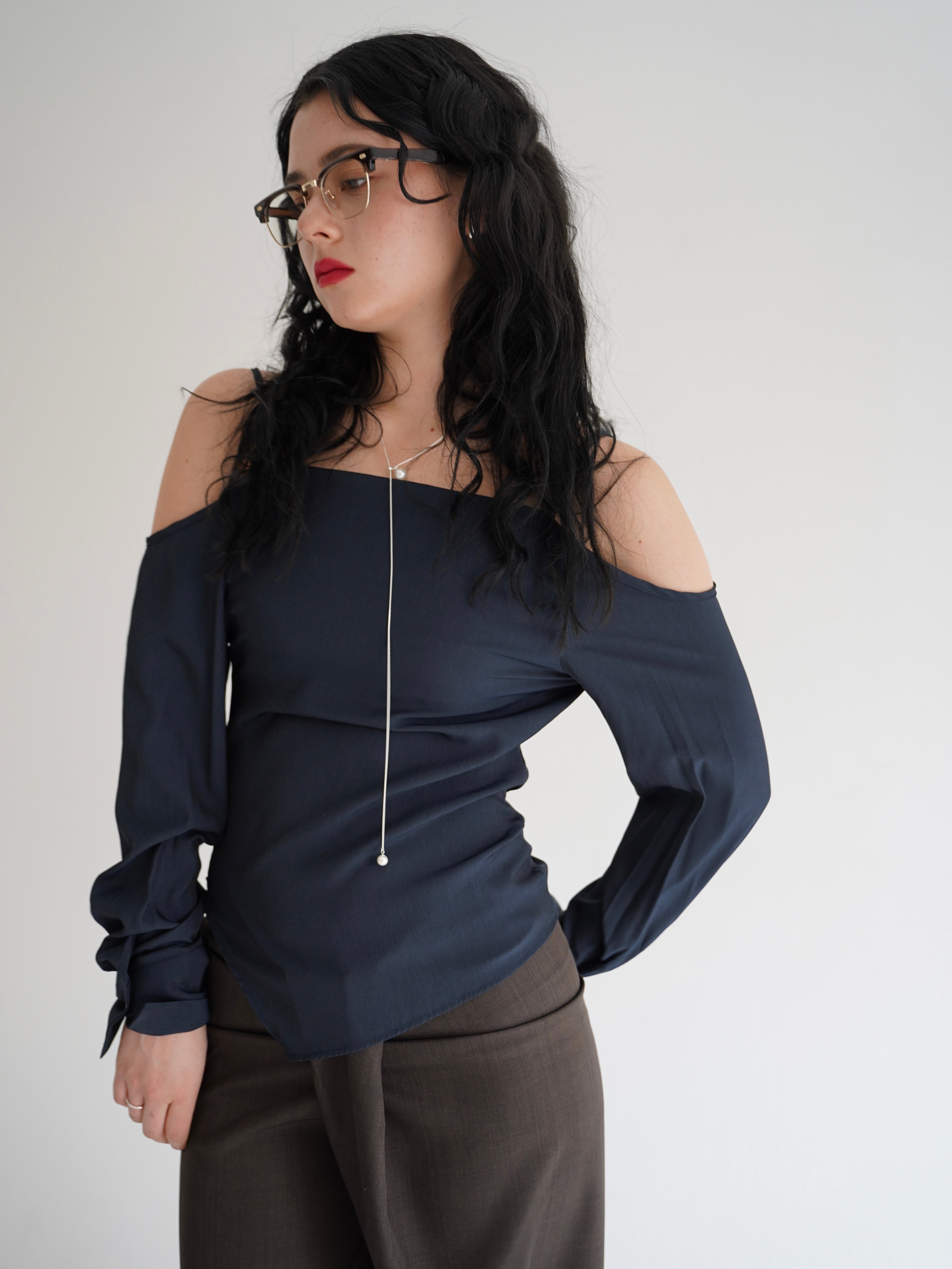 デコルテラインを美しく引き立てるオフショルデザインに、
