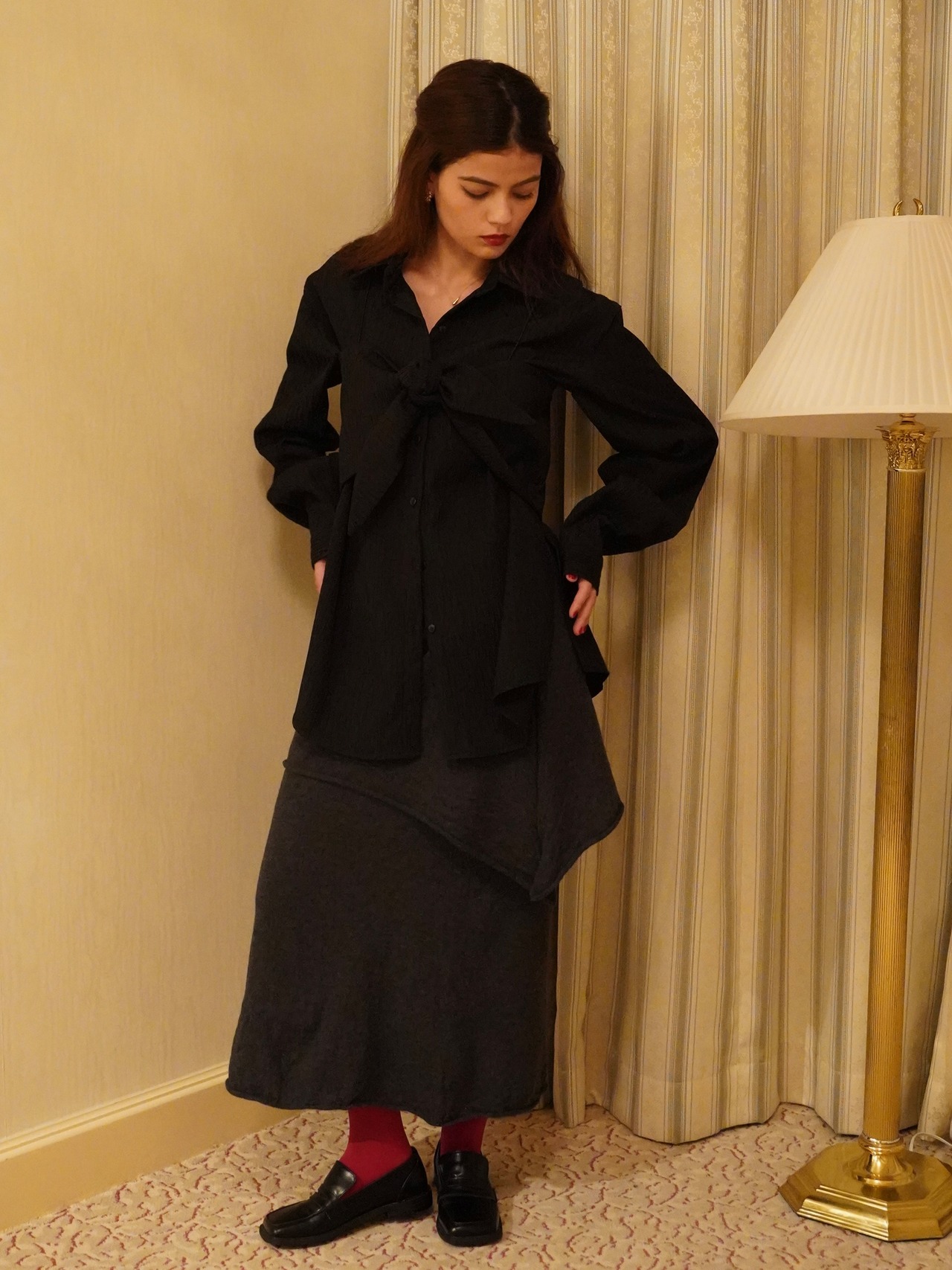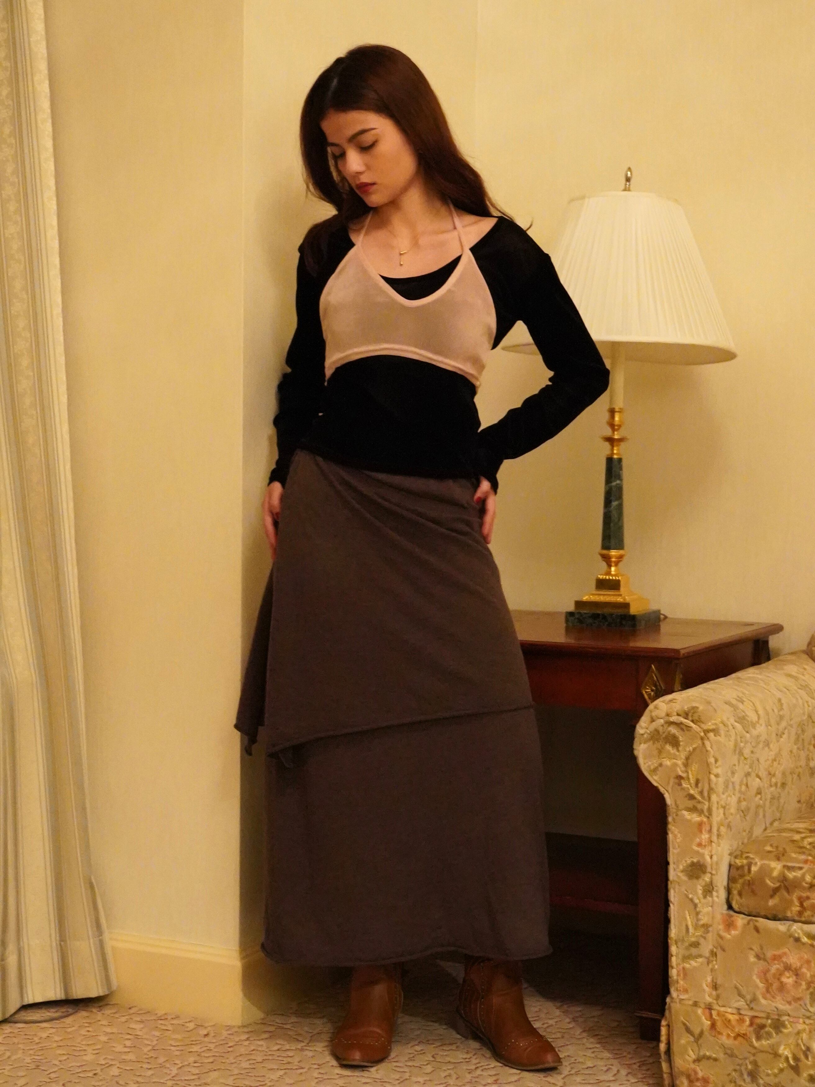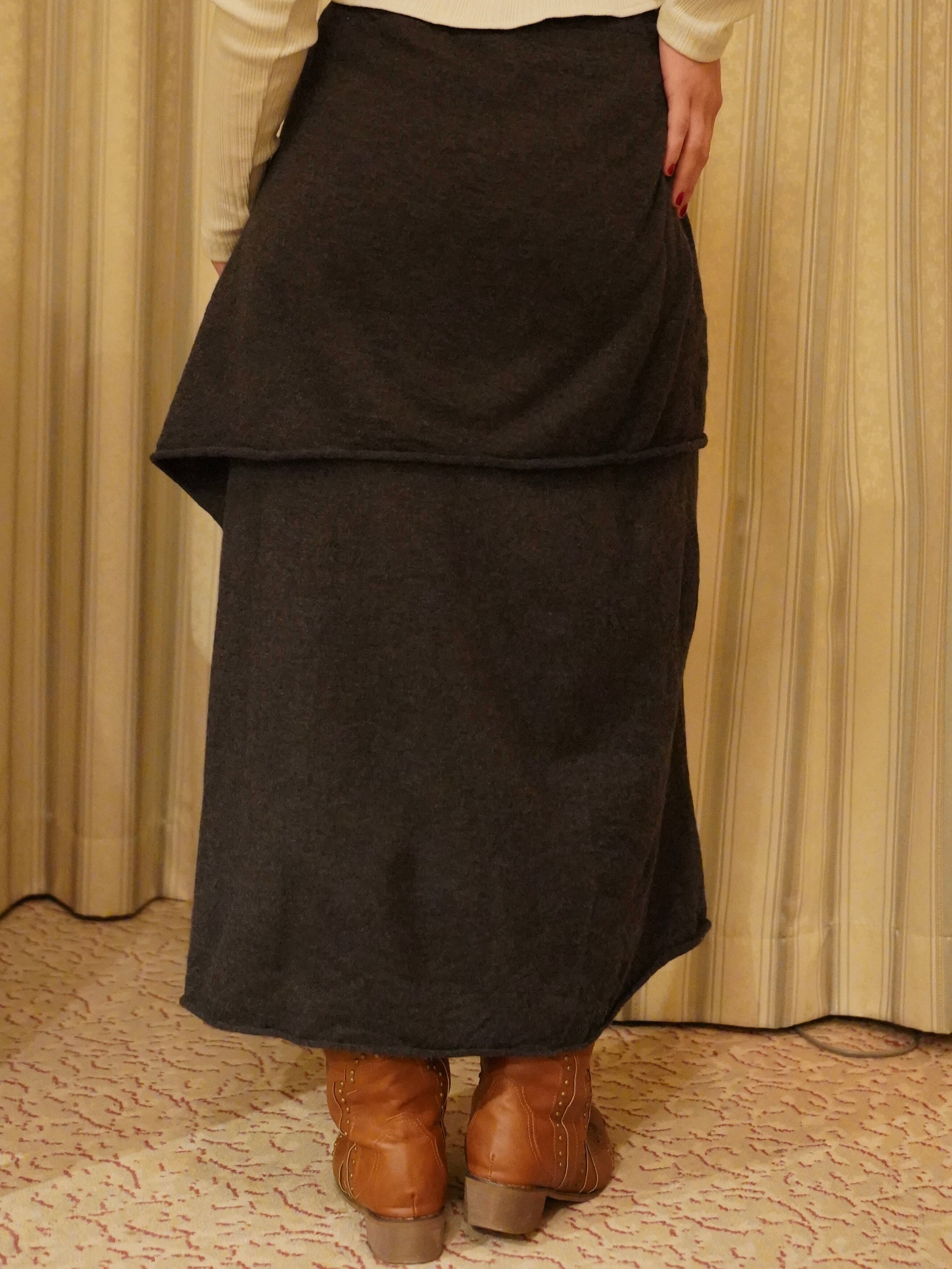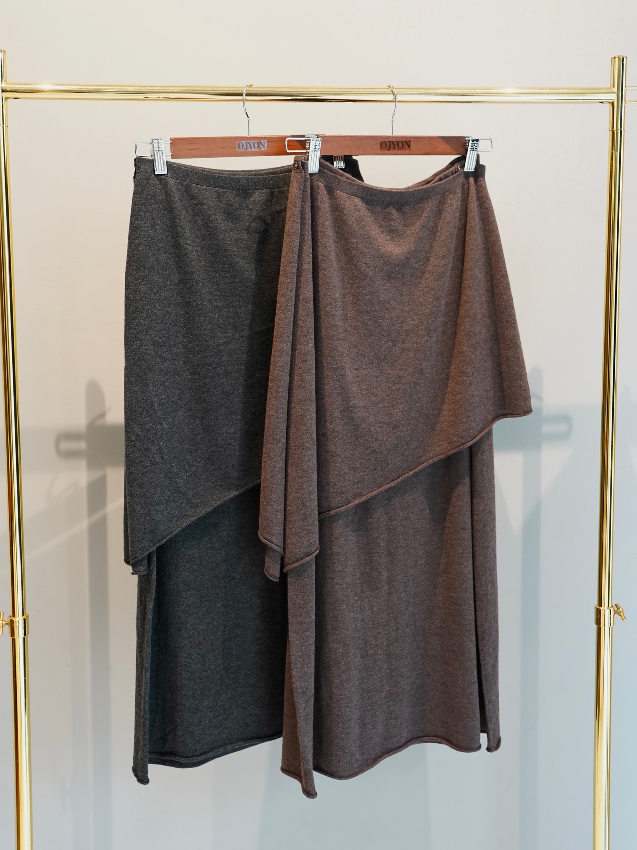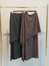 シンプルなストレートスカートとしても、モードなレイヤードスカートとしても、気分に合わせて着まわせます。