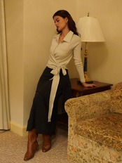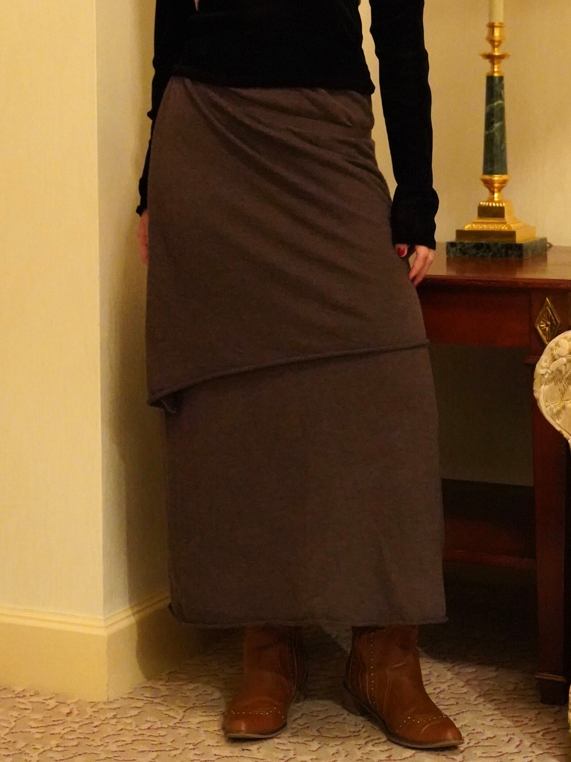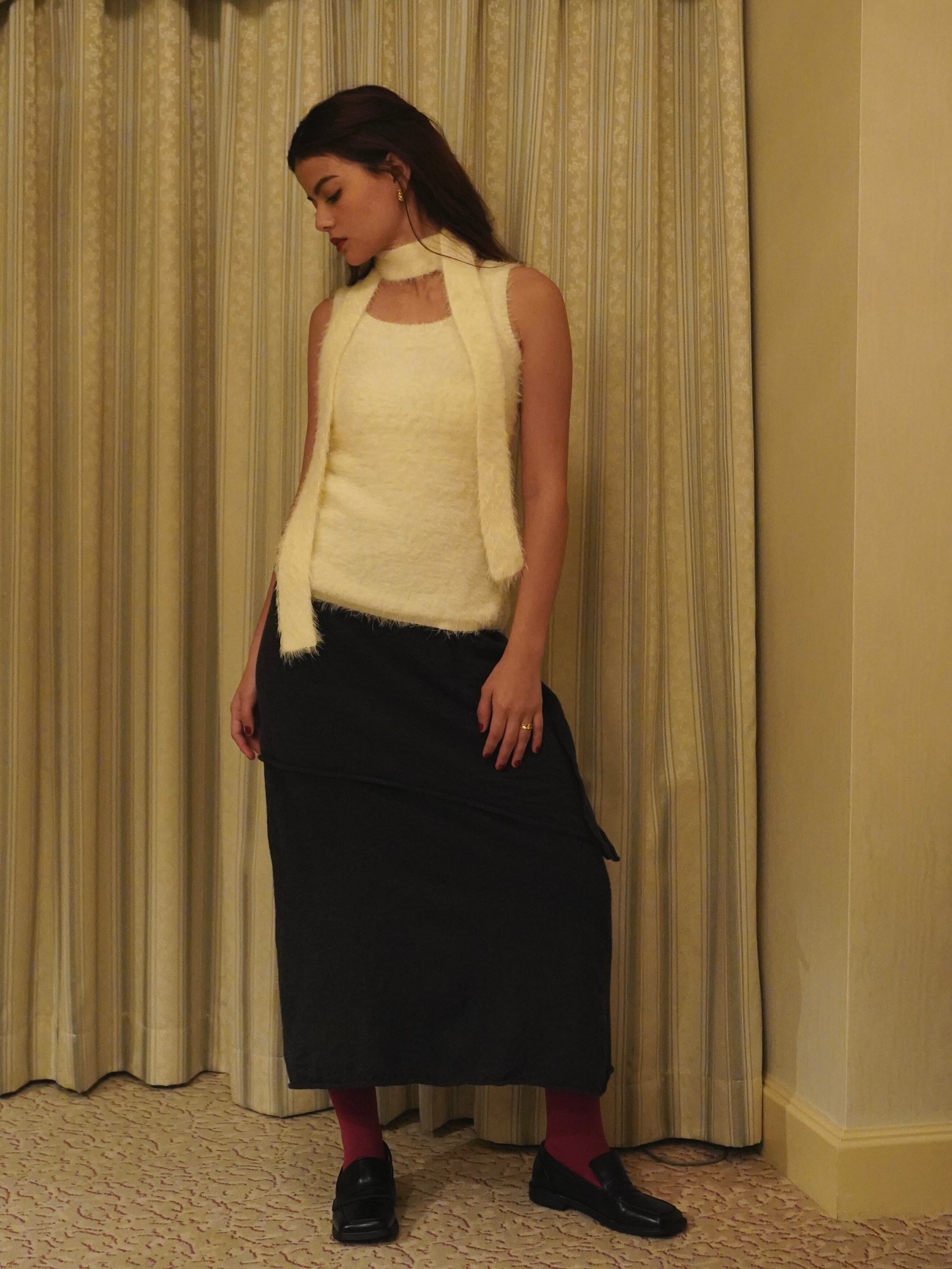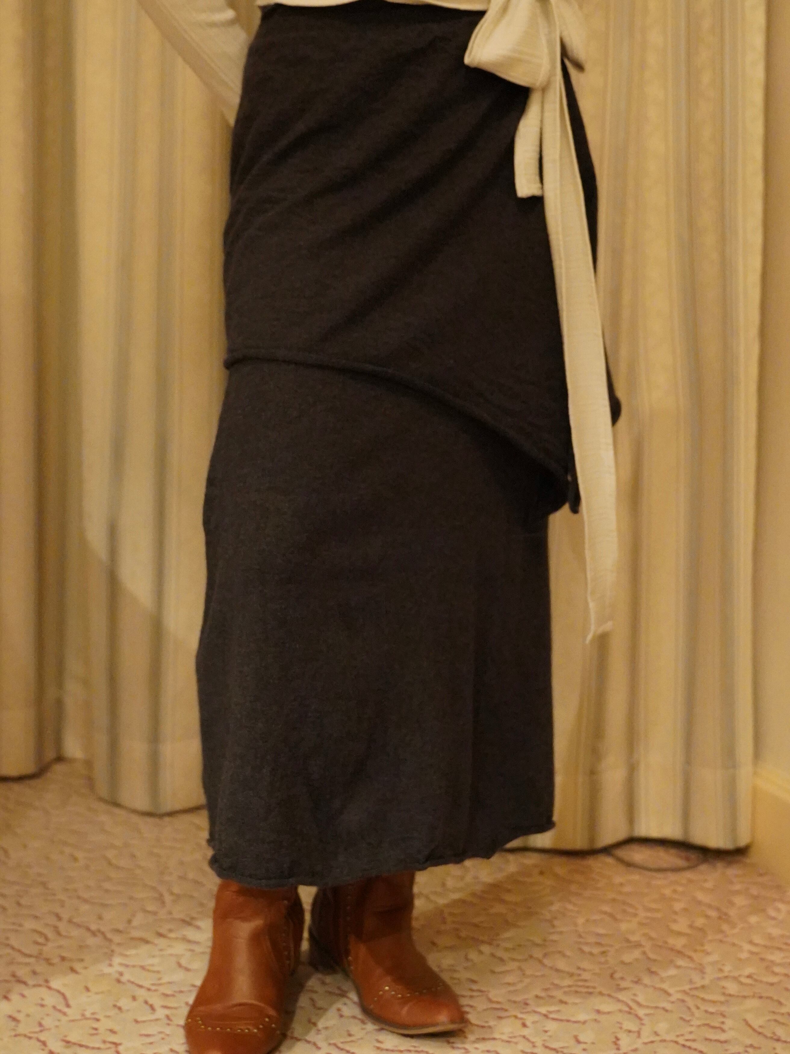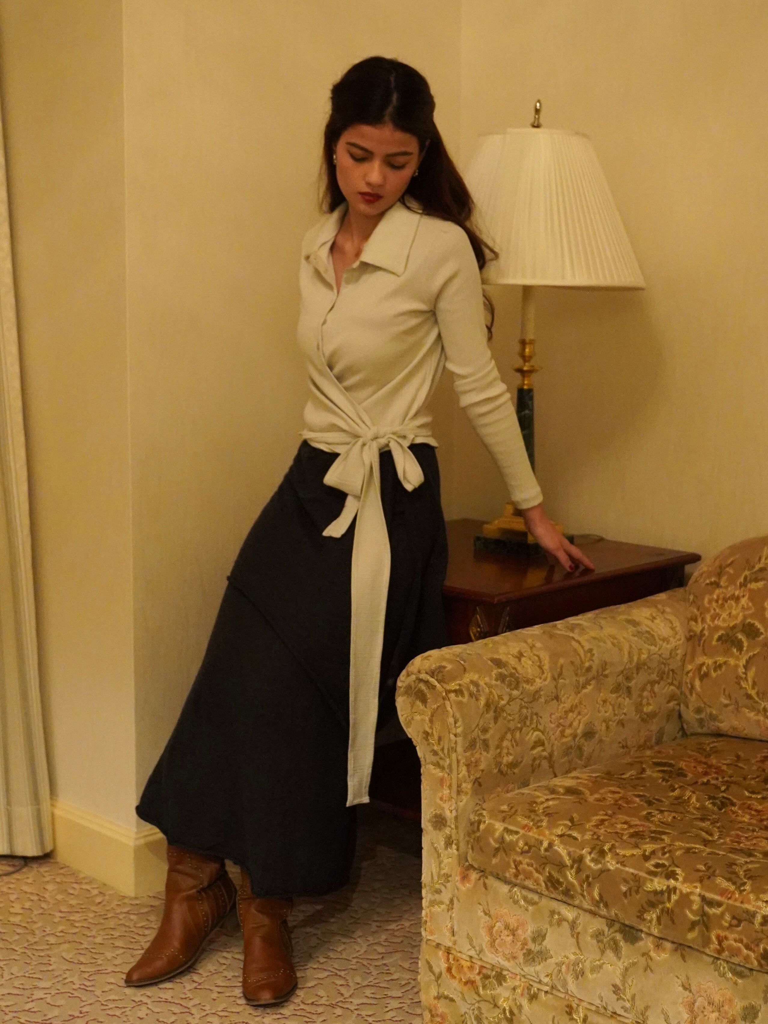 シンプルなストレートスカートとしても、モードなレイヤードスカートとしても、気分に合わせて着まわせます。