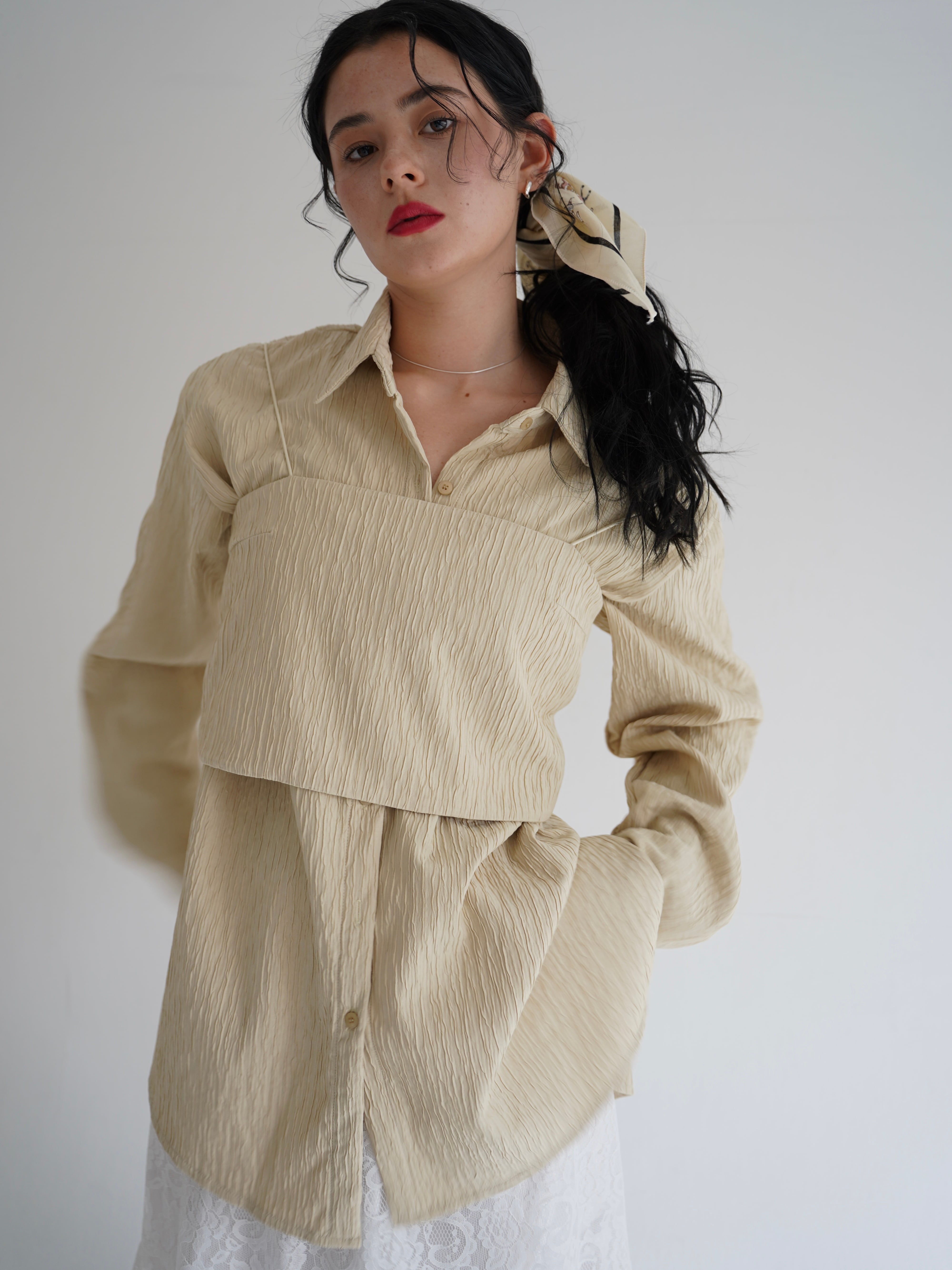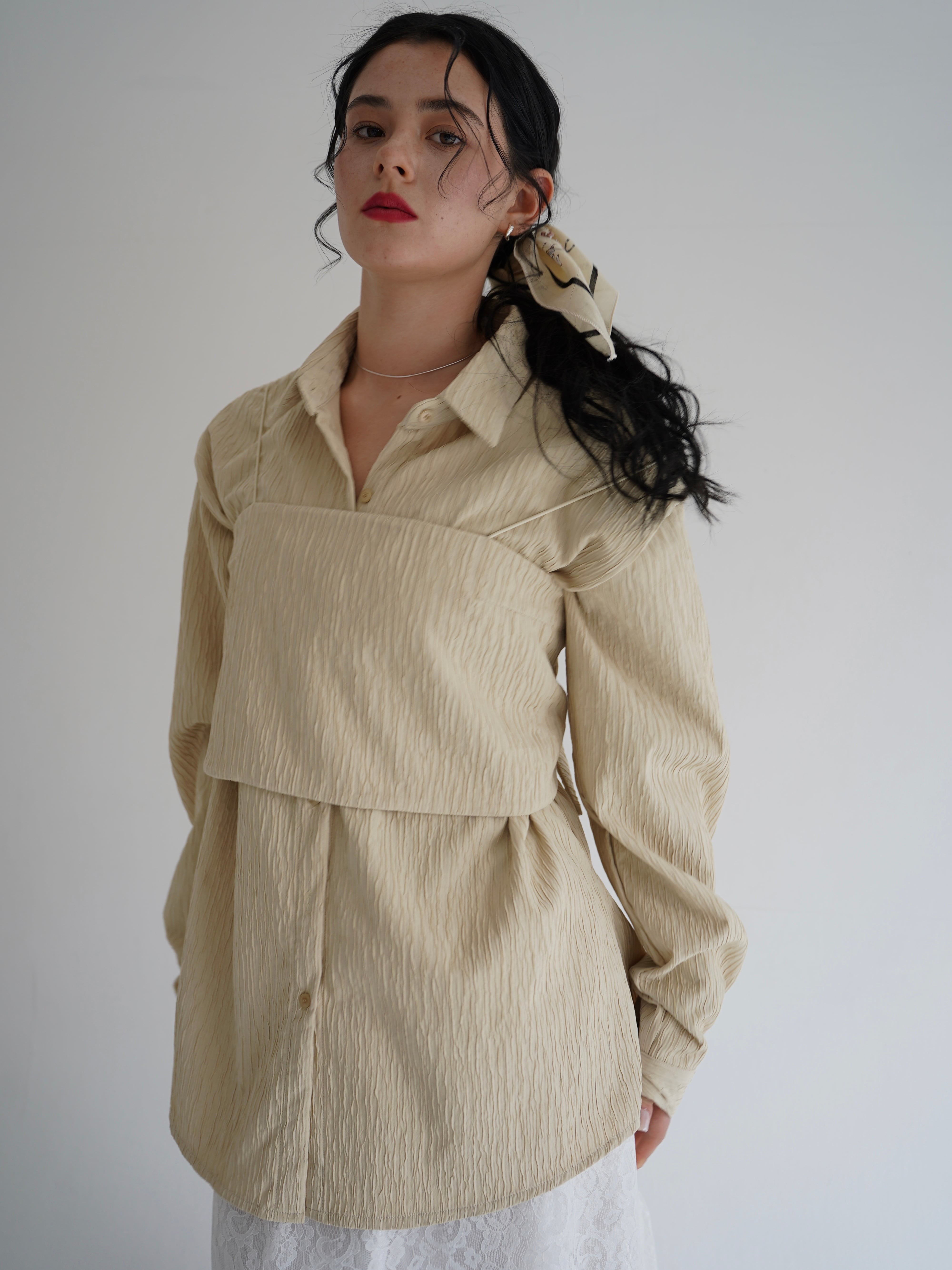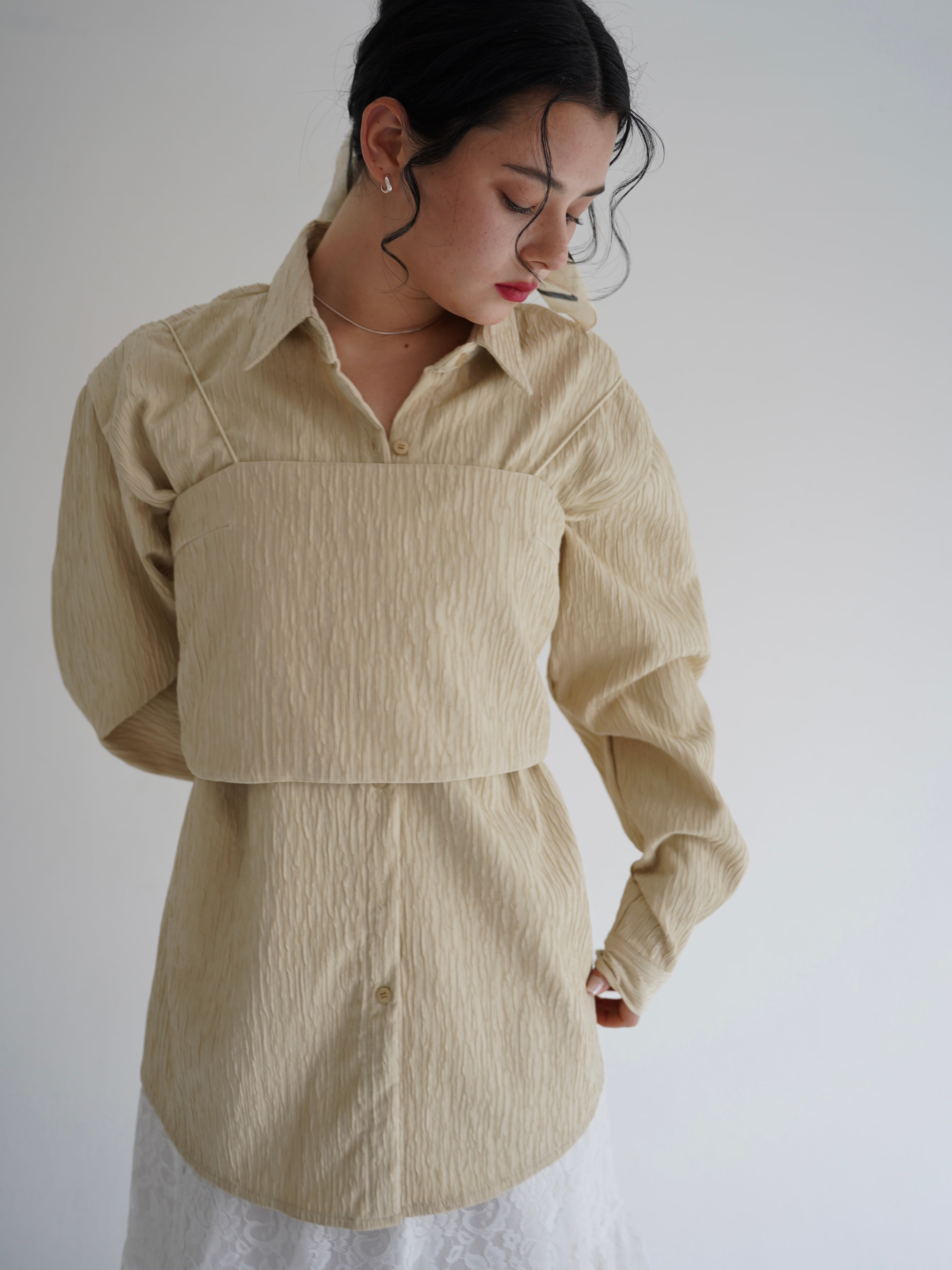 表情のあるシボ感素材で仕立てたシャツ&ビスチェセット。
