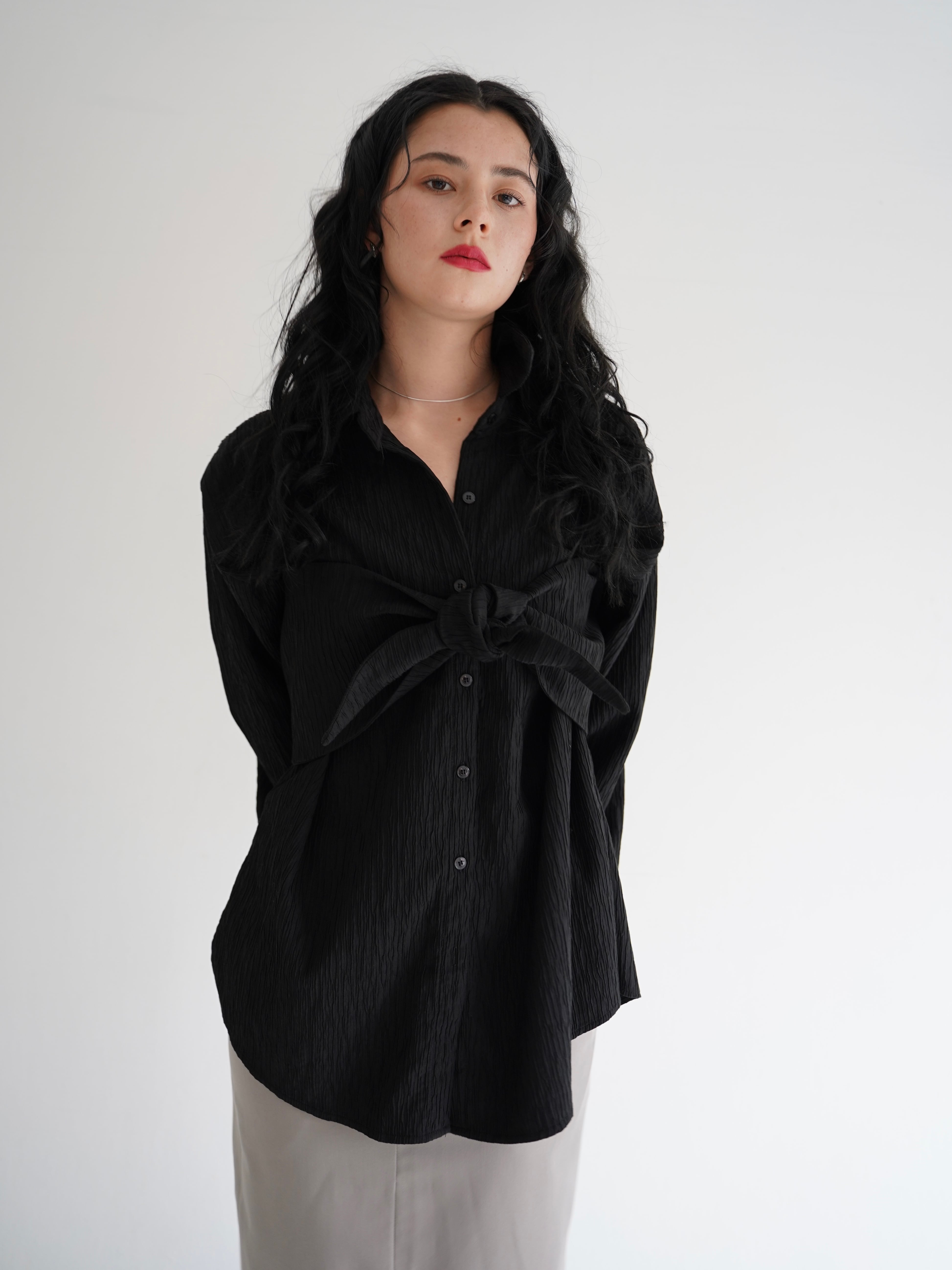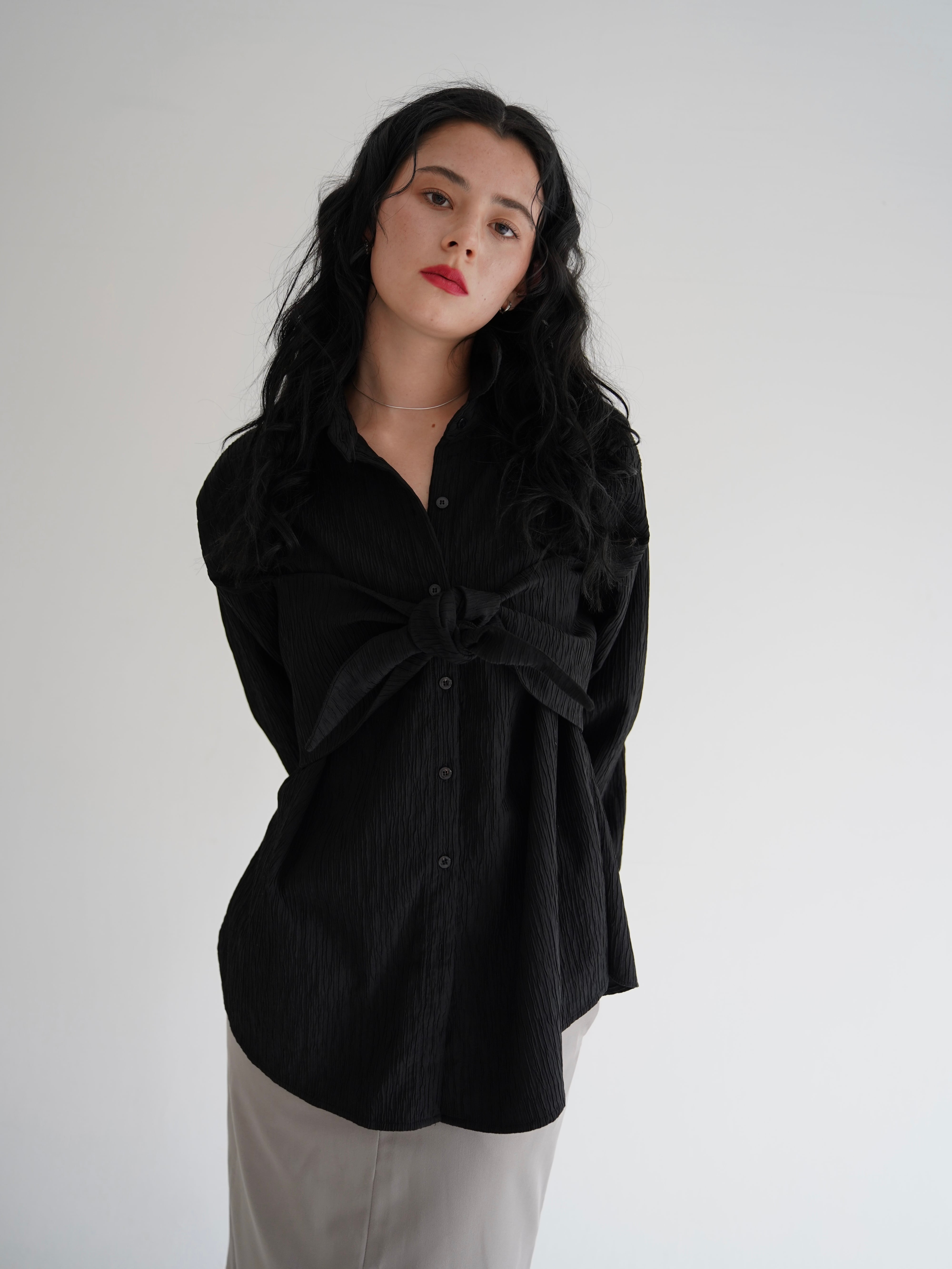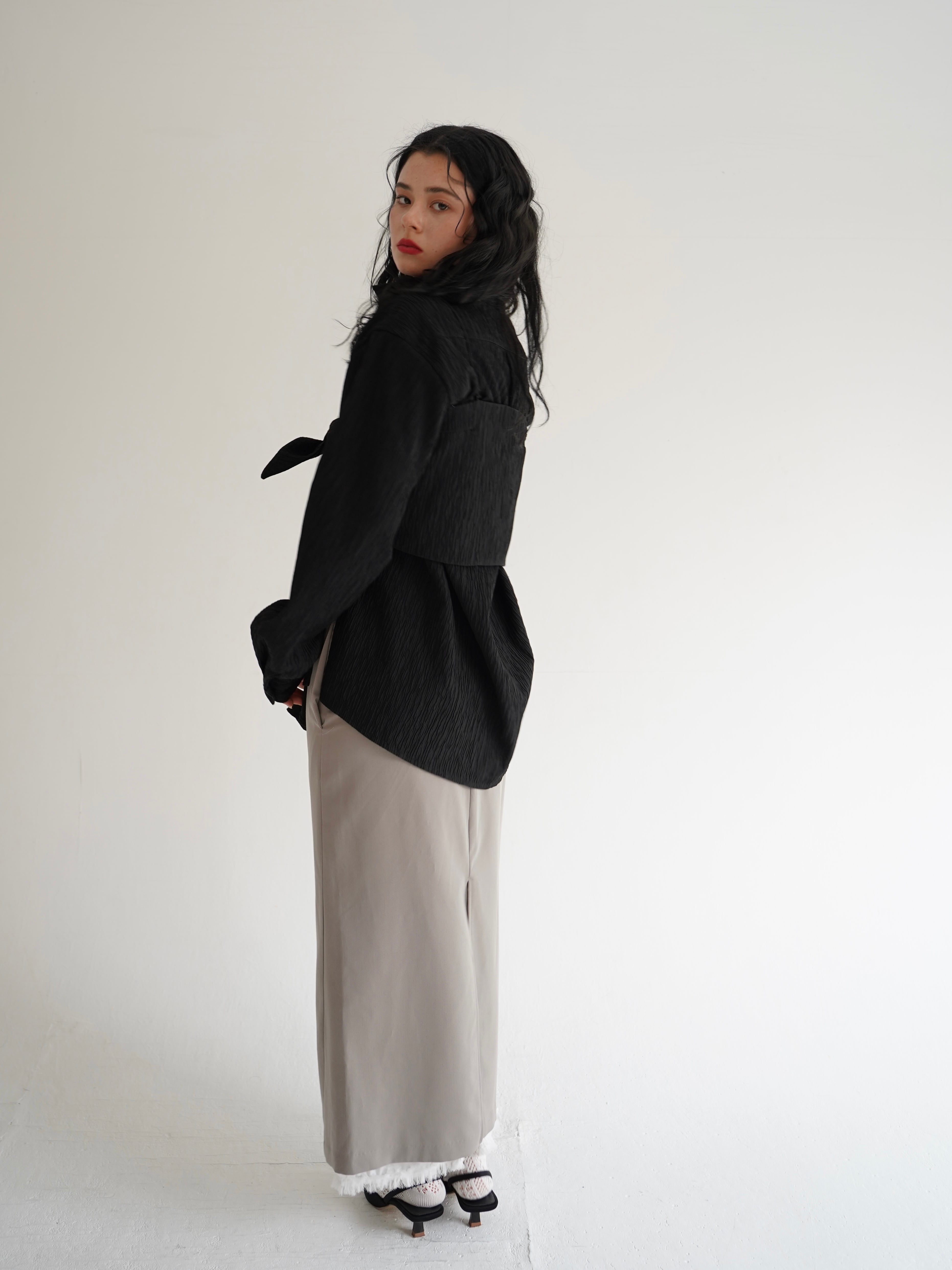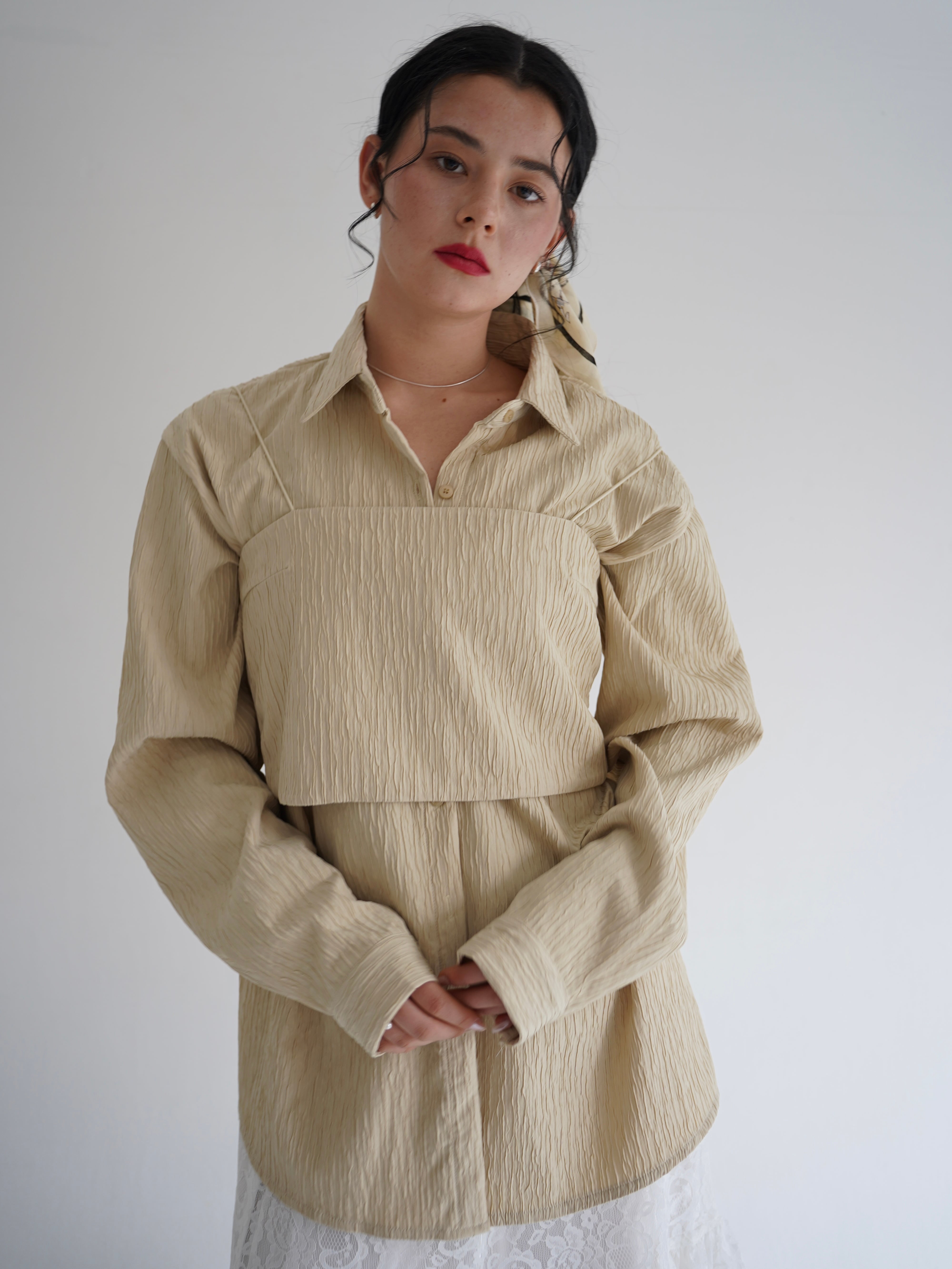 表情のあるシボ感素材で仕立てたシャツ&ビスチェセット。