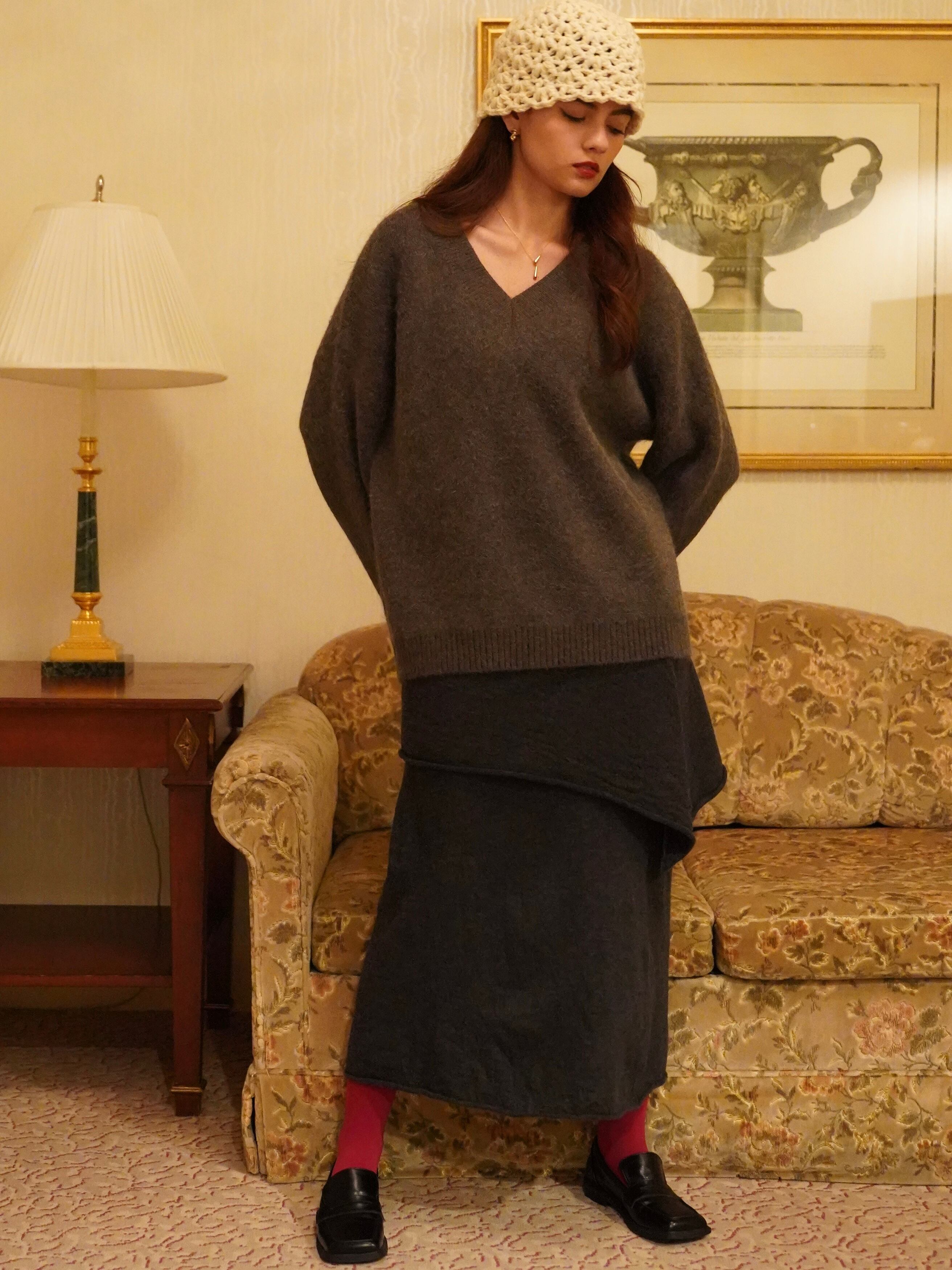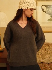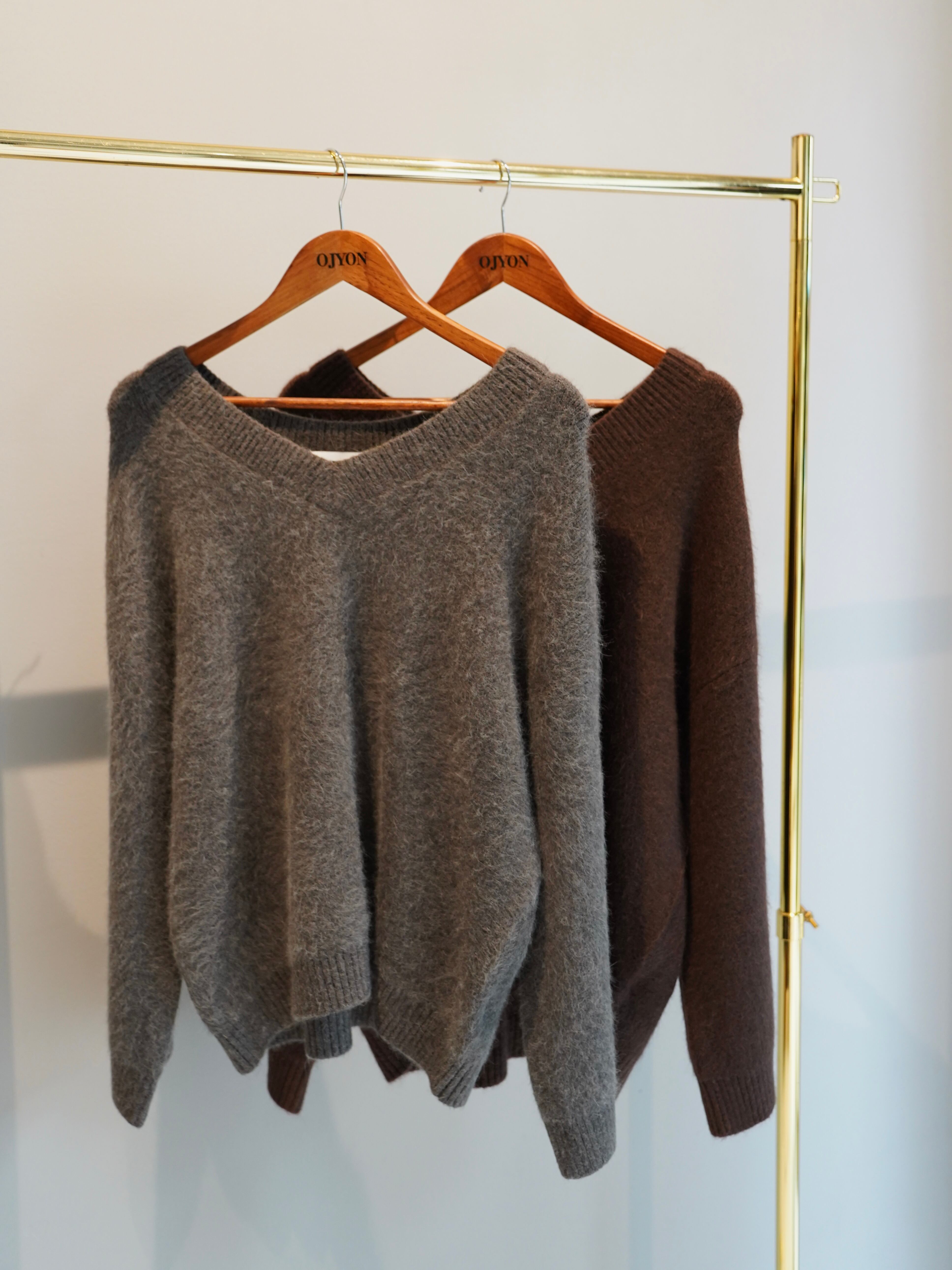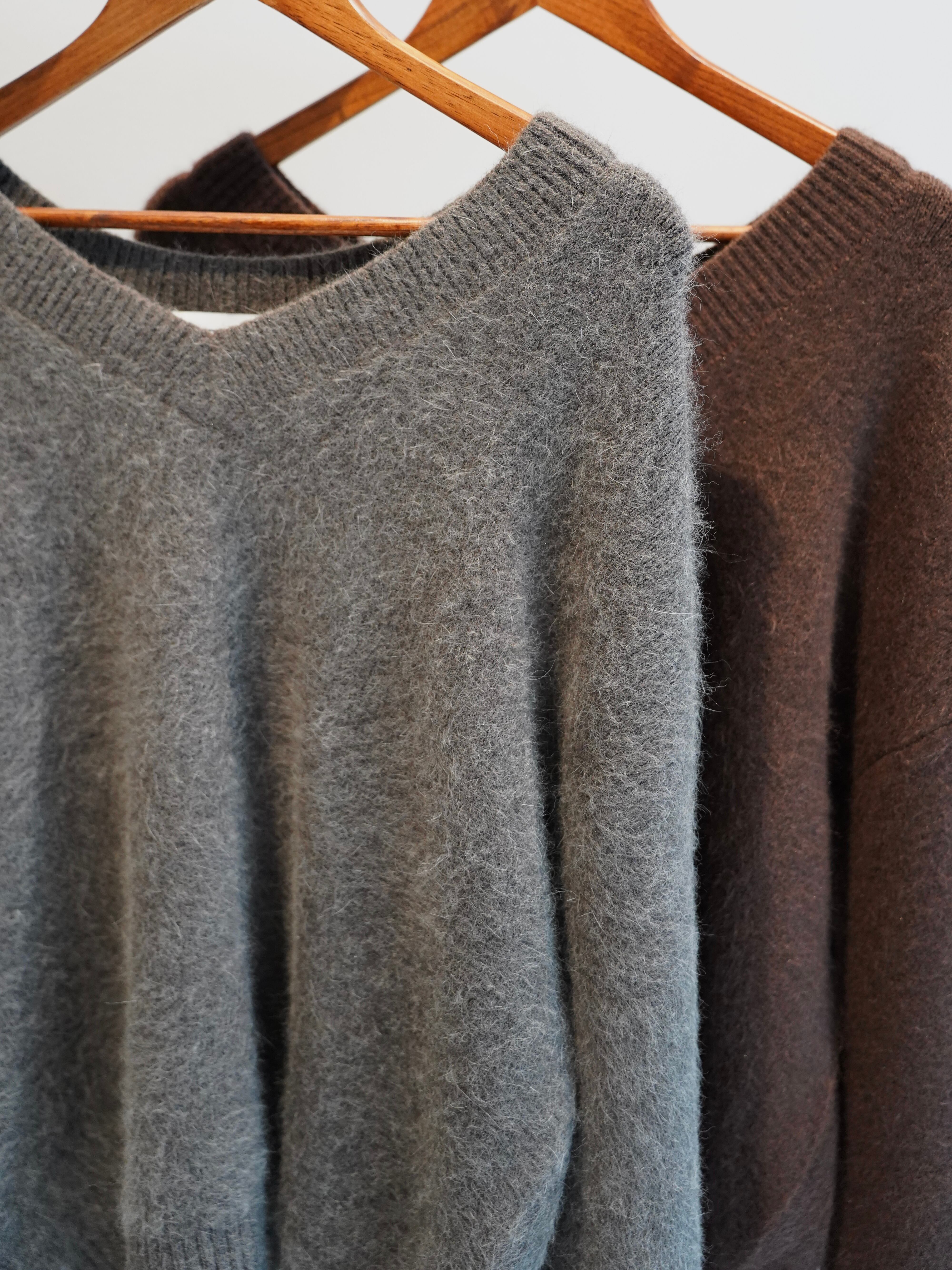 肌にふわっと馴染む、もっちりとした風合いが心地よいVネックニット。
