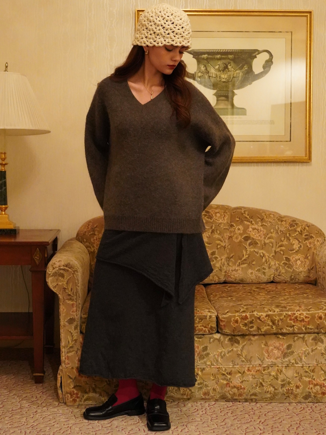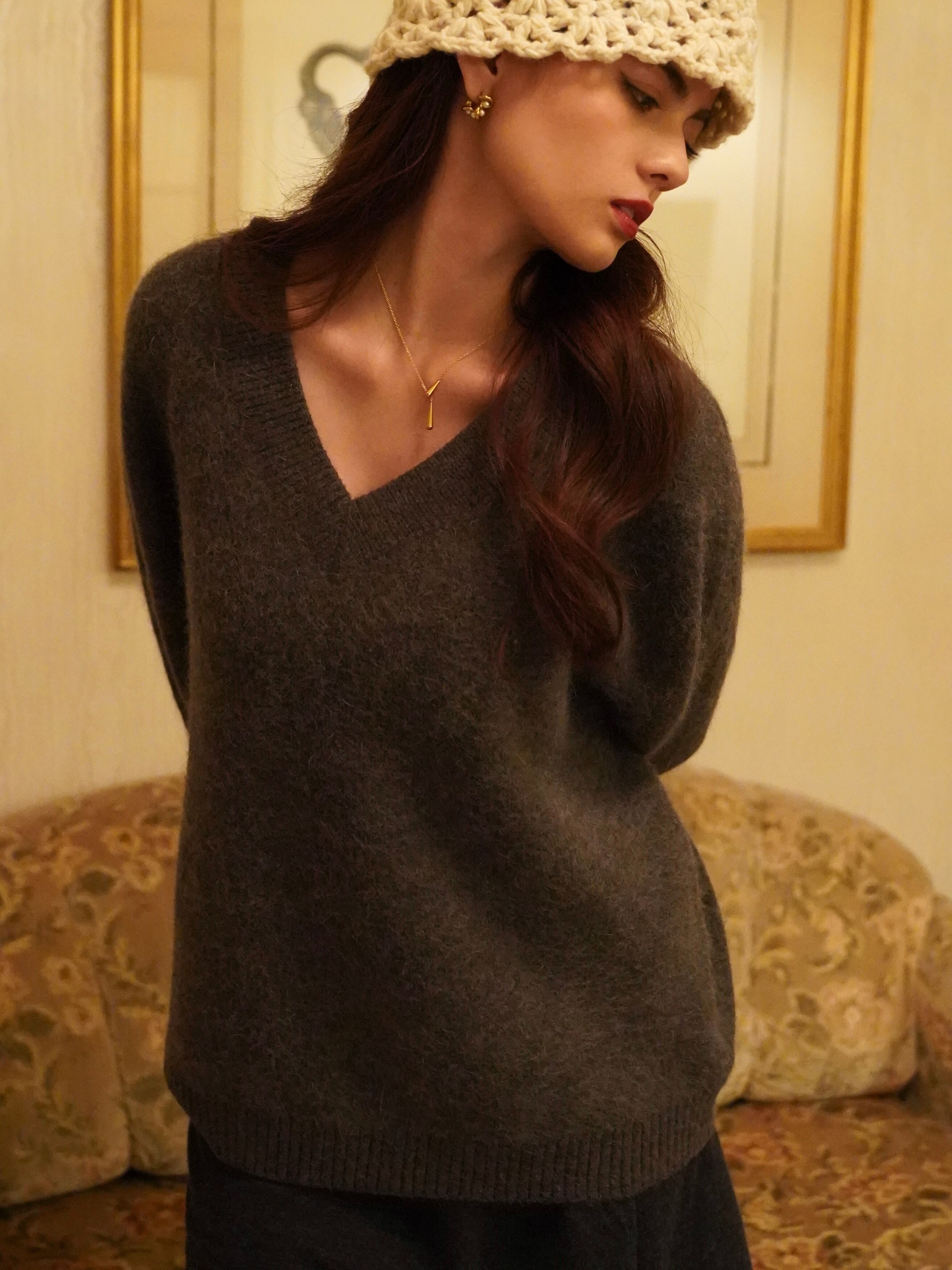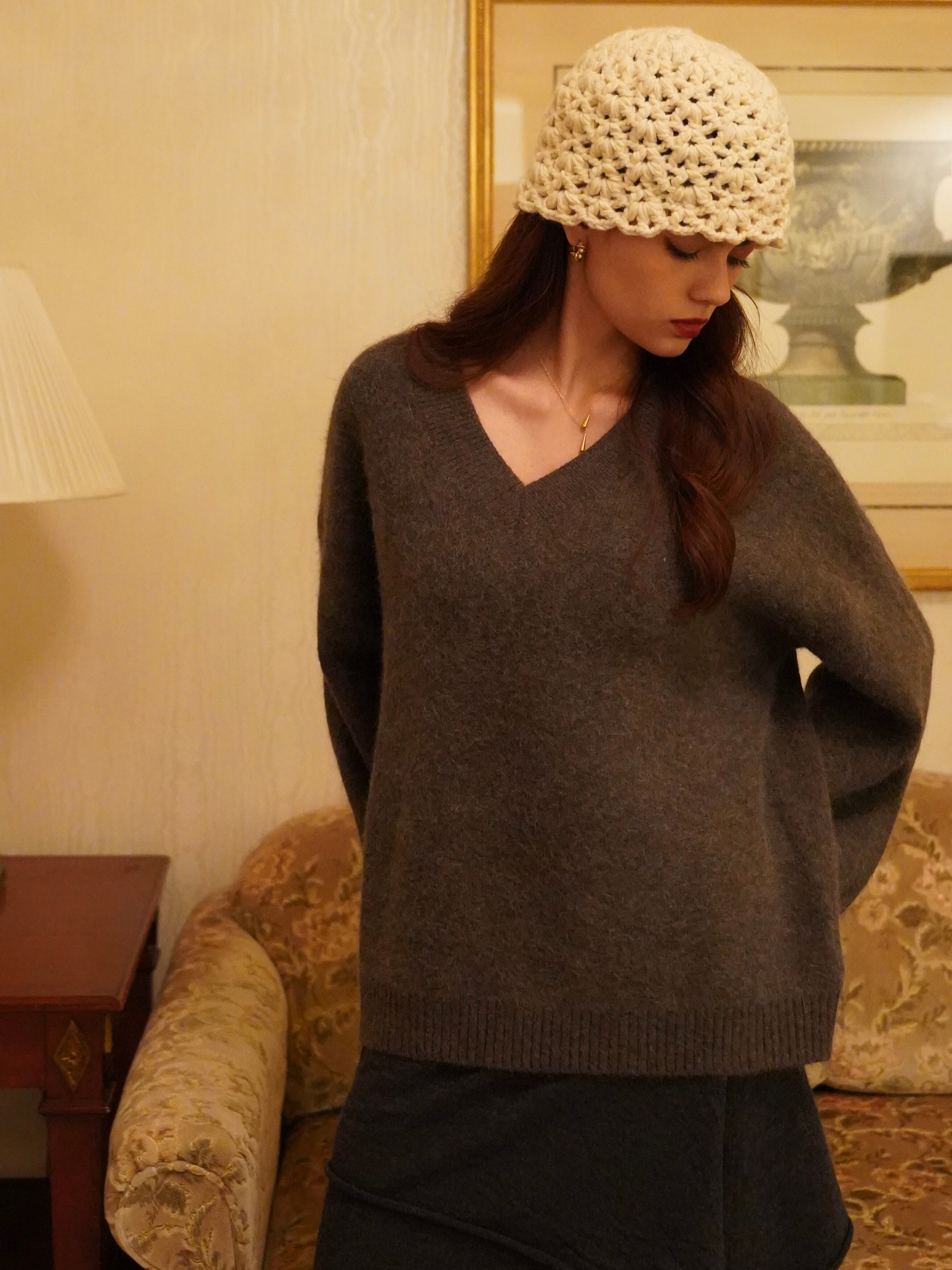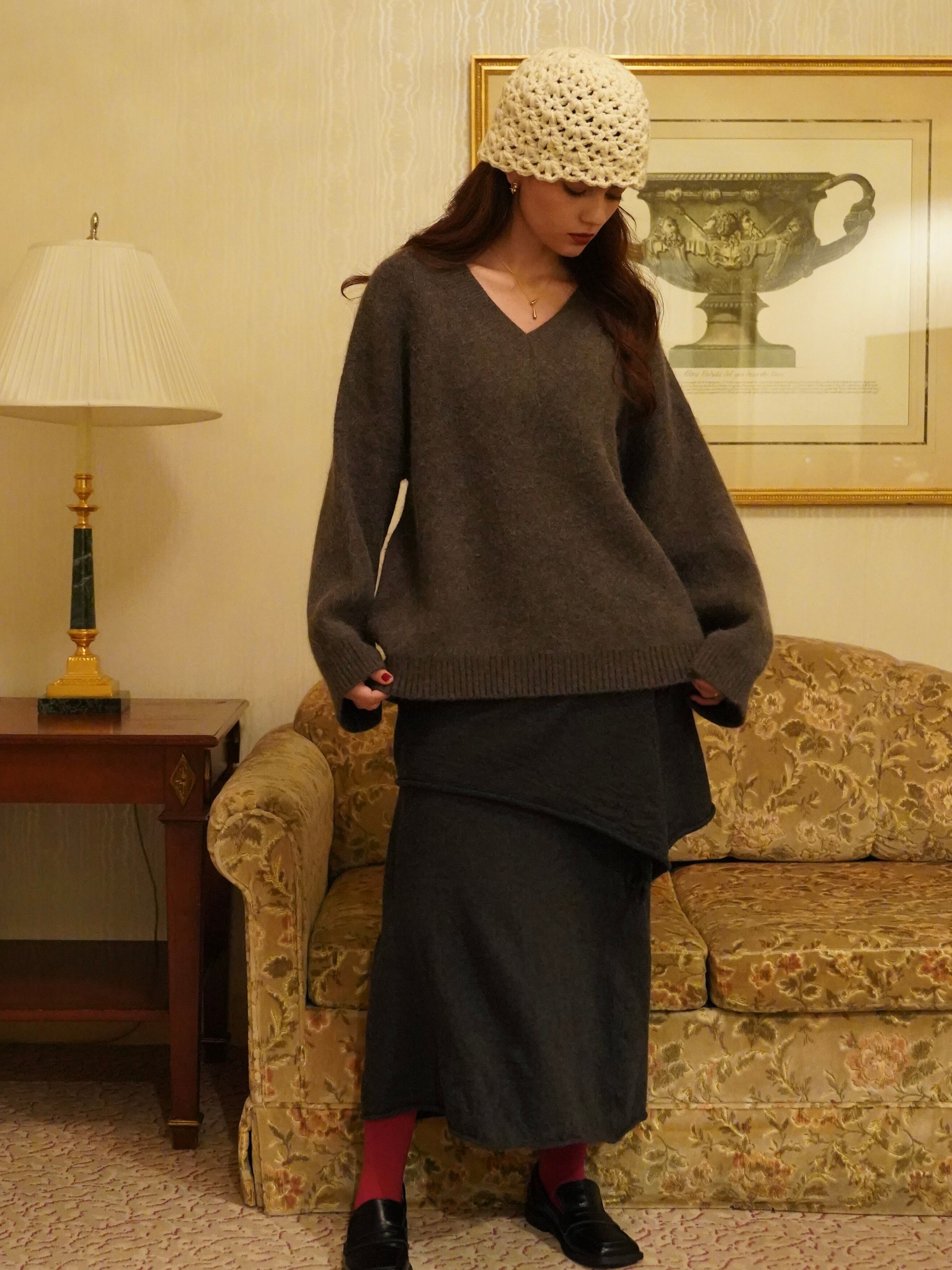肌にふわっと馴染む、もっちりとした風合いが心地よいVネックニット。