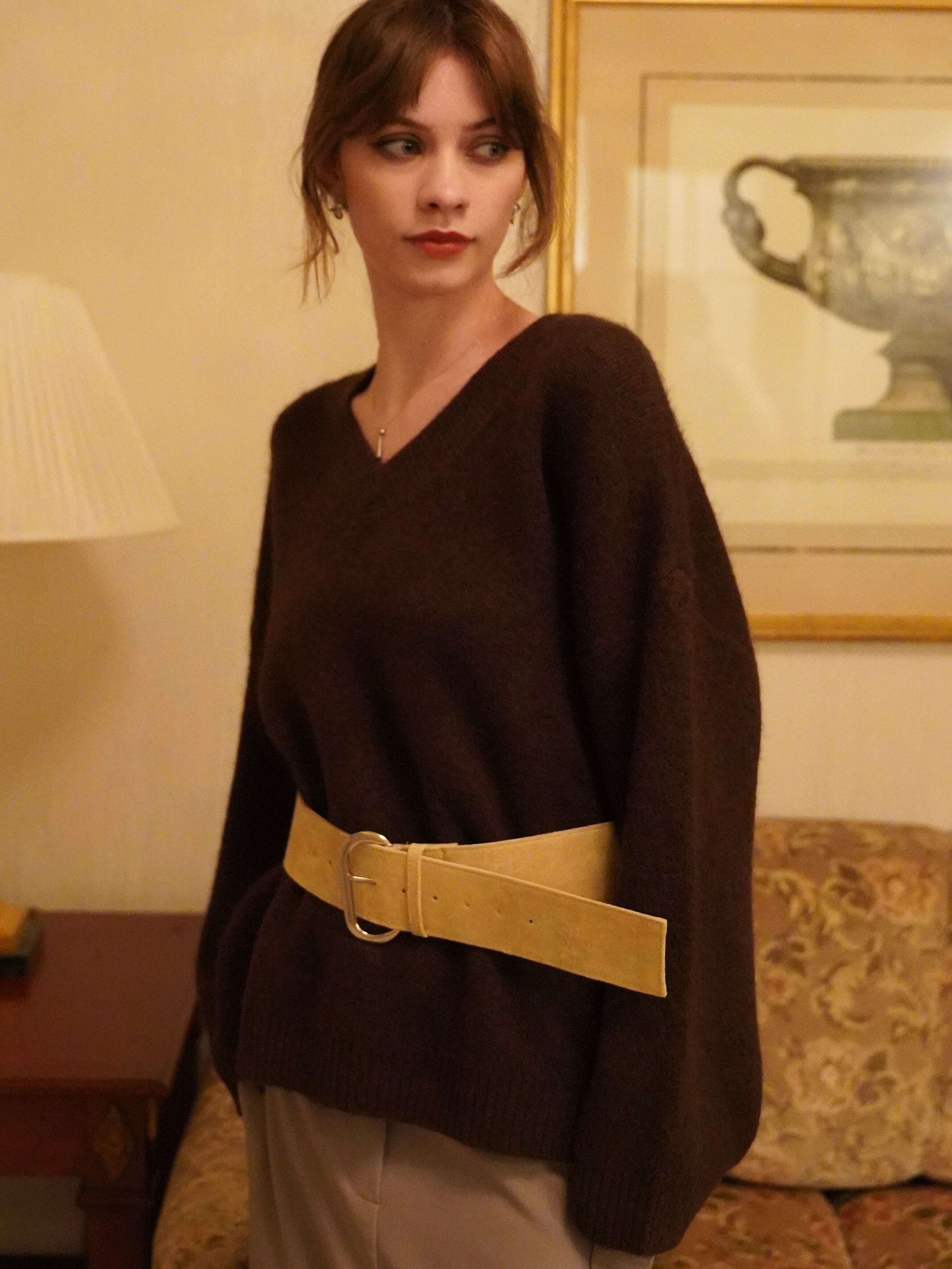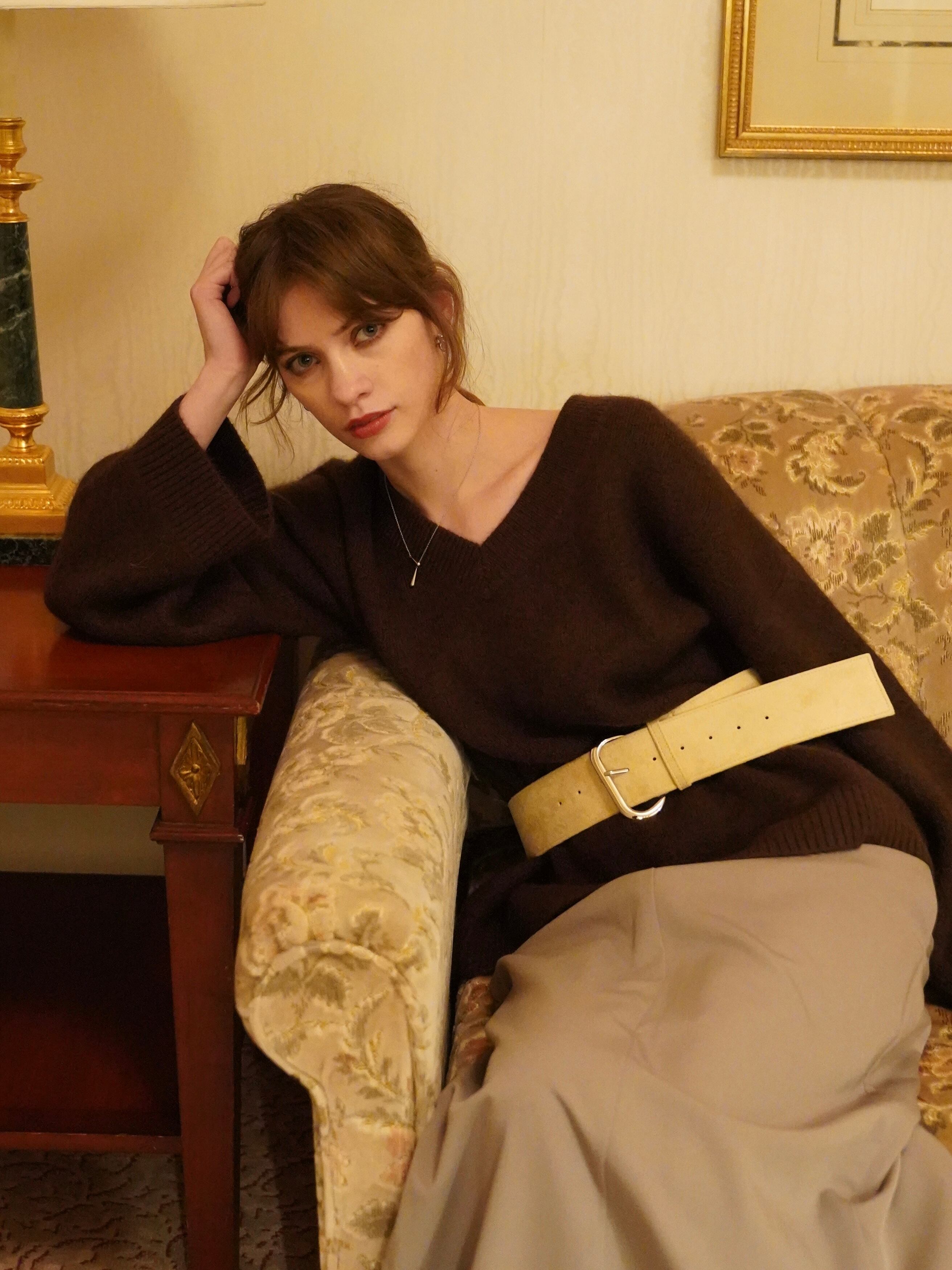 やや深めのVネックが顔まわりをすっきり見せ、