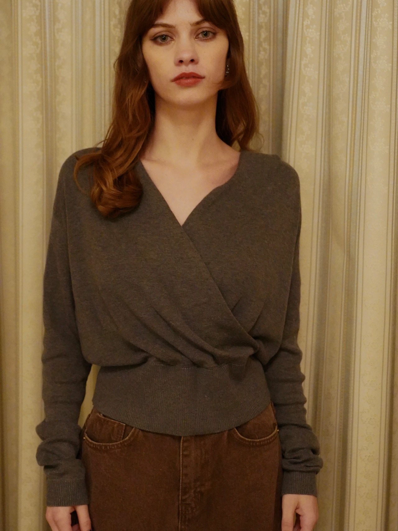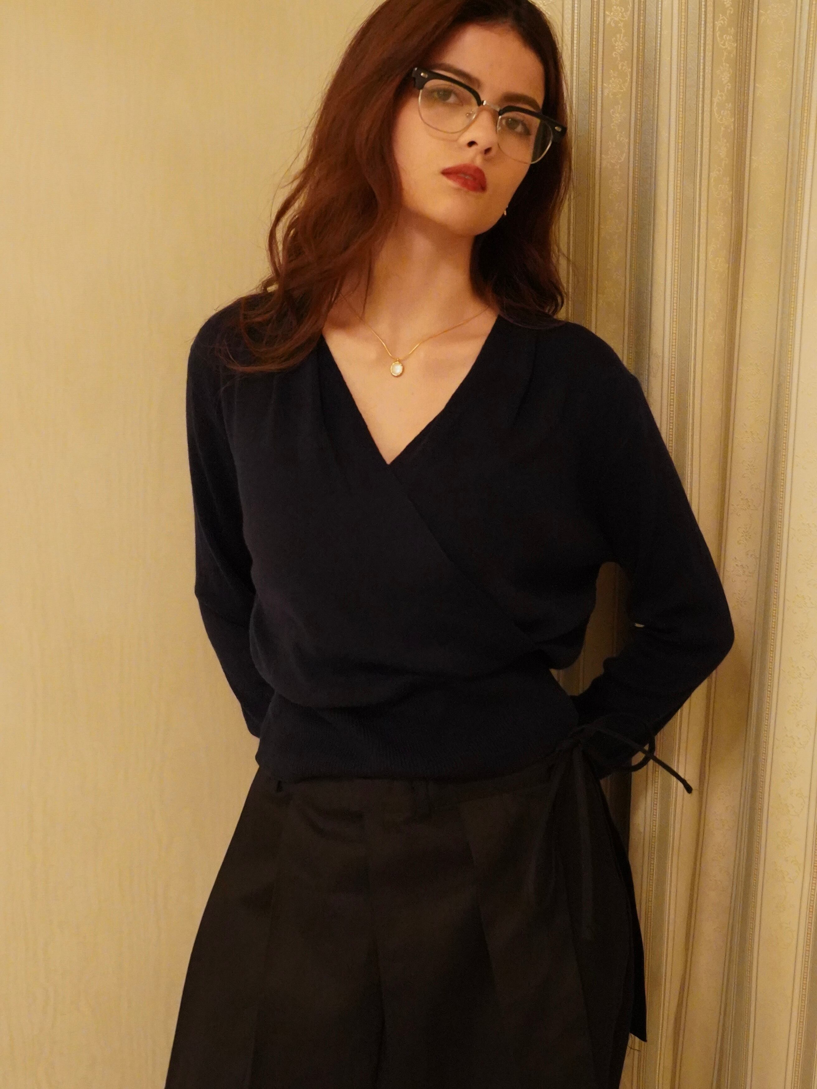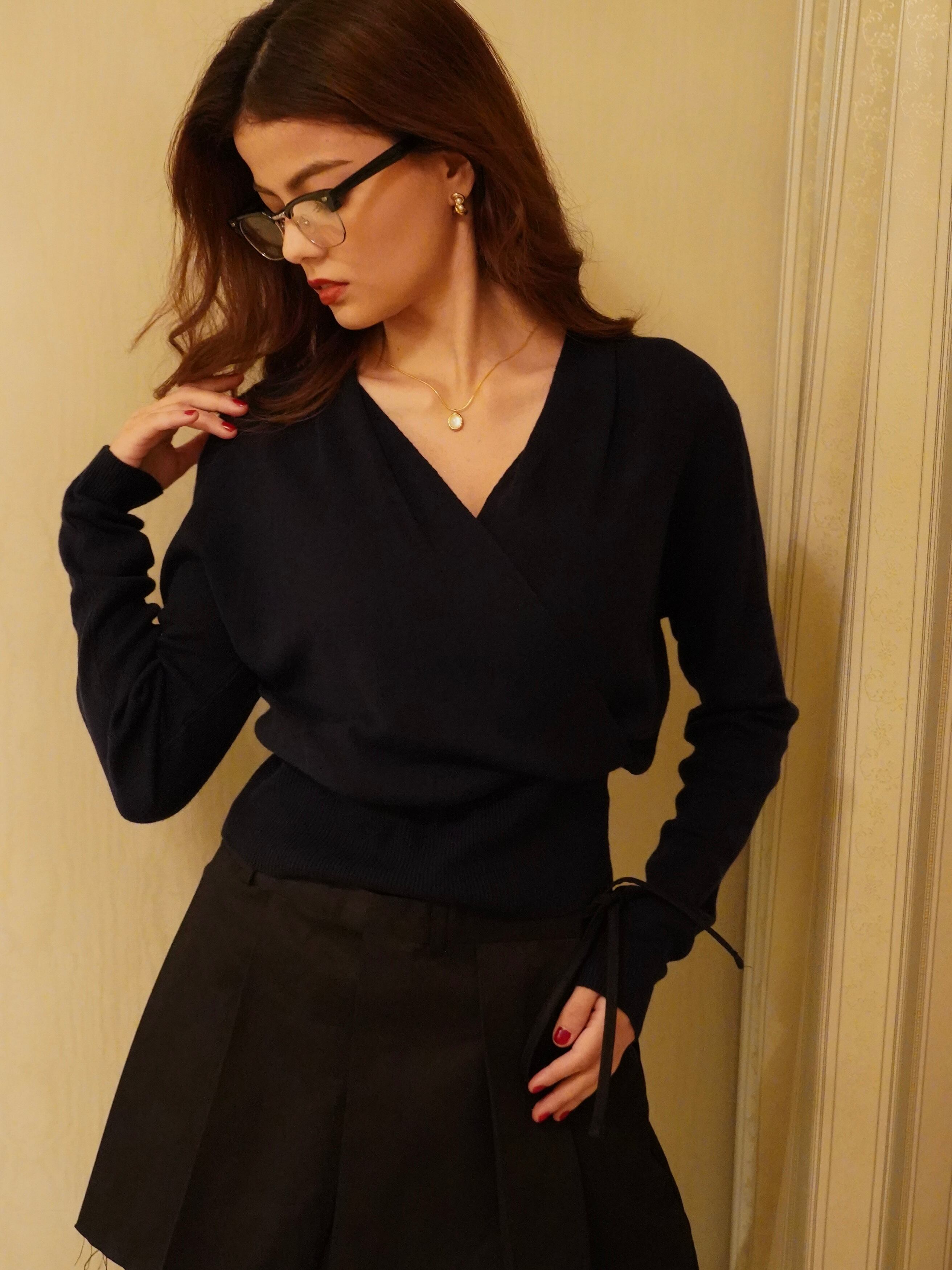 上品なドレープが印象的なVネックニット。