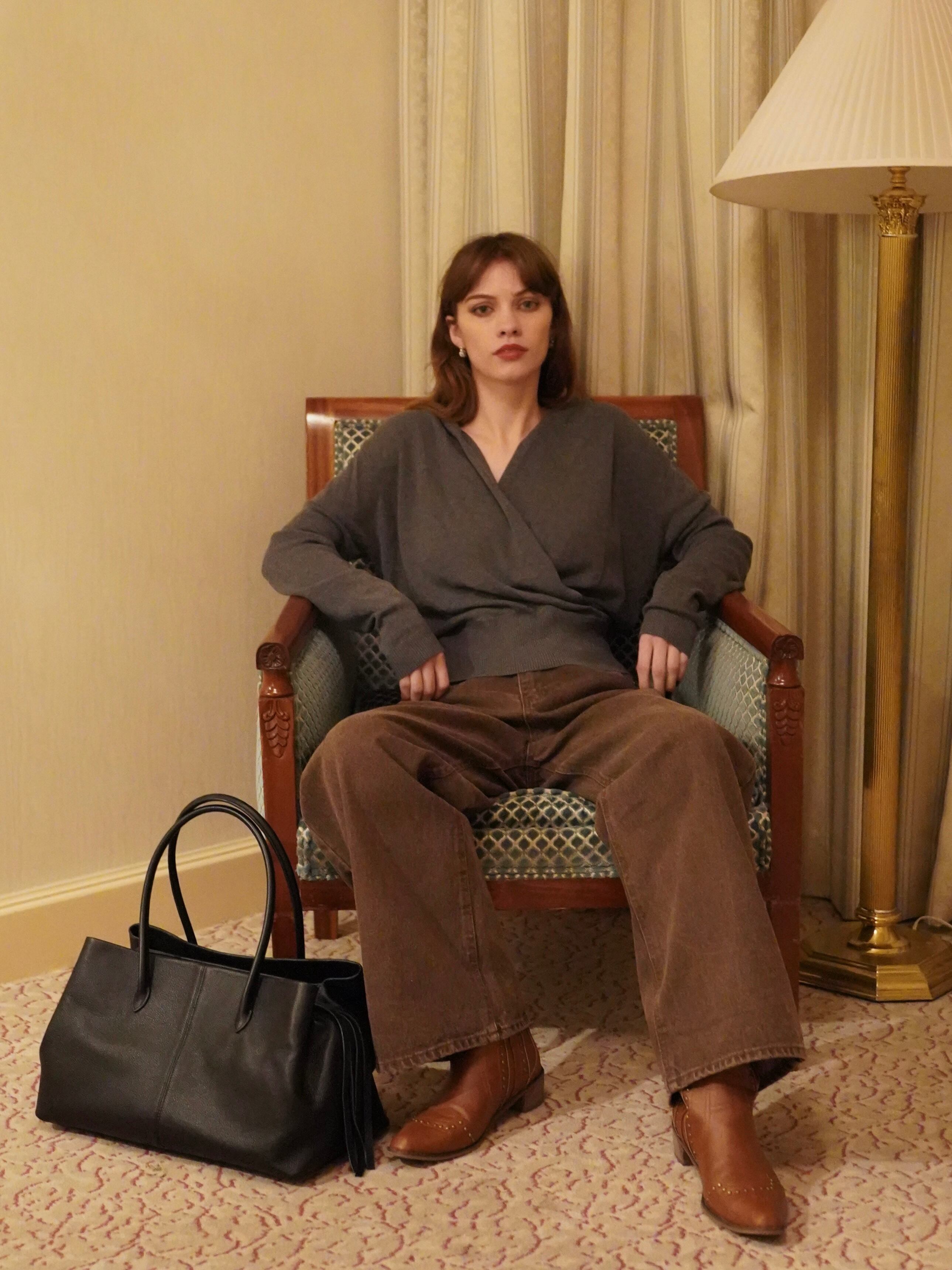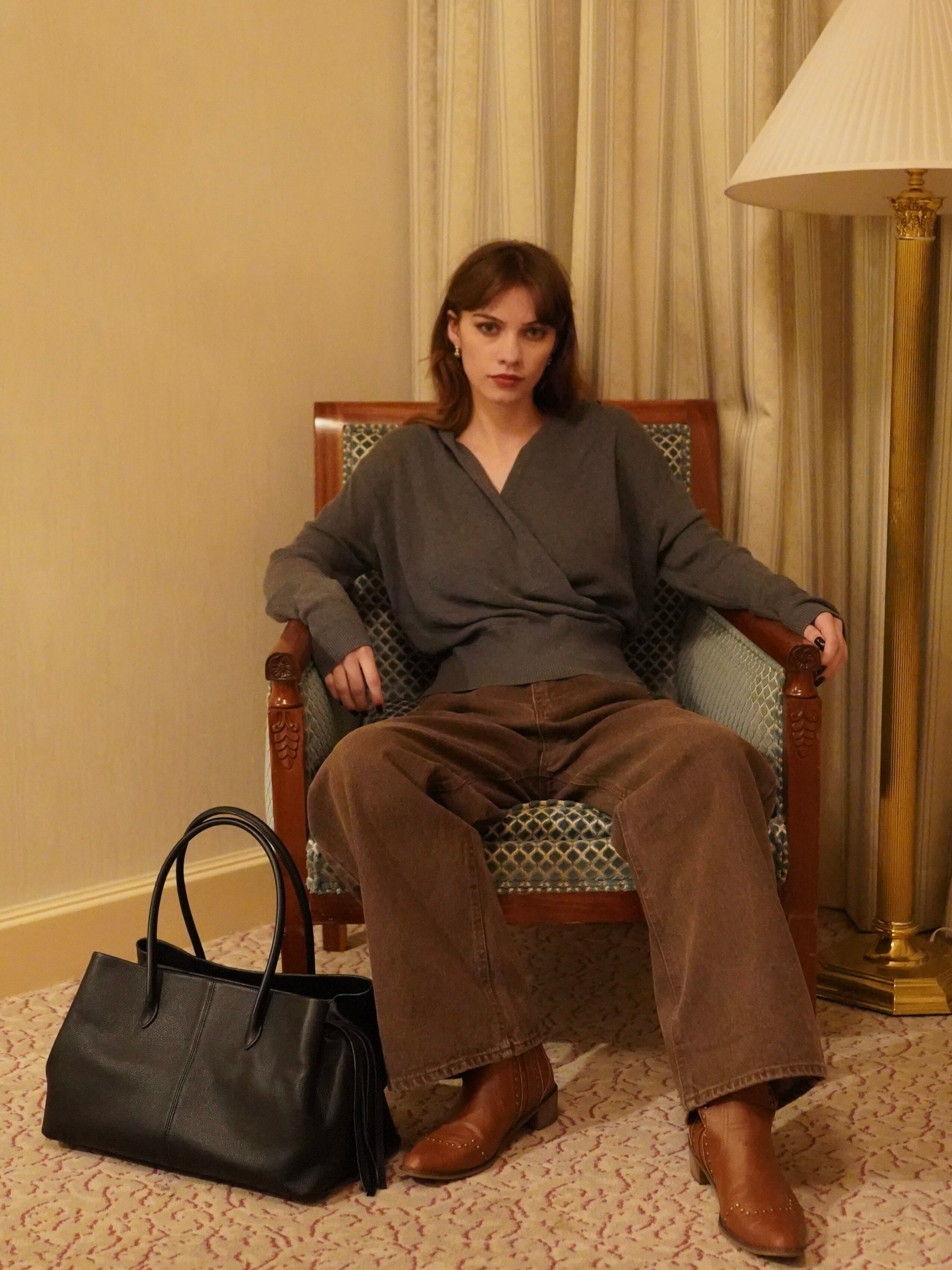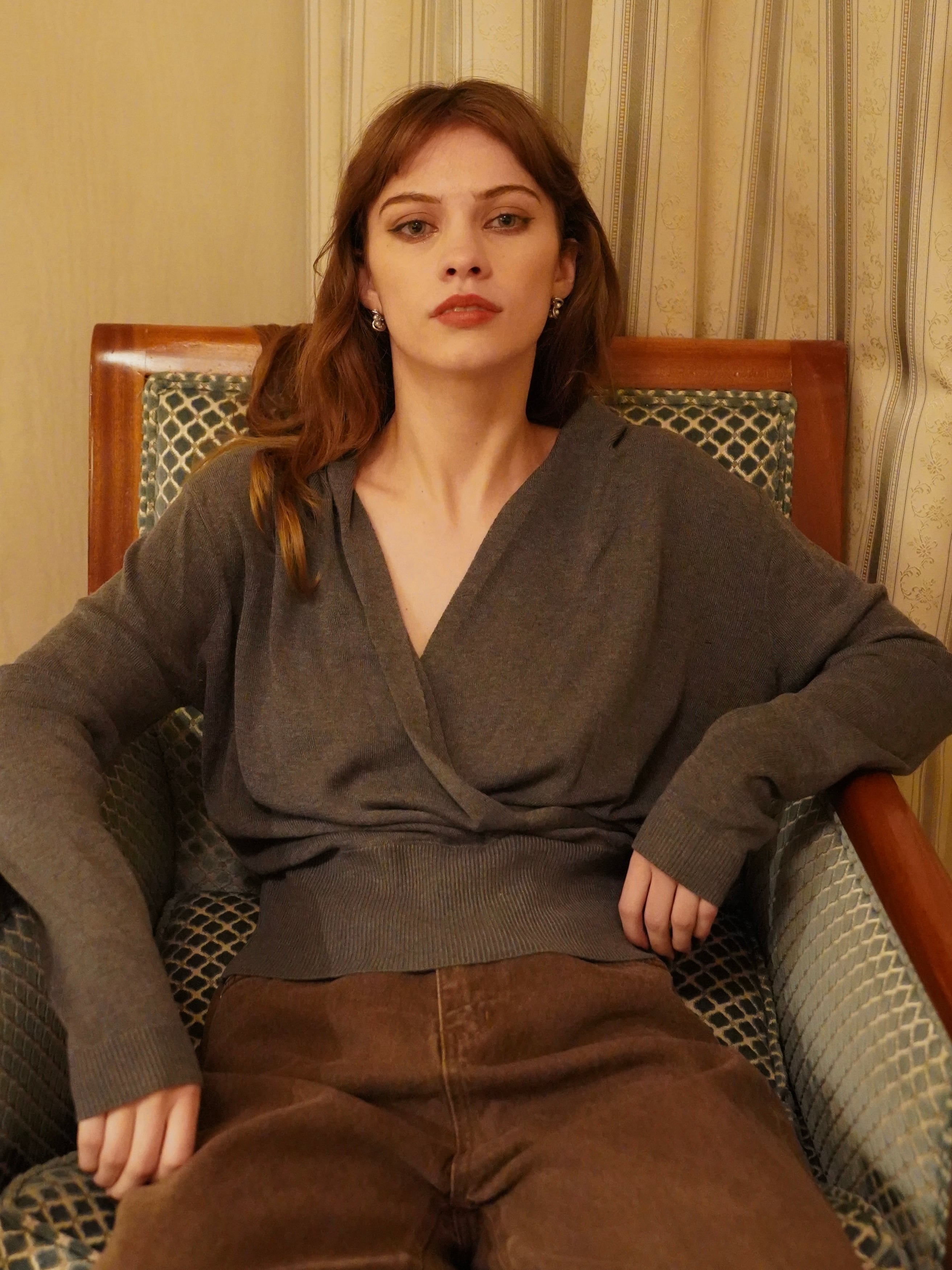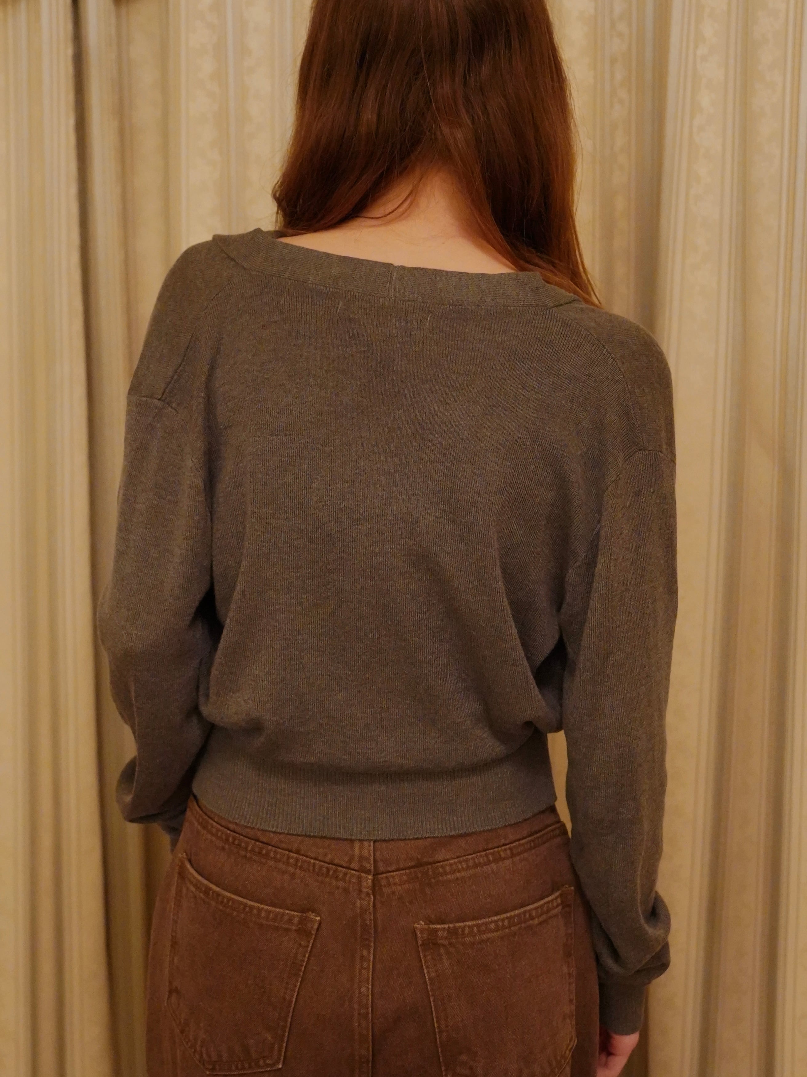 上品なドレープが印象的なVネックニット。