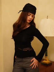 やわらかな風合いの薄手ニットに、レースの切り替えをあしらったデザイントップス。