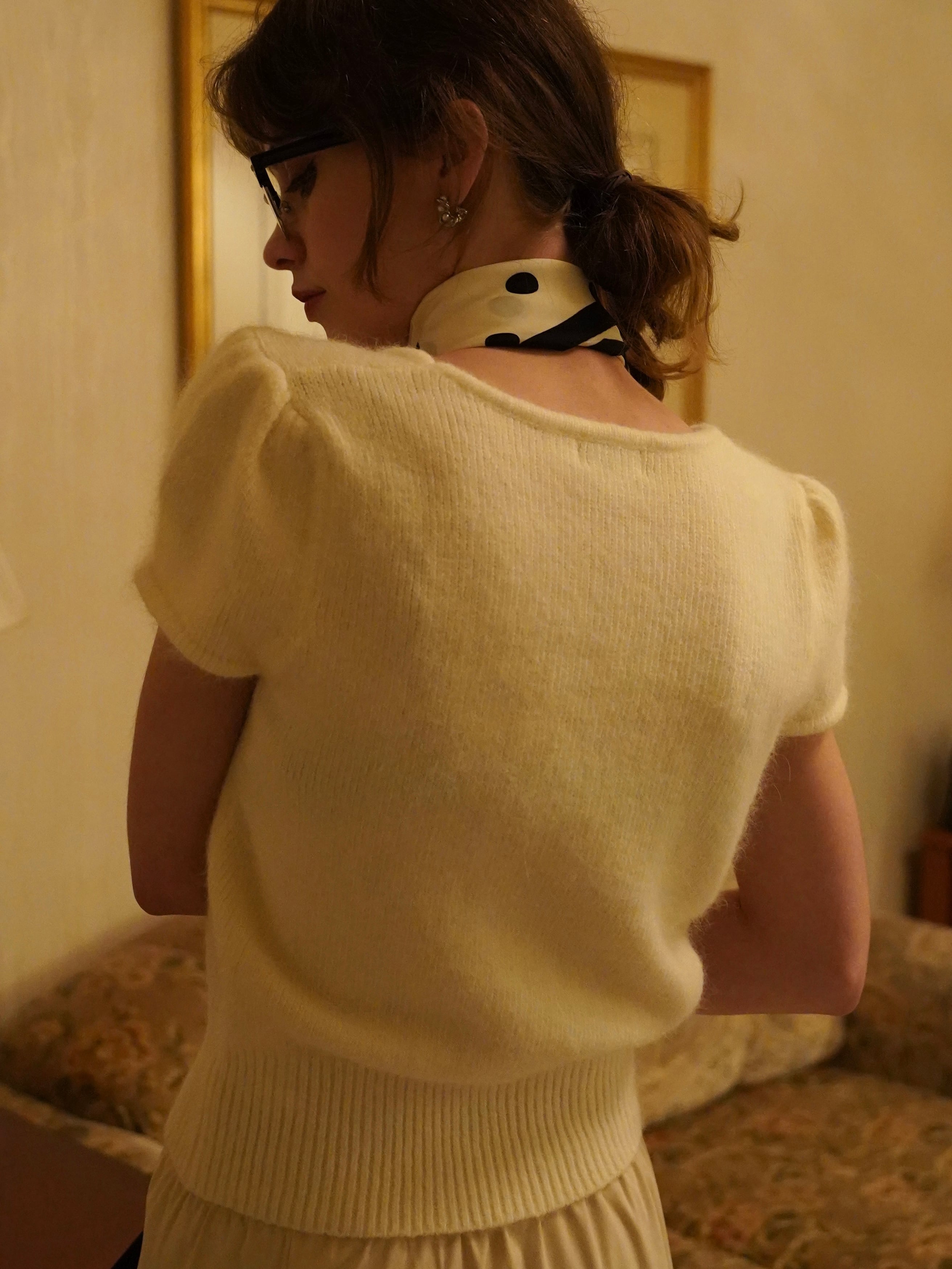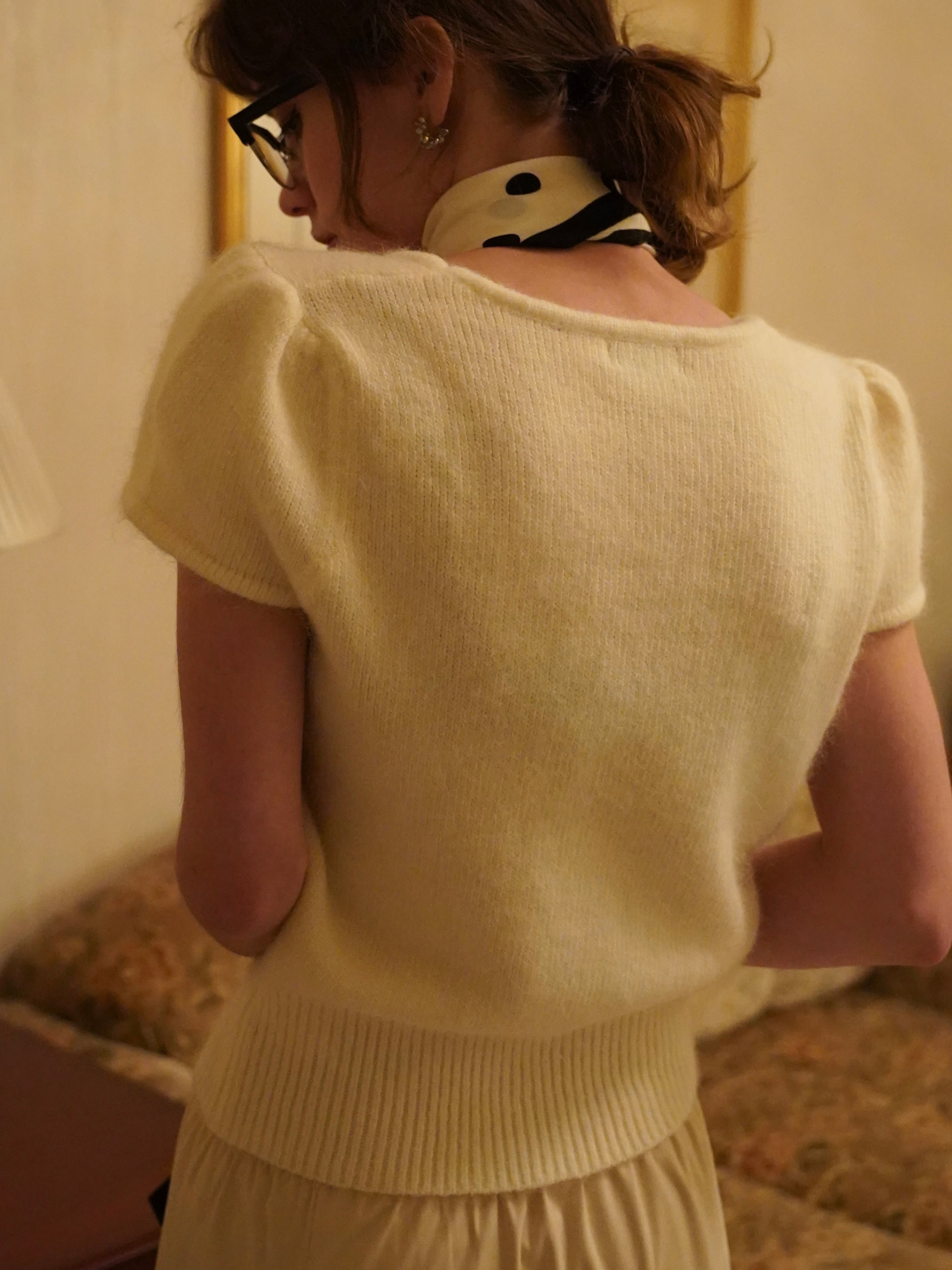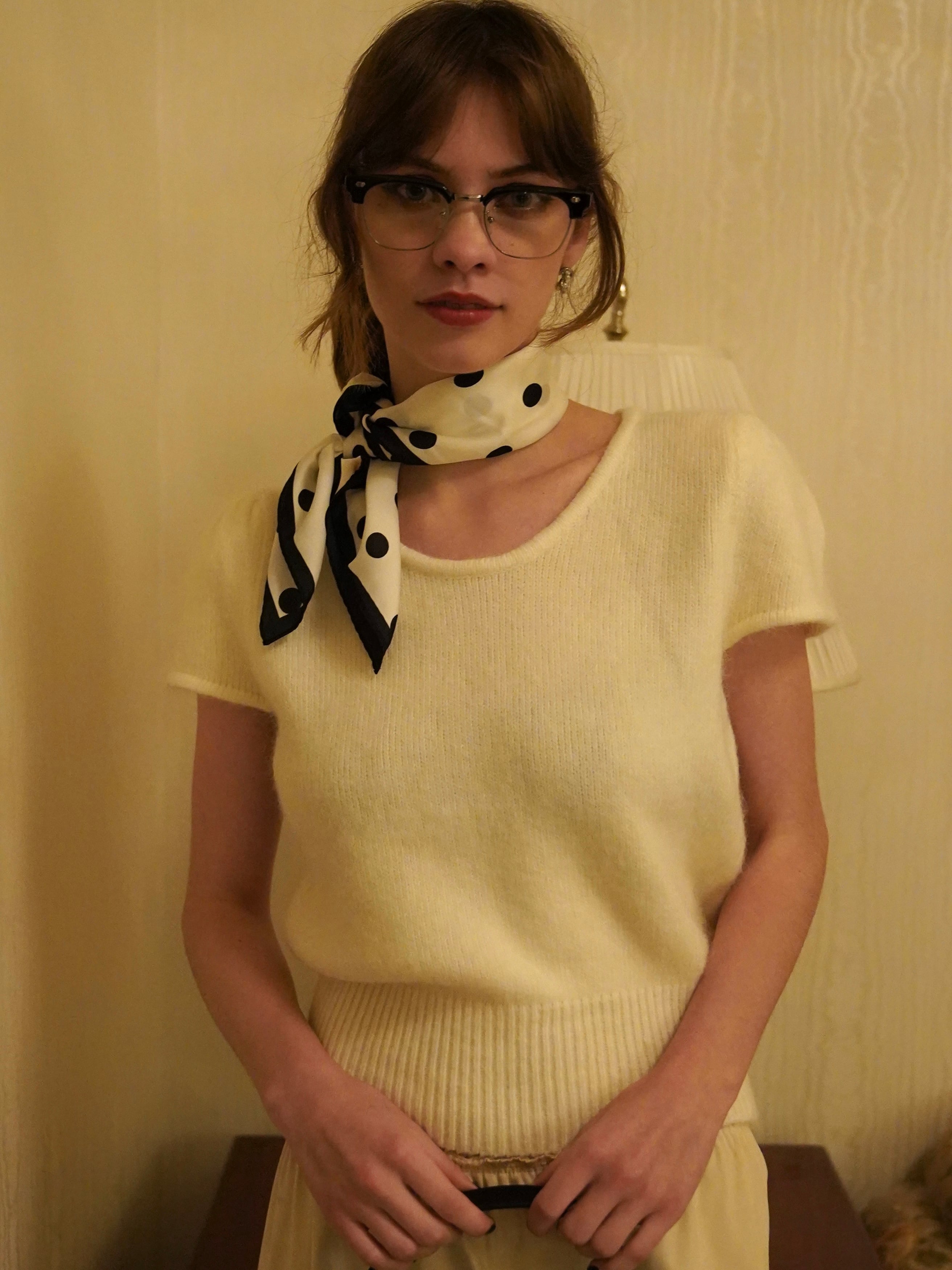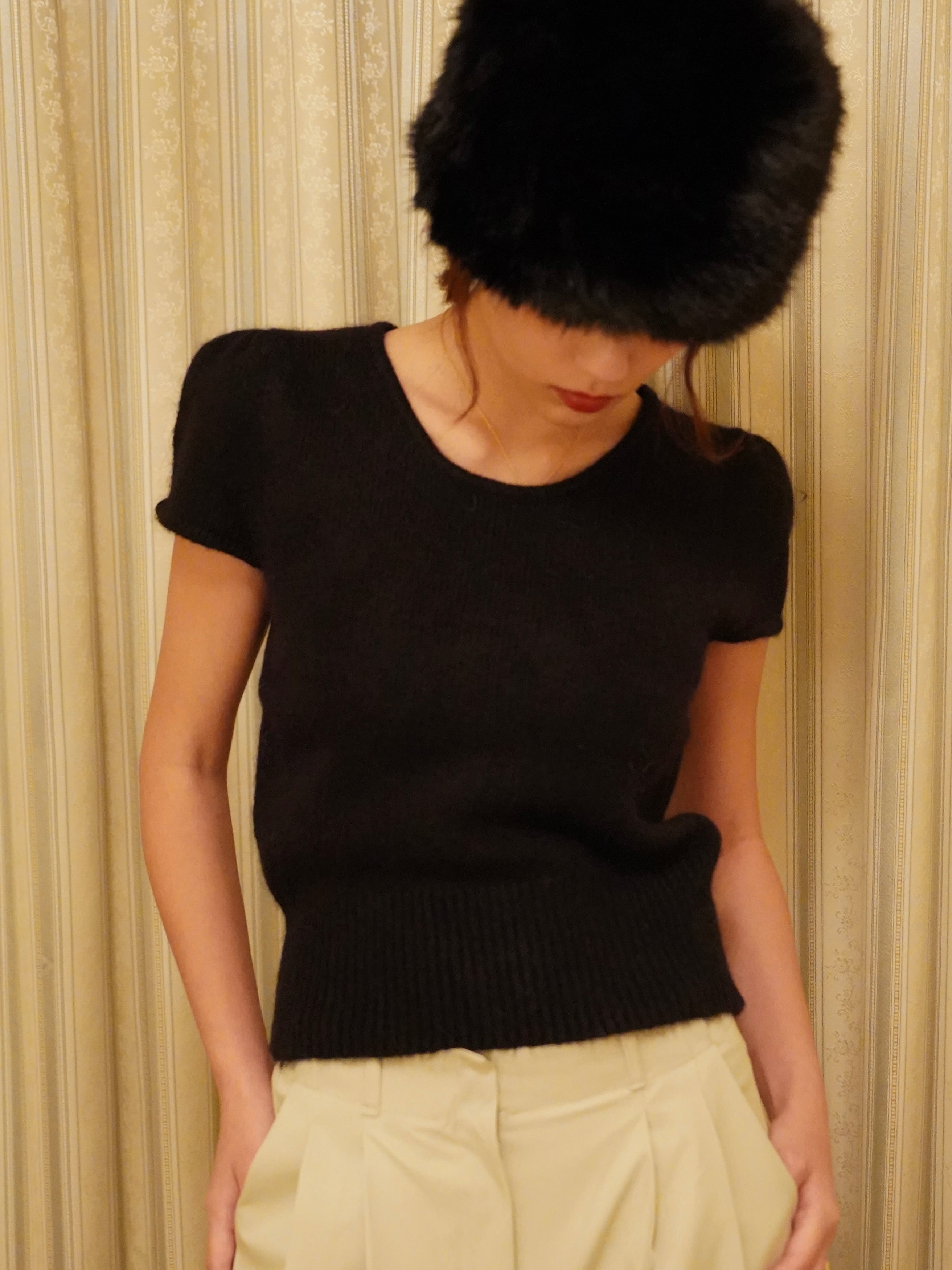 肩のラインがきれいに見える、コンパクトシルエットのニットトップス。