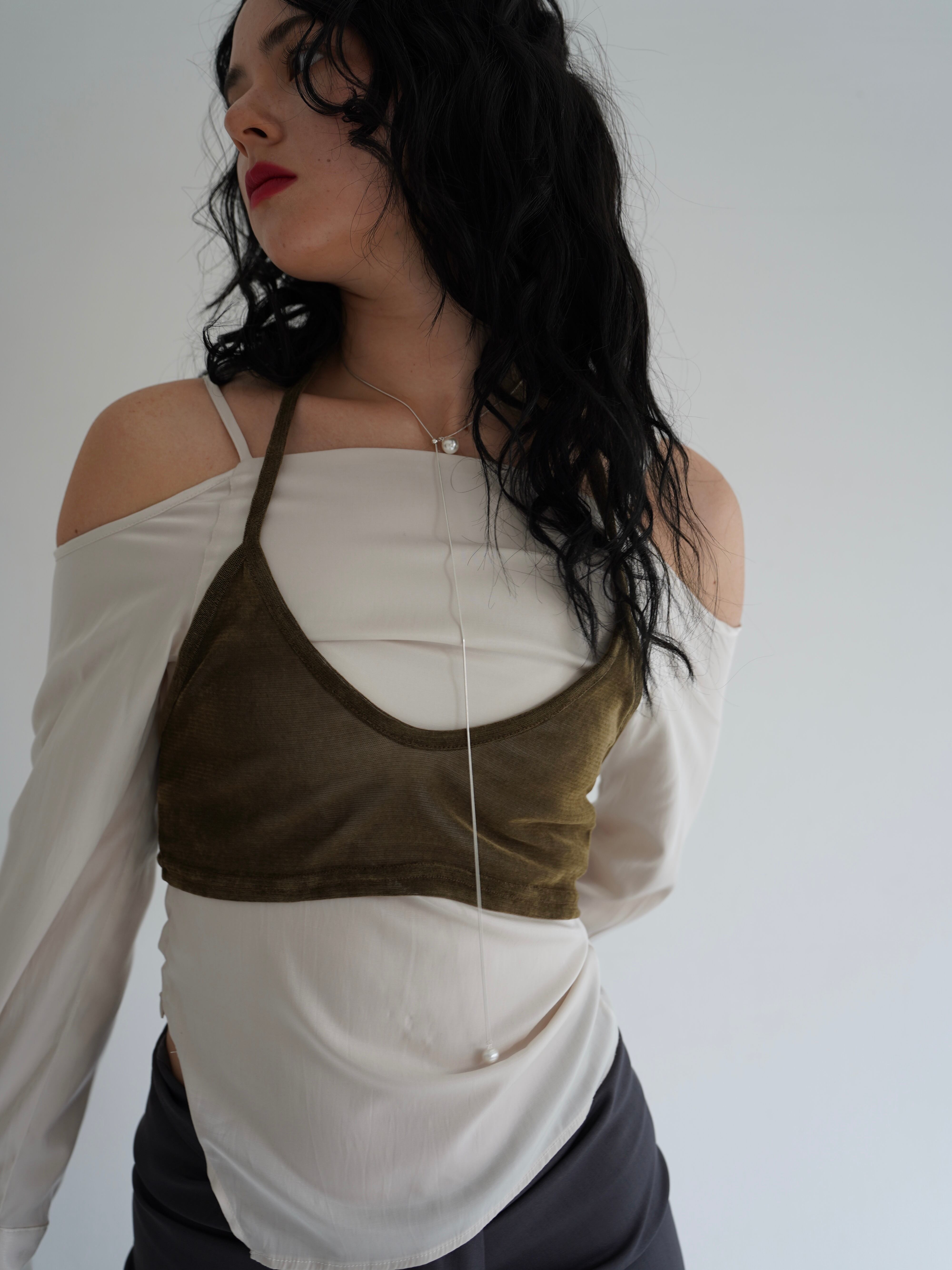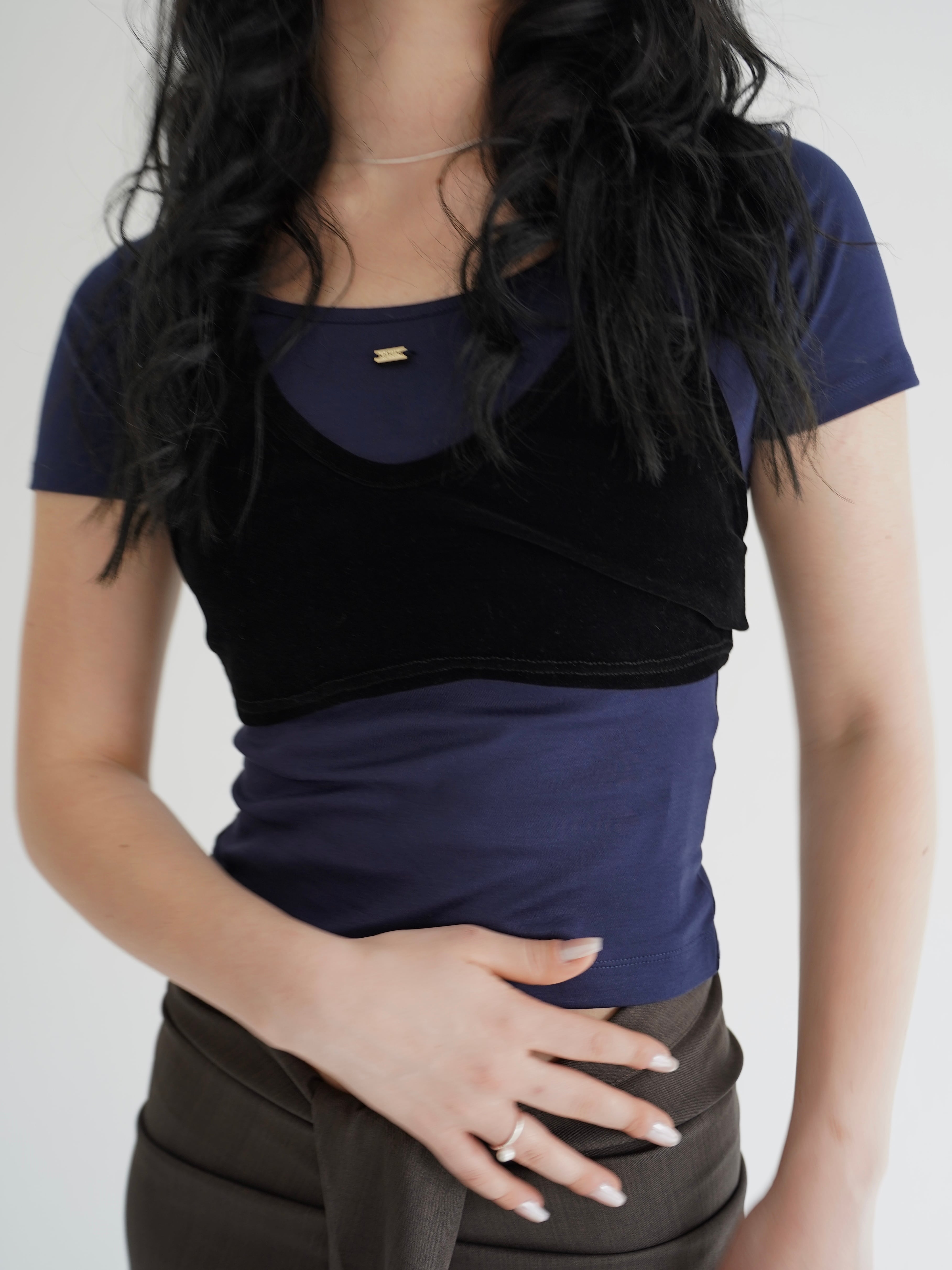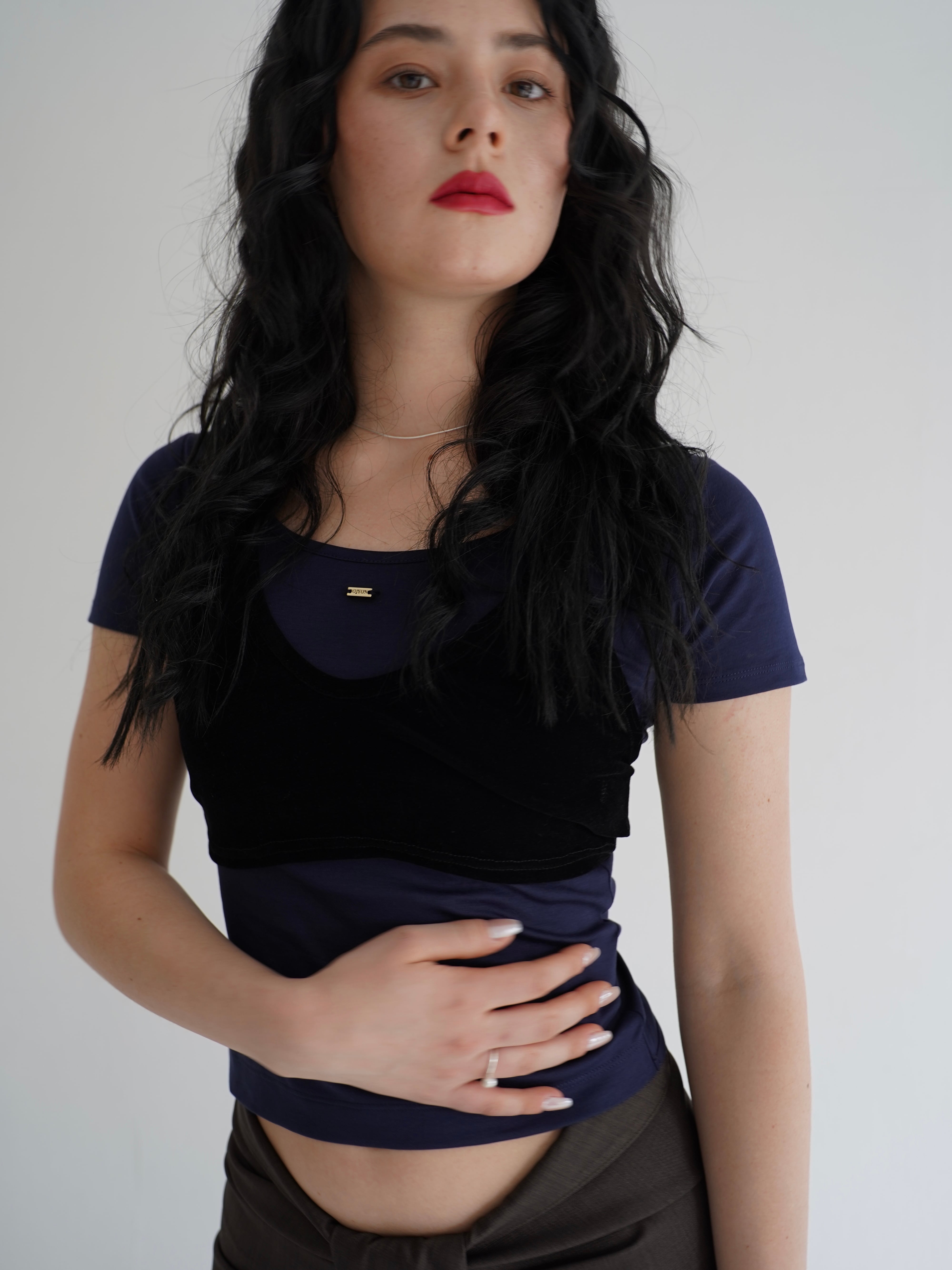 スタイリングに奥行きをつくる、ミニマルなベロアビスチェ。