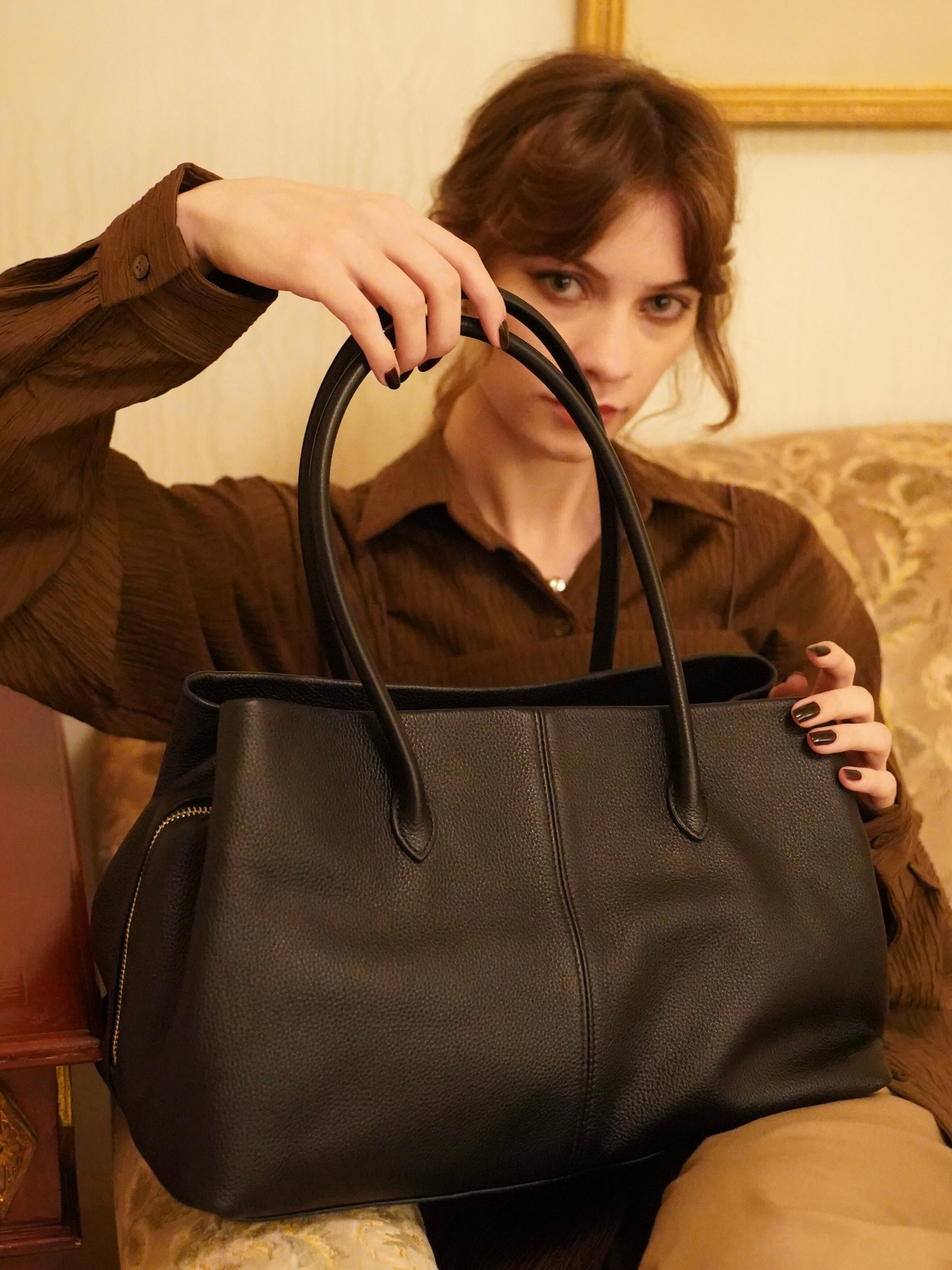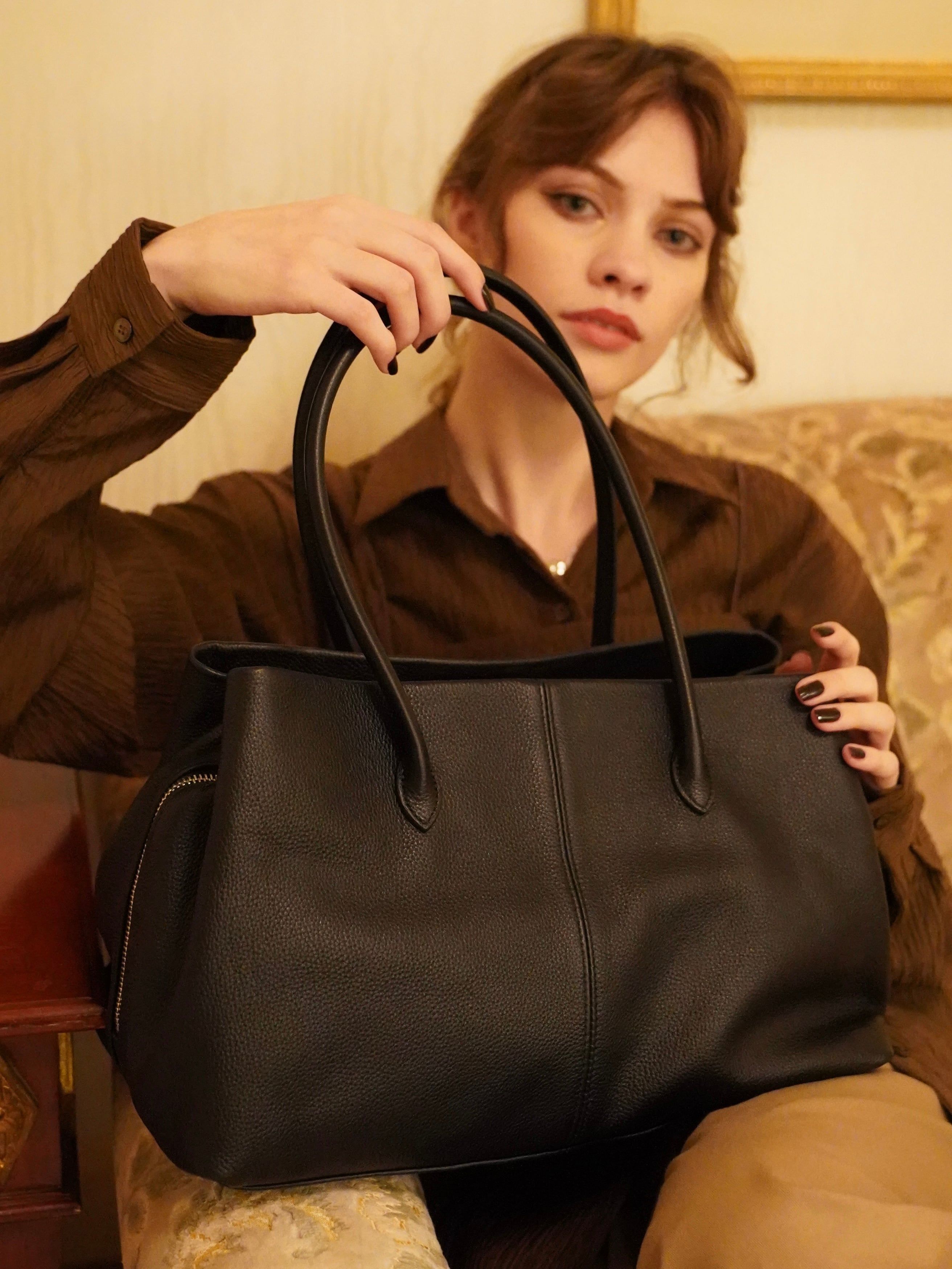 リアルレザーとリアルスエードを贅沢に使用した、上品さと機能性を兼ね備えた大きめバッグ。