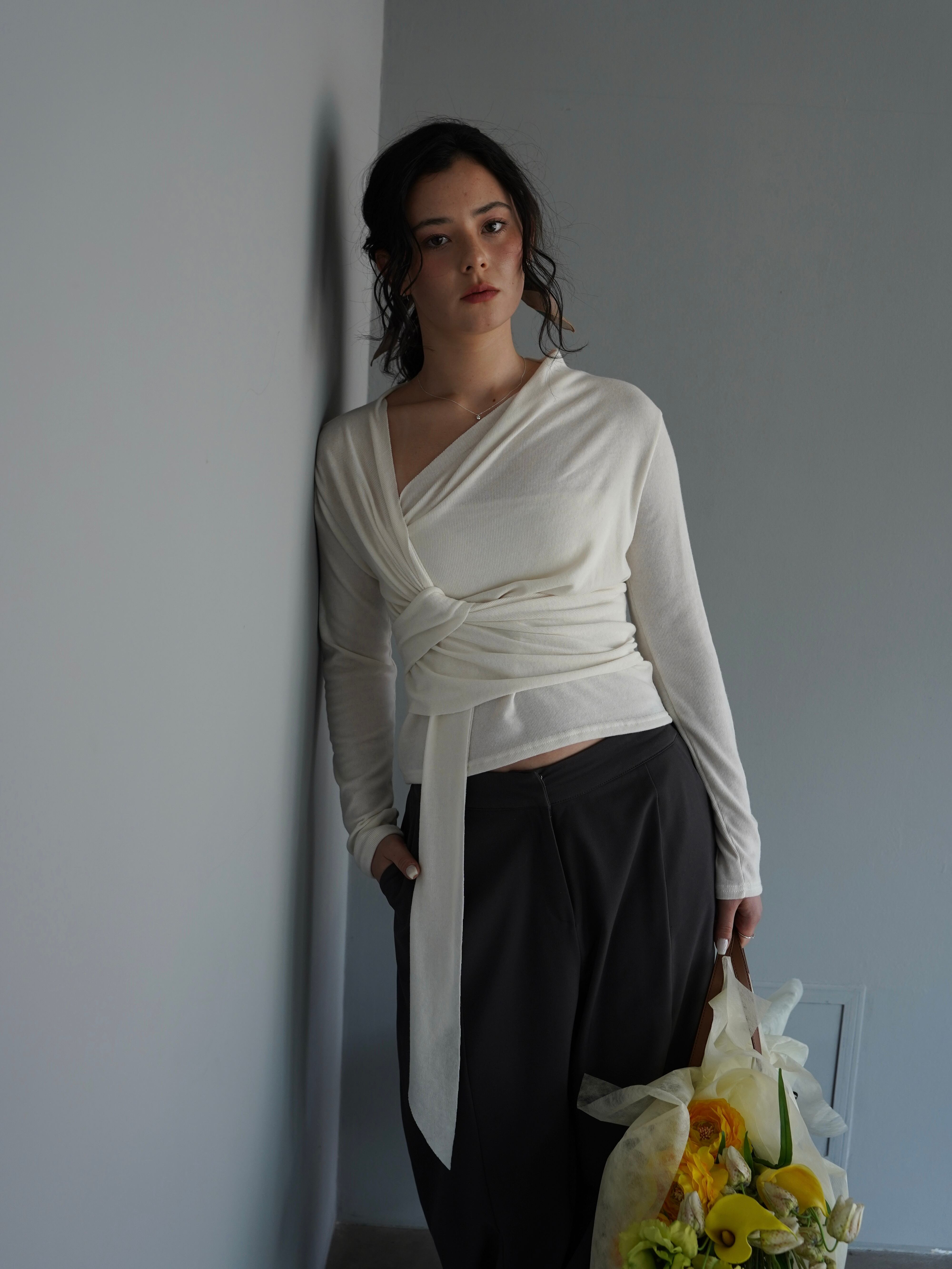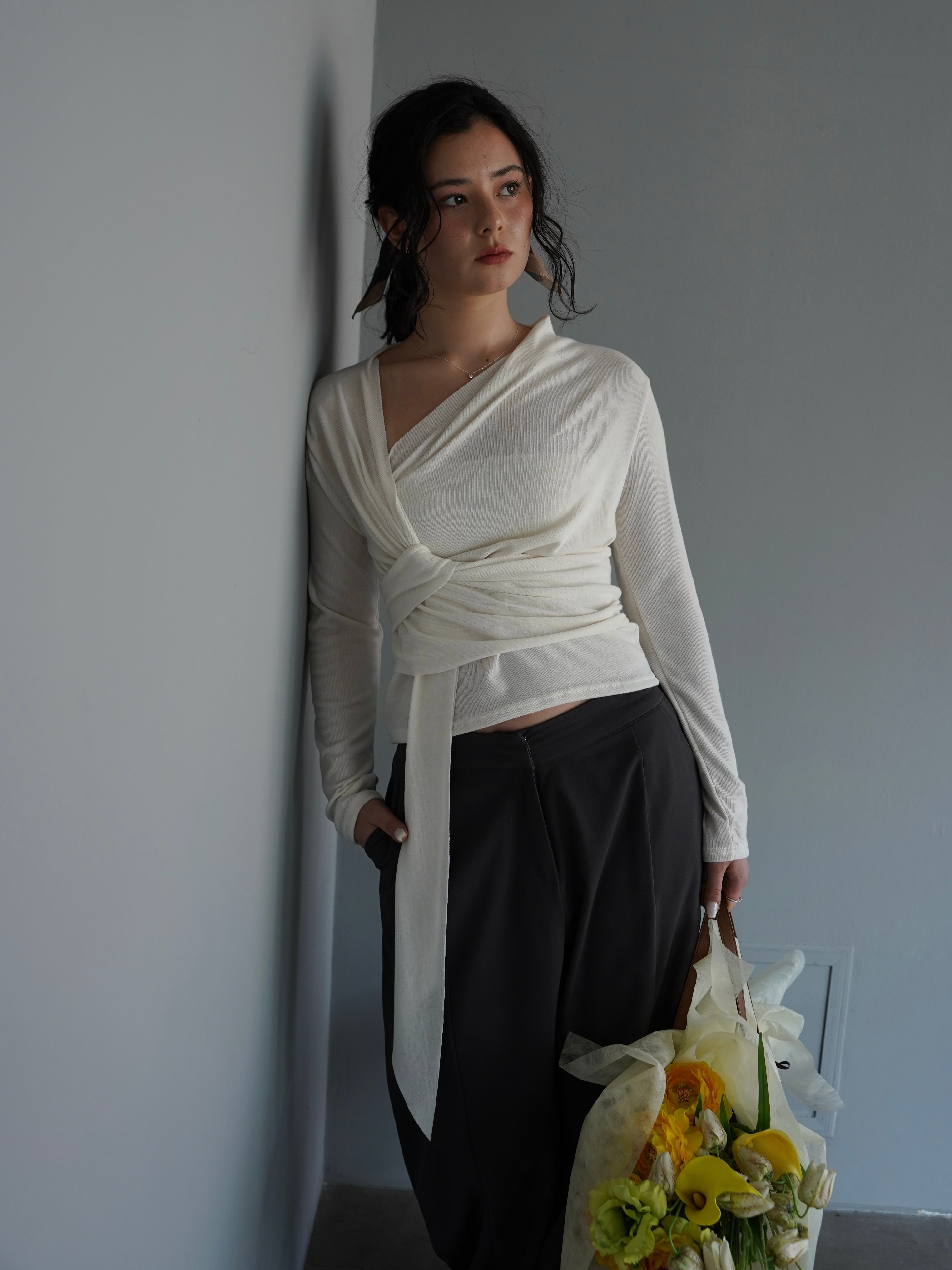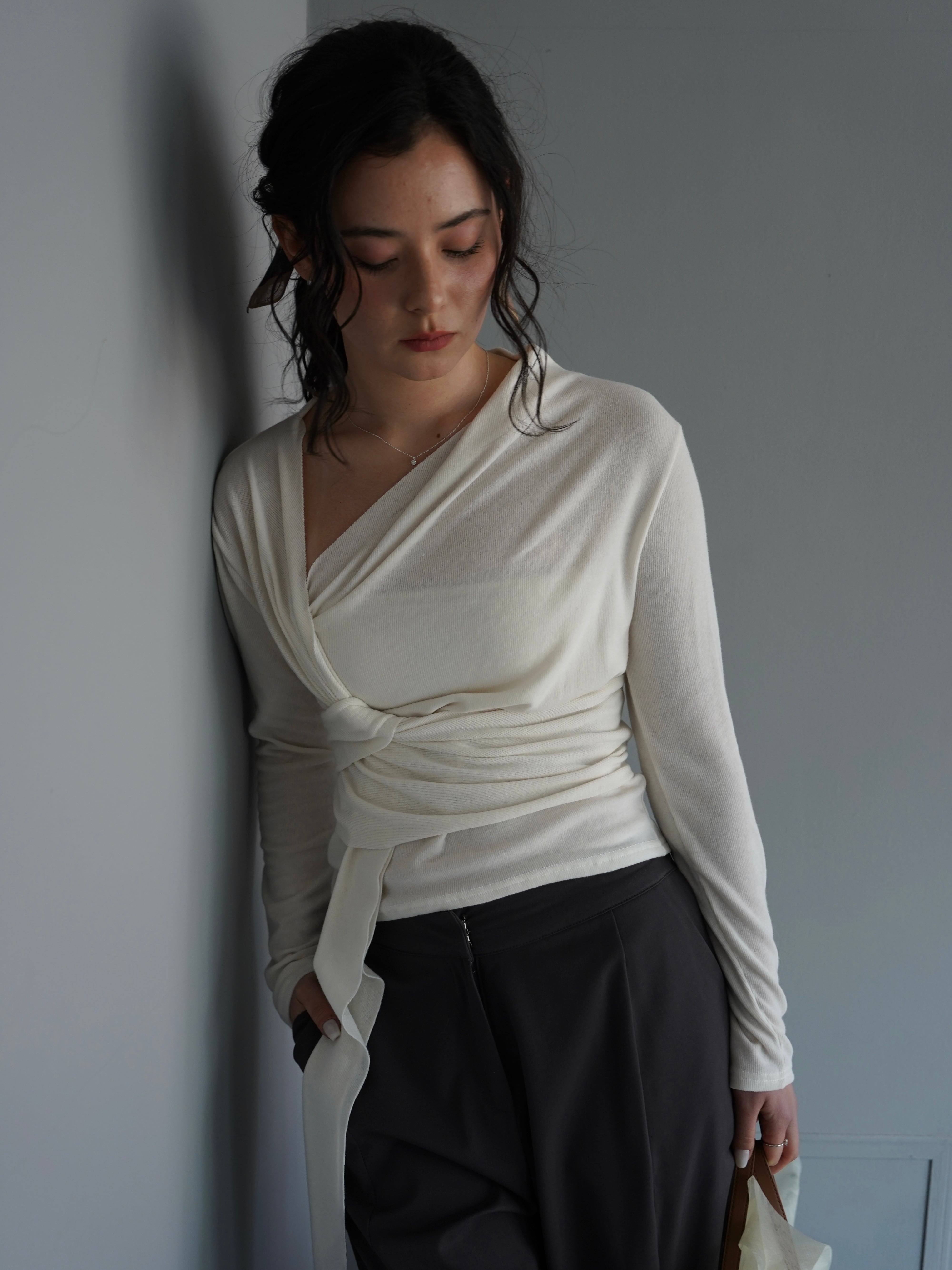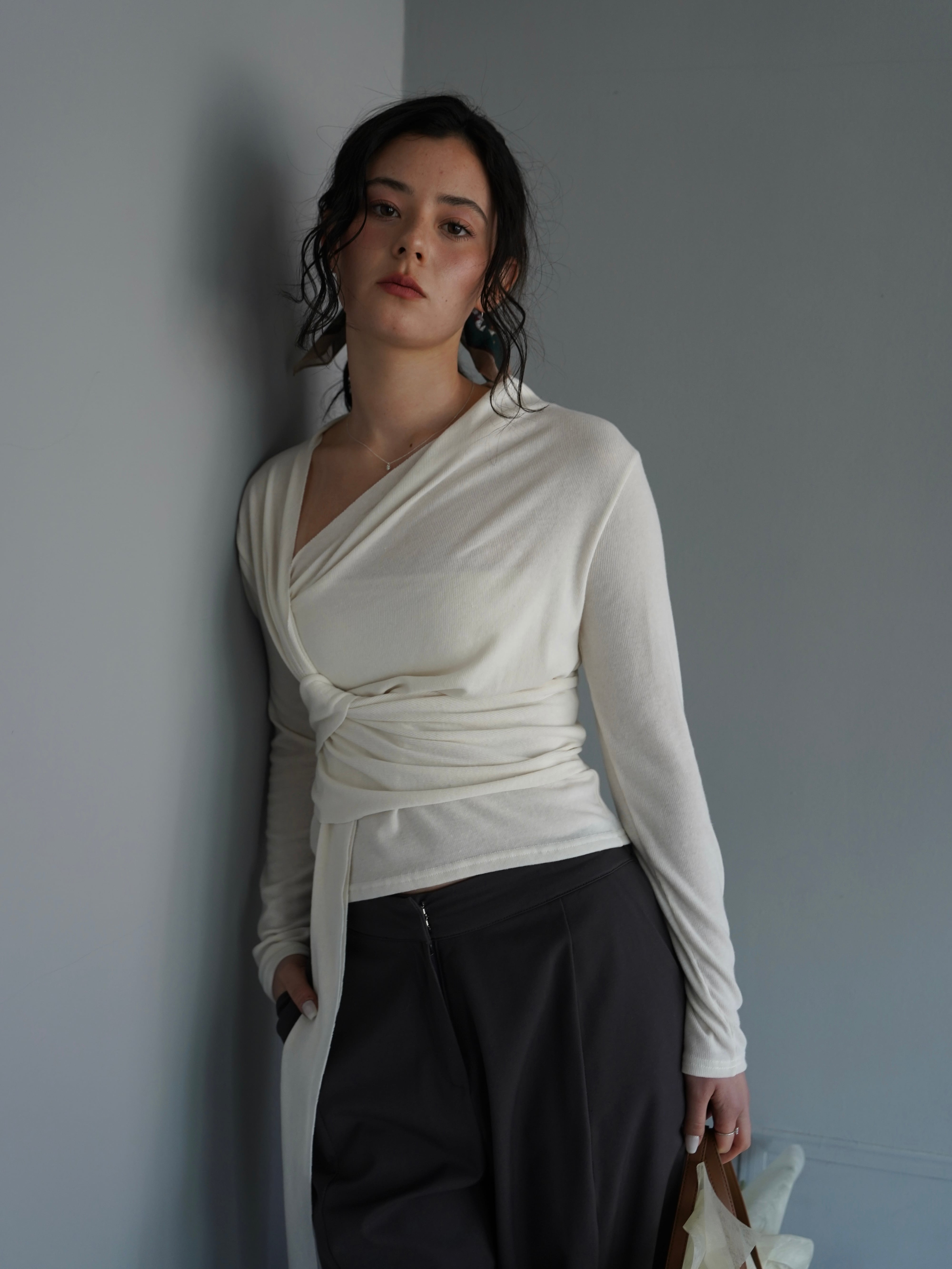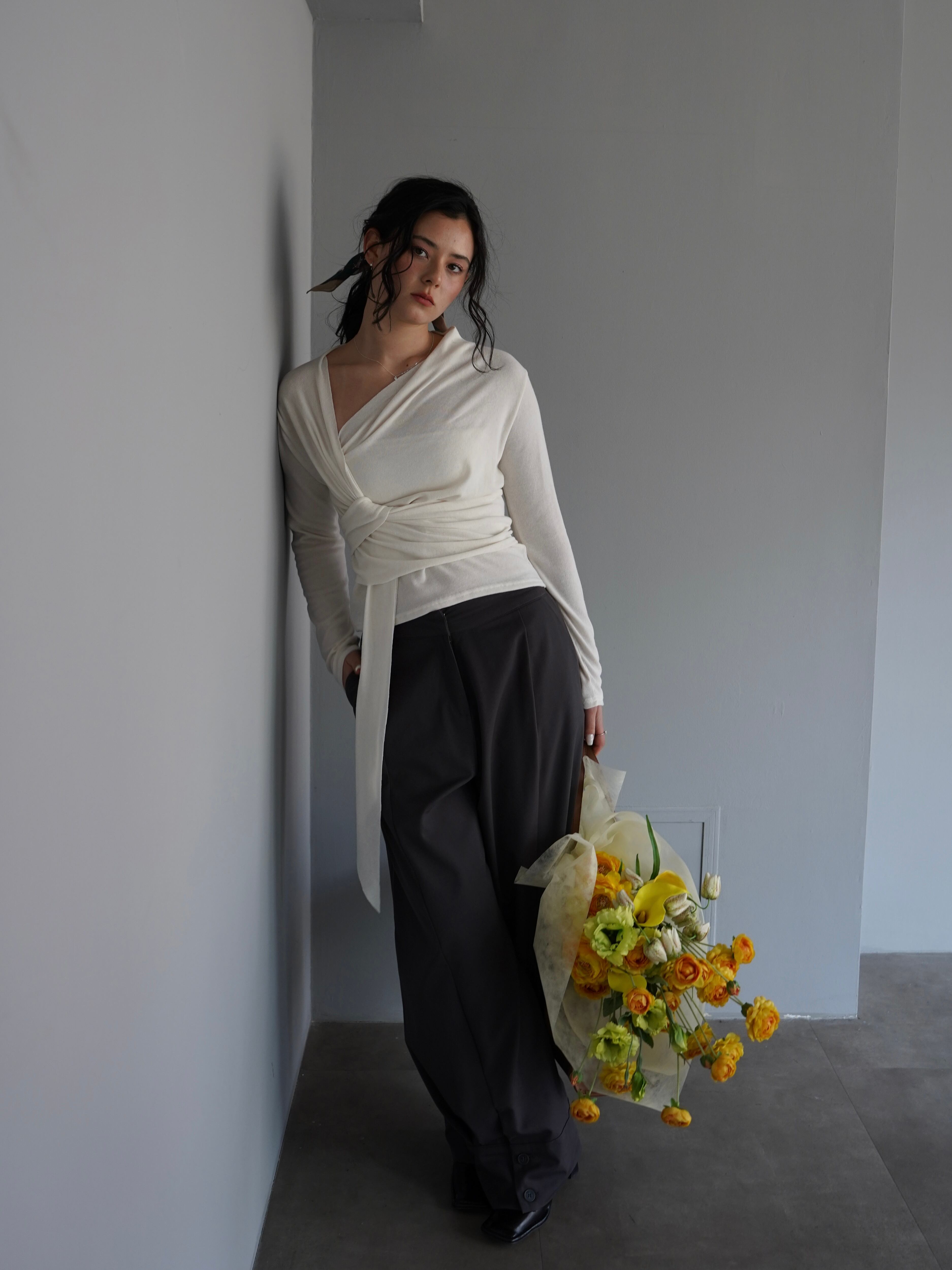 さりげないニュアンスを生むドレープが、シンプルながらも印象的なシルエットを演出します。