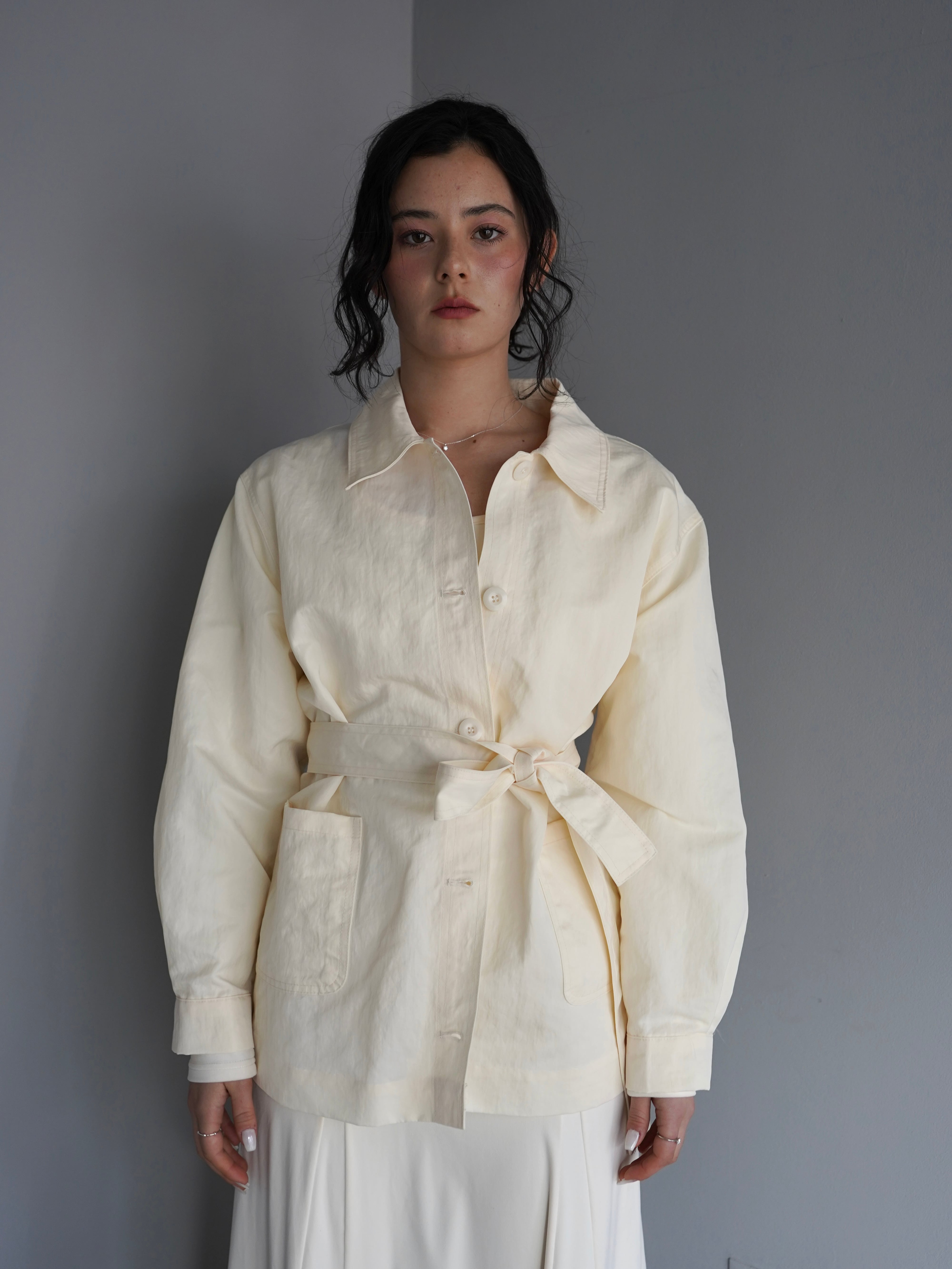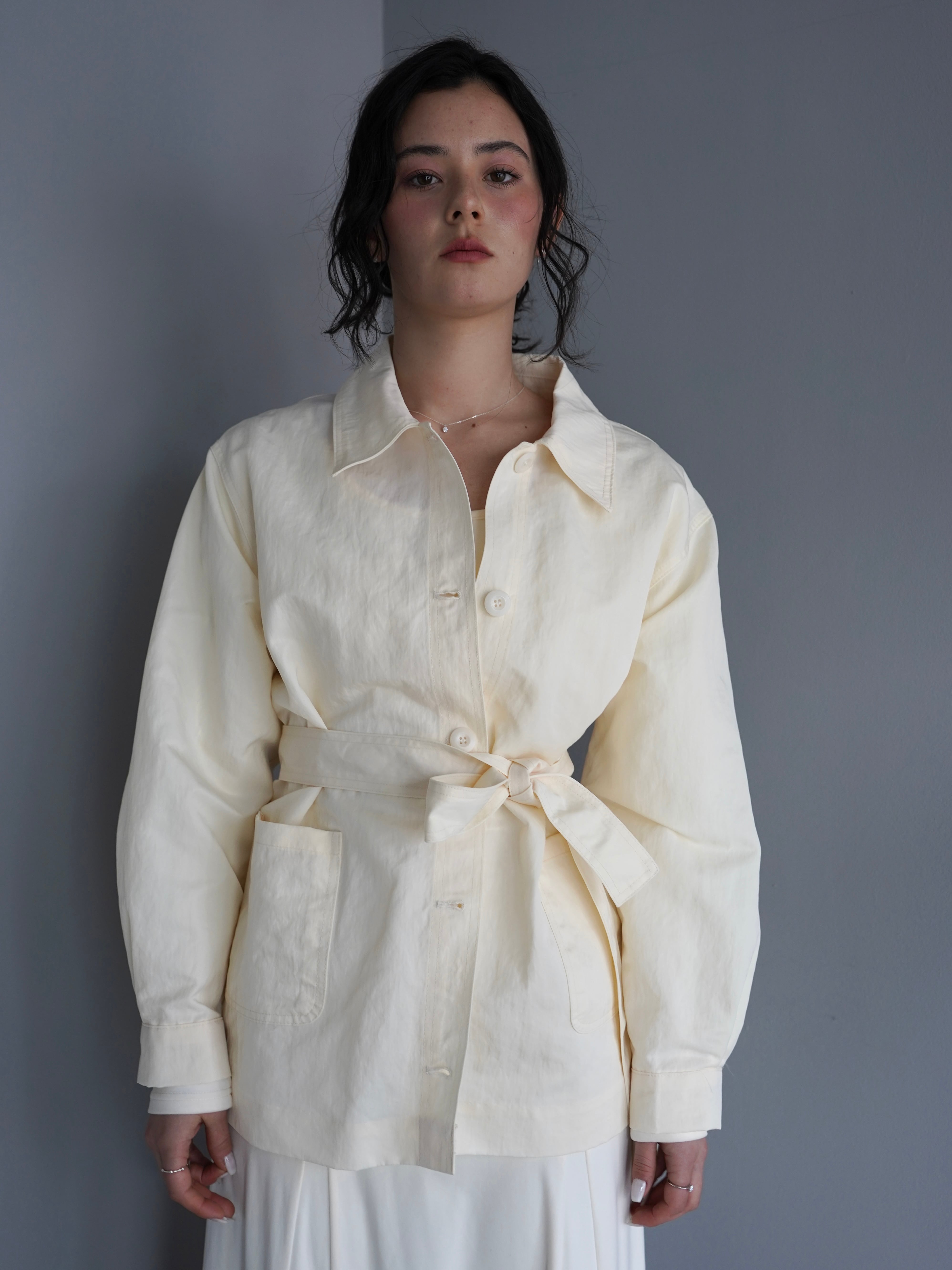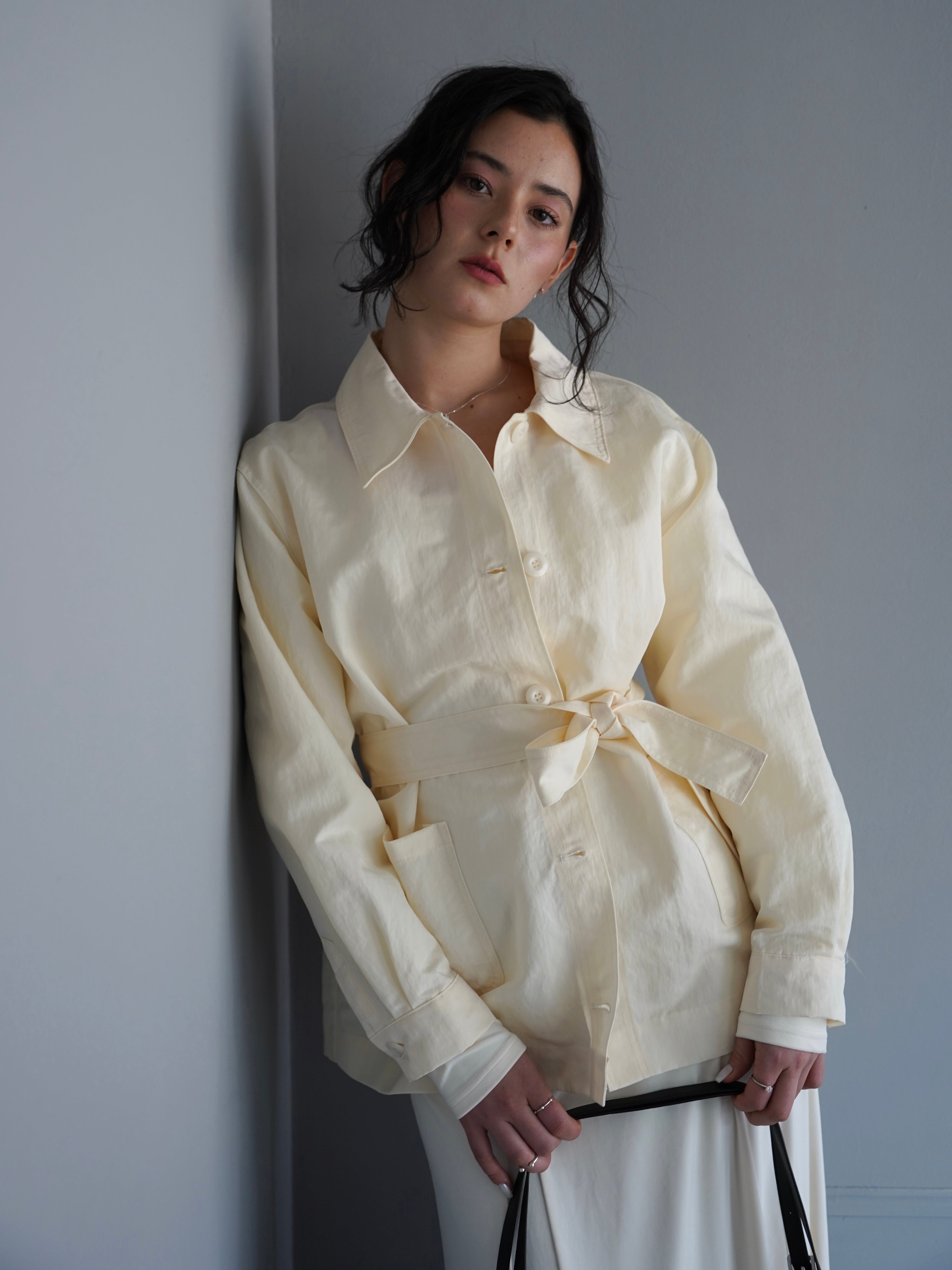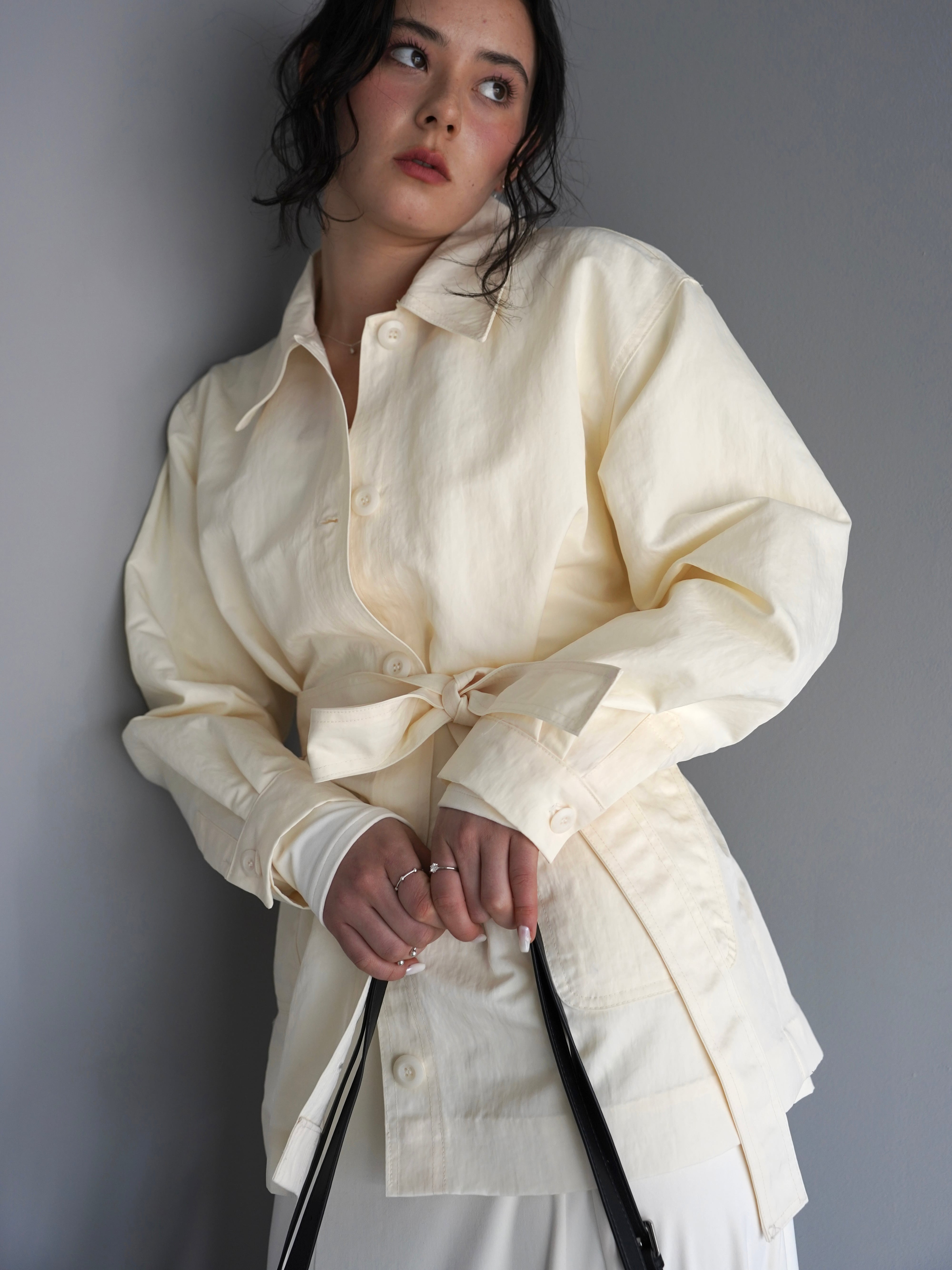 シャツのようにさらっと羽織れる軽さがありながら、ウエストのベルトでシルエットを調整できるデザインです。