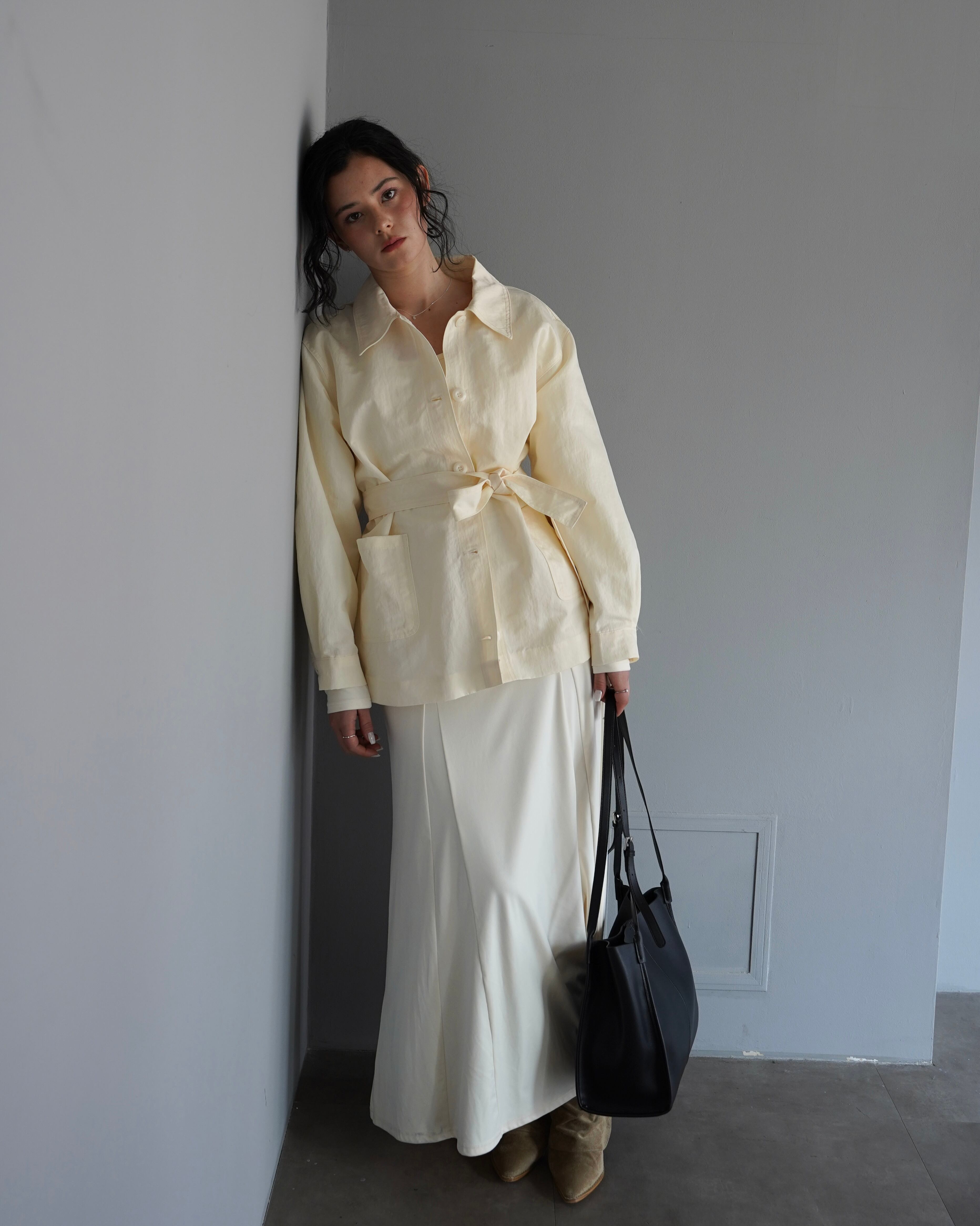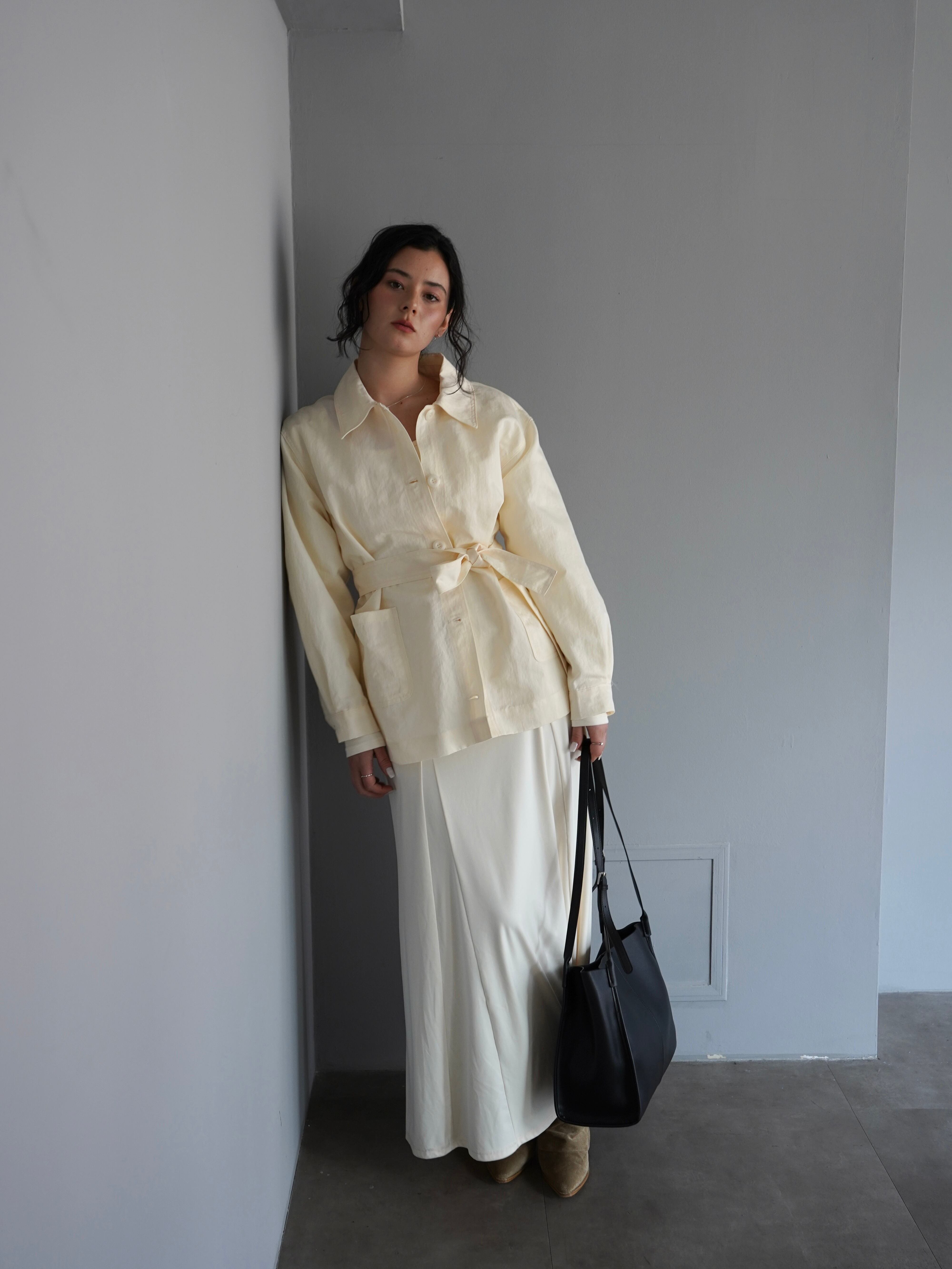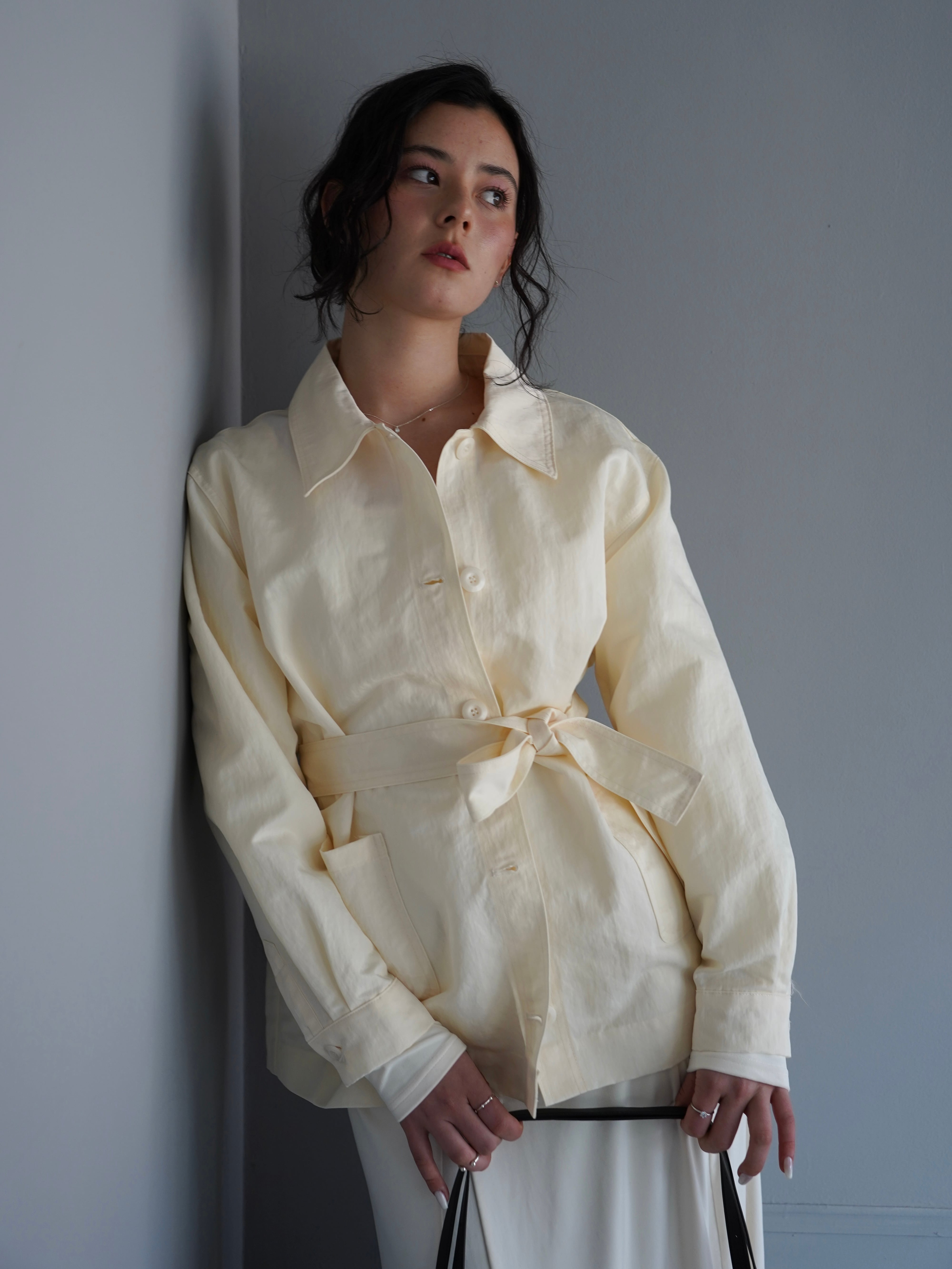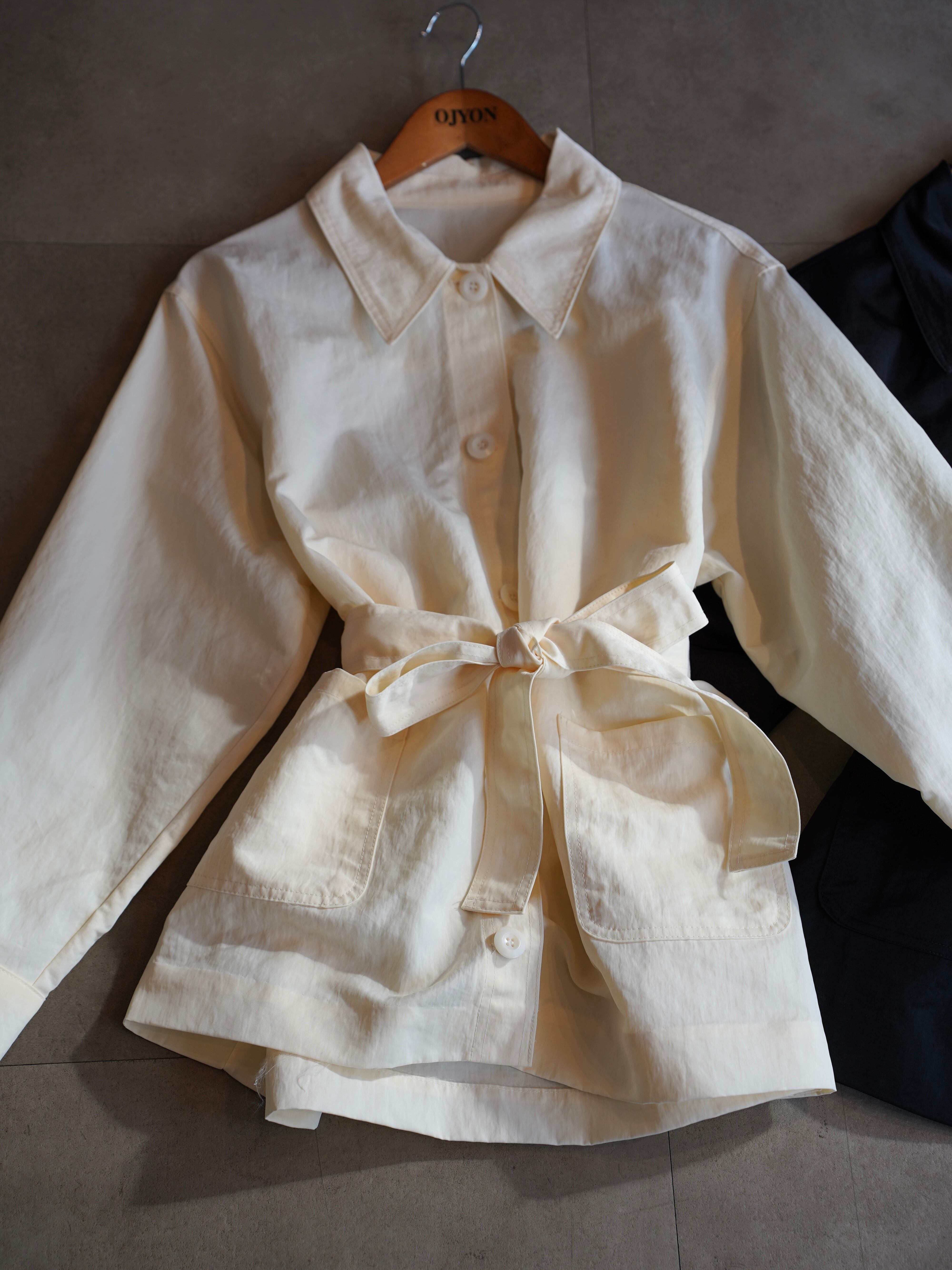 シャツのようにさらっと羽織れる軽さがありながら、ウエストのベルトでシルエットを調整できるデザインです。