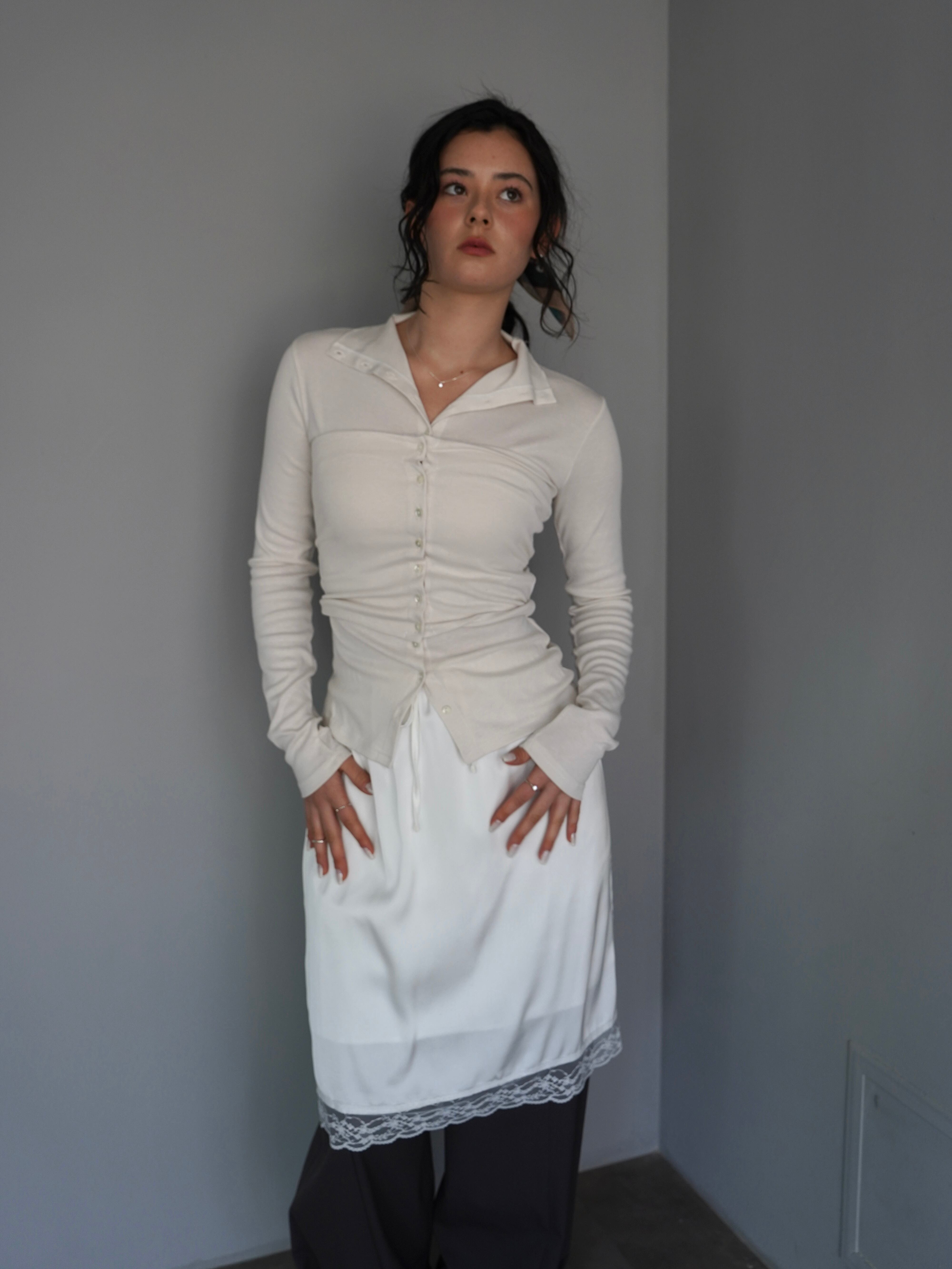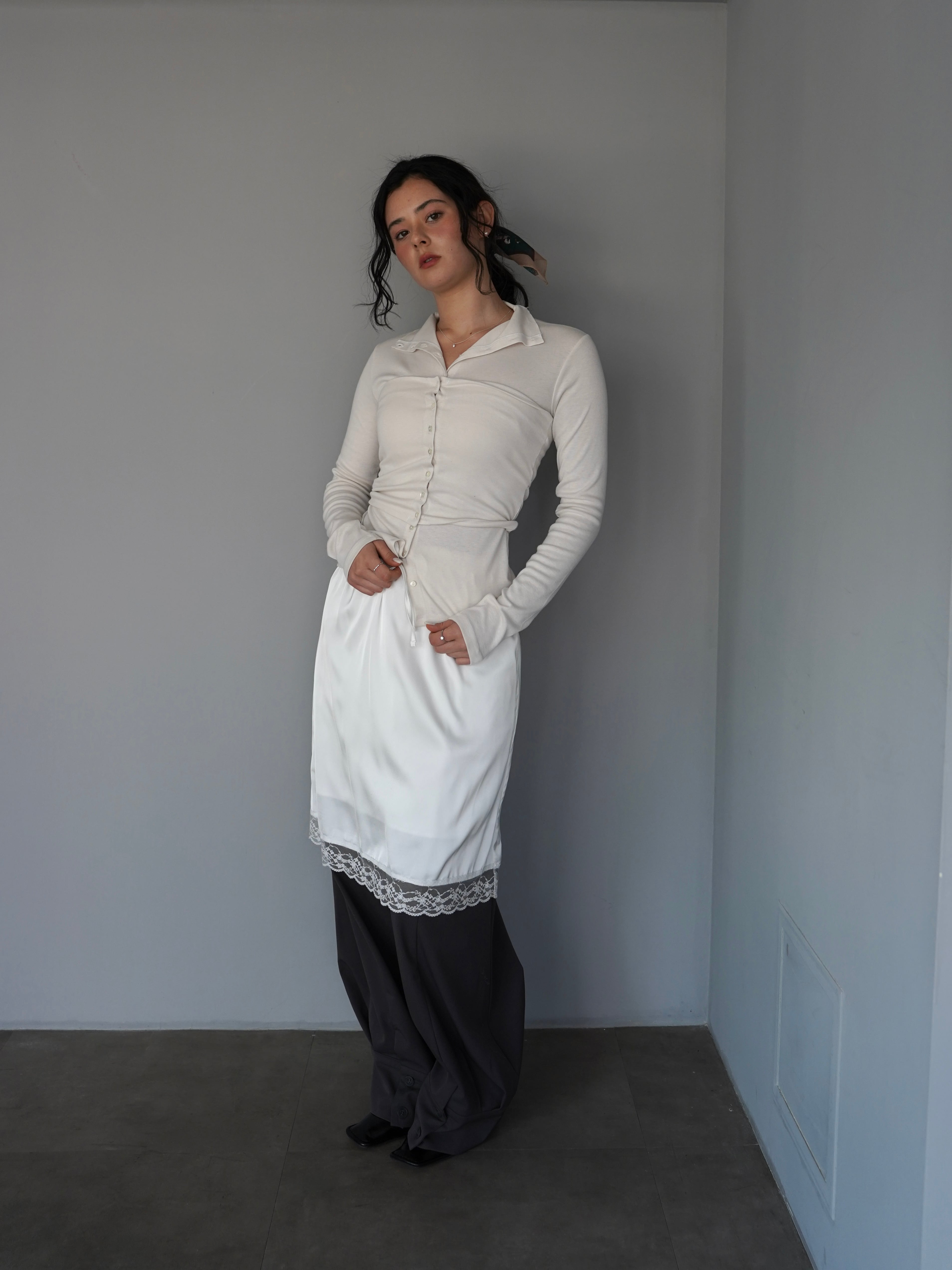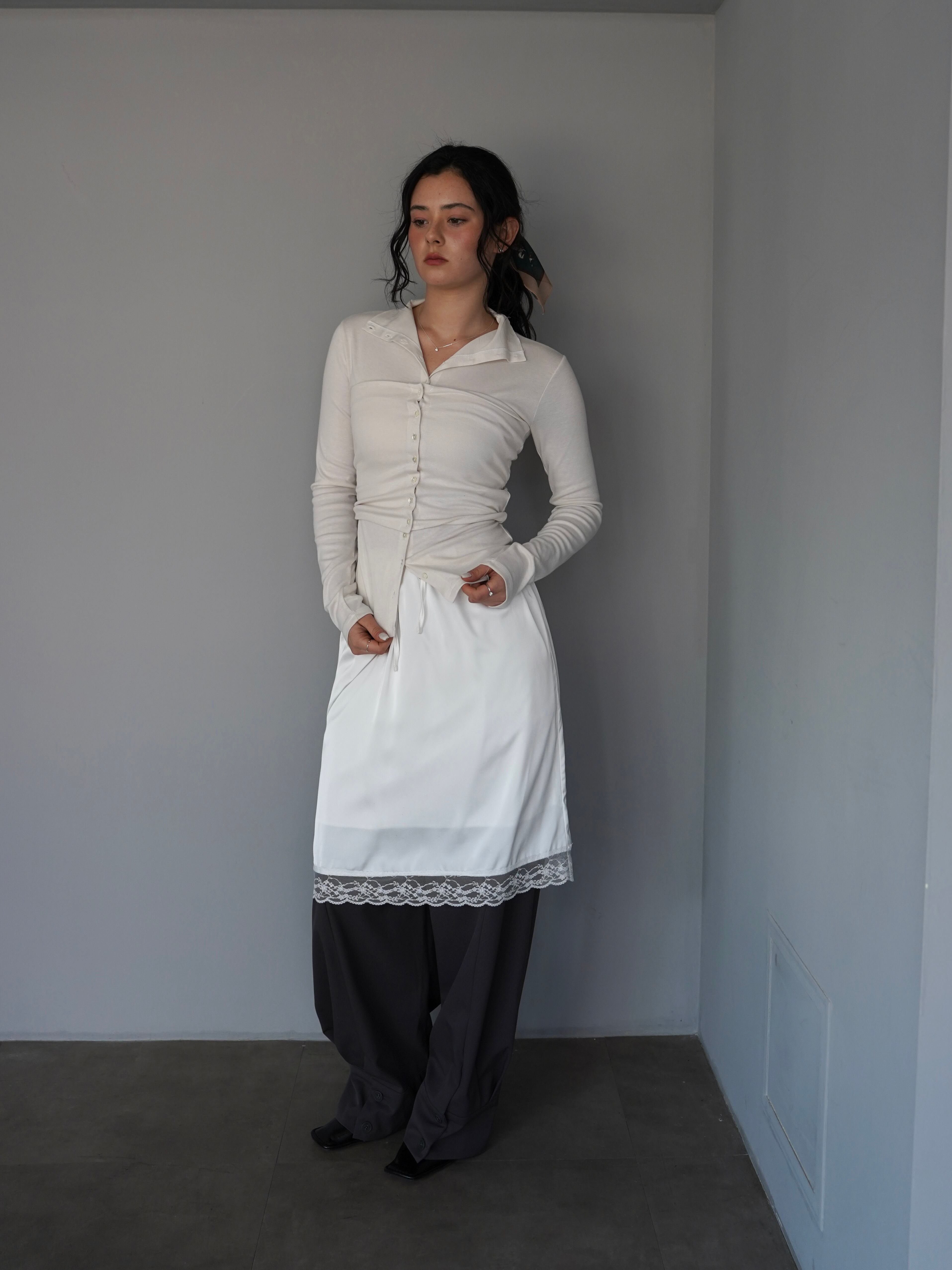 裾にはさりげなくレースをあしらい、シンプルなデザインの中に女性らしいアクセントを添えました。