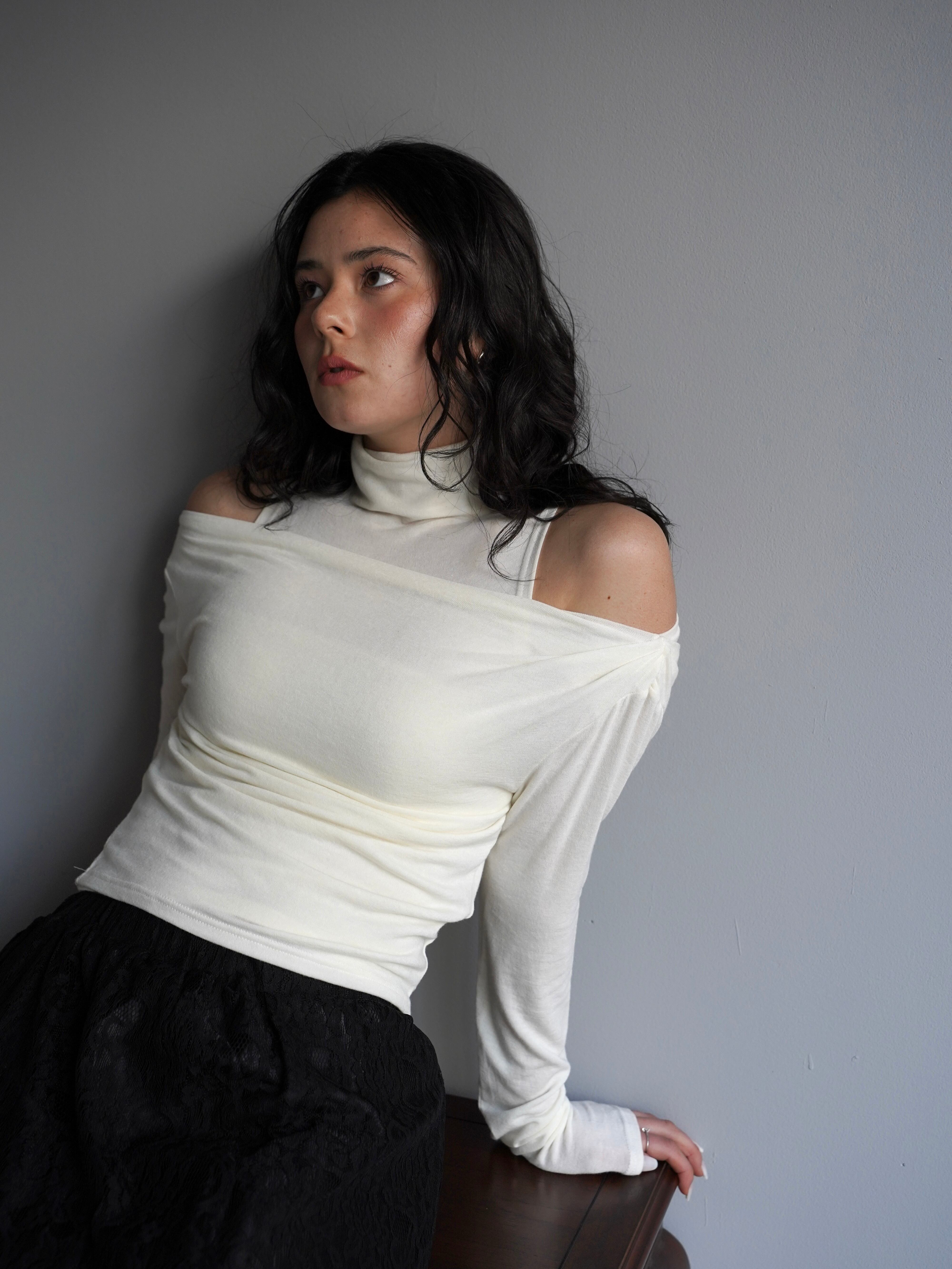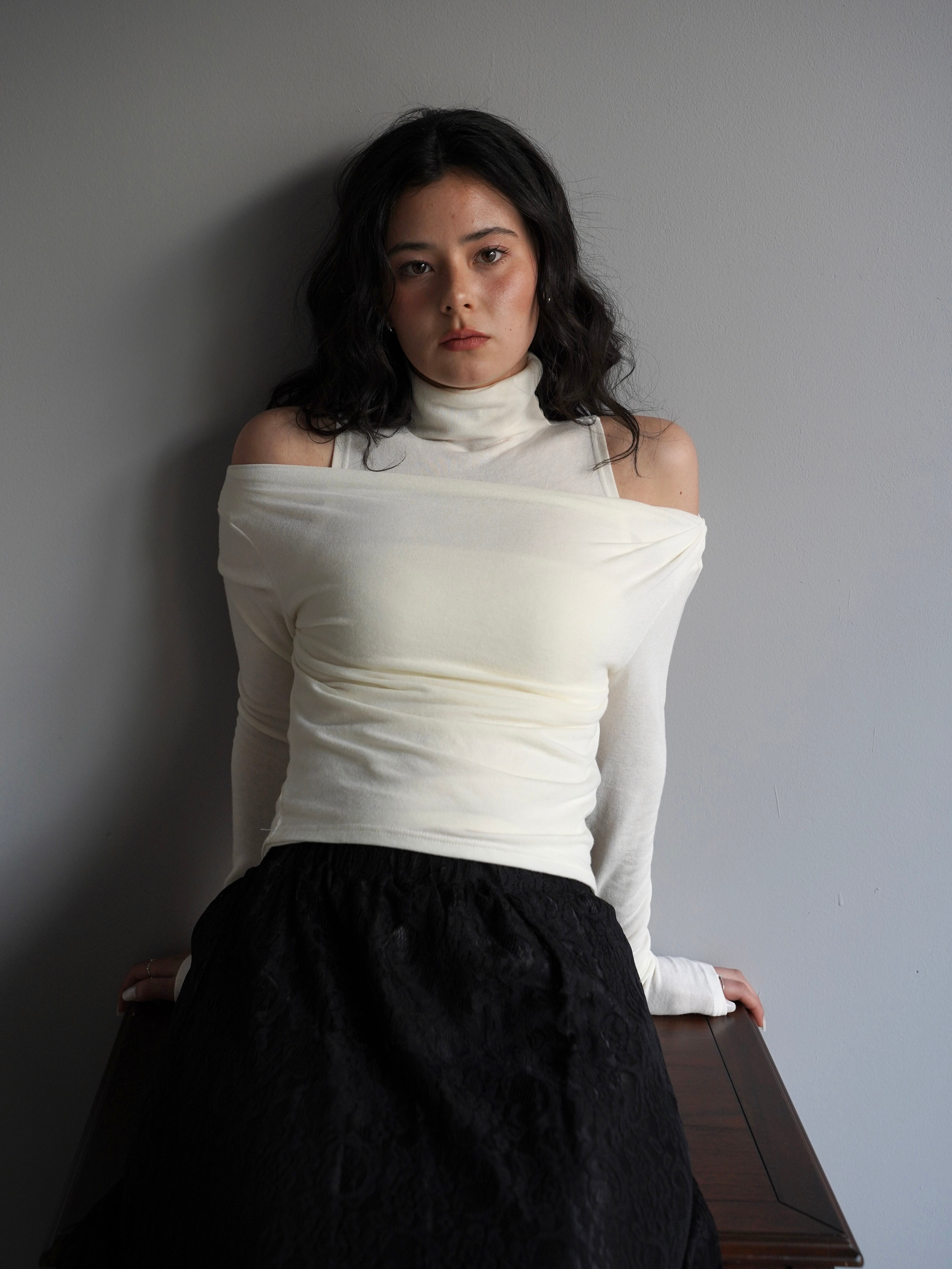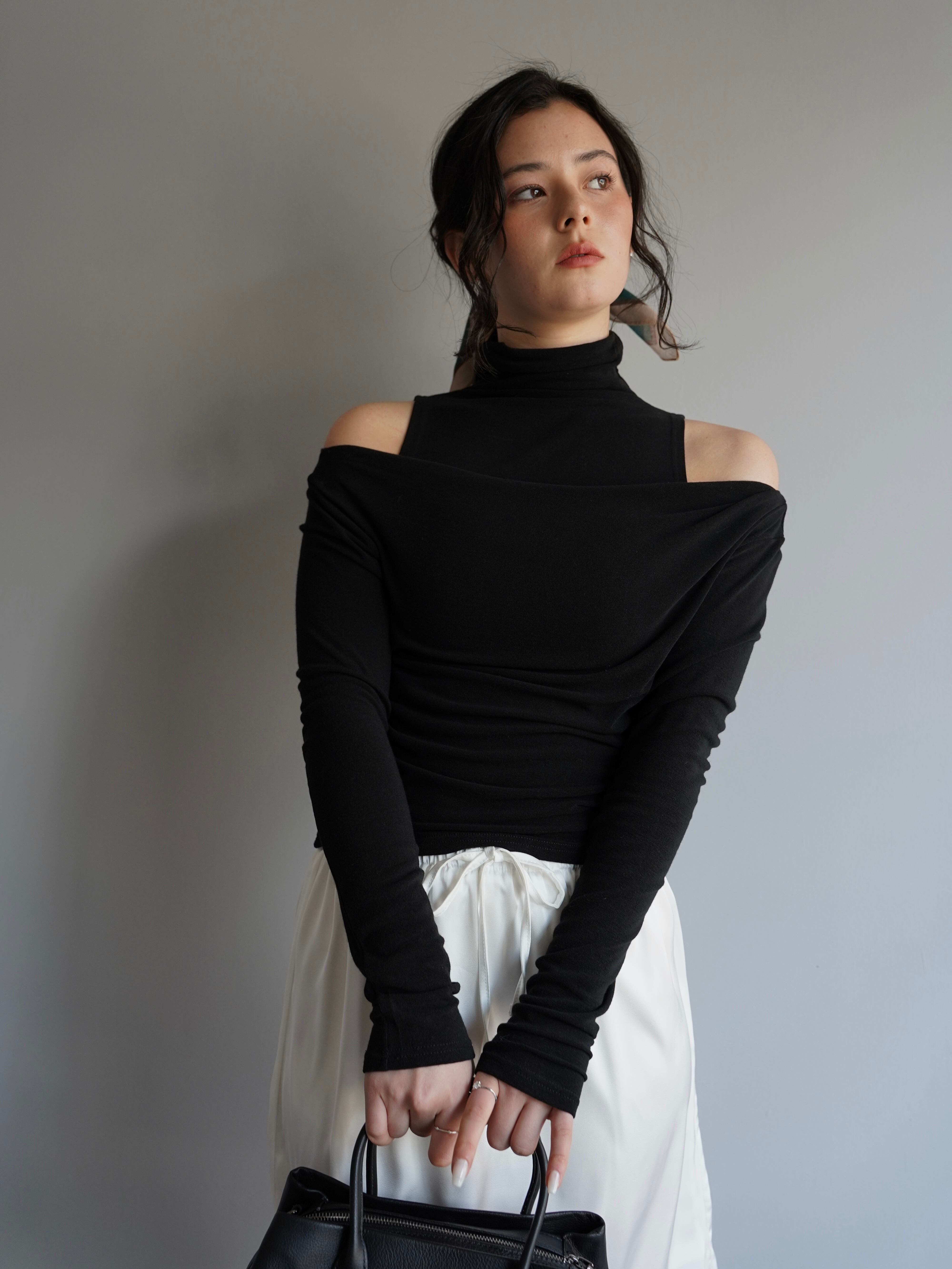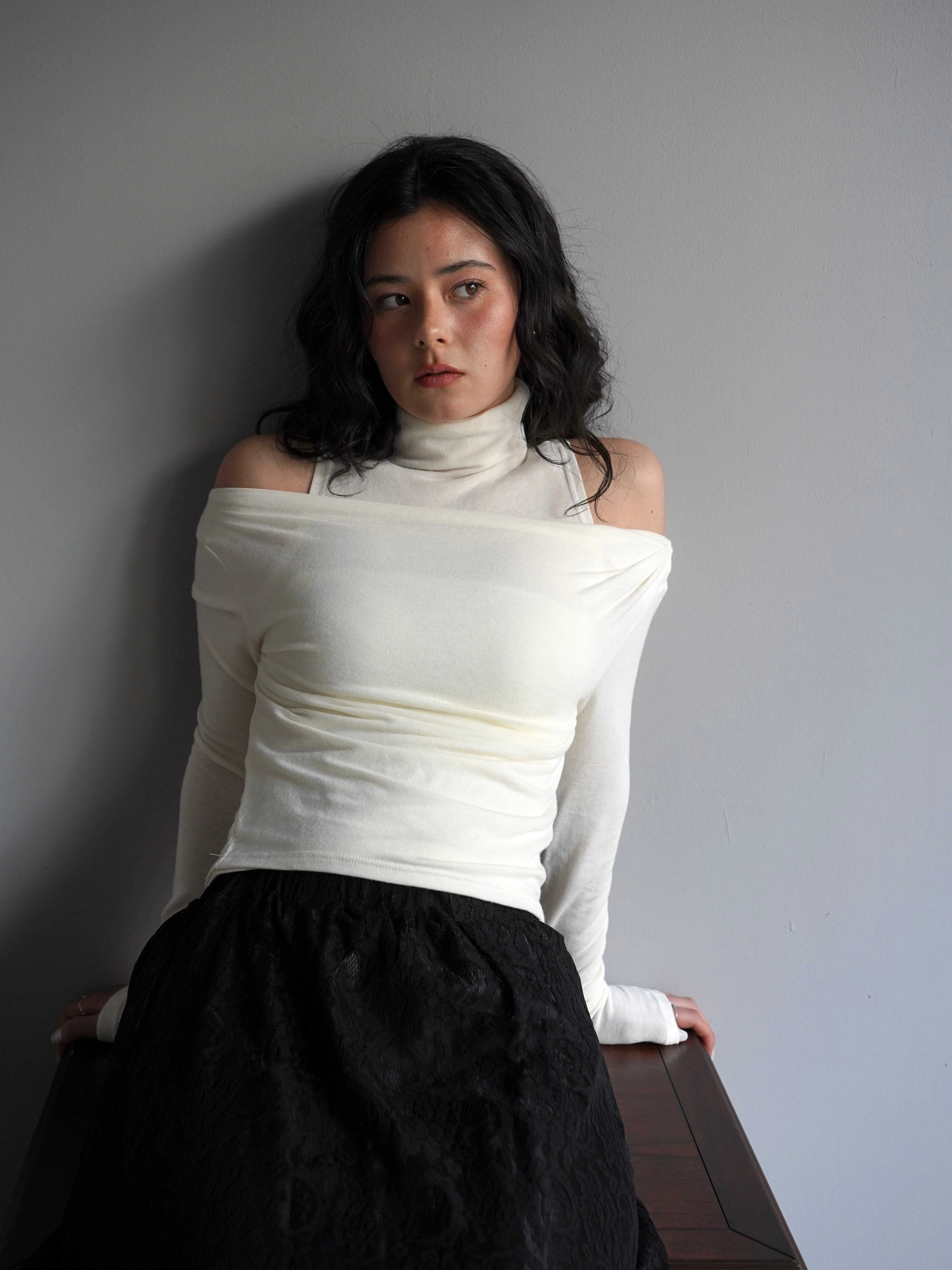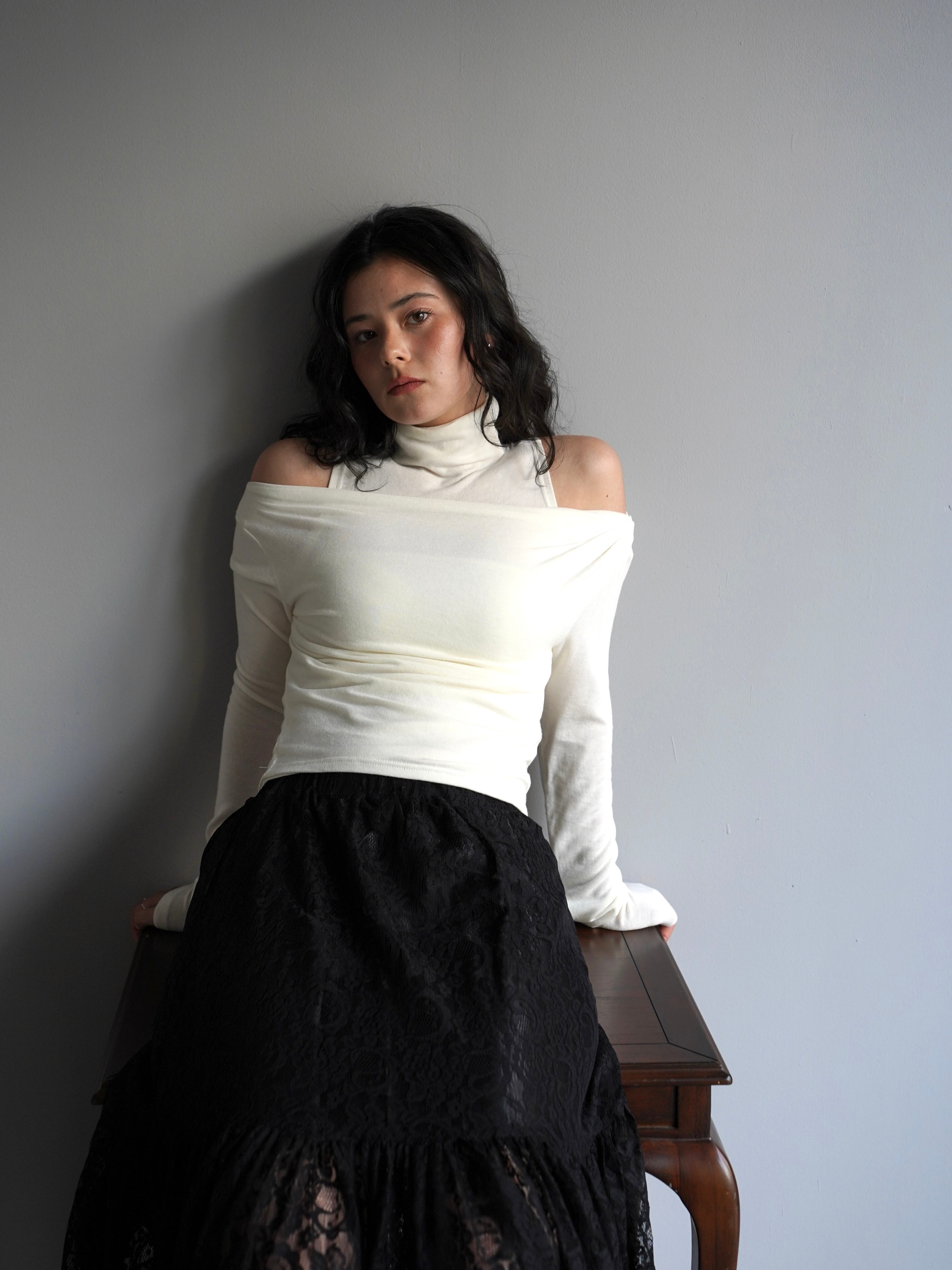 オフショルダーのトップスとタンクトップがセパレートになったデザインで、自然なドレープと奥行きのある首元を演出。