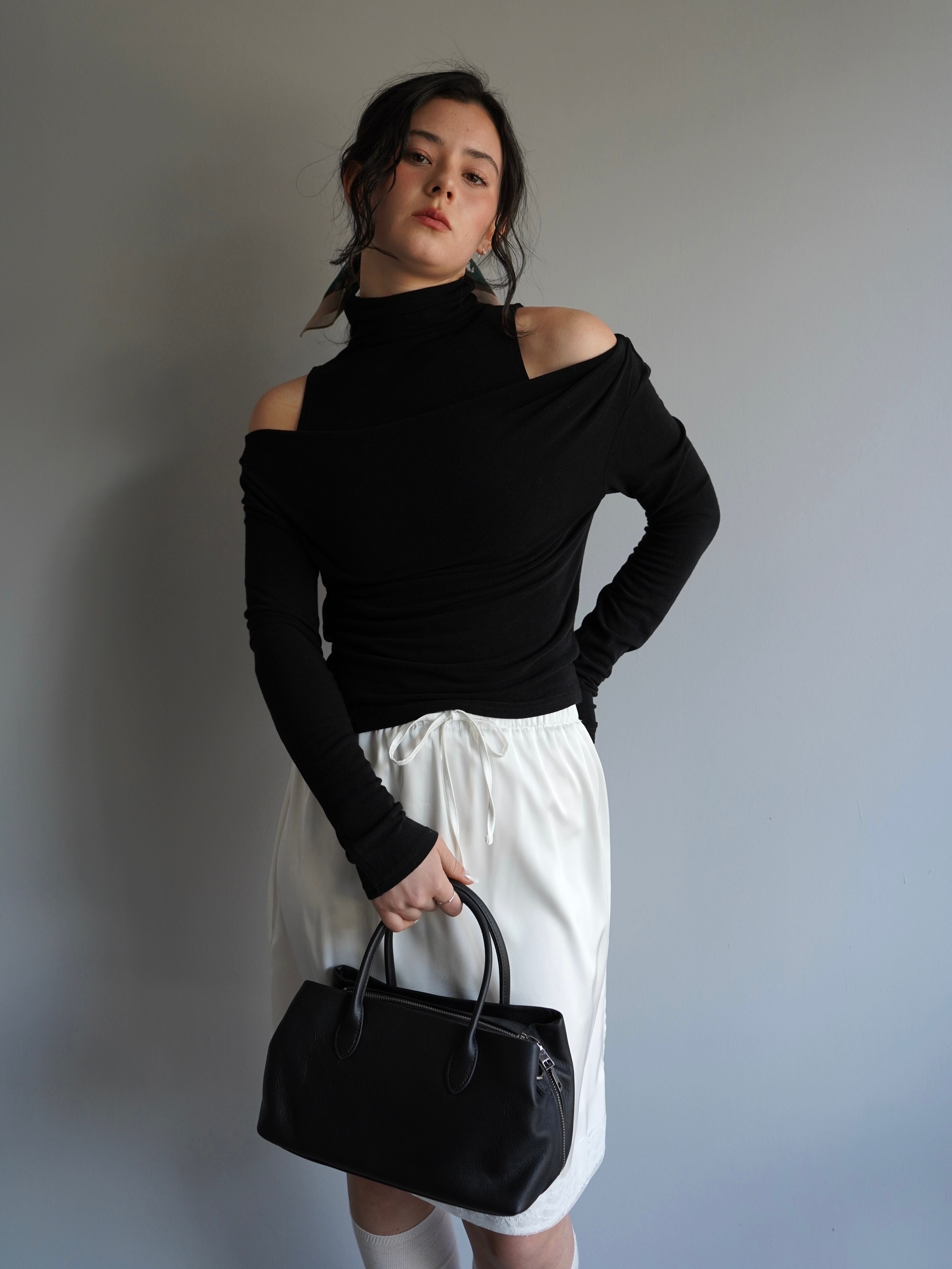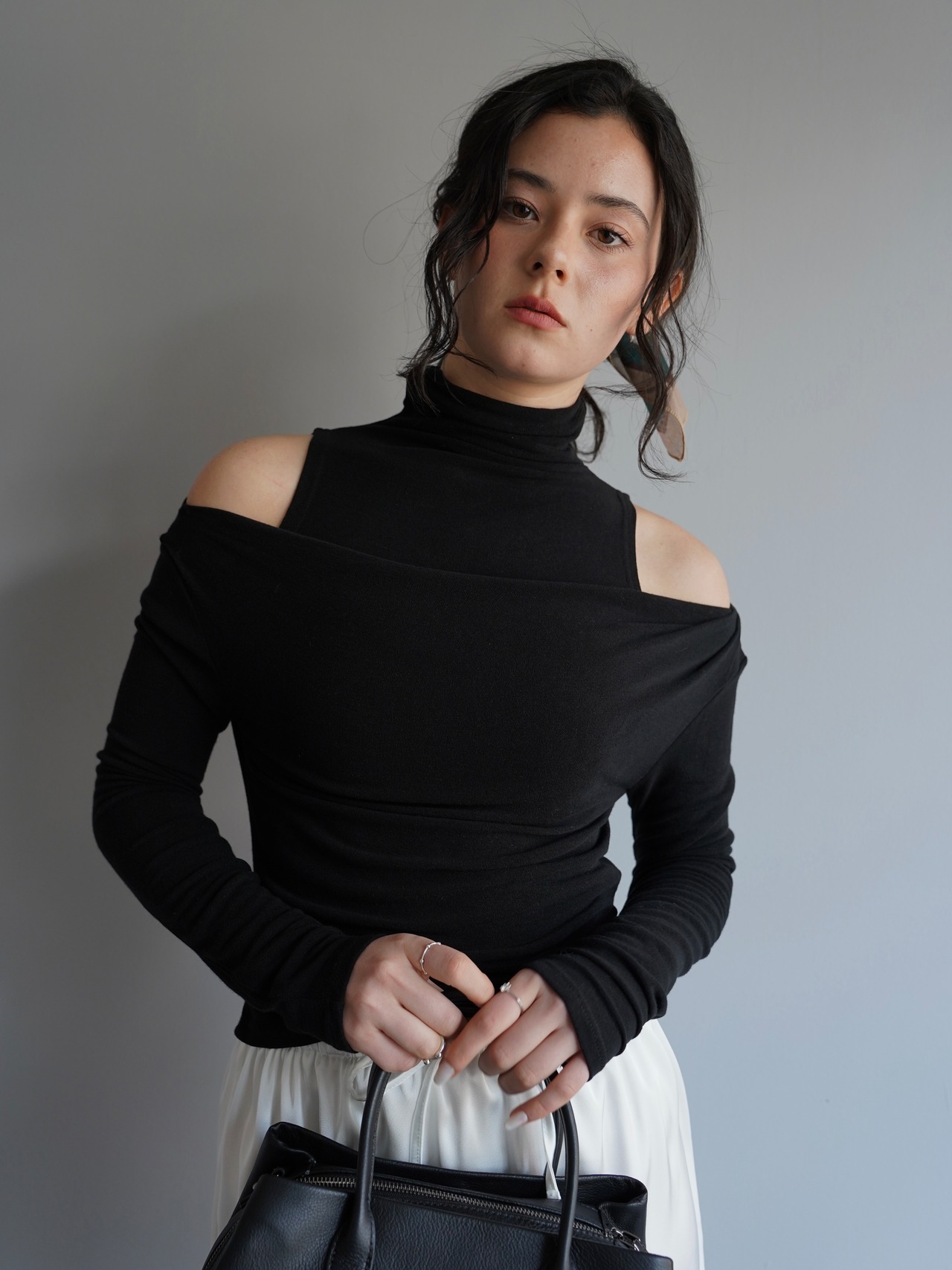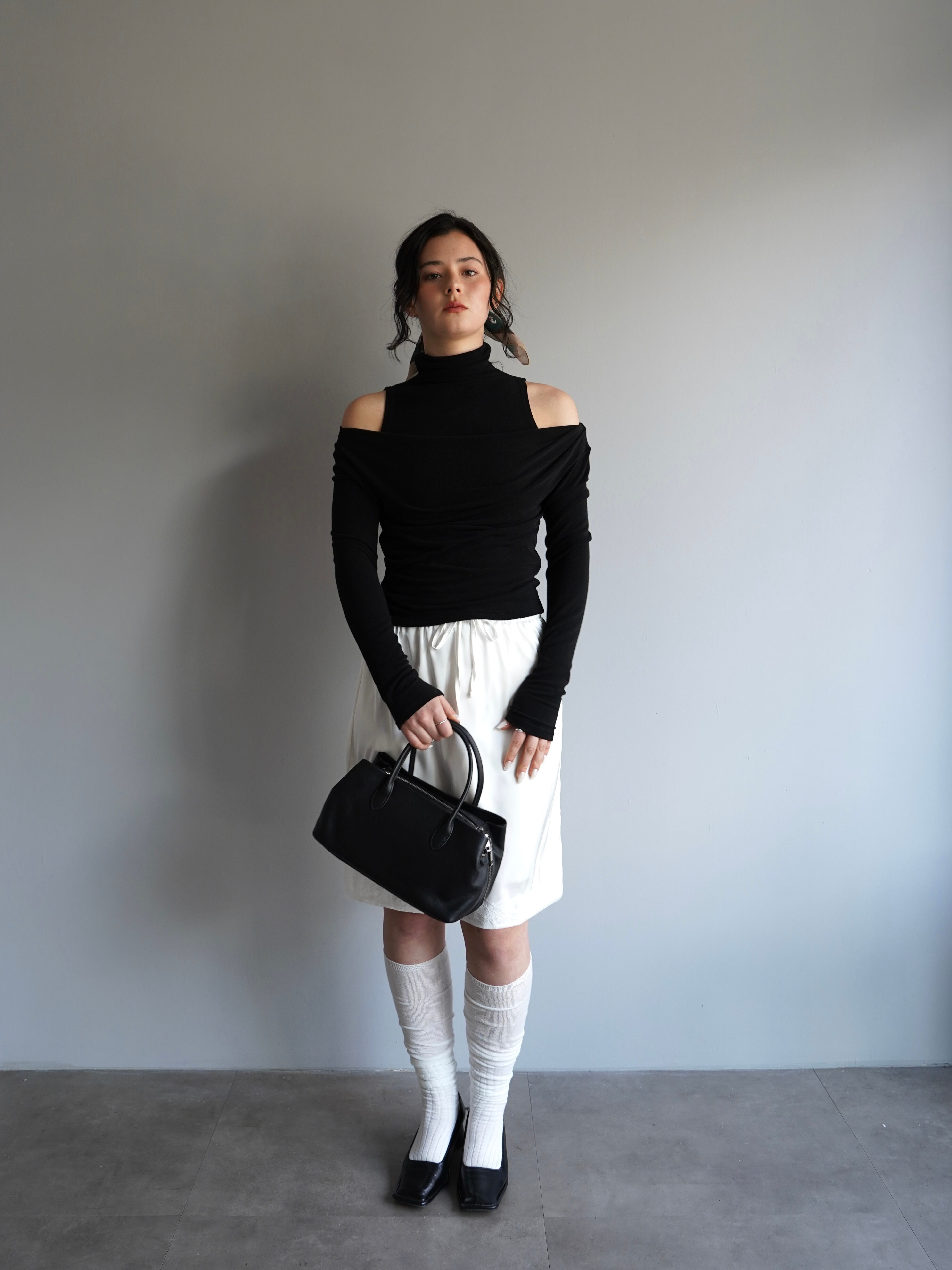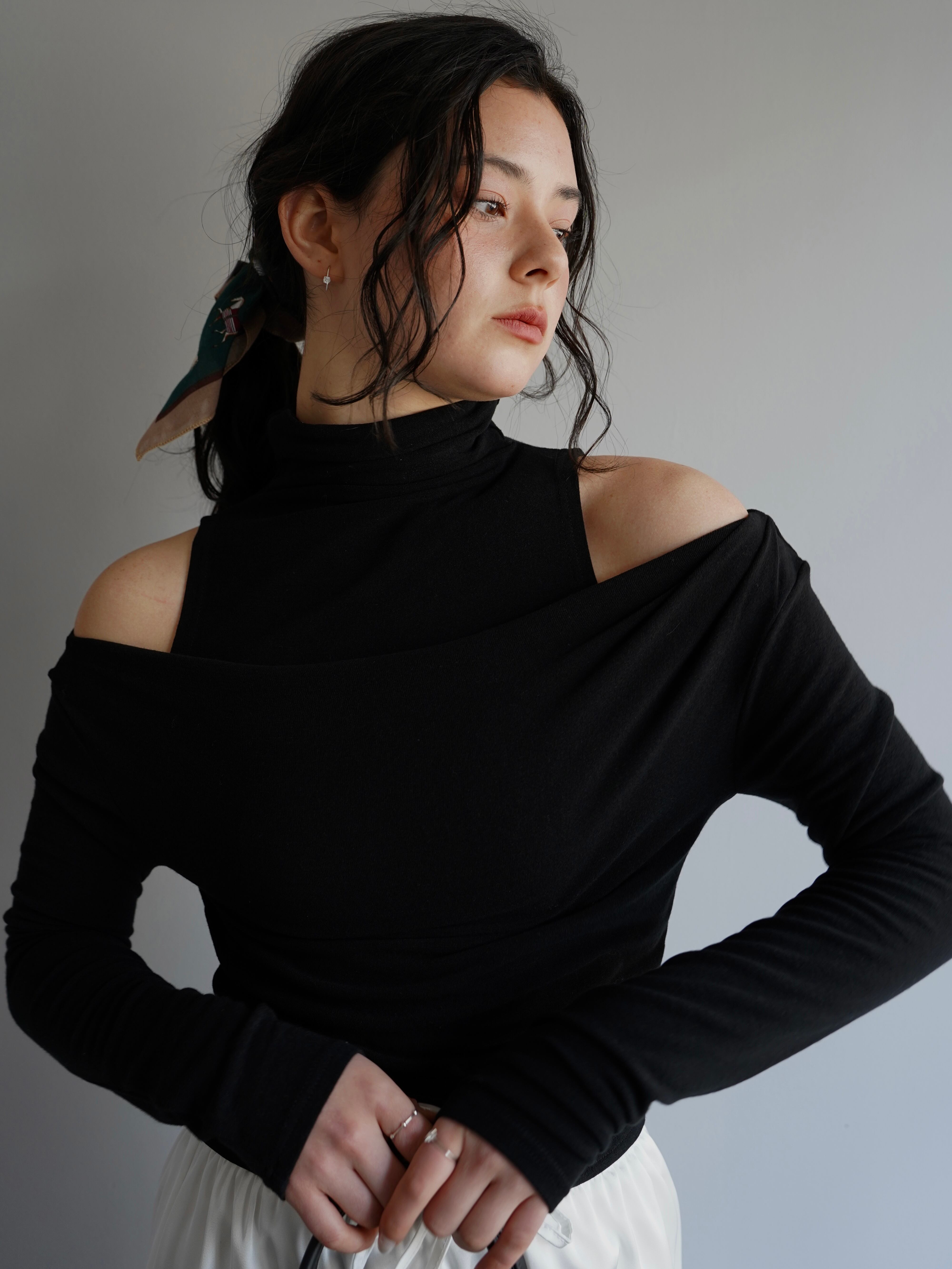 オフショルダーのトップスとタンクトップがセパレートになったデザインで、自然なドレープと奥行きのある首元を演出。