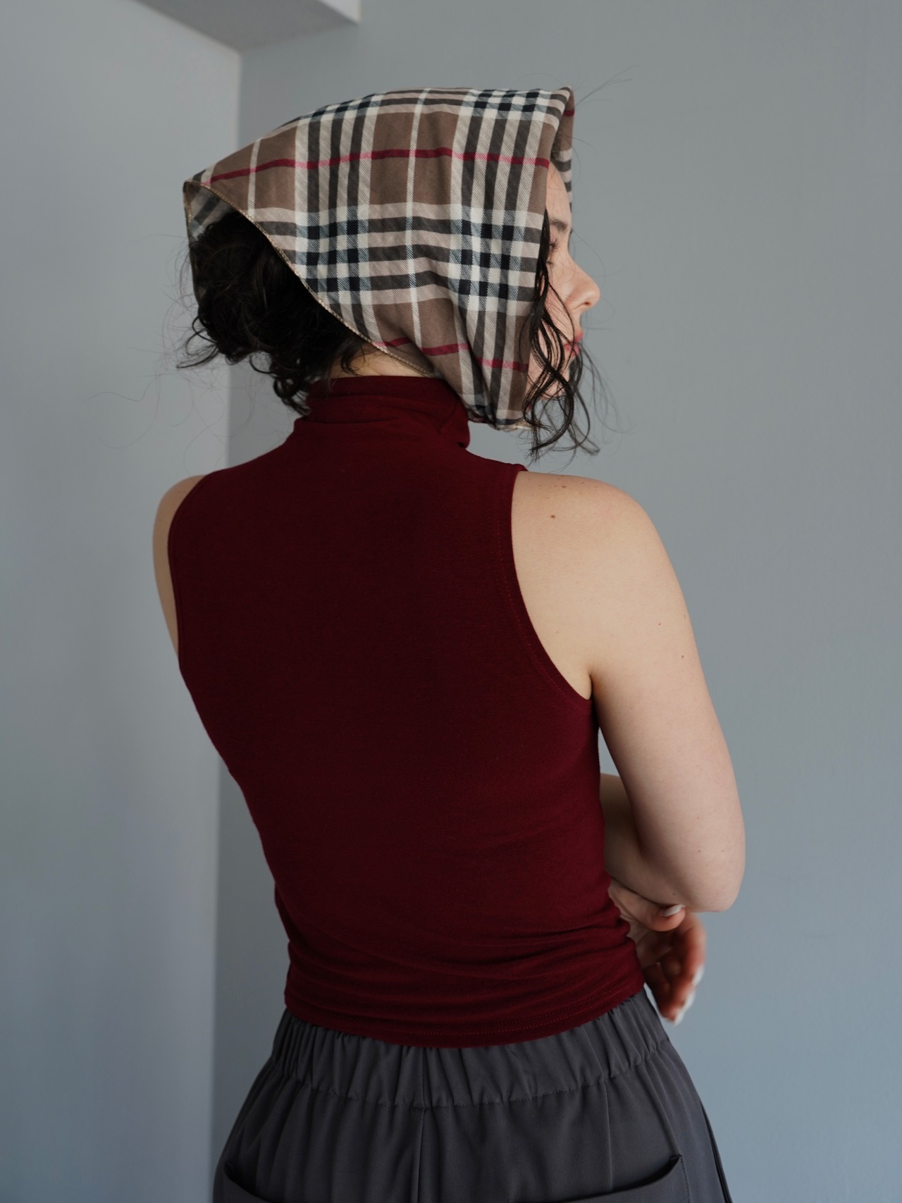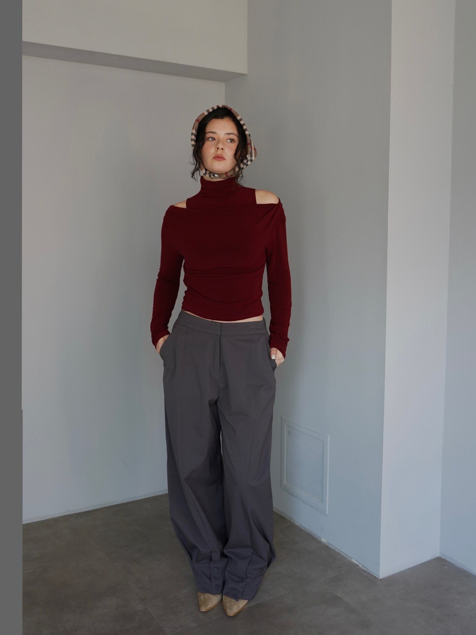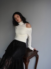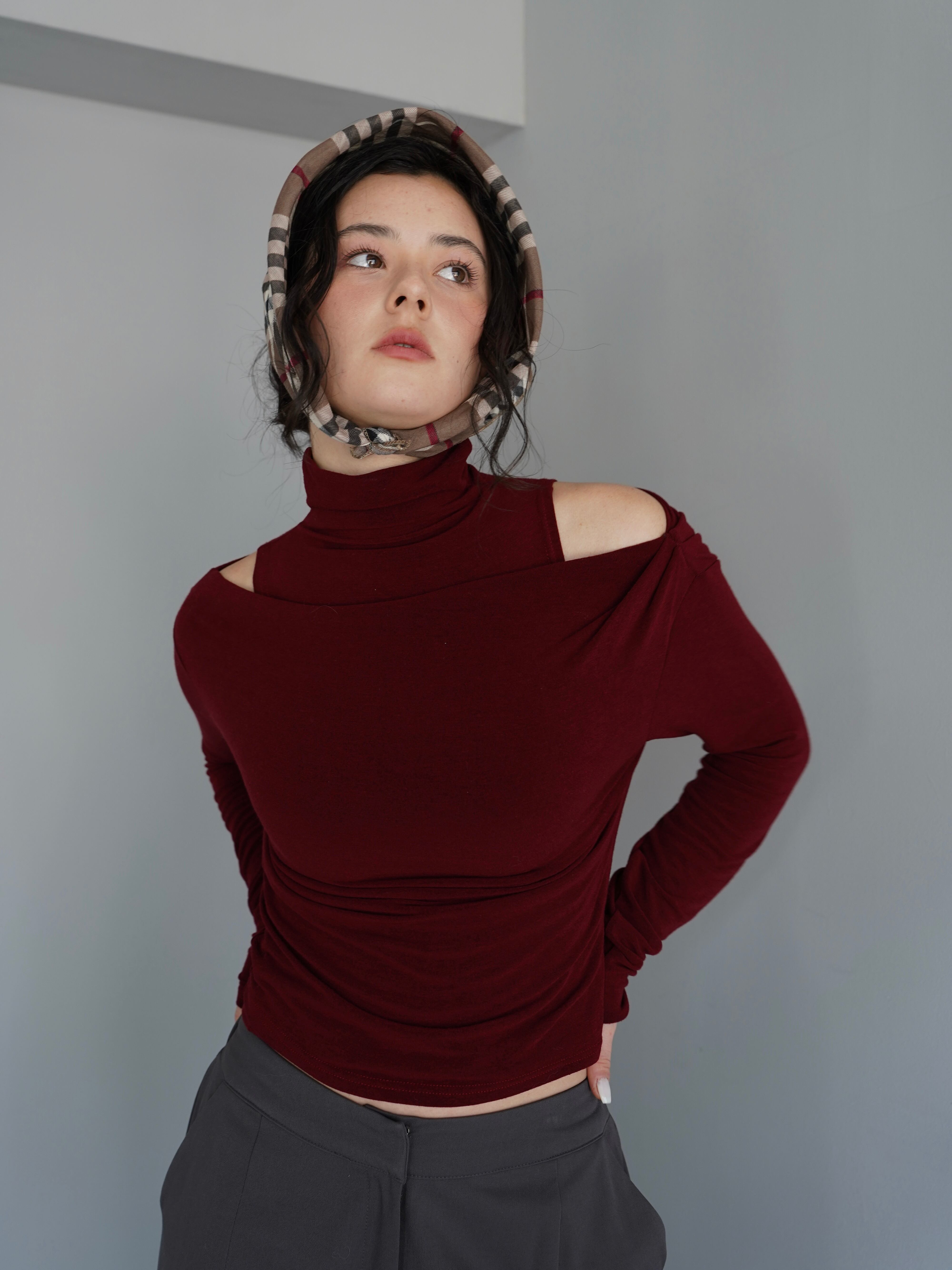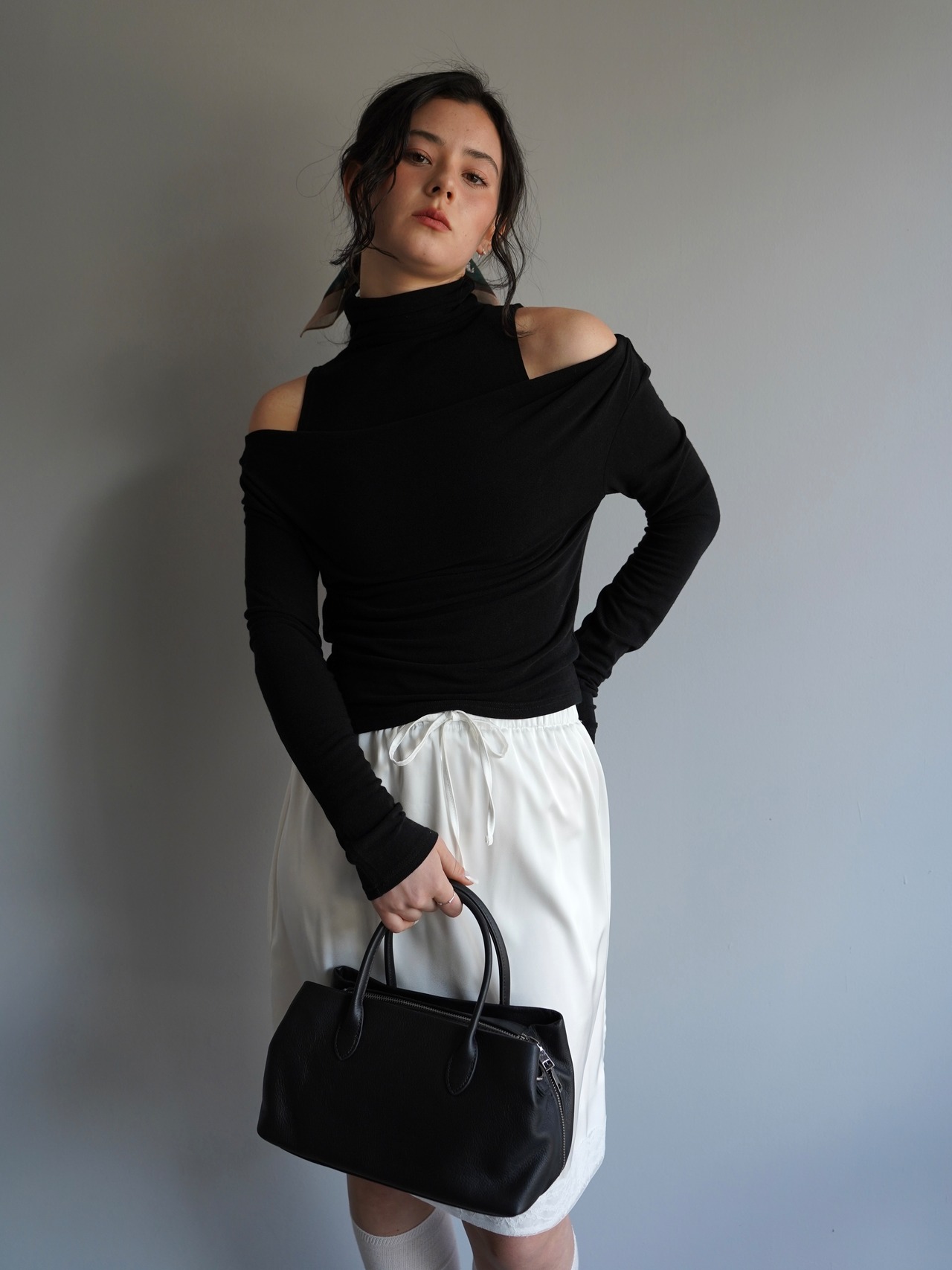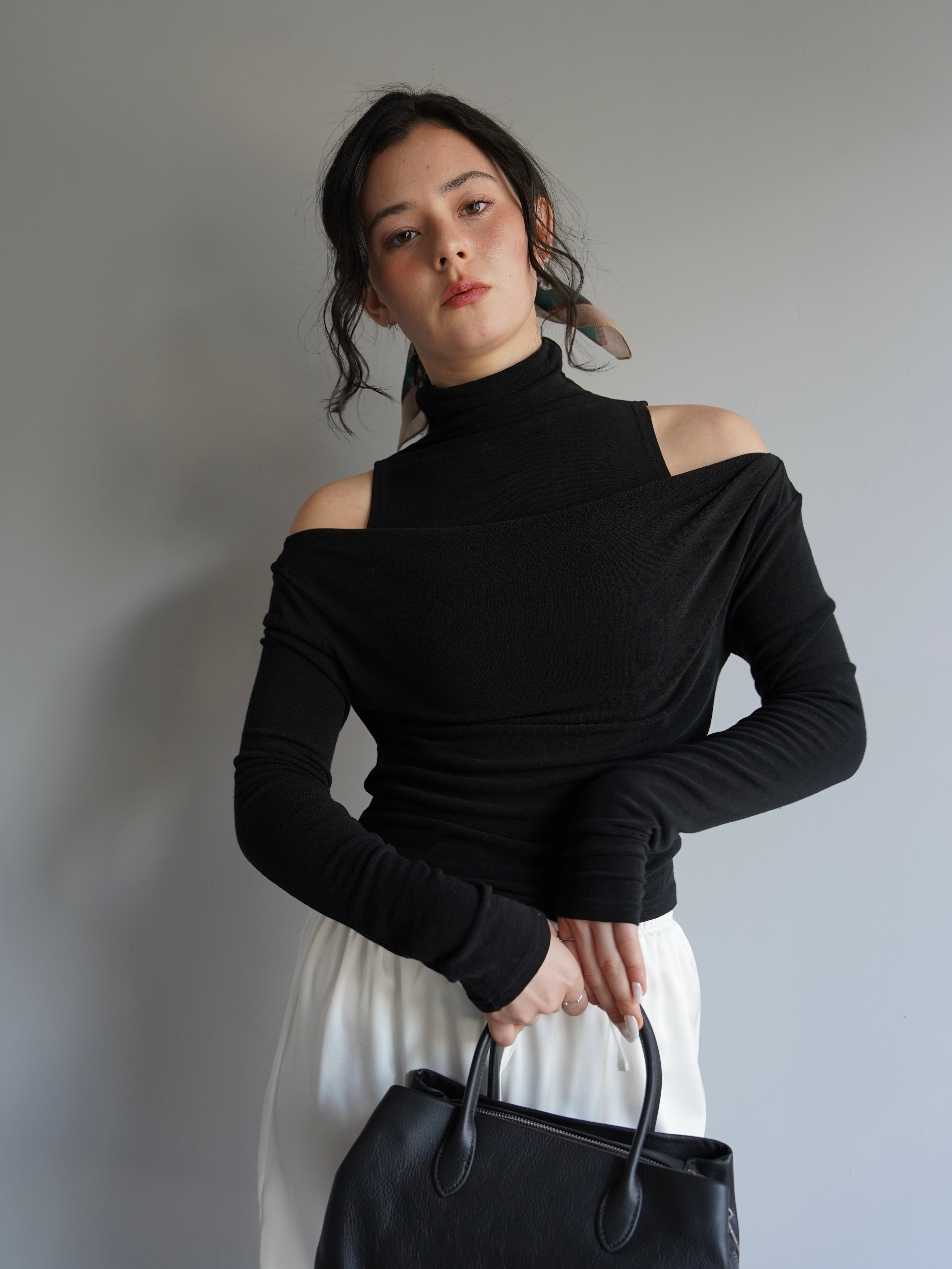 オフショルダーのトップスとタンクトップがセパレートになったデザインで、自然なドレープと奥行きのある首元を演出。