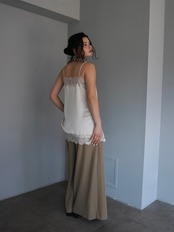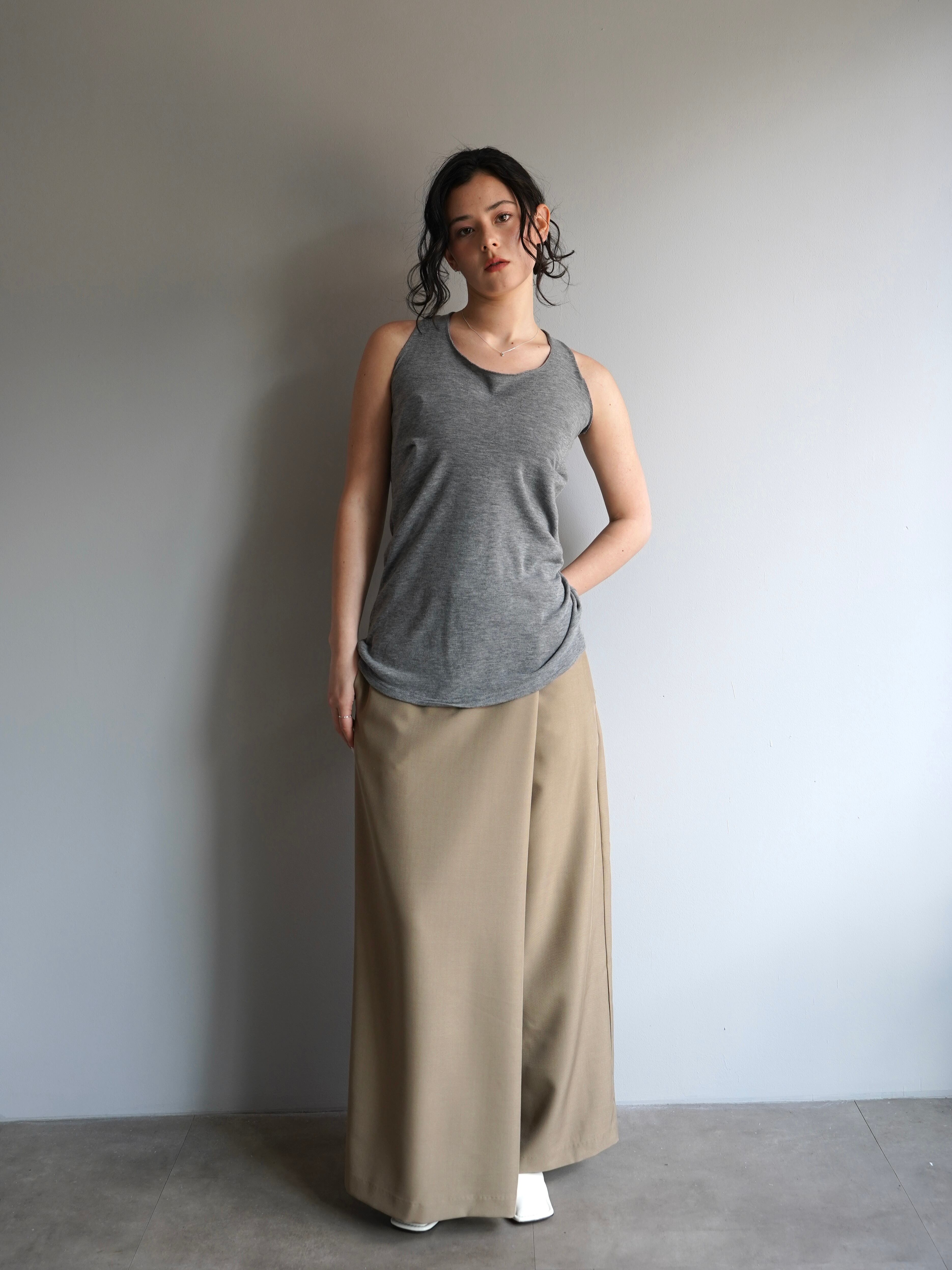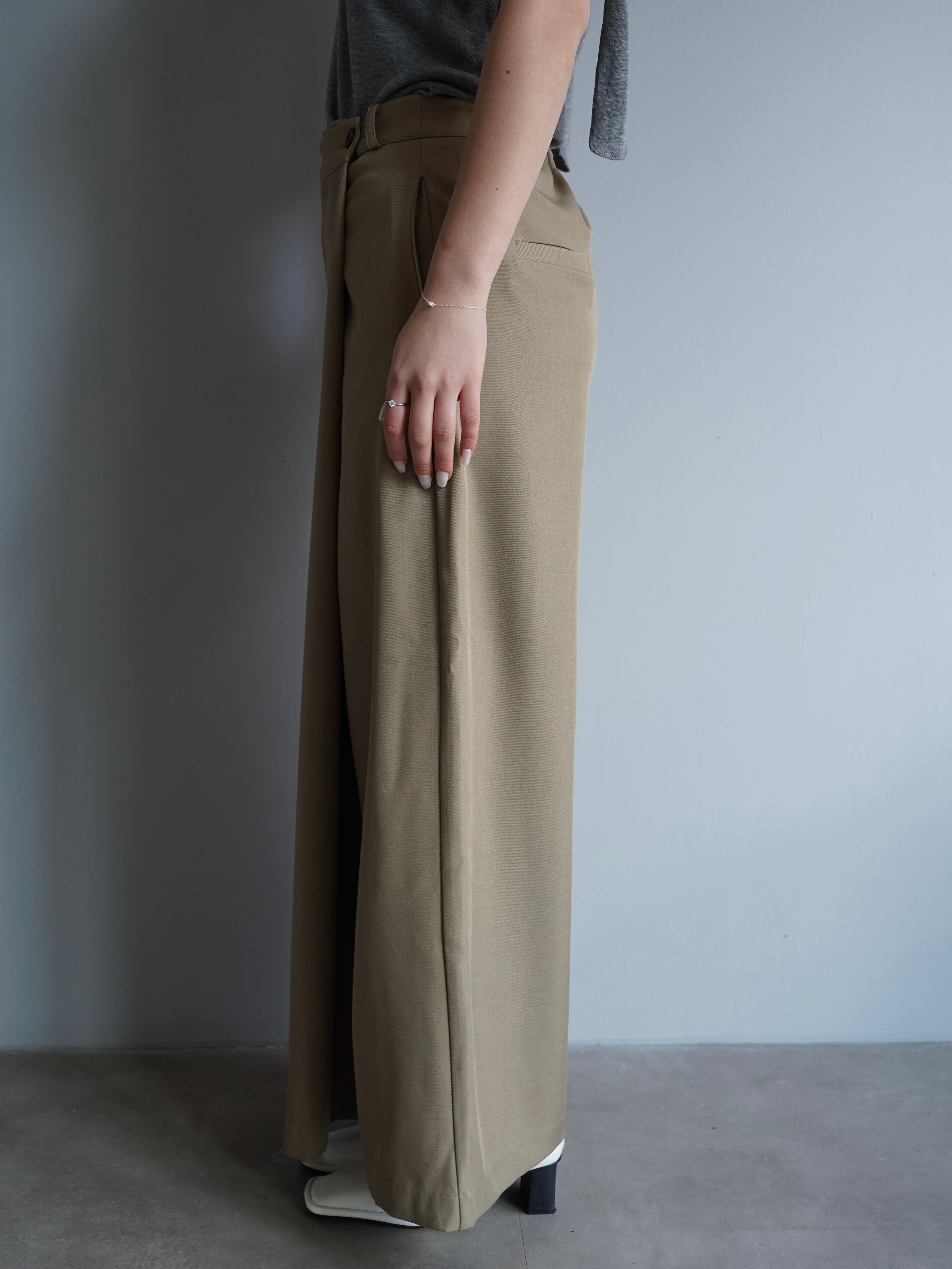フロントは生地を重ねた仕様で、歩くたびにスカートのような美しいシルエットを演出します。