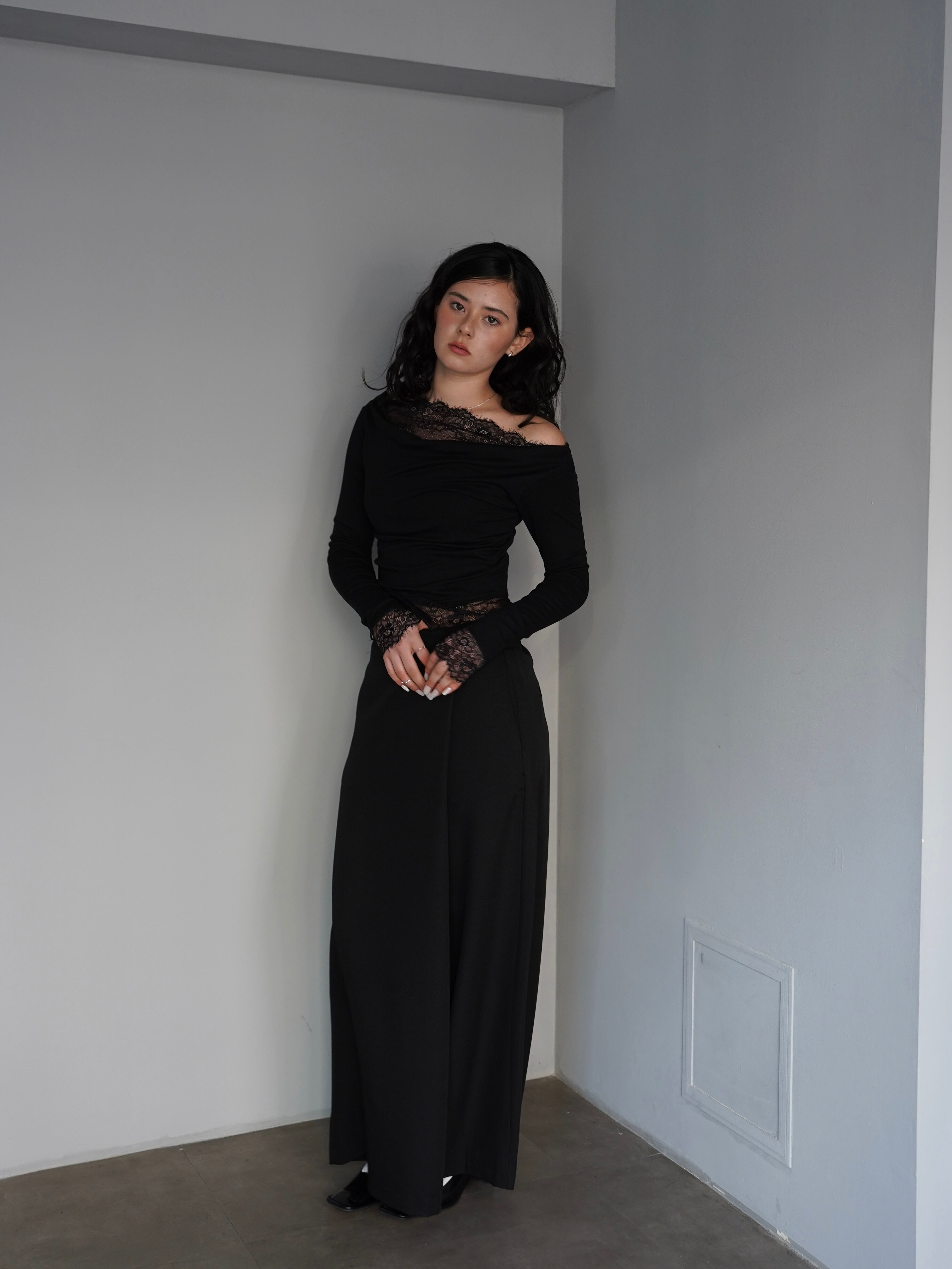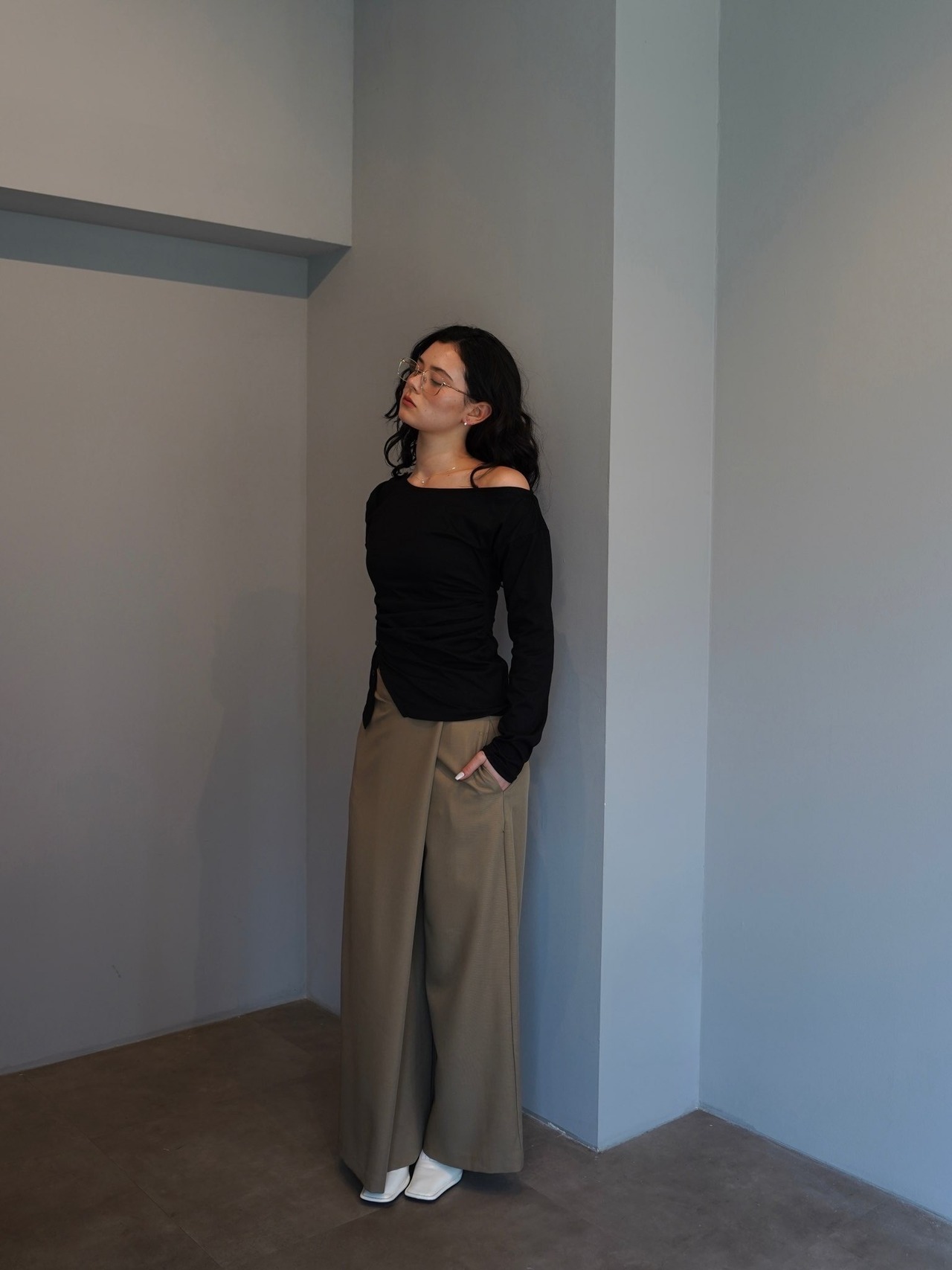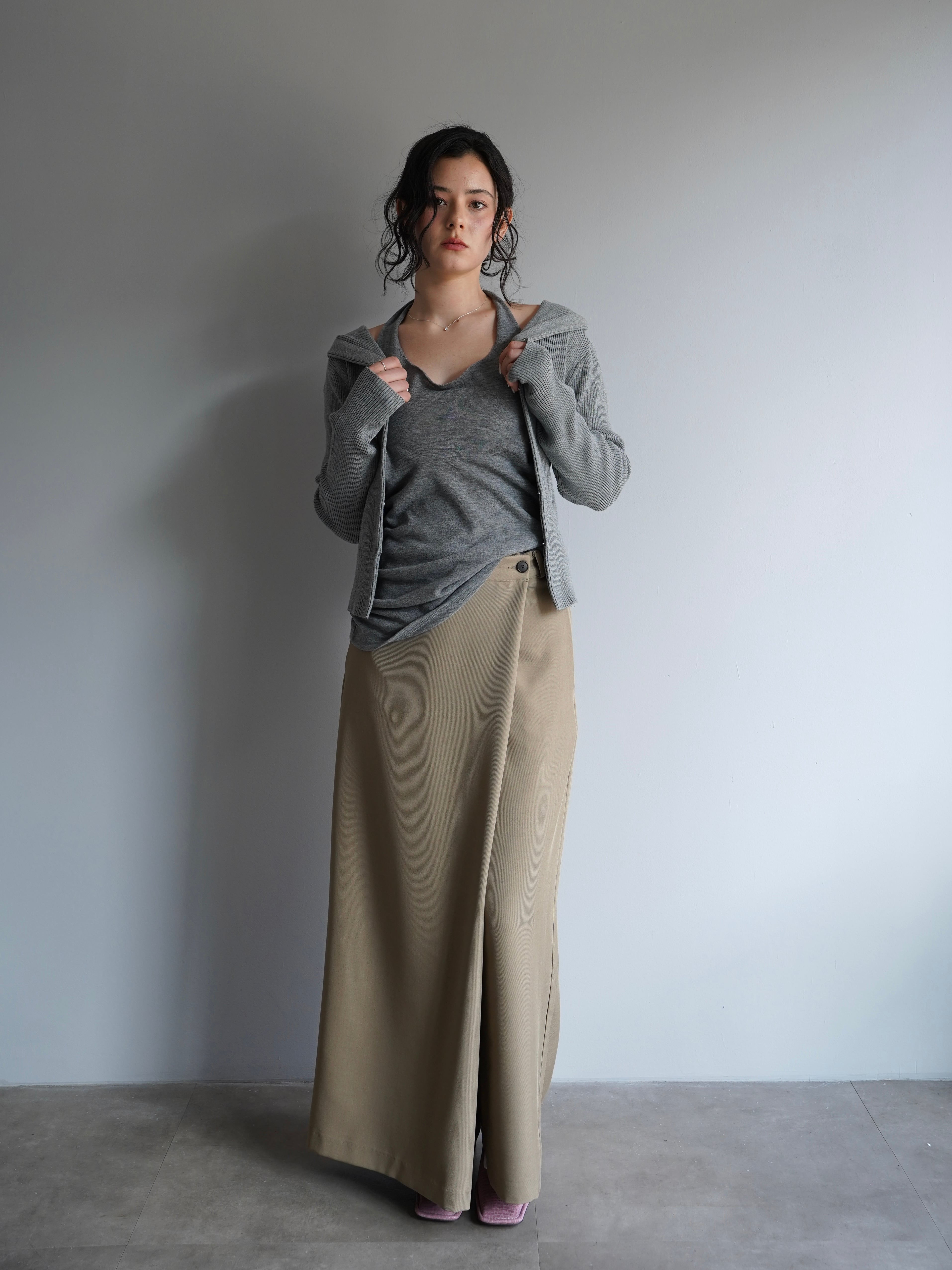 程よく落ち感のある素材が縦のラインを強調し、すっきりとした印象に仕上げてくれます。