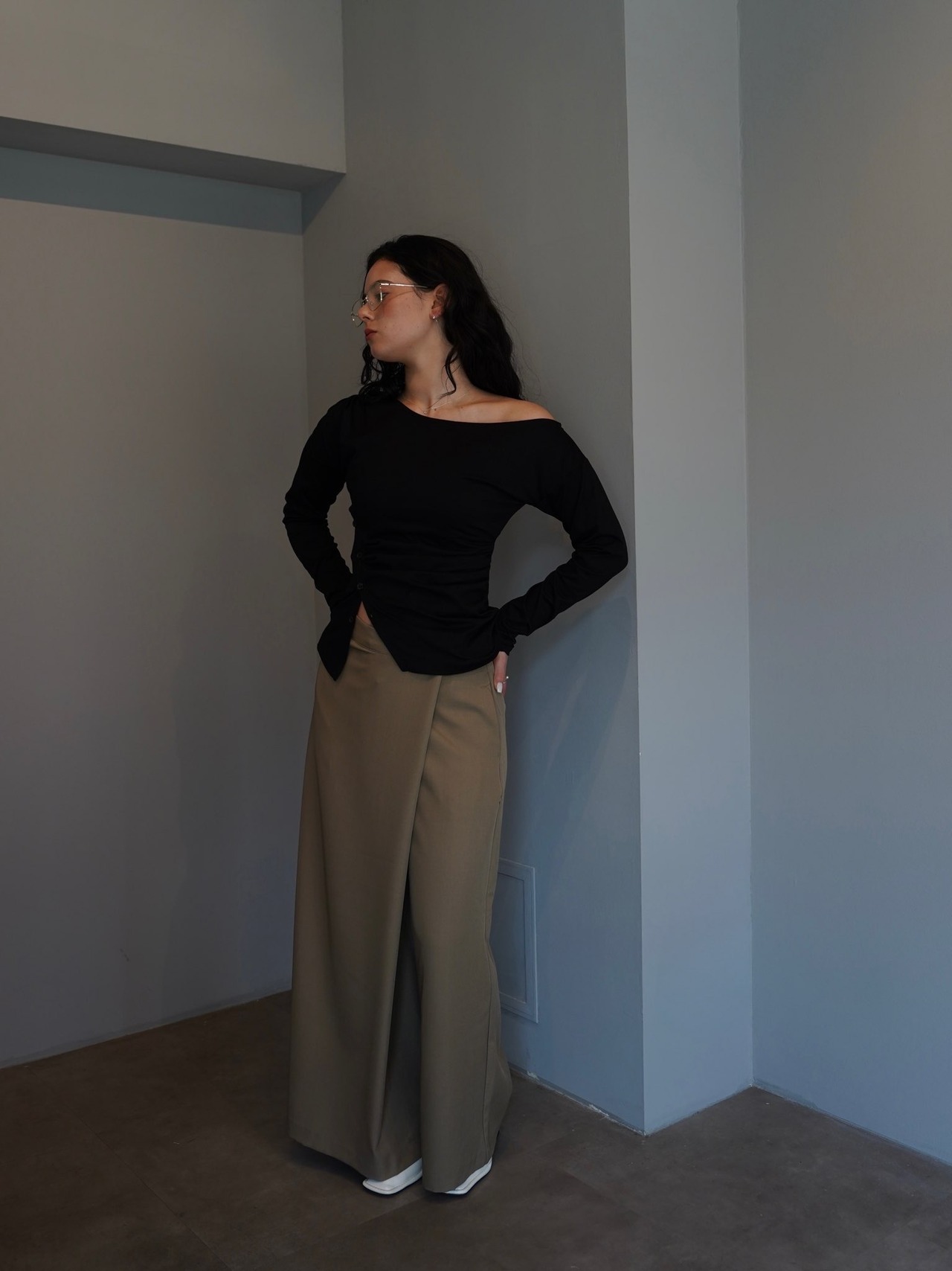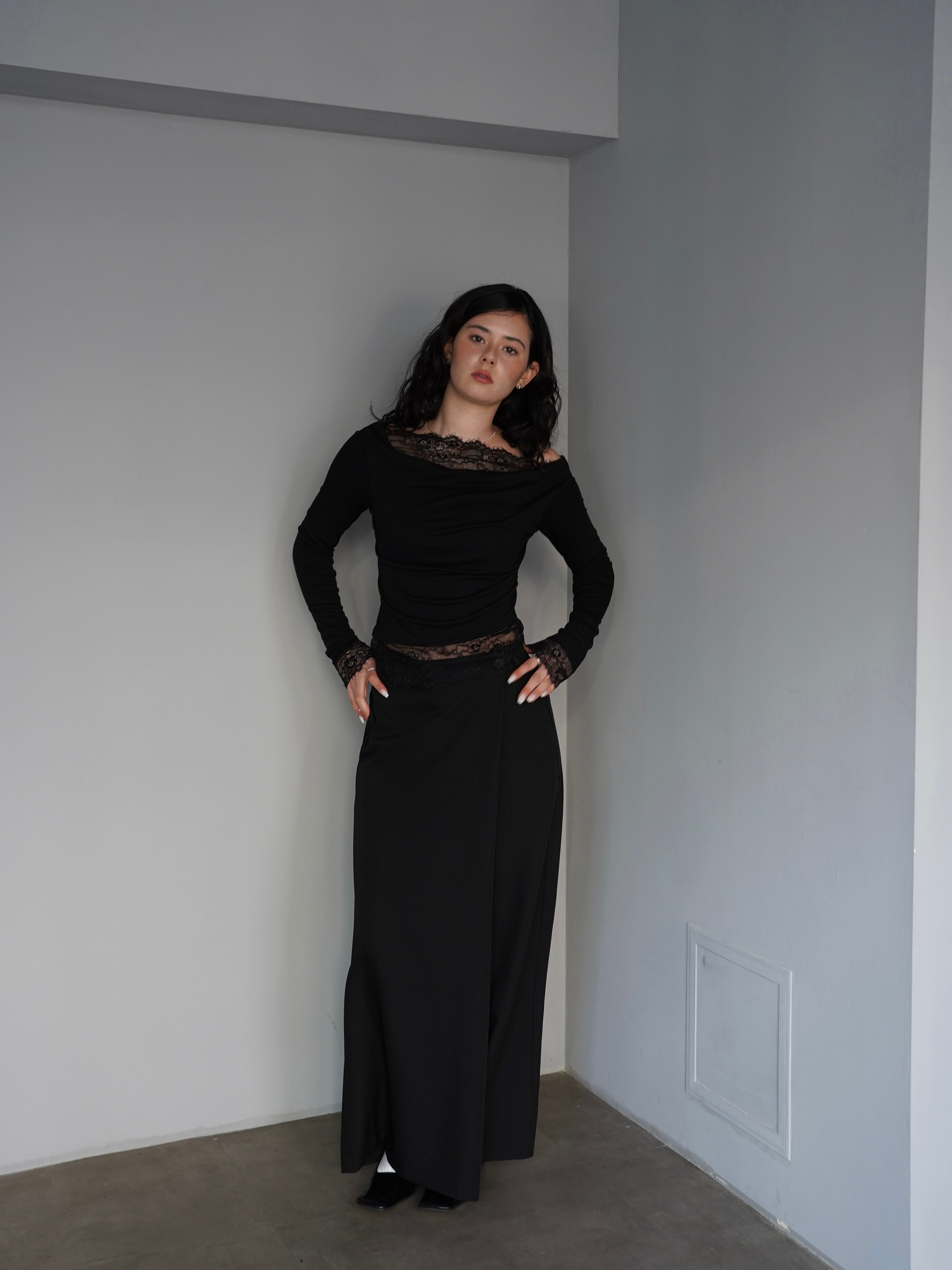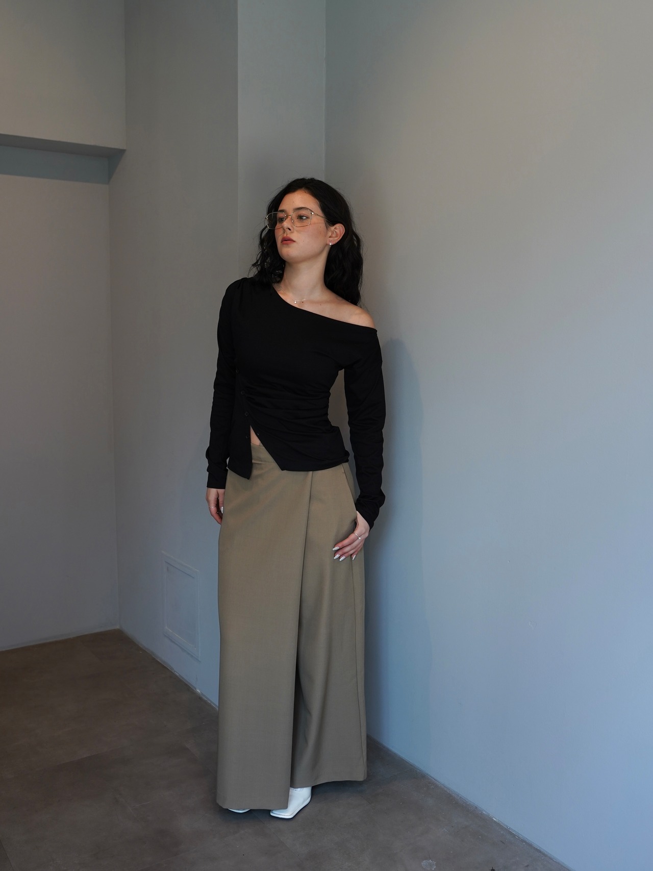 程よく落ち感のある素材が縦のラインを強調し、すっきりとした印象に仕上げてくれます。