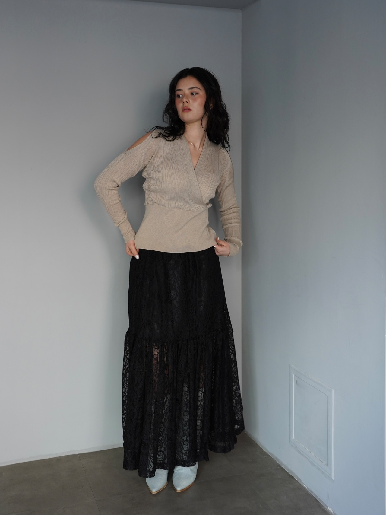 動くたびに揺れるレースが女性らしさを引き立て、シンプルなトップスと合わせるだけでも印象的なスタイルが完成します。