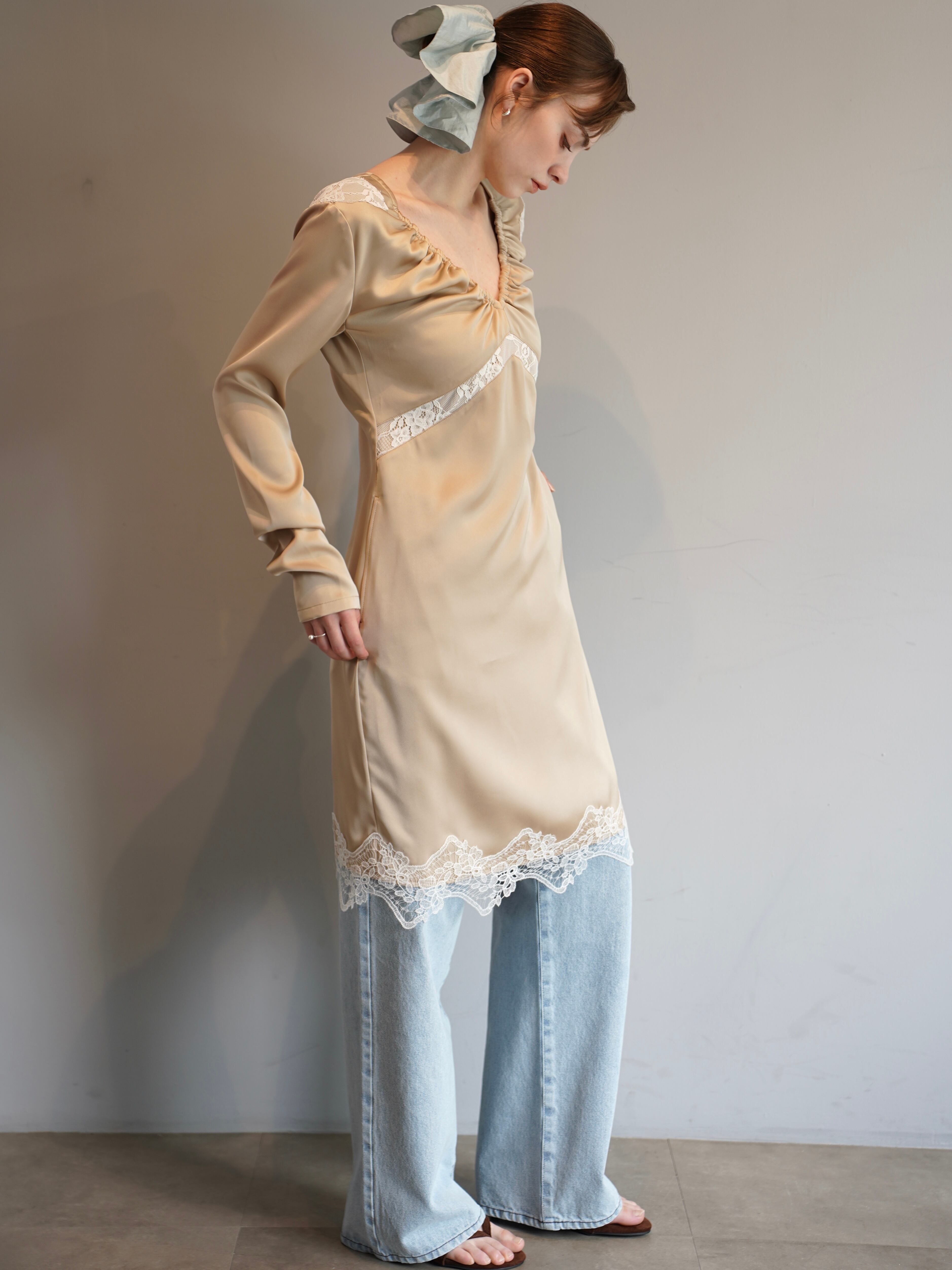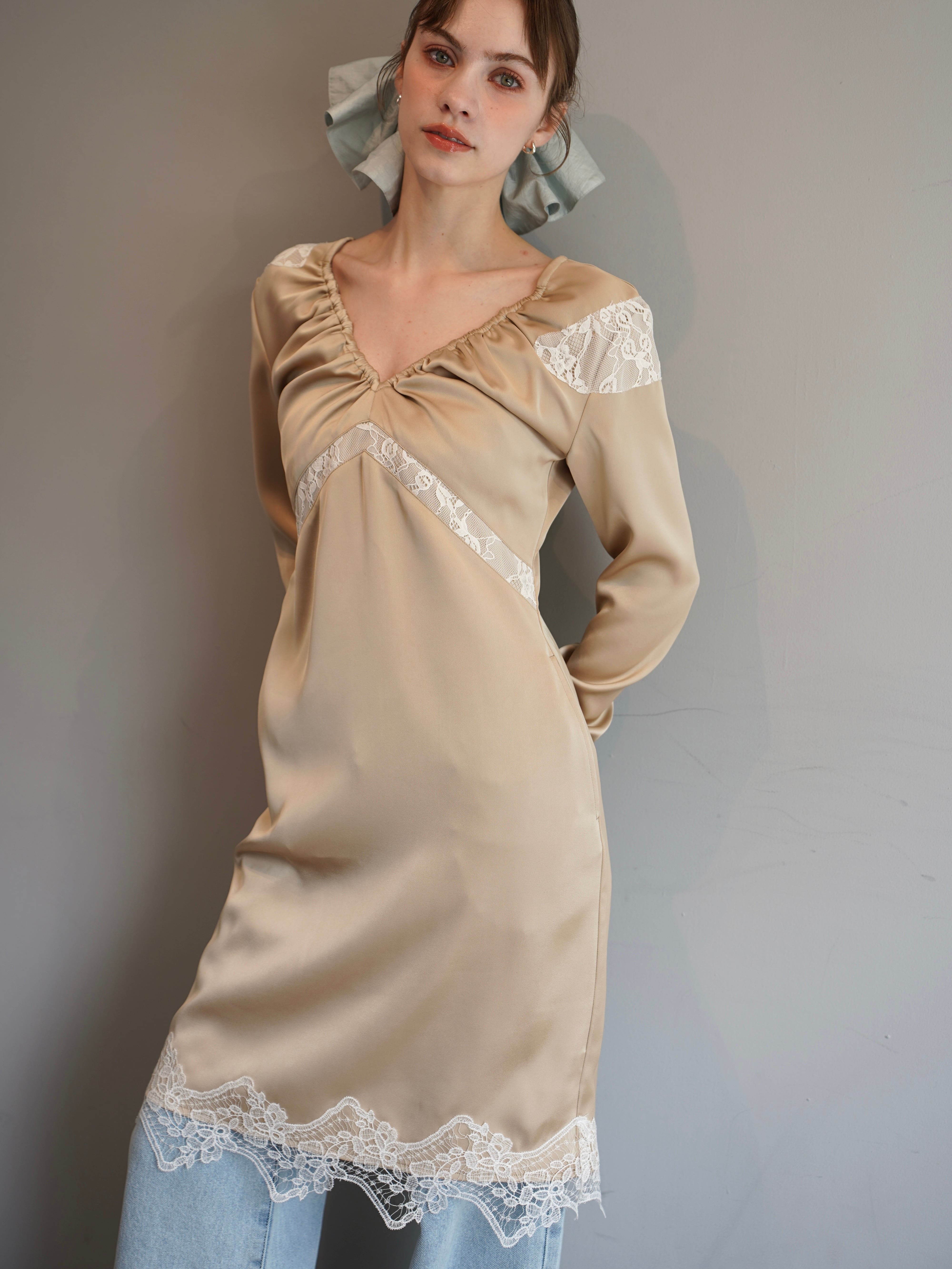 深すぎないVネックと、繊細なギャザー。