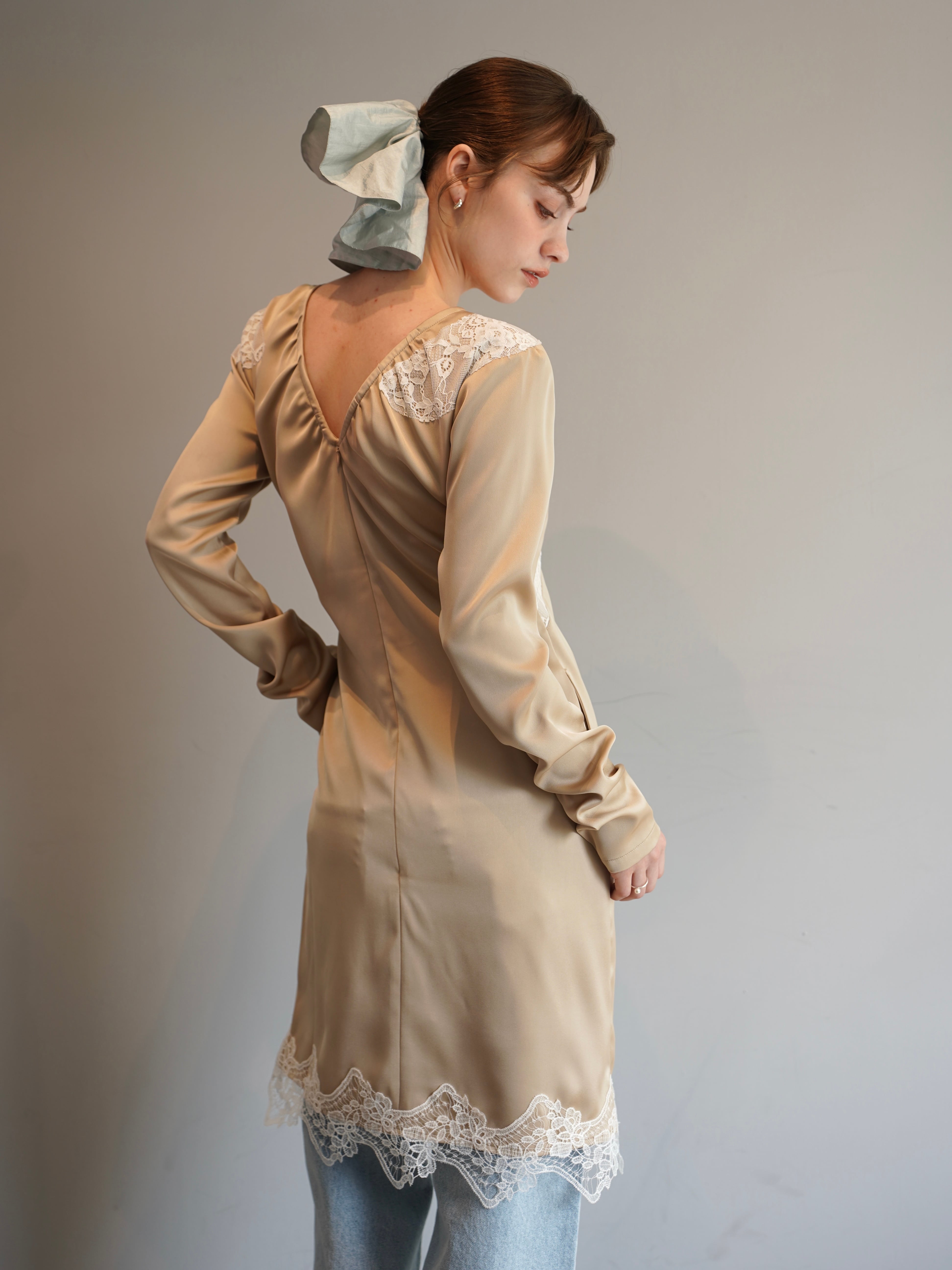 胸元と裾にあしらったレースが、静かにロマンを添える。