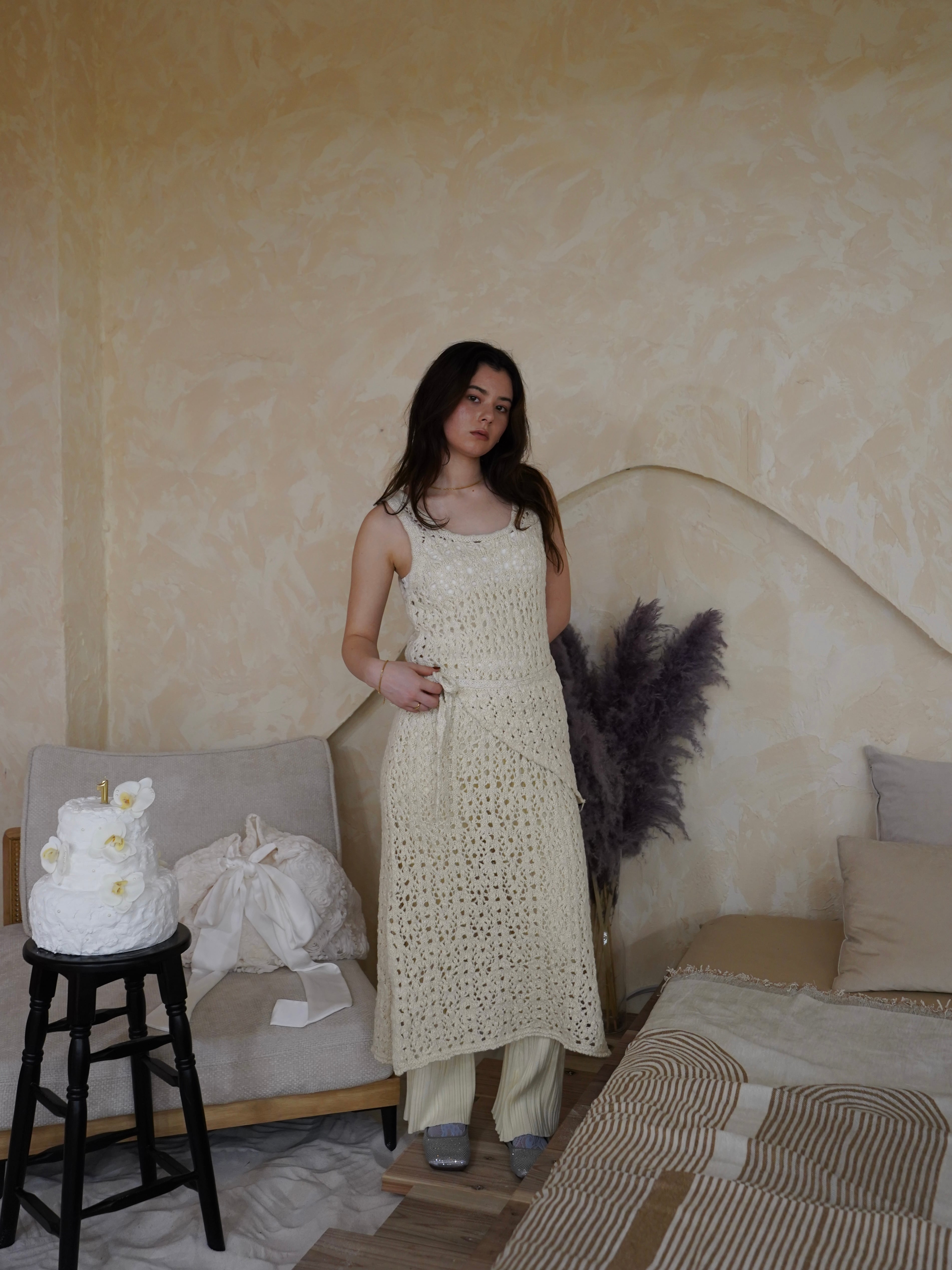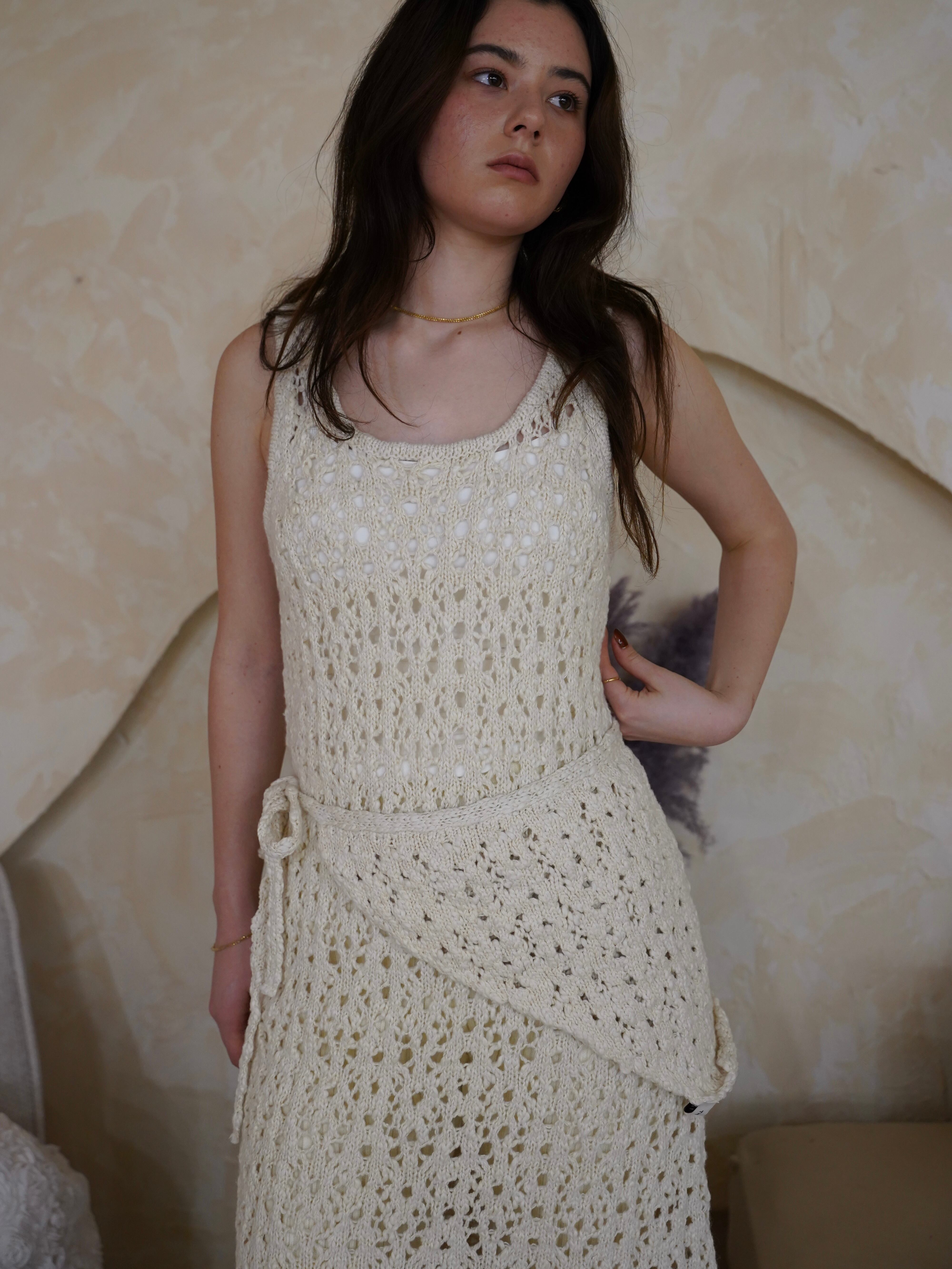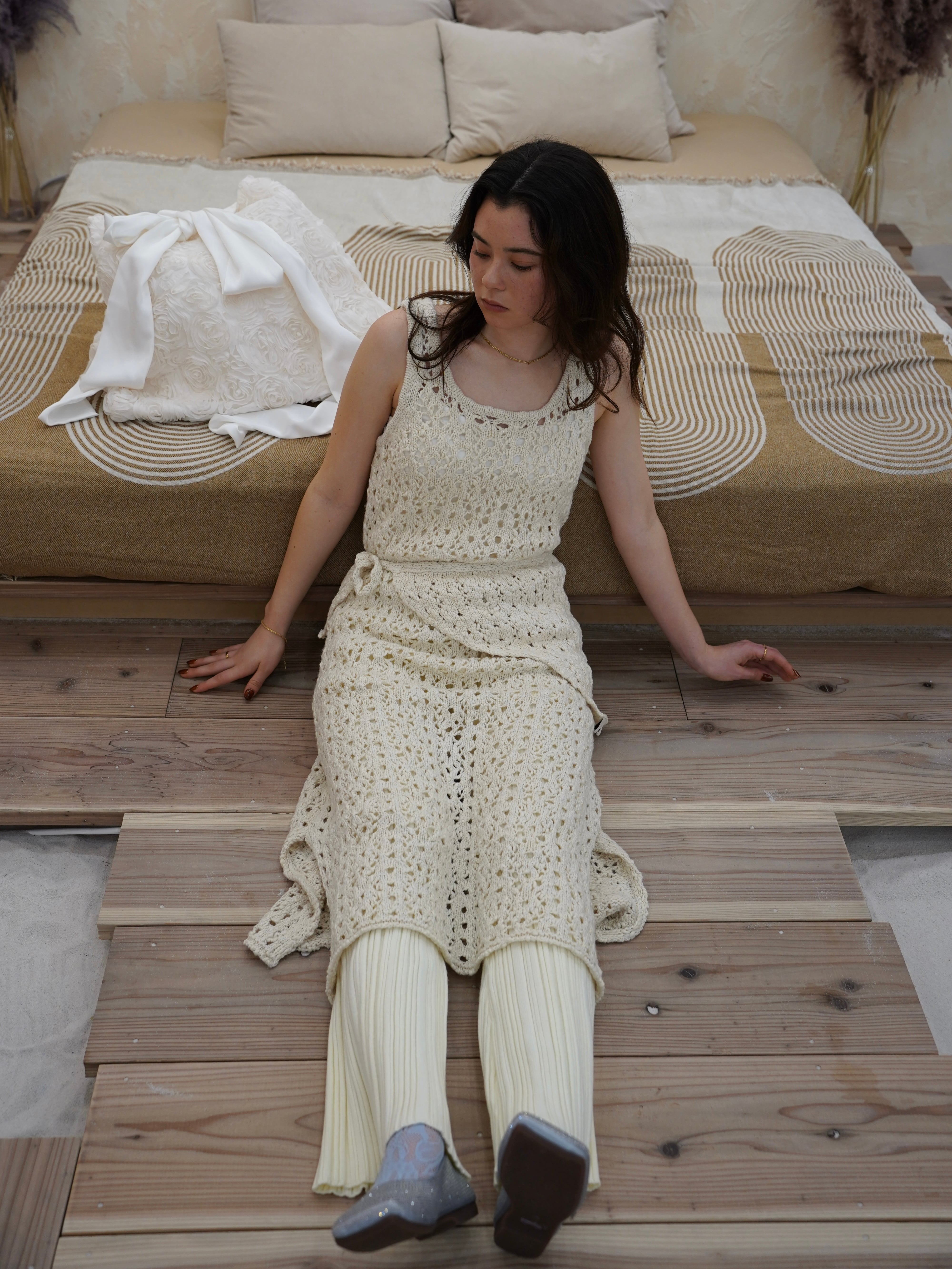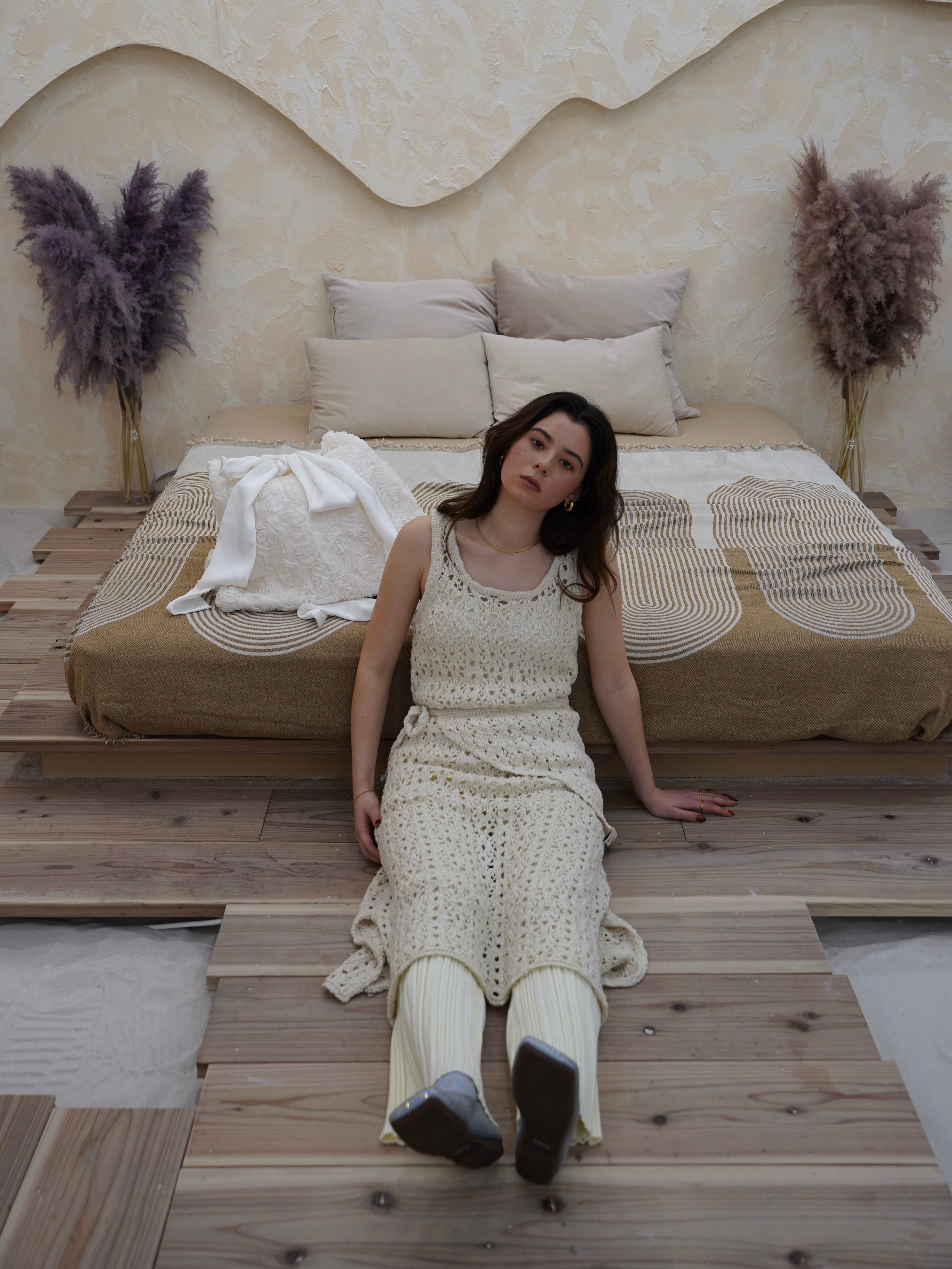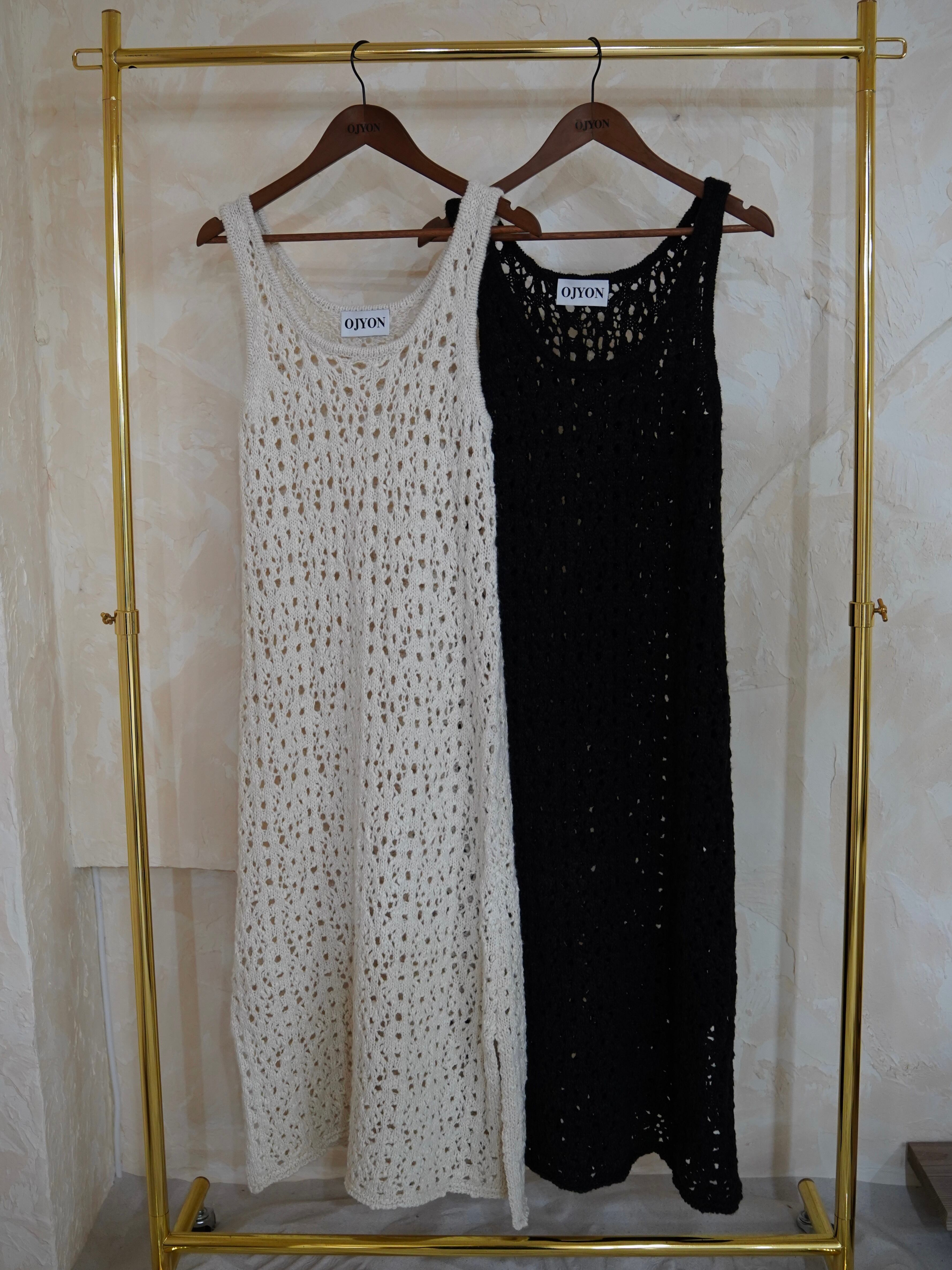 しっかりとした重みのある素材感が特徴で、着るだけで存在感がありつつも、涼しげで通気性の良い編み方が施されています。