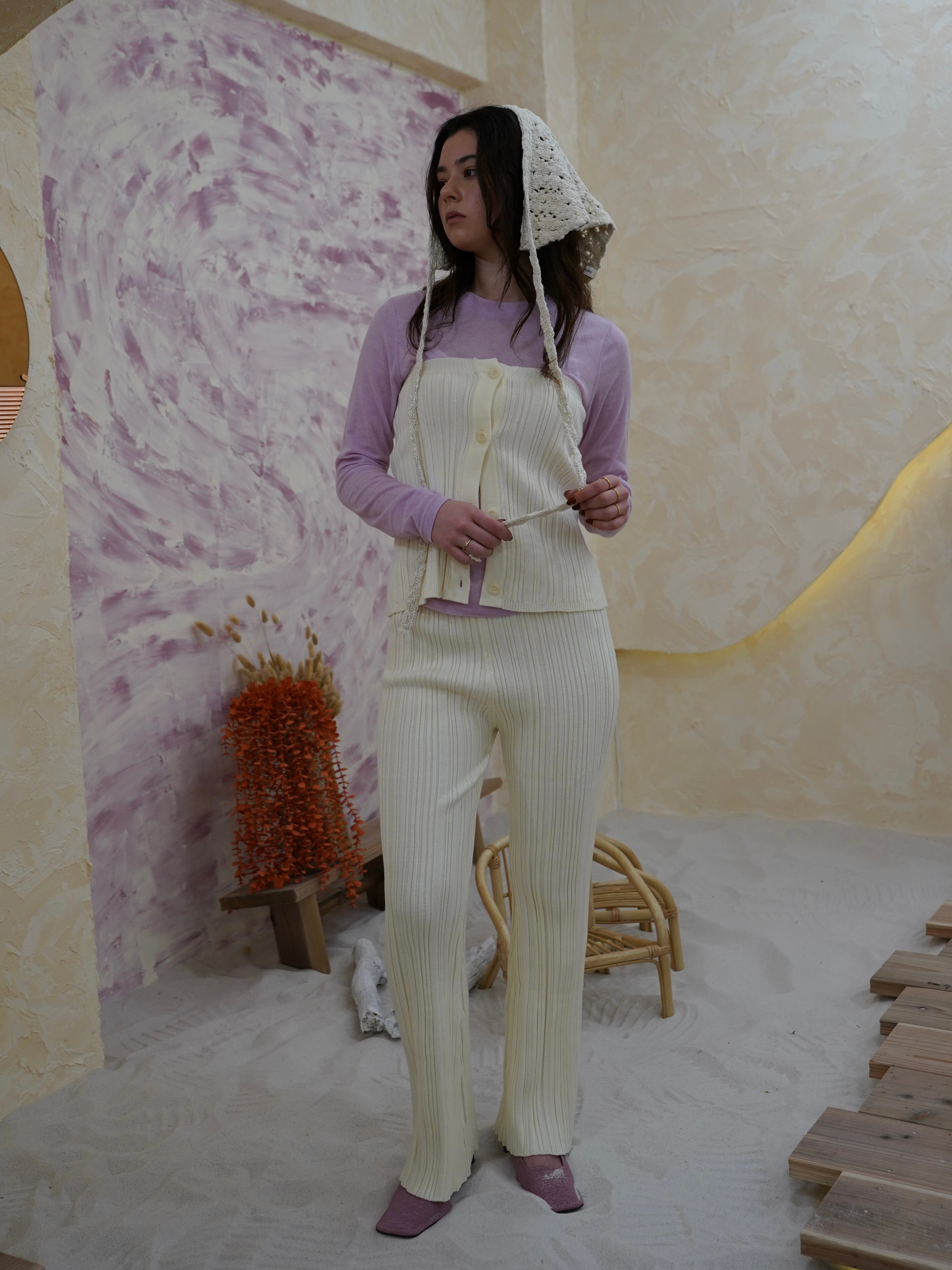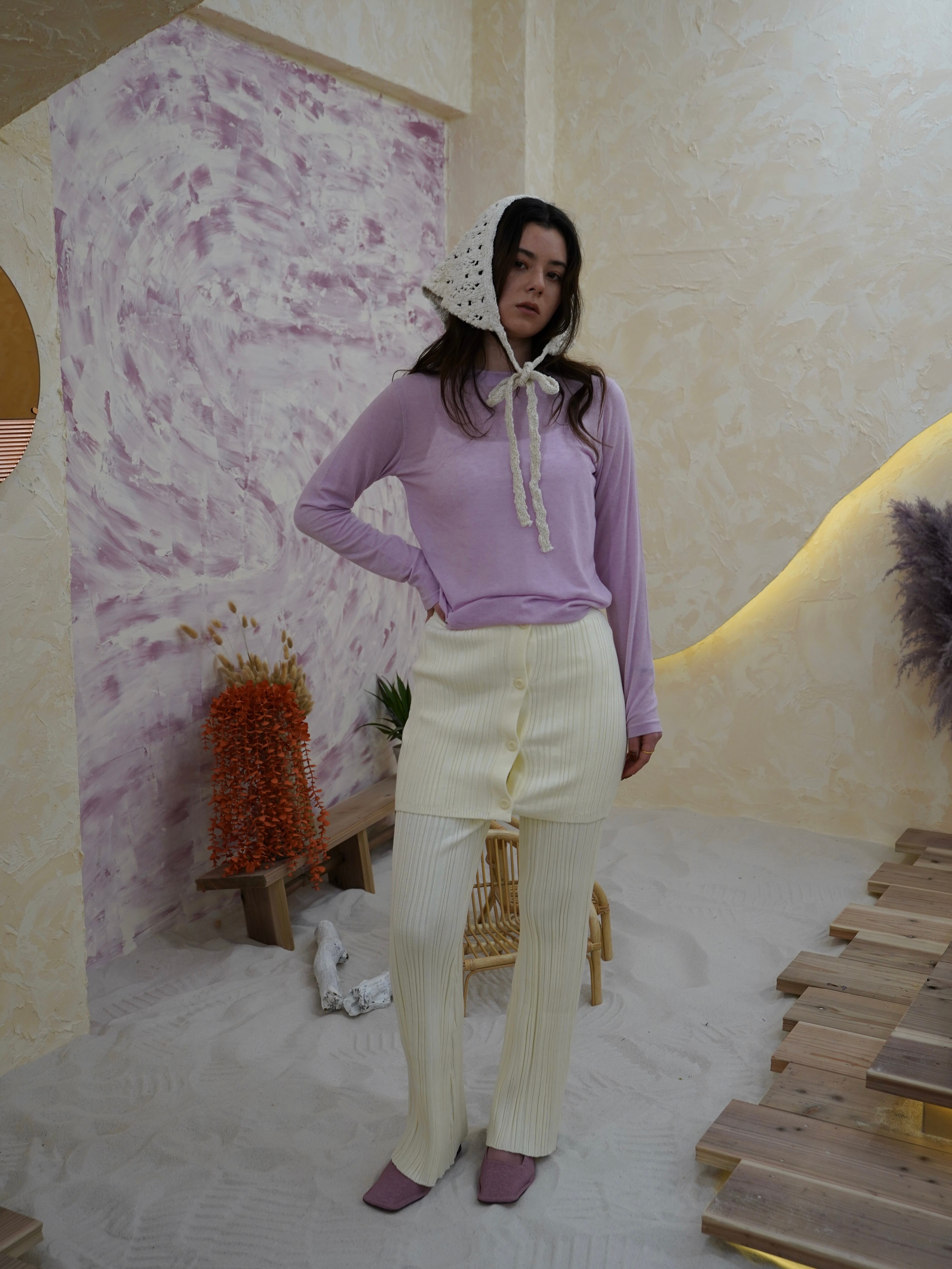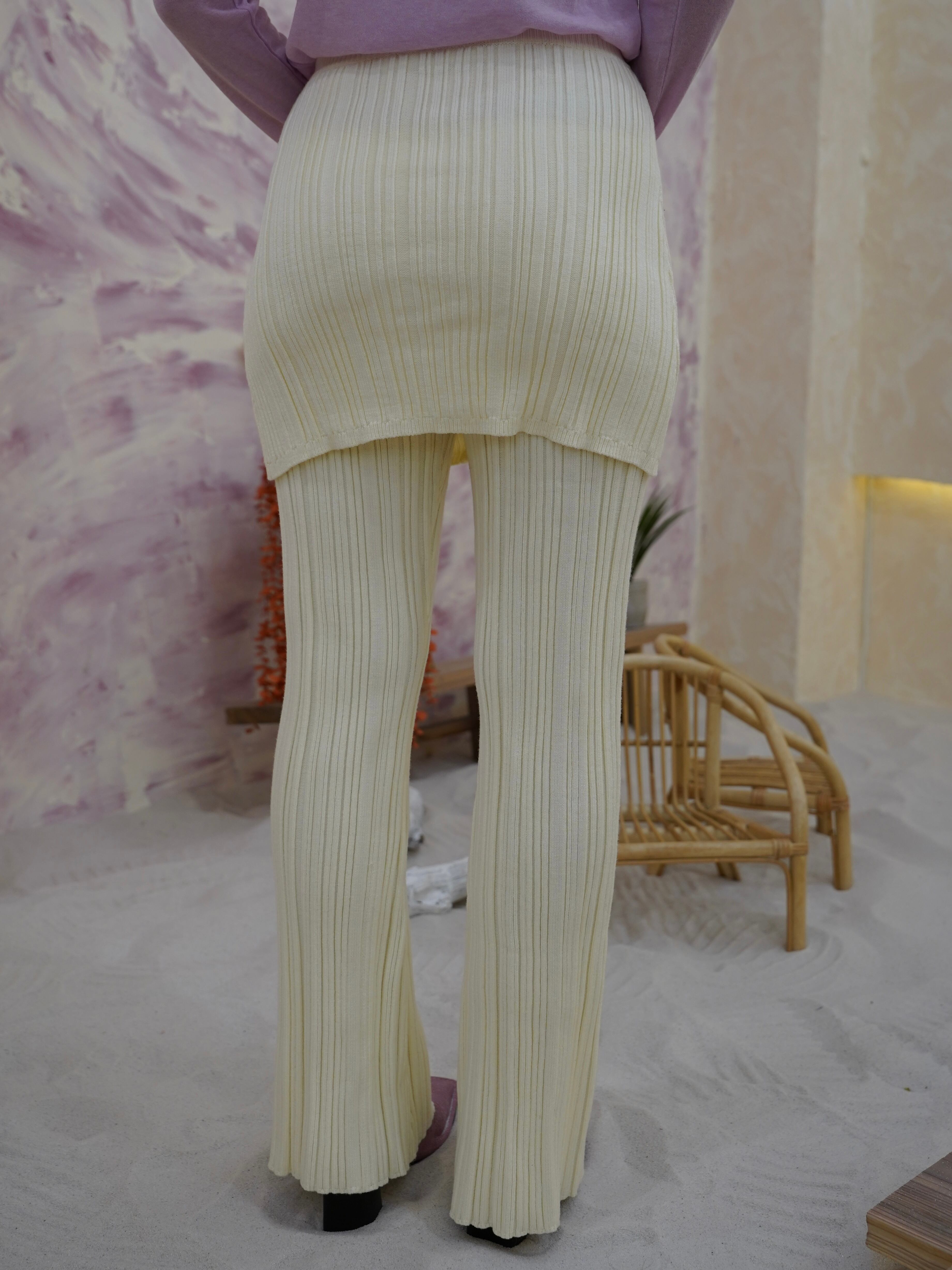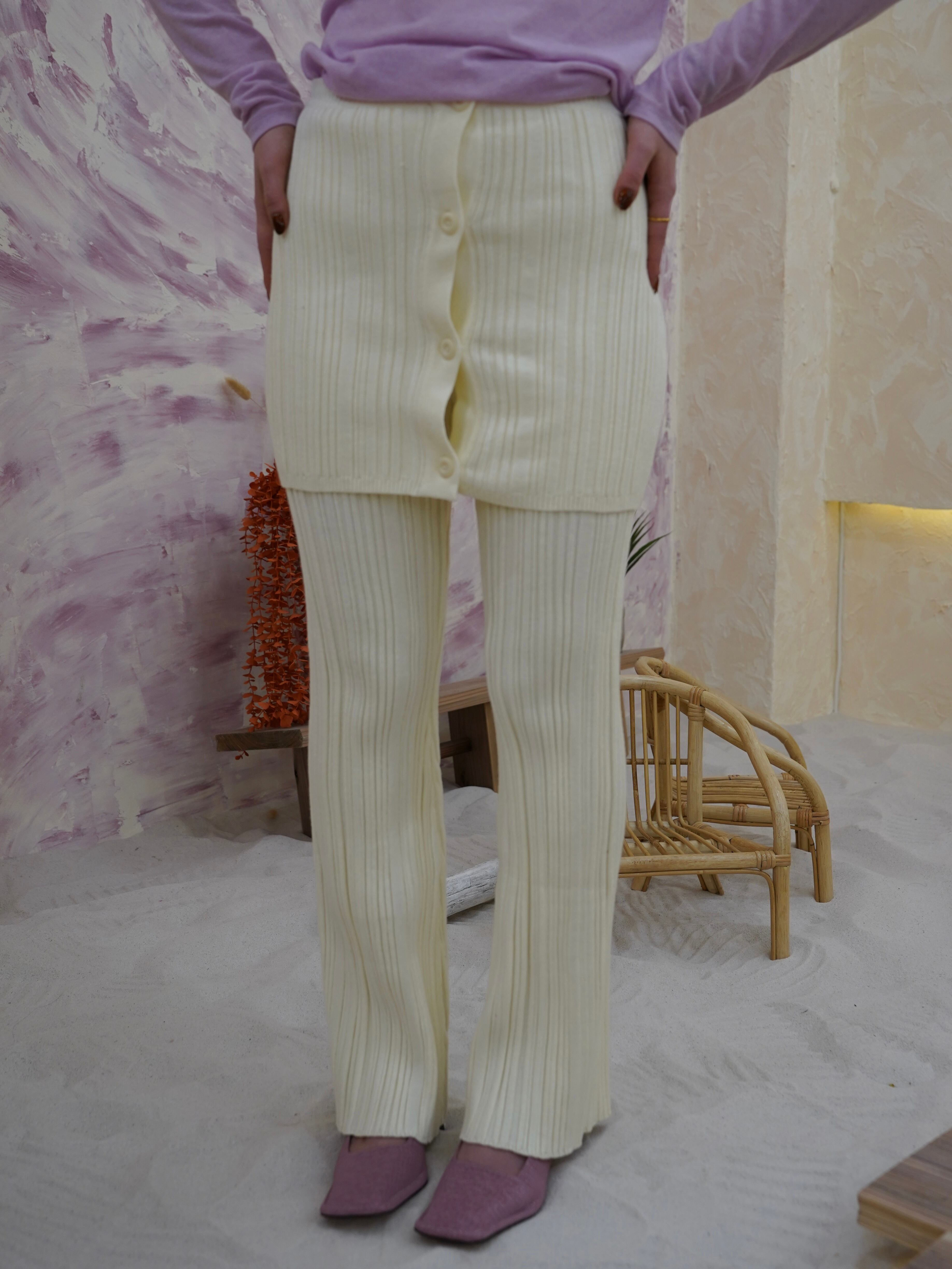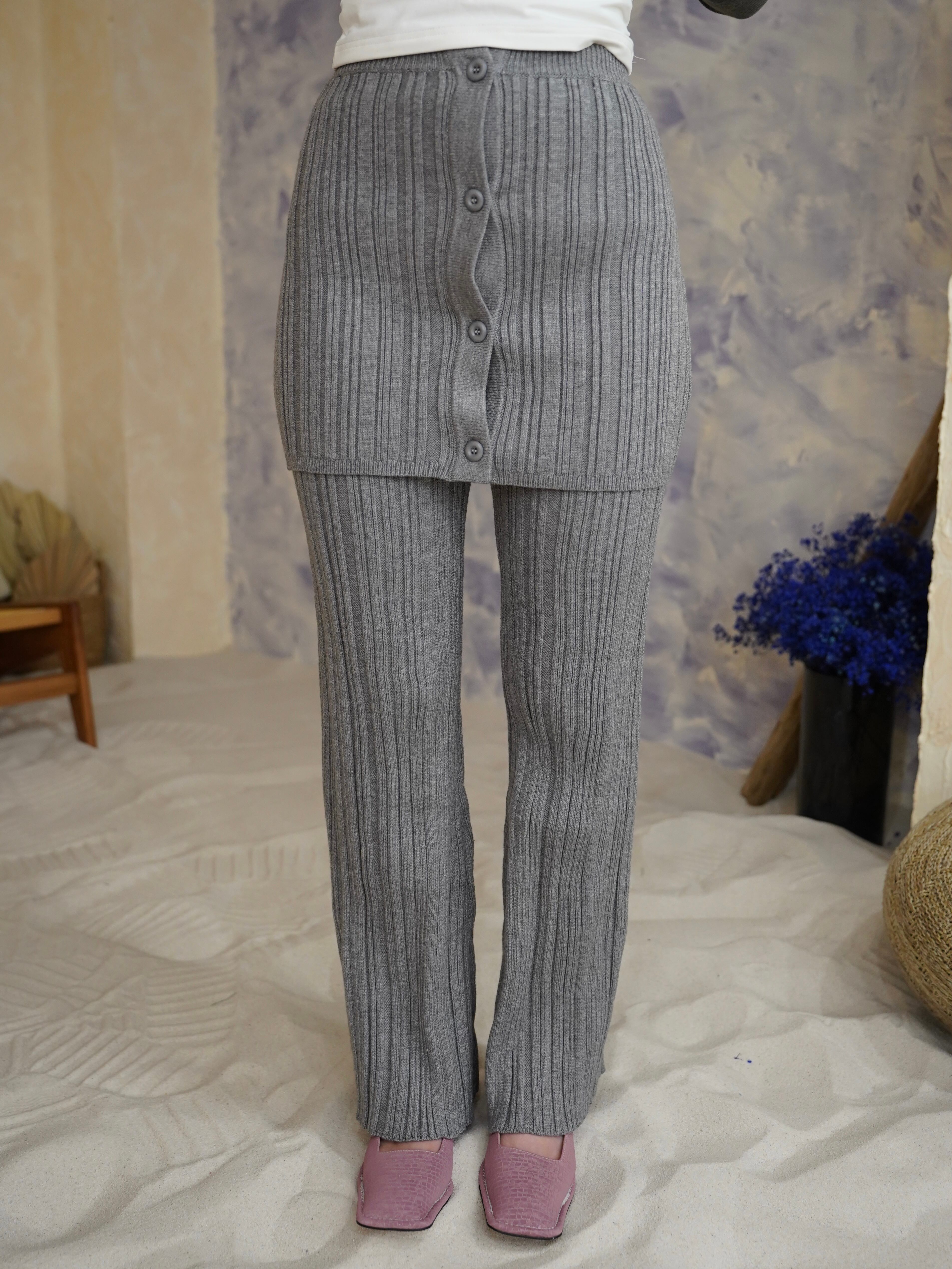 スカート付きニットパンツは、縦ラインのデザインが特徴的で、スタイルアップ効果があります。
