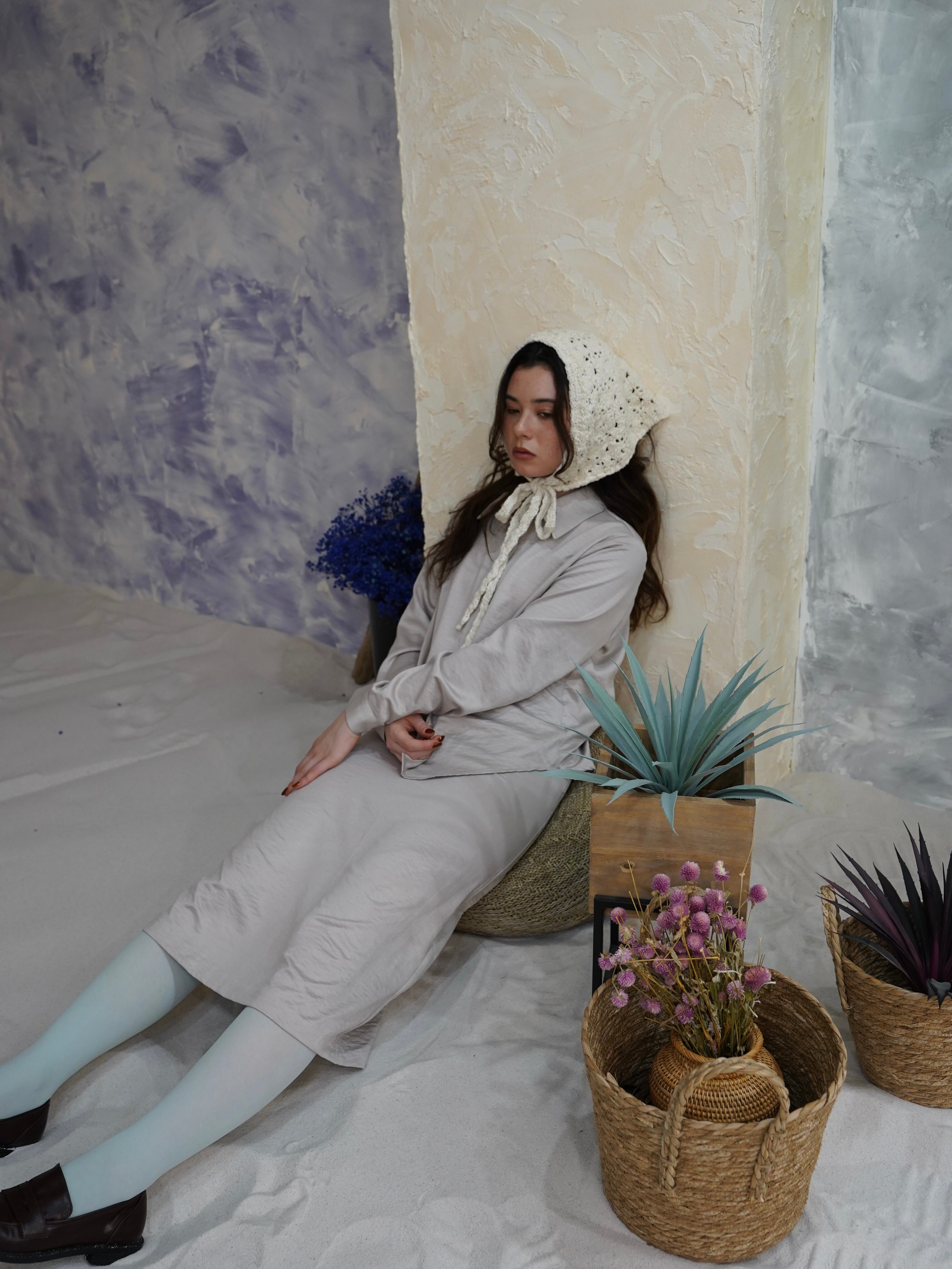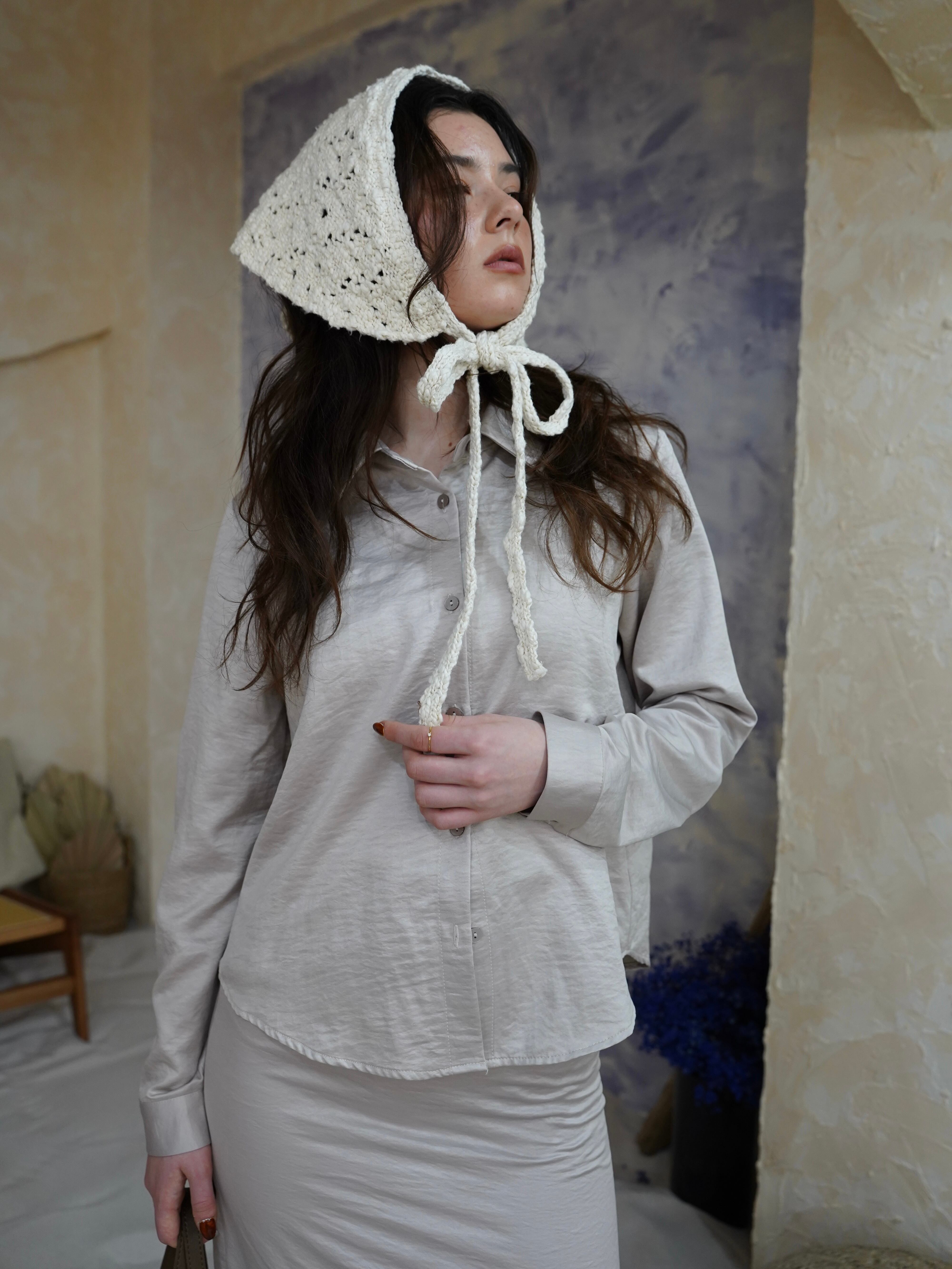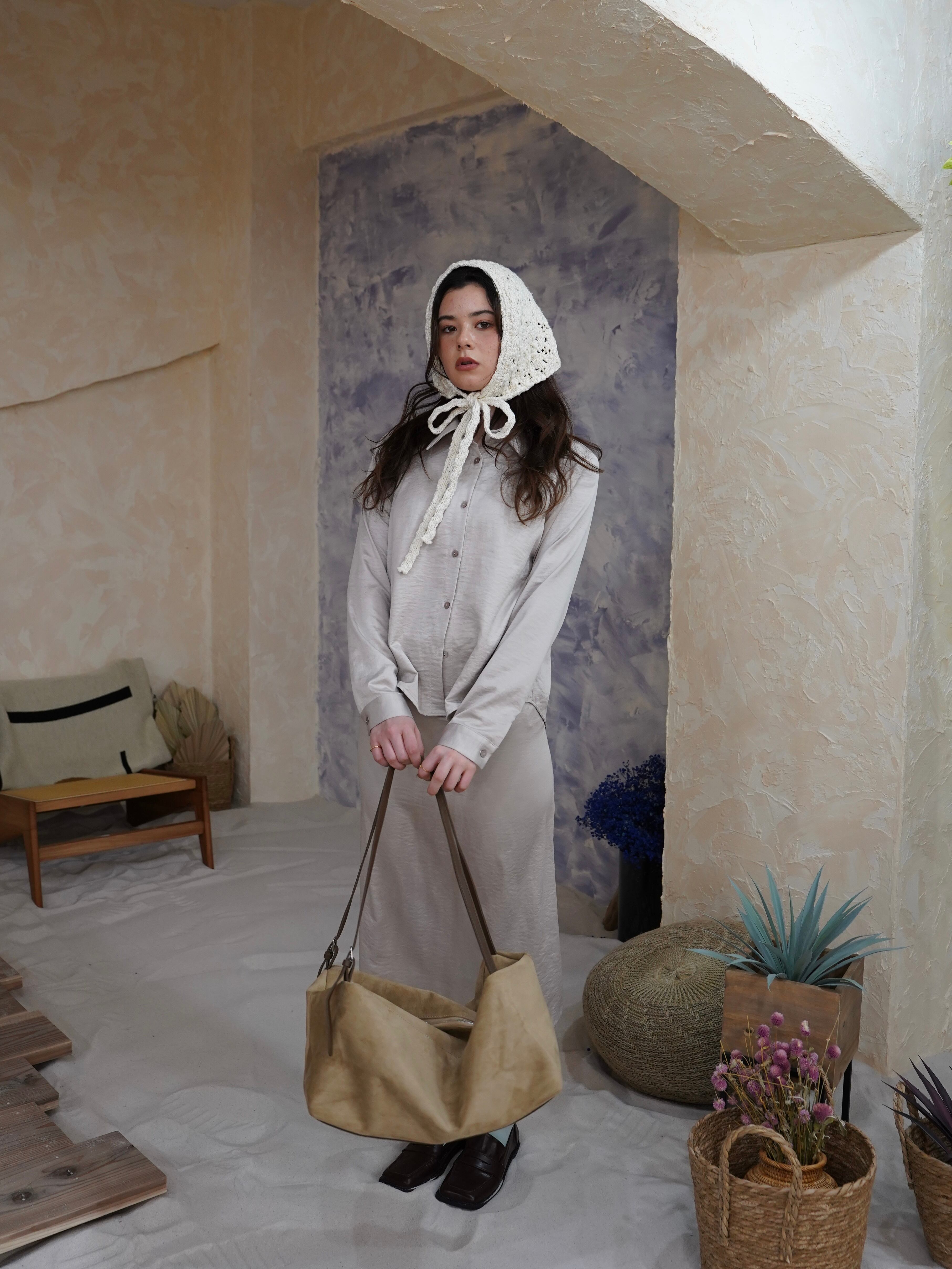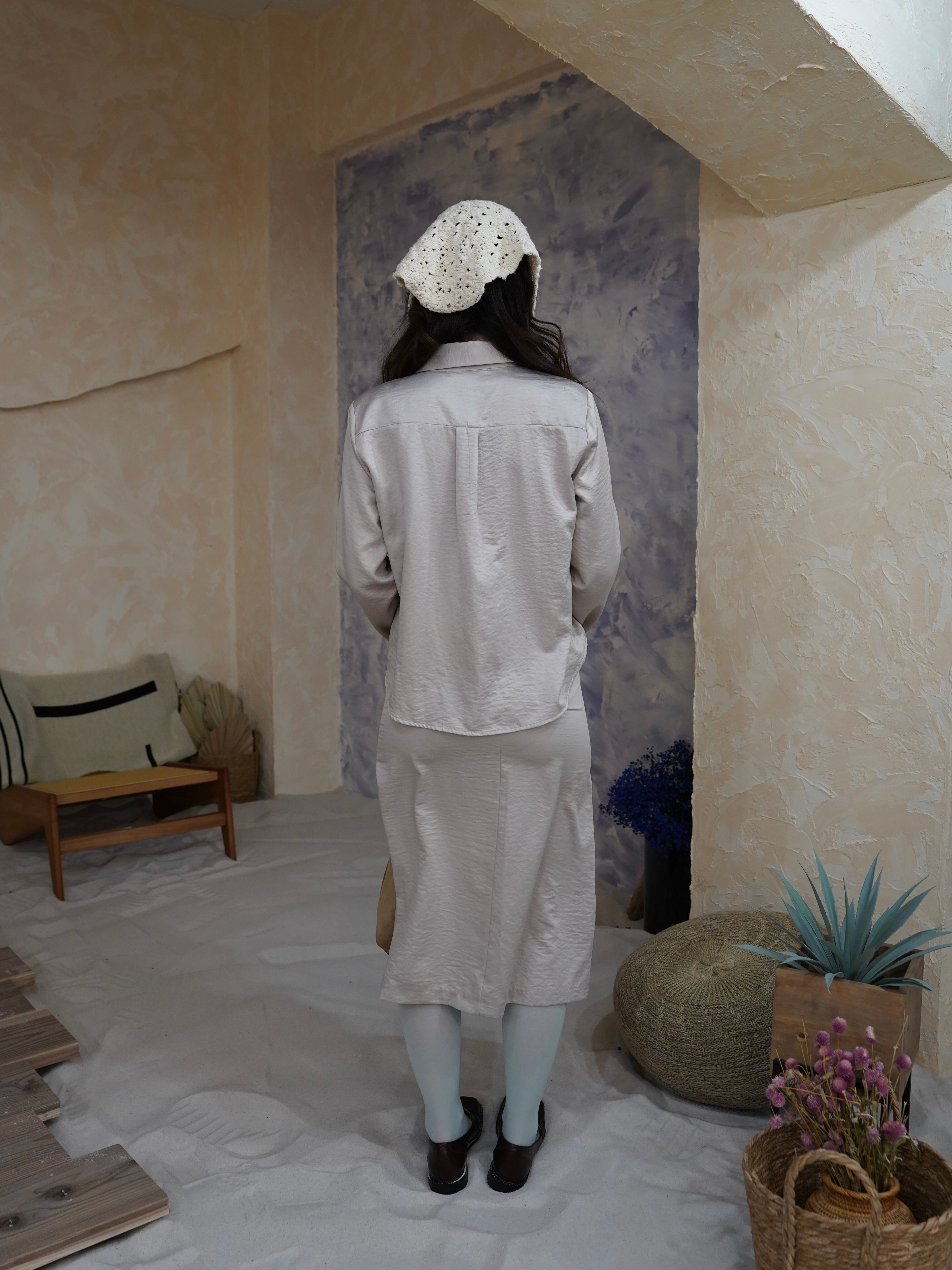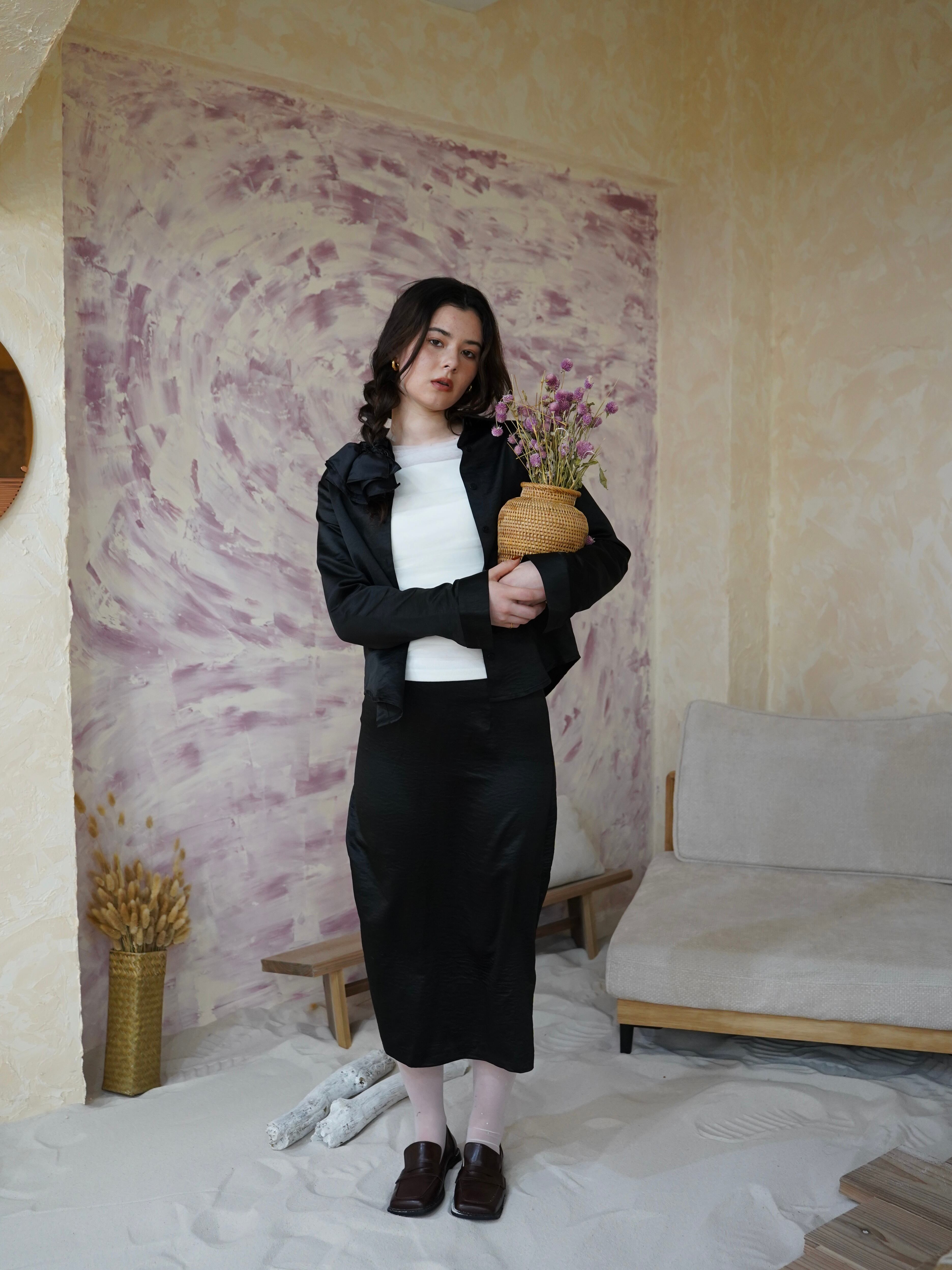 サテン素材のセットアップ、シャツとミディアムスカートは、エレガントで洗練された印象を与えるアイテムです。サテンの光沢感が華やかさを引き立て、上品で少しラグジュアリーな雰囲気が漂います。