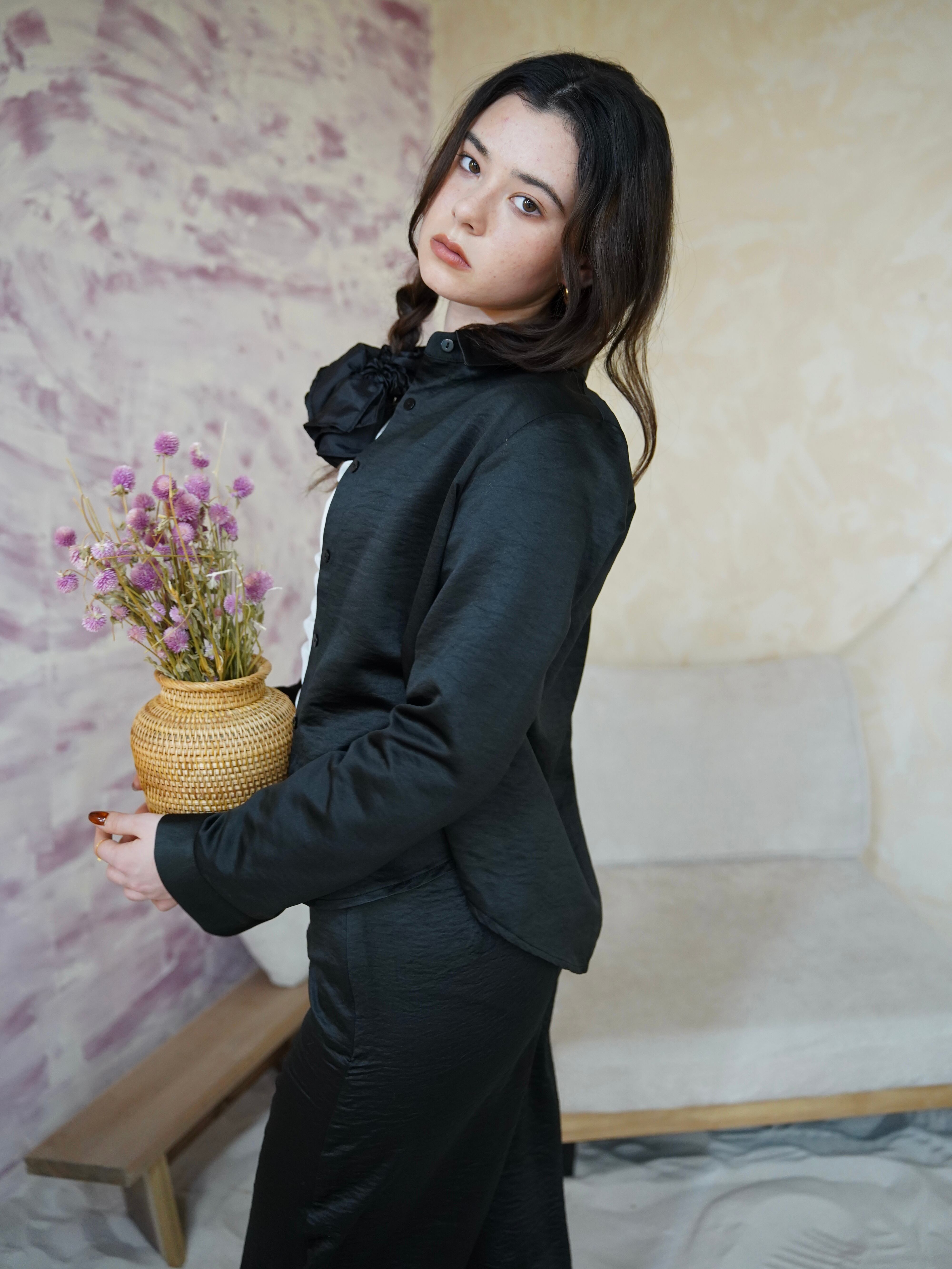 このセットアップは、オフィスやパーティー、ちょっとしたフォーマルな場面にもぴったり。シンプルなアクセサリーを合わせるだけで、洗練されたスタイルに仕上がります。シャツのボタンを少し開けて抜け感を出すのもおすすめで、サテンの艶感がより引き立ちます。