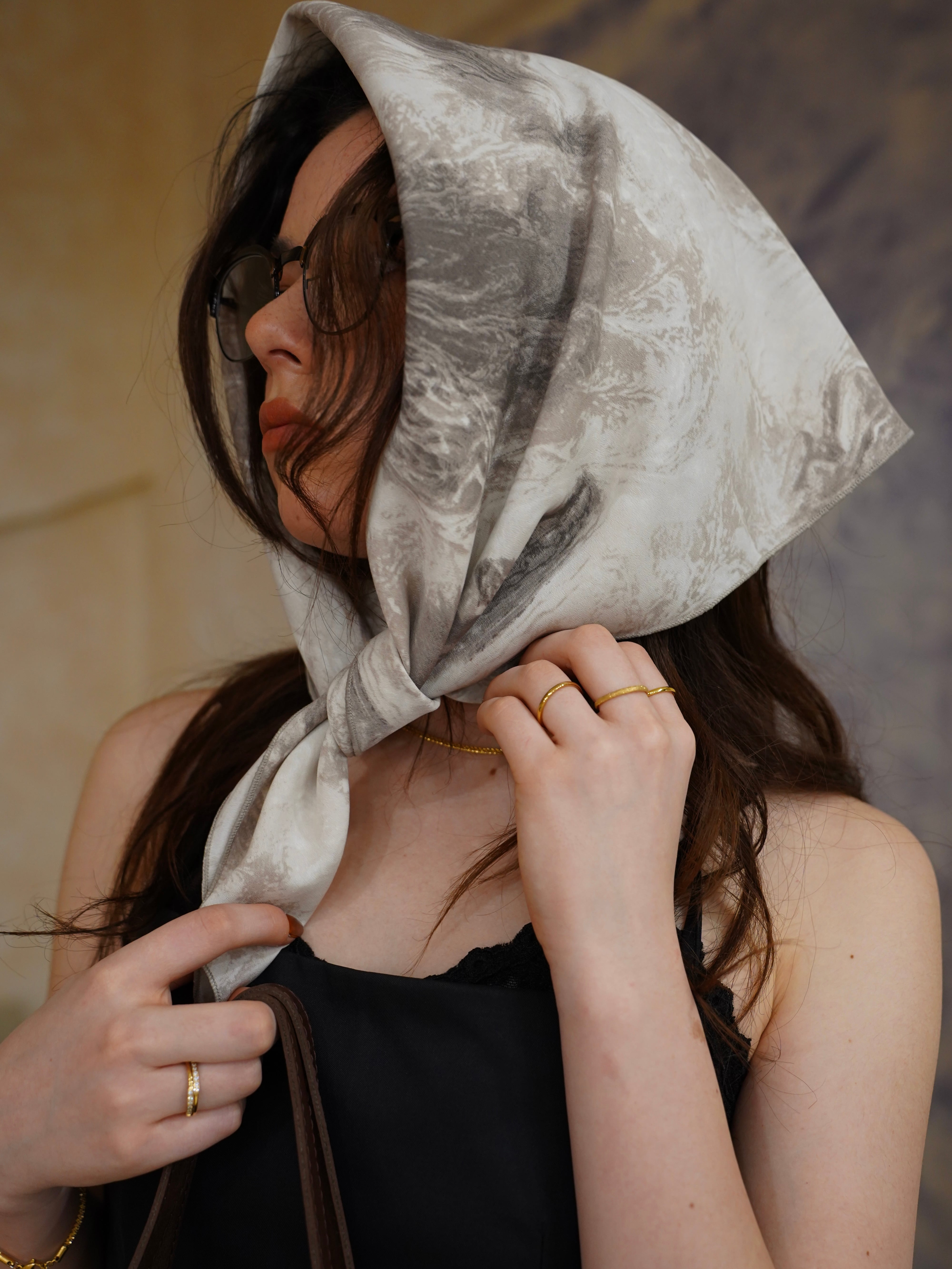 タイダイ柄のスカーフは、カジュアルにもエレガントにも合わせやすいアイテムです。